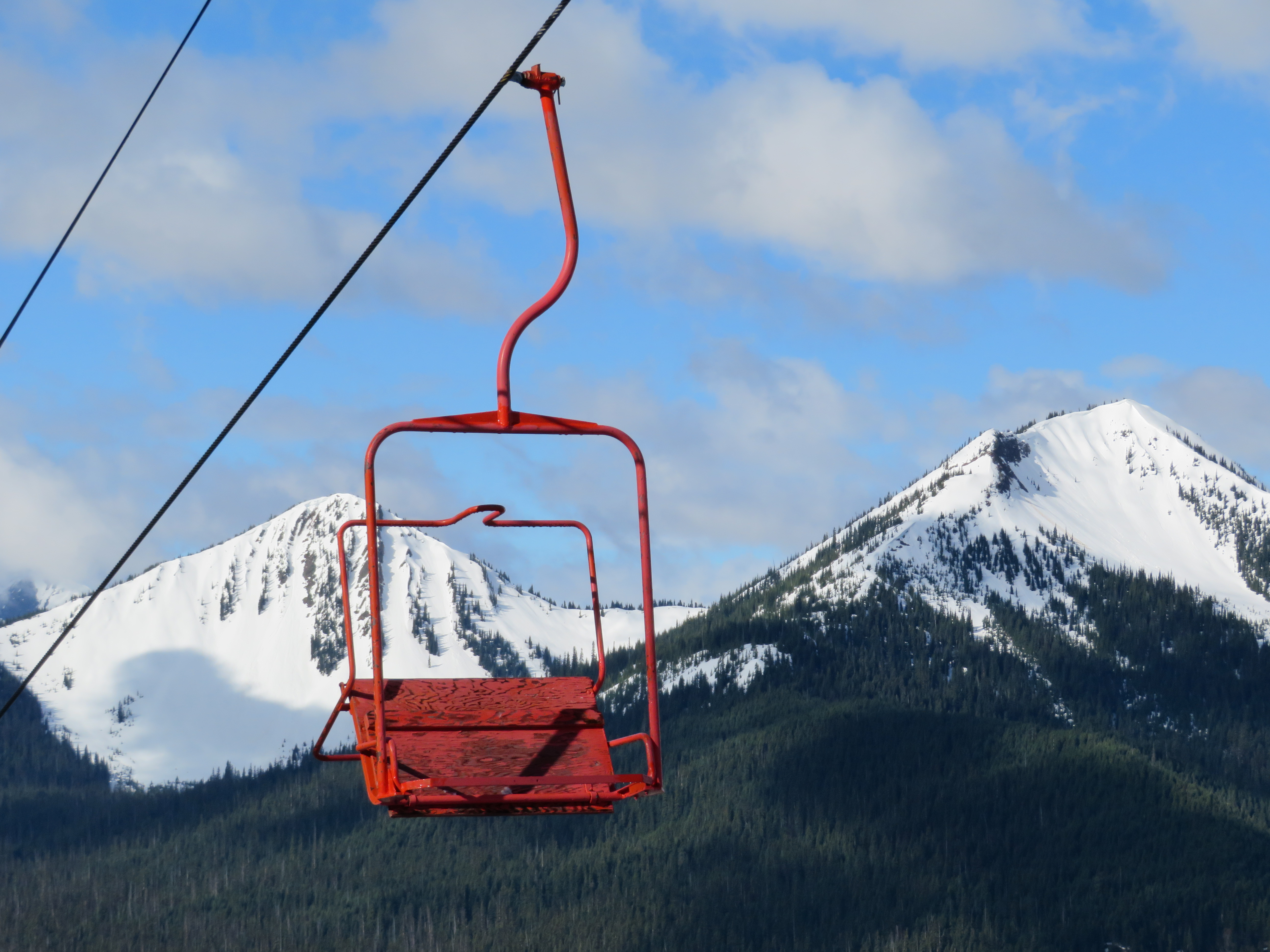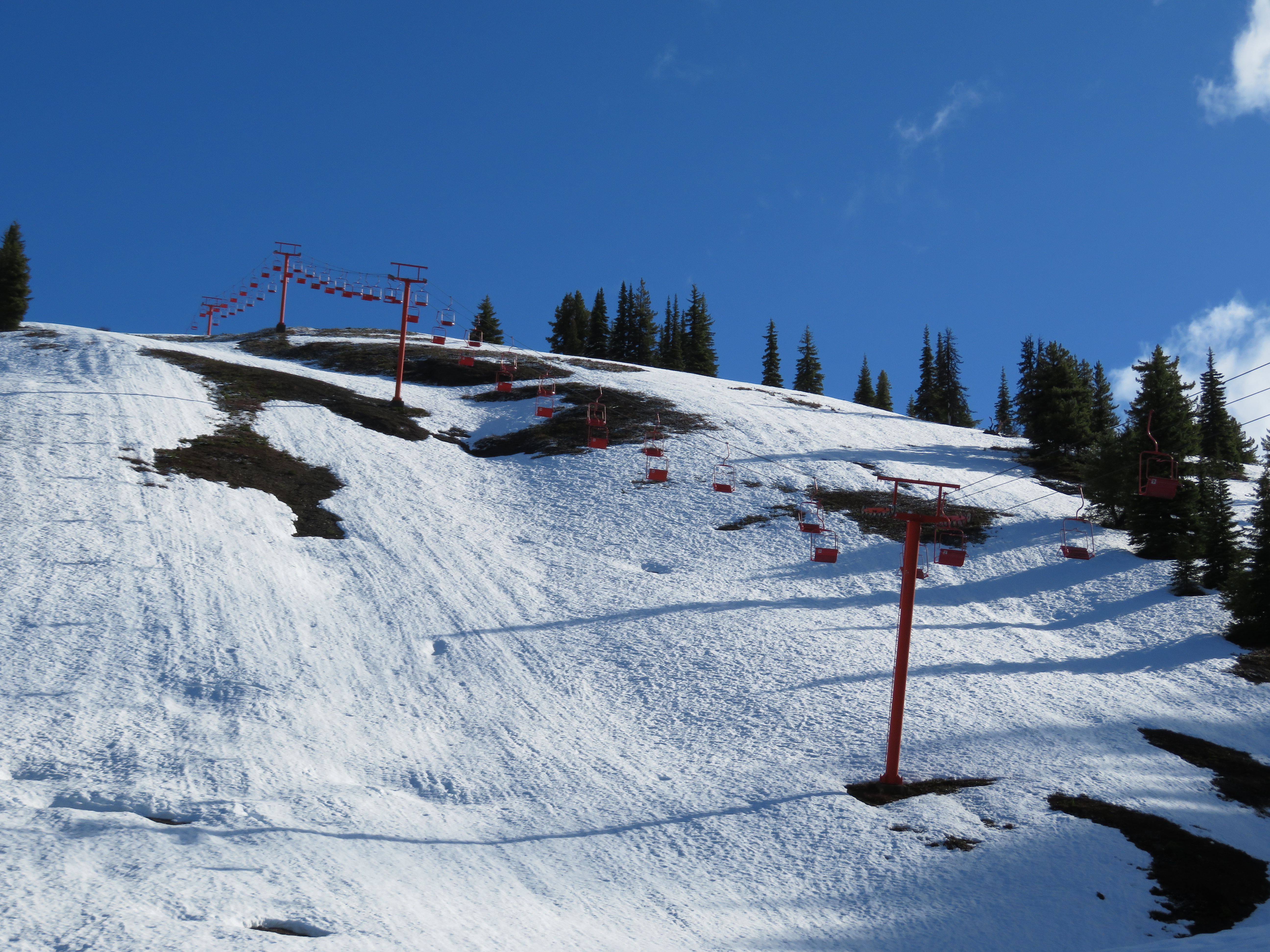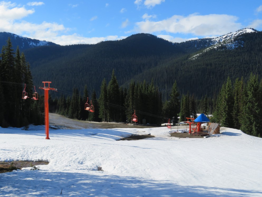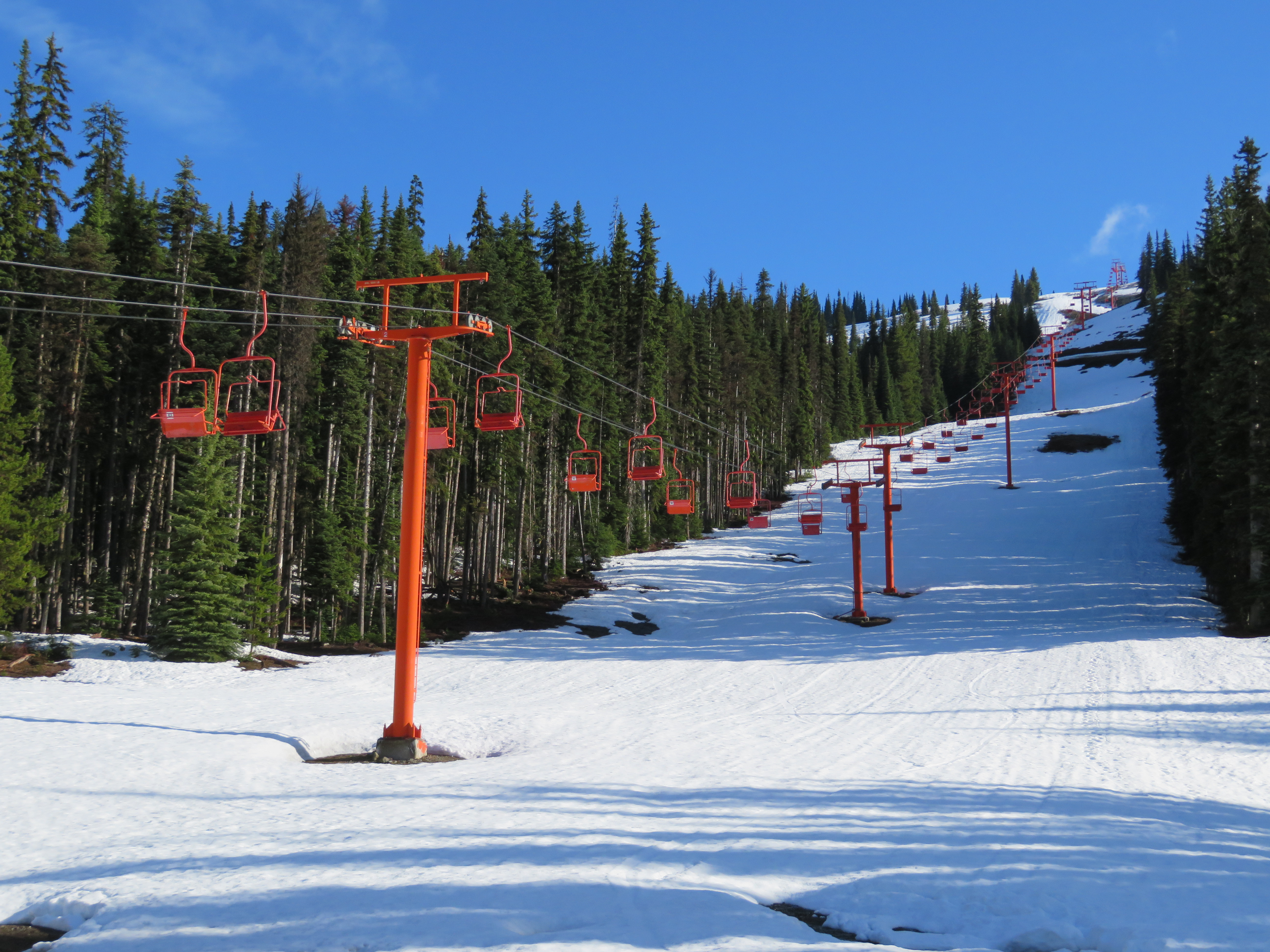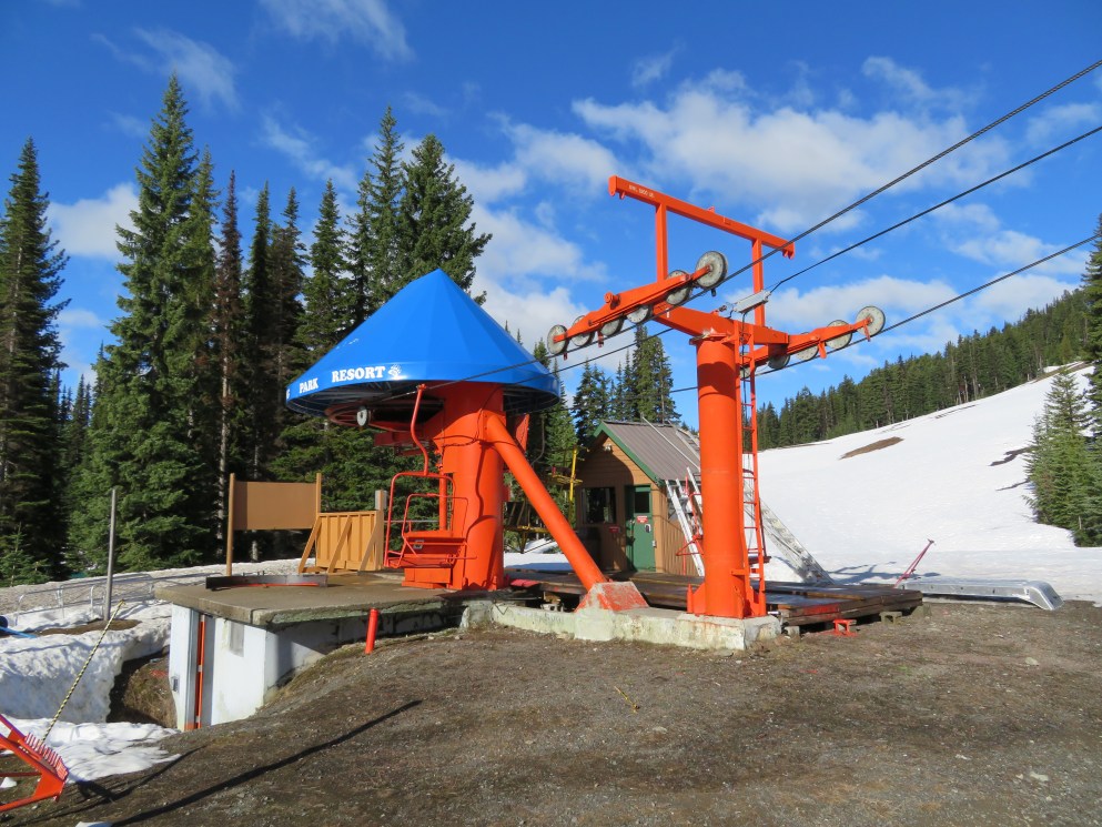 Signature Murray-Latta plaque accompanying the longest and tallest lift at Manning Park.A view up the lift line.The bottom terminal is a vault drive model.Side view of the drive bullwheel.Lift overview.Towers 1 and 2.View up the middle part of the line.Lower lift line.Another section of the lift.Double chair with grip and restraint bar.Side look at the top station.All three of Manning Park’s lifts are bottom drive, top tension.Upper terminal overview.Breakover towers.View down the lift line.The upper half of the line seen from Blue chair.