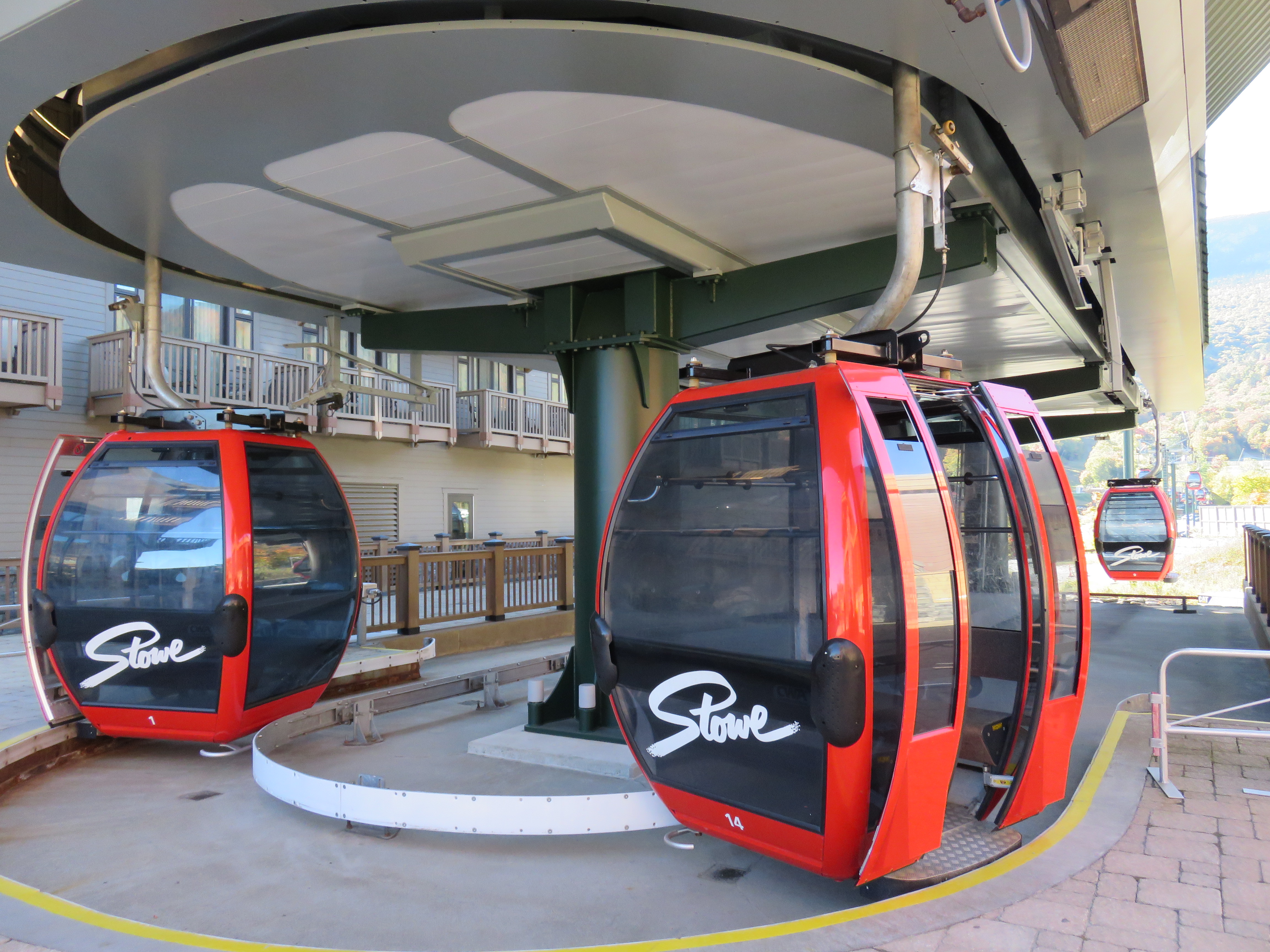 Cabin parking and maintenance building.Drive terminal adjacent to the Gondola Base.View towards Spruce Peak.Leitner-Poma Omega drive station.Tower 6.Leaving the drive station.Tower 5.Spruce Peak return terminal.CWA Omega 6-passenger gondolas.The Spruce Peak terminal was built before the structures around it went up.Looking back towards FourRunner.This gondola only has 6 towers.Turnaround at Spruce Peak.The entire lift seen from above.Cabin parking area in use.