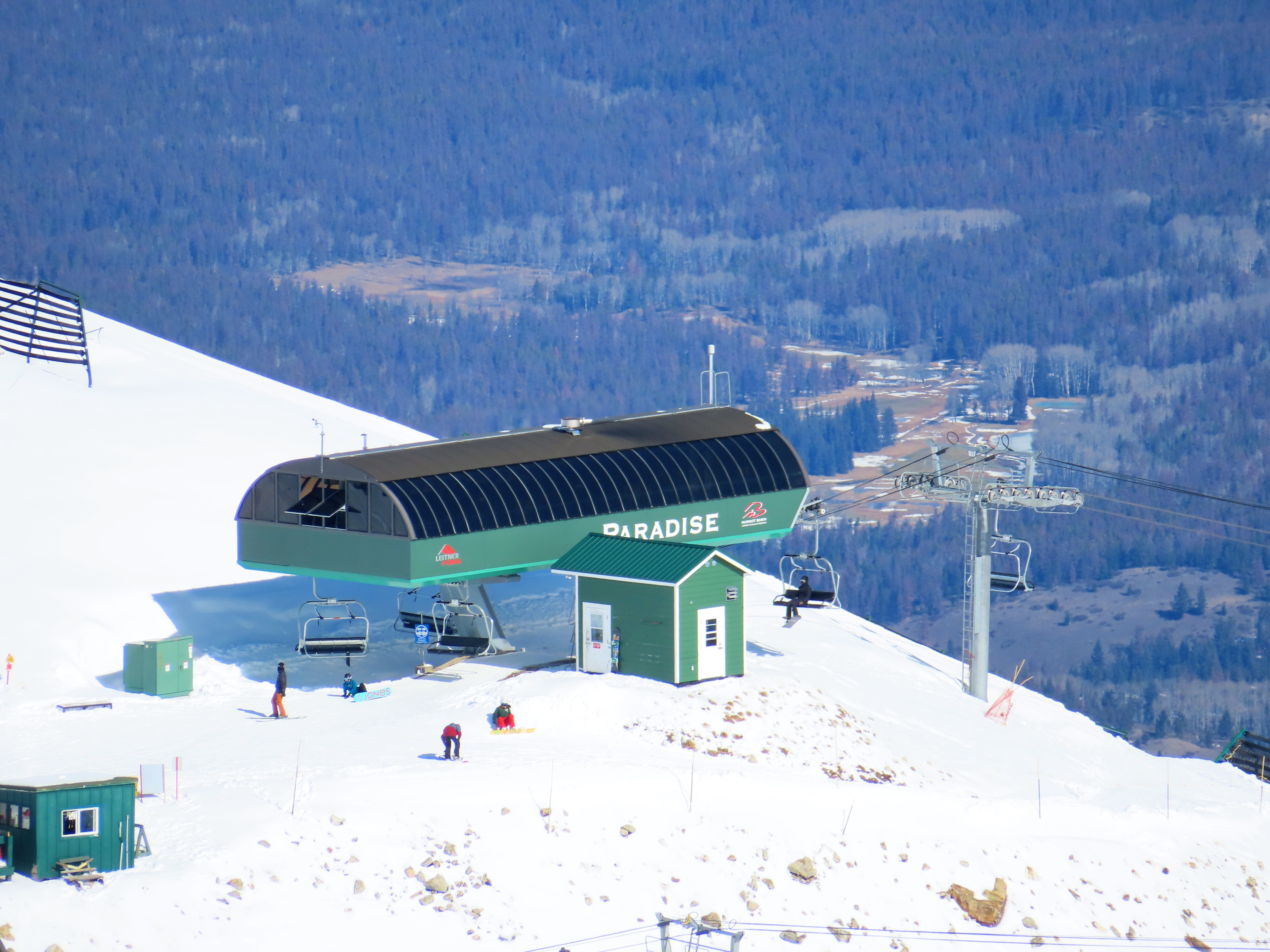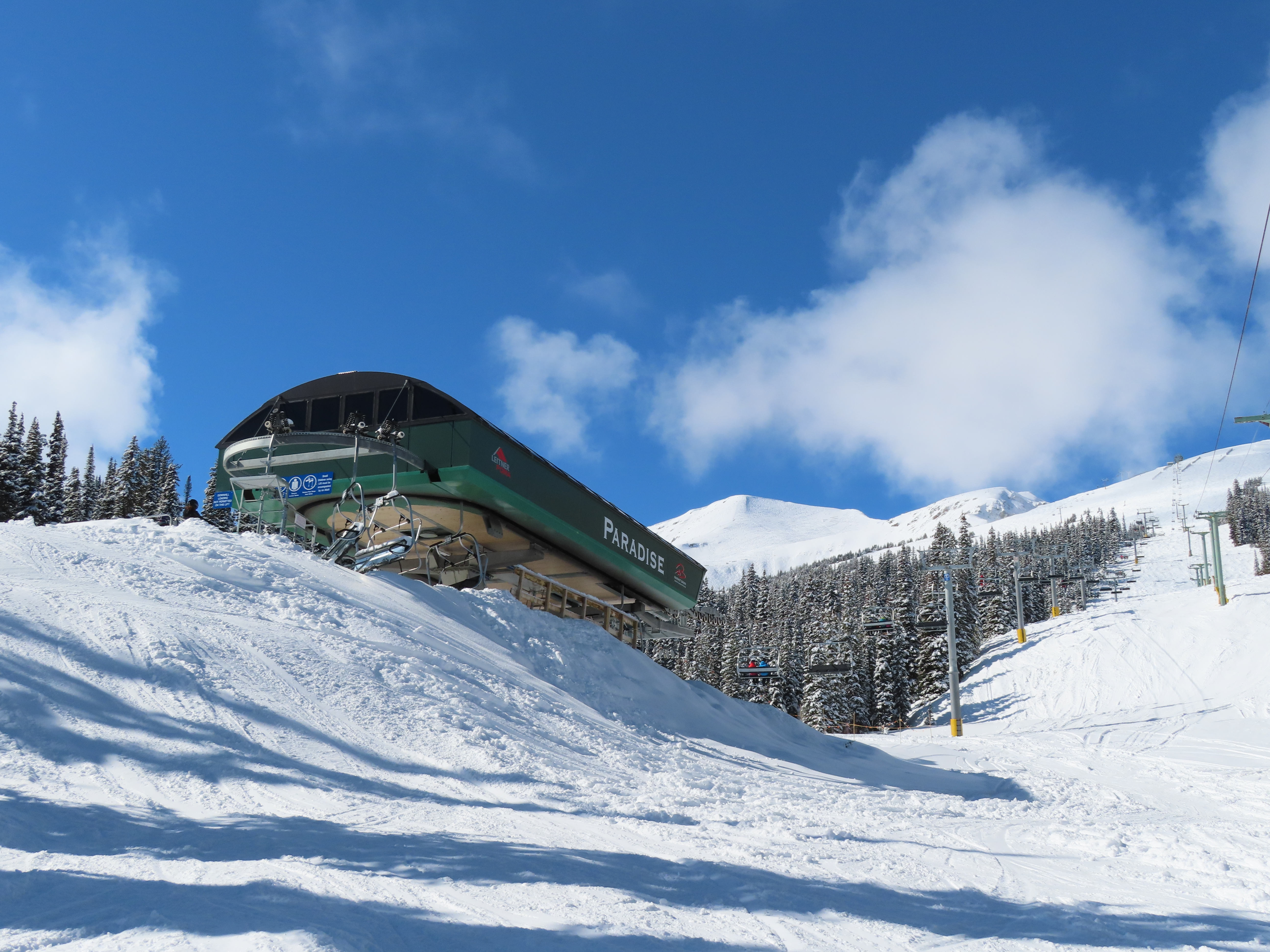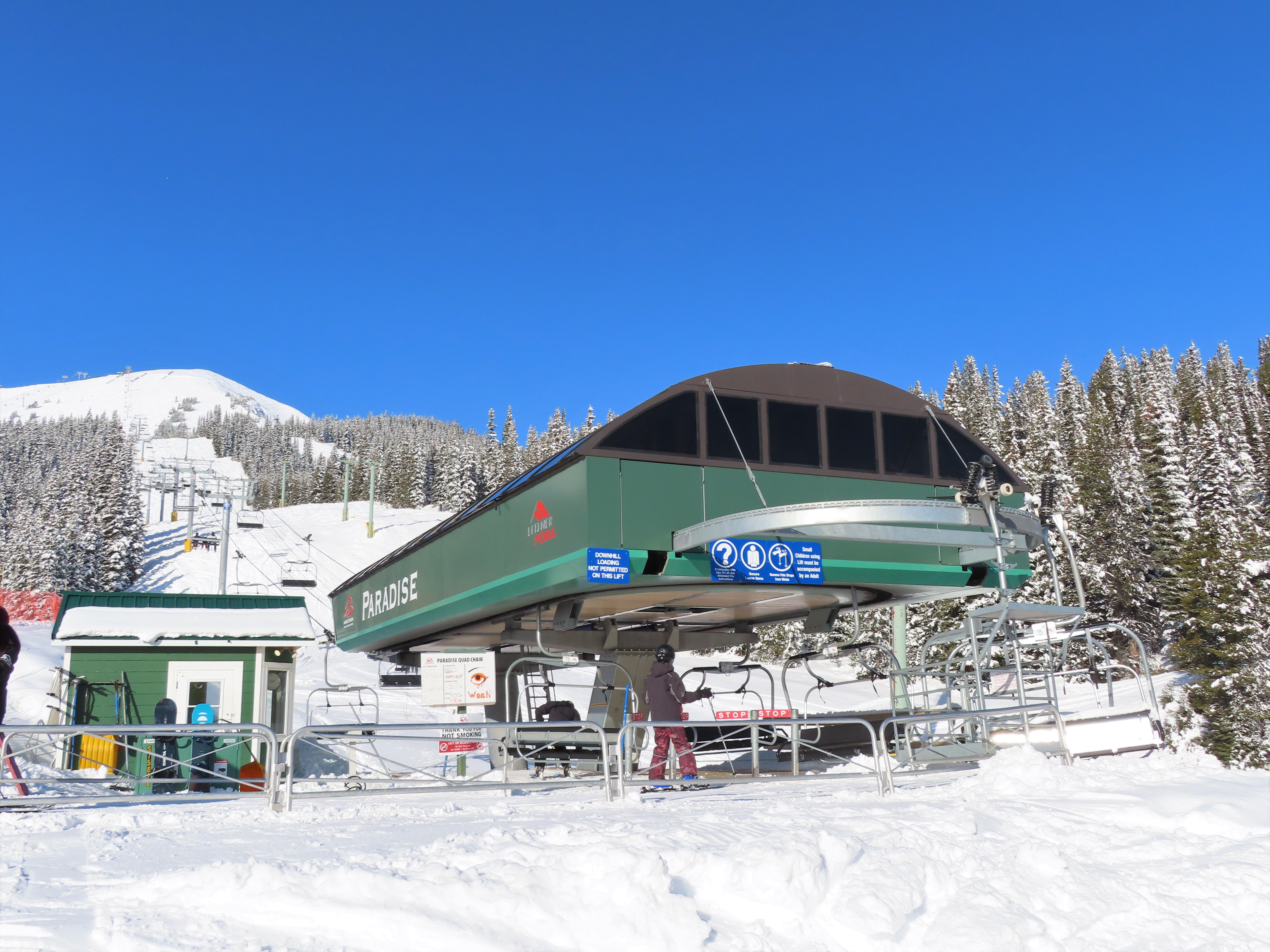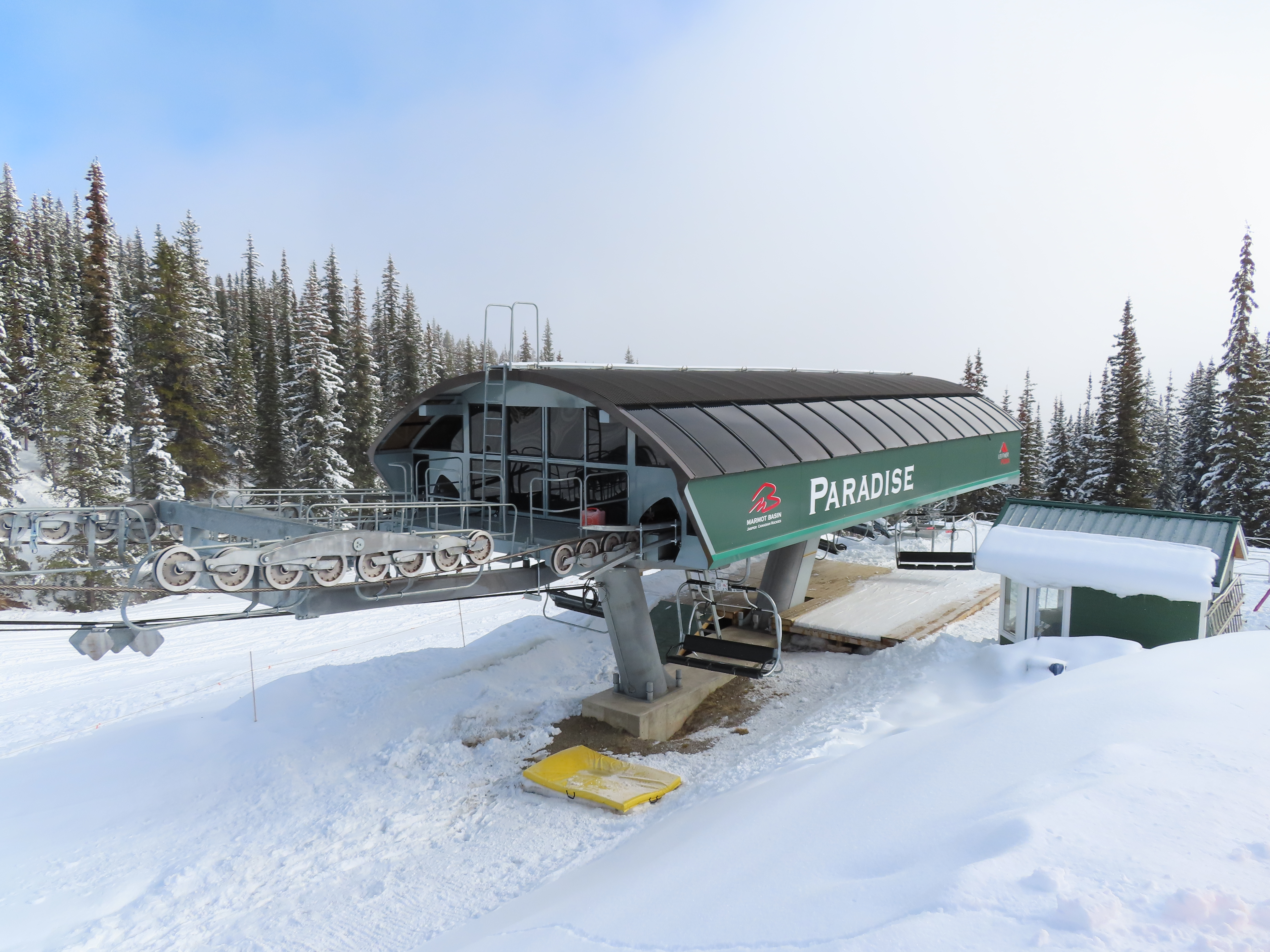 The Paradise Express opened in 2011 in a completely new alignment indirectly replacing three older Doppelmayr lifts.Aerial view of the top terminal.The upper station is directly adjacent to the Canadian Rockies Express.Terminal underskin and lift line.Lower station with integrated sheave assemblies.The unload point.Top terminal.Leitner-Poma Omega T Grip.Lower station side view.View up the line near the retired Caribou chair’s top station.Looking down at tower 12.Another view down the line.T14.Lift line overview.Chair 4.Another view of the top station.Arriving at the drive.A crossarm and lifting frame.Riding up.View back down the first part of the line.Lift overview.View up from the base terminal.