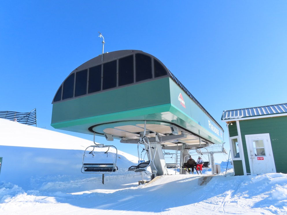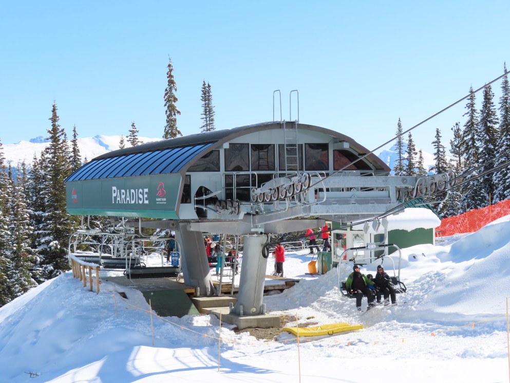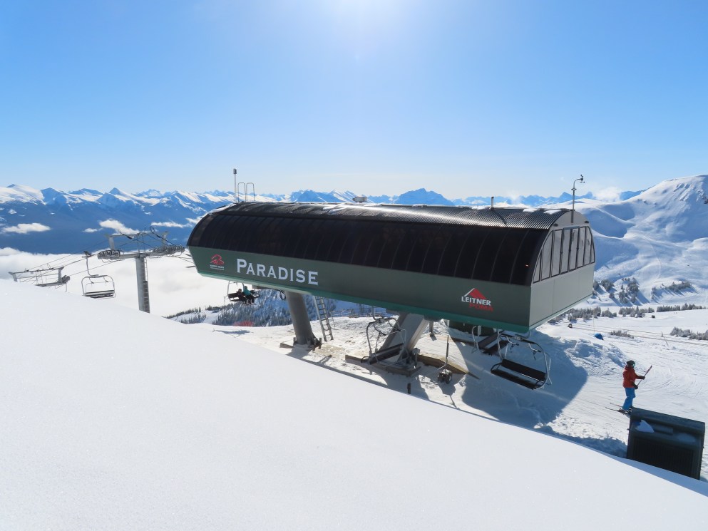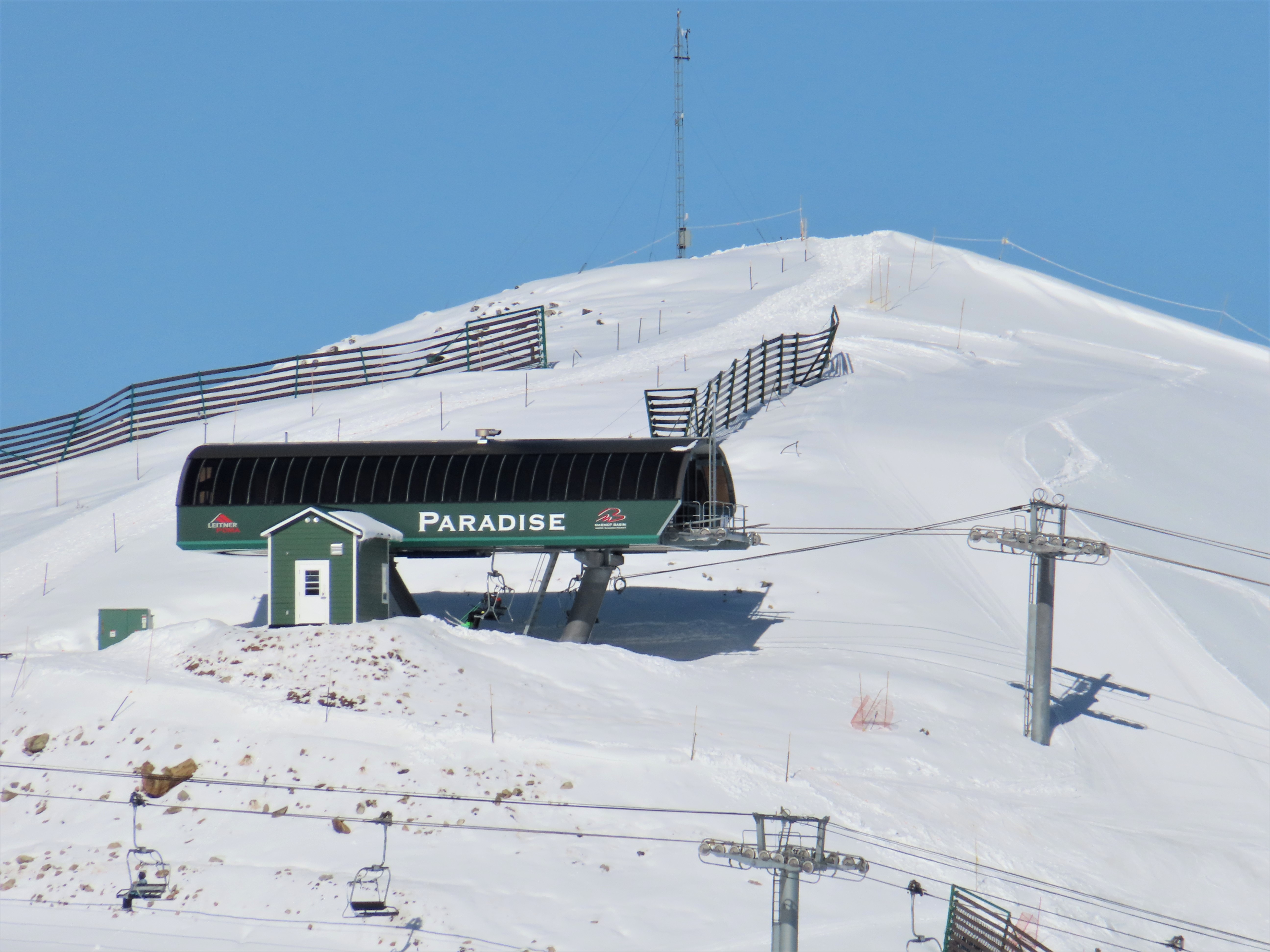 The Paradise Express opened in 2011 in a completely new alignment indirectly replacing three older Doppelmayr lifts.Aerial view of the top terminal.The upper station is directly adjacent to the Canadian Rockies Express.Terminal underskin and lift line.Lower station with integrated sheave assemblies.The unload point.Top terminal.Leitner-Poma Omega T Grip.Lower station side view.View up the line near the retired Caribou chair’s top station.Looking down at tower 12.Another view down the line.T14.Lift line overview.Chair 4.Another view of the top station.Arriving at the drive.A crossarm and lifting frame.Riding up.View back down the first part of the line.Lift overview.View up from the base terminal.