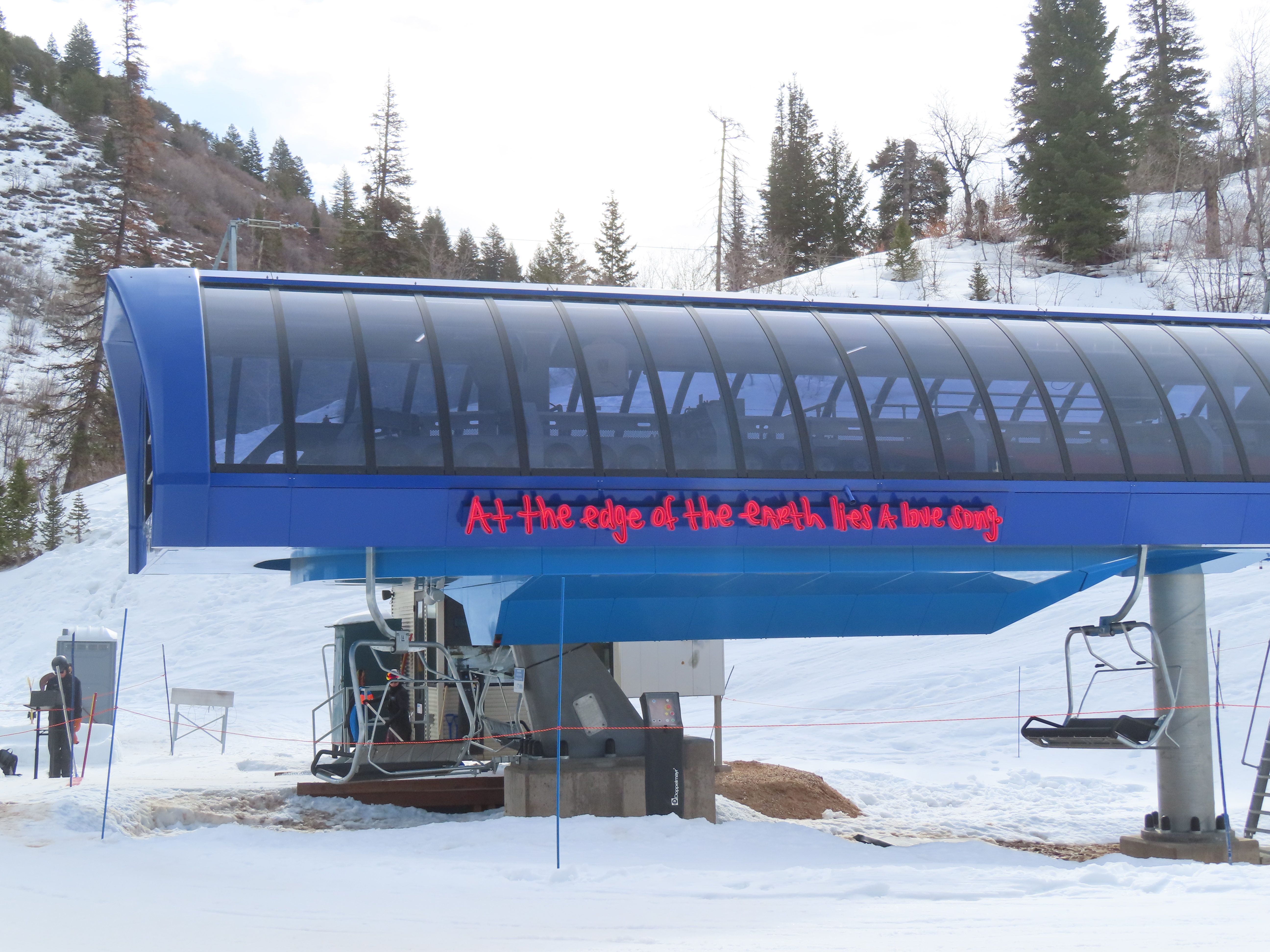 This lift services a massive terrain pod and replaced a long, slow CTEC quad.The terminals are two tones of blue as part of Powder Mountain’s art program.View up the long, varied lift line.The return station and tower 1.The bottom station is powered entirely by generator with no grid power available.View riding out of the bottom of Powder Mountain.Combination assemblies on tower 6.Riding up the first of a few very steep pitches.Looking back down the line.The towers are painted blue and white rather than being bright galvanized.Support tower 9.European style tower heads.View back down at tower 10.T11.Towers on a rocky point.Middle section of the line.Hold downs on tower 12.American style tower head.Tower 17.Large generator at the summit to provide backup power in case of an outage.Drive station with small maintenance rail.Unloading area.Two tone blue UNI-G station.View down from the summit.The final few towers on a ridge.Steep upper part of the line.View down in steep terrain.Upper lift line.Towers 10 and 11.View down at tower 10.Looking up from tower 11.Tower 9 in very steep terrain.Lower lift line.The bottom station with generator shed.Soon after construction, an art installation with neon adorned the bottom station.