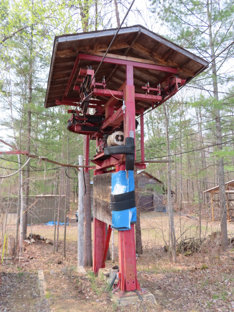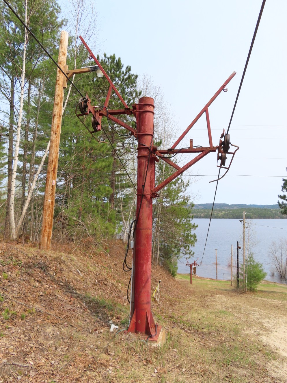This homemade lift services a small community ski area.Unloading area.You’ll see why this lift has a top drive in a moment.View down the short lift line.Split tower.Looking up the line.Bottom station along the Ottawa River.Lower station overview.Upper station overview.