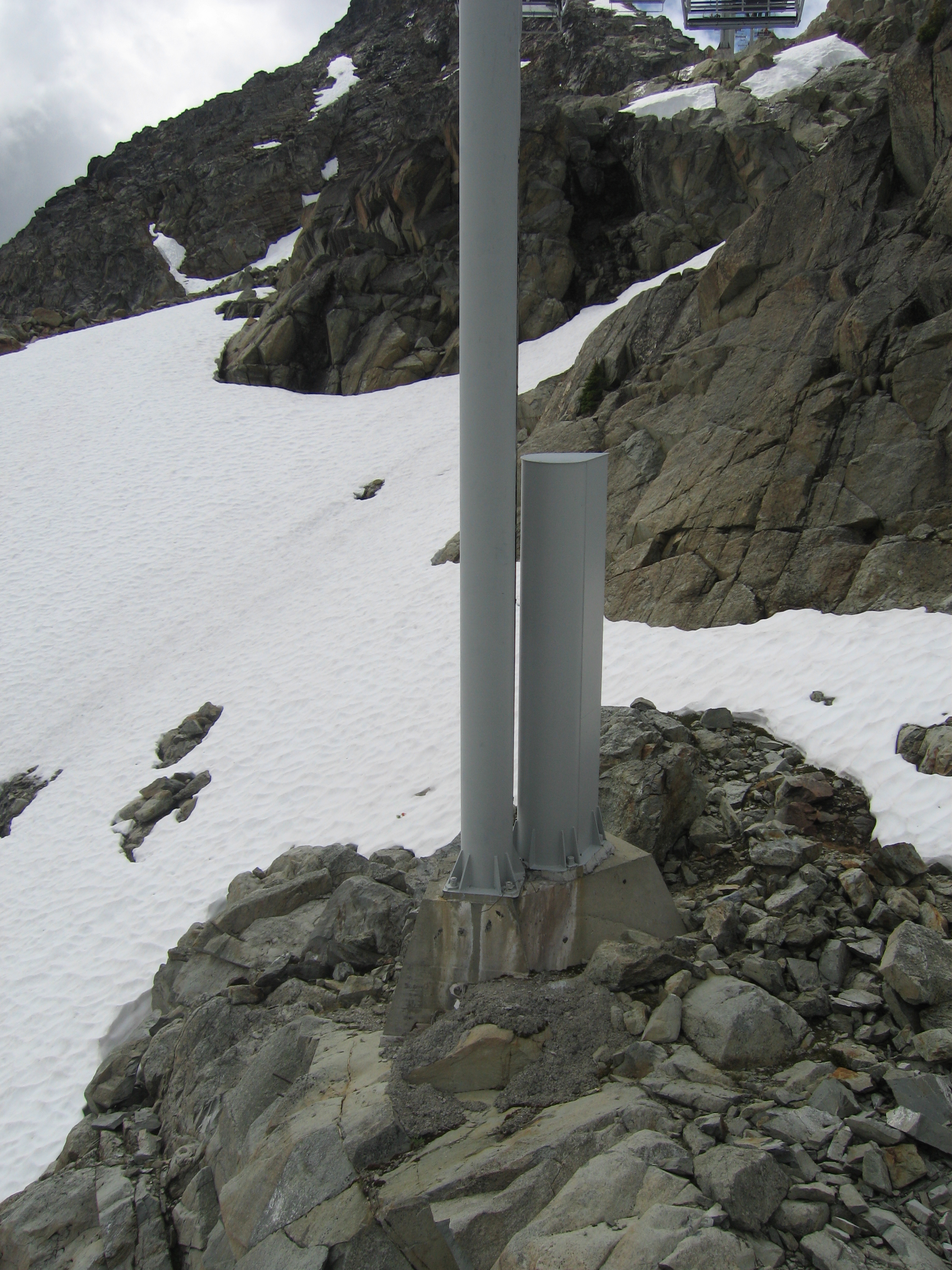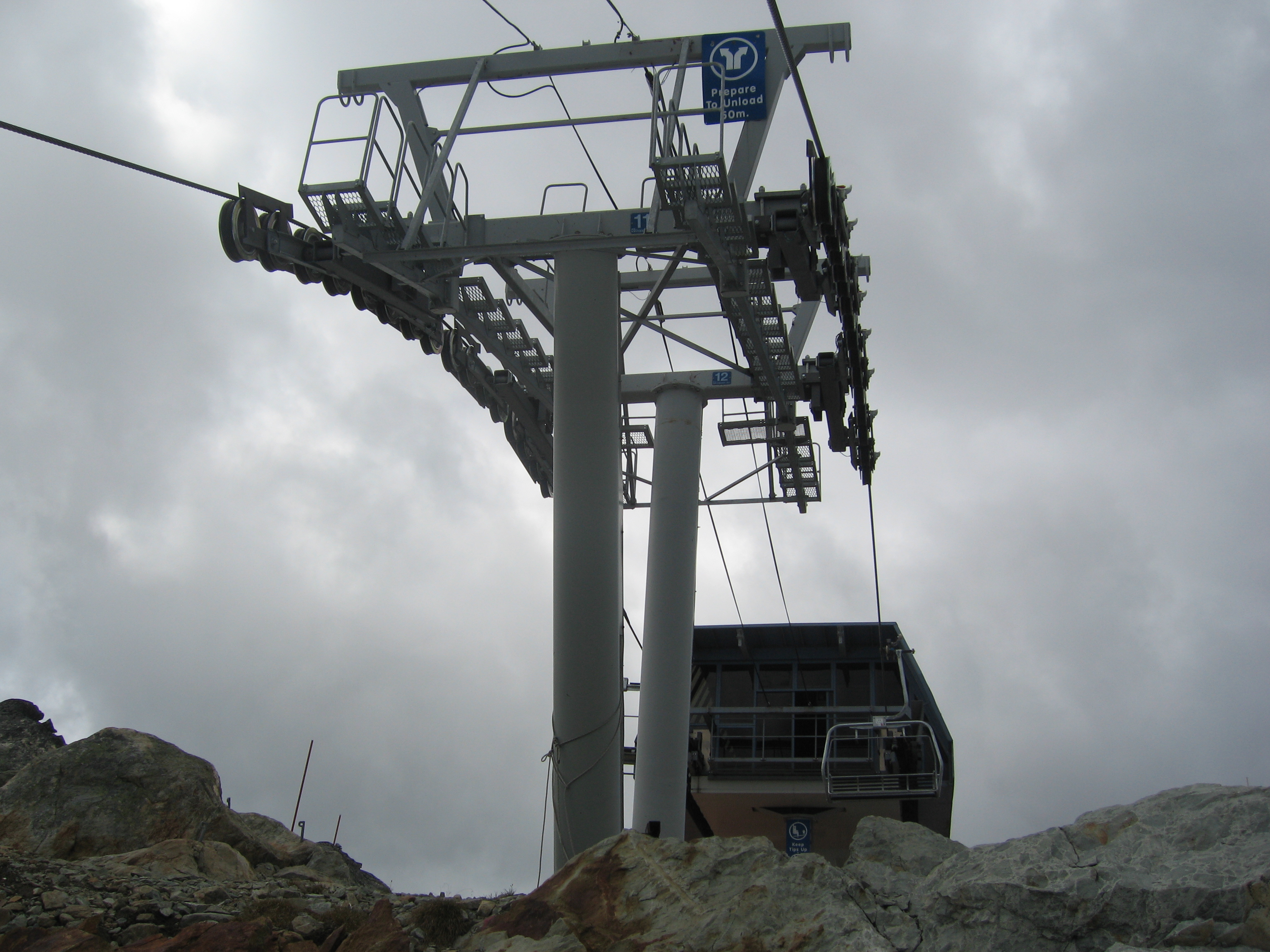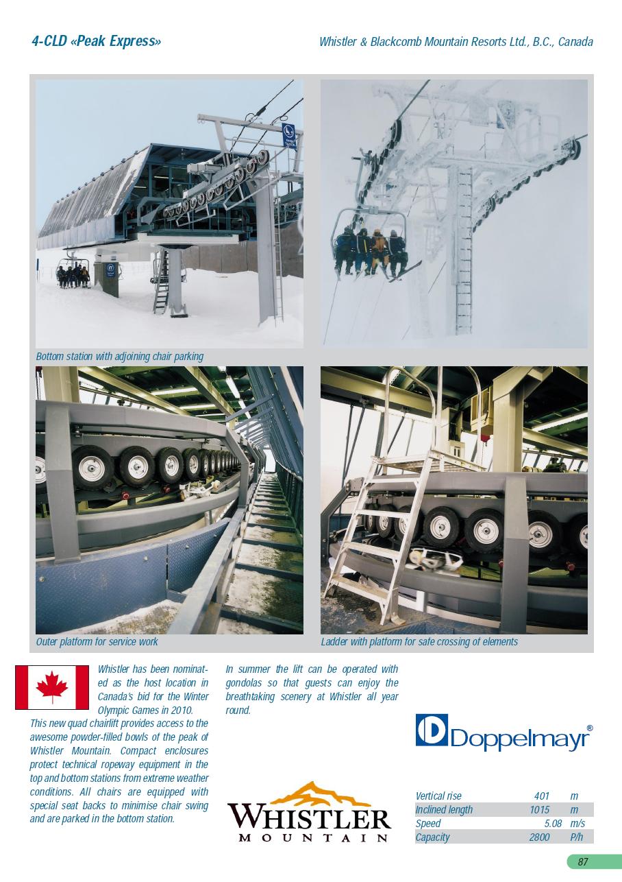 Bottom terminal with indoor cabin parking for every chair.Return terminal during summer sightseeing.Riding up.Tower 4.T5.Tower with avalanche guard.Towers 8-9.T10.Breakover towers 11-12.Arriving up top.Top terminal and last two towers on the edge.The breakover.View down line.Lower lift line.The chairs are parked nightly in winter and also have slatted backrests for wind tolerance.Arriving at the base.Looking into the cabin parking.Lift line in winter.Another view of the return at the top.Side view of the line.Doppelmayr Worldbook entry.
