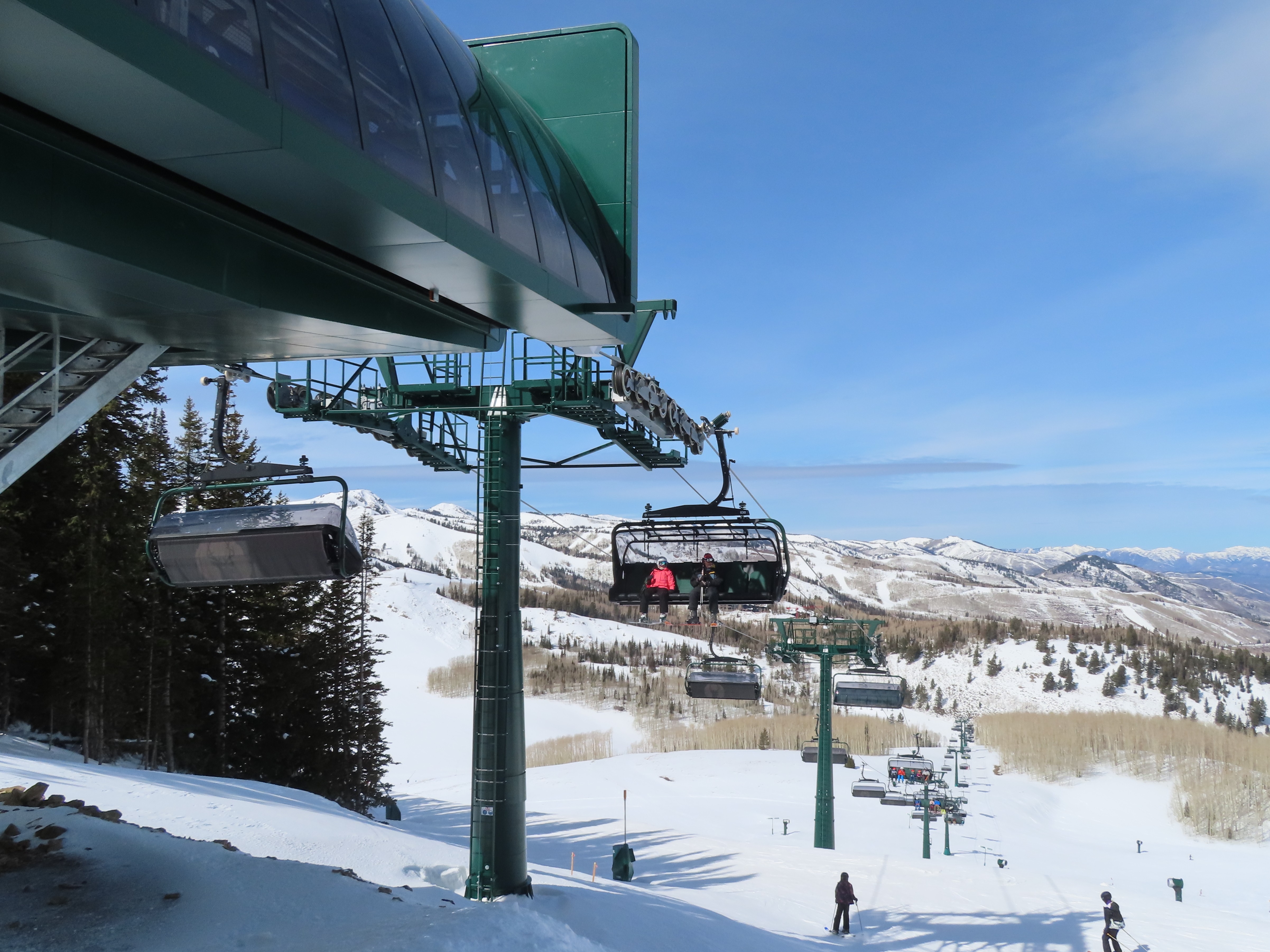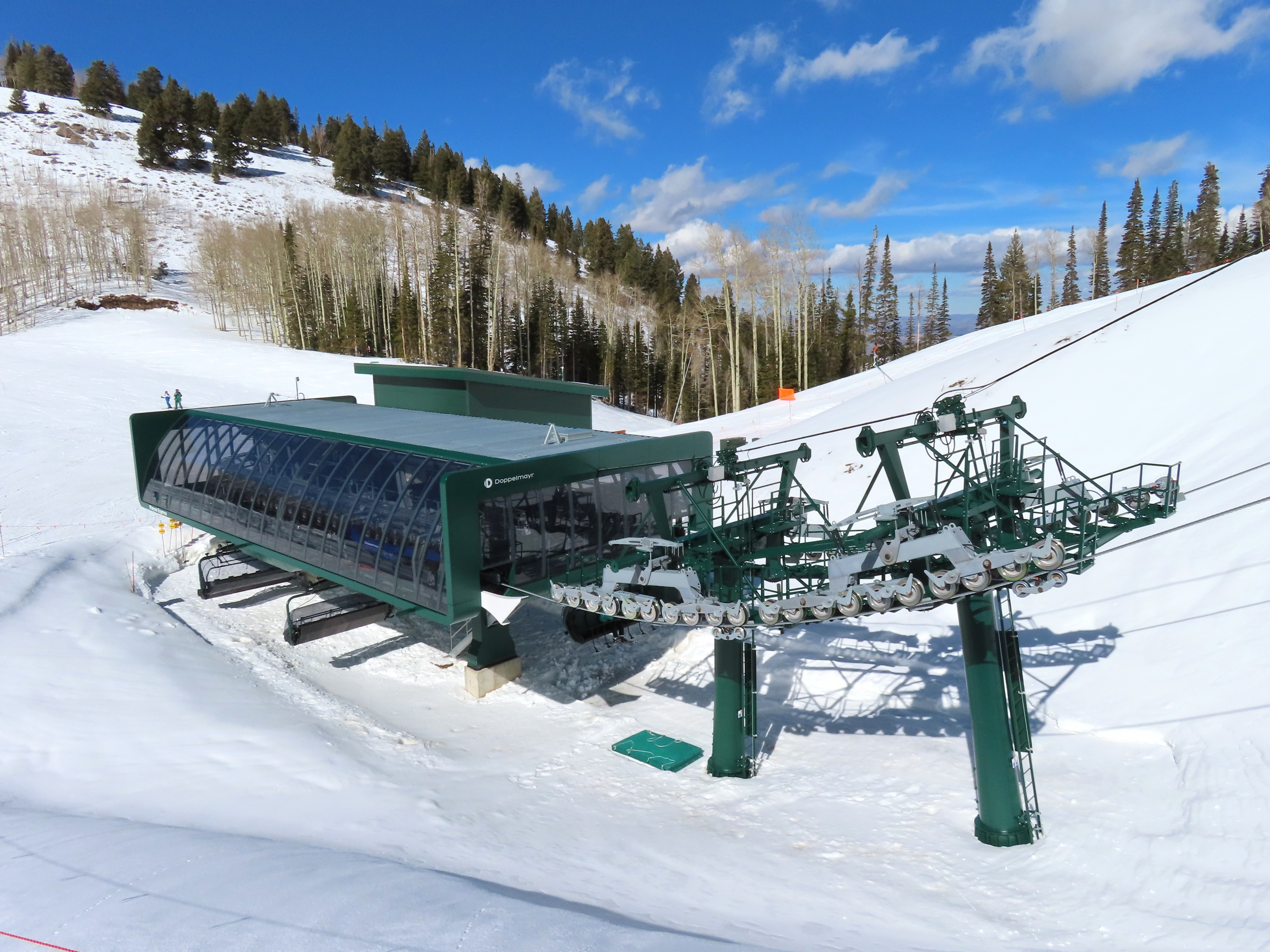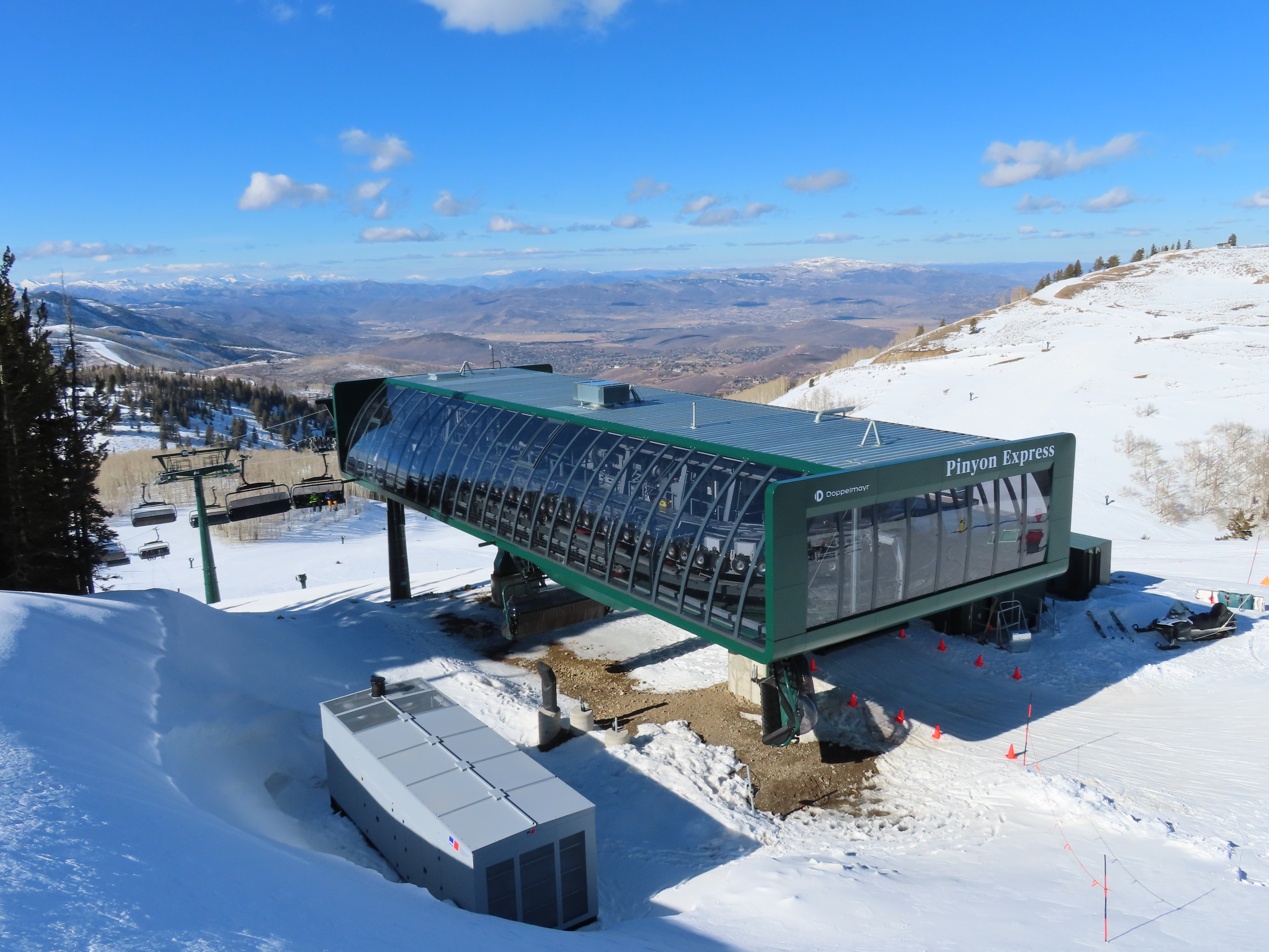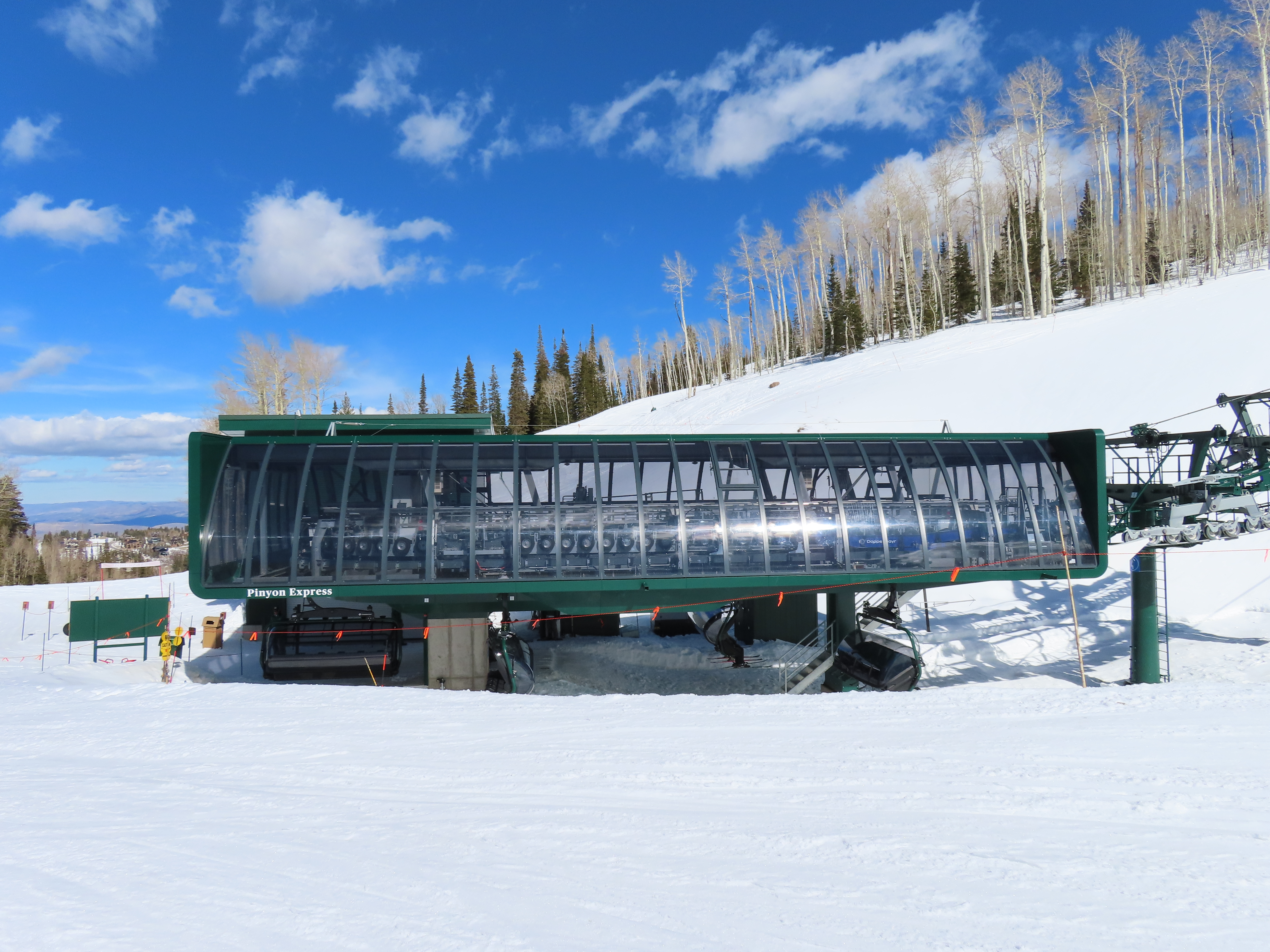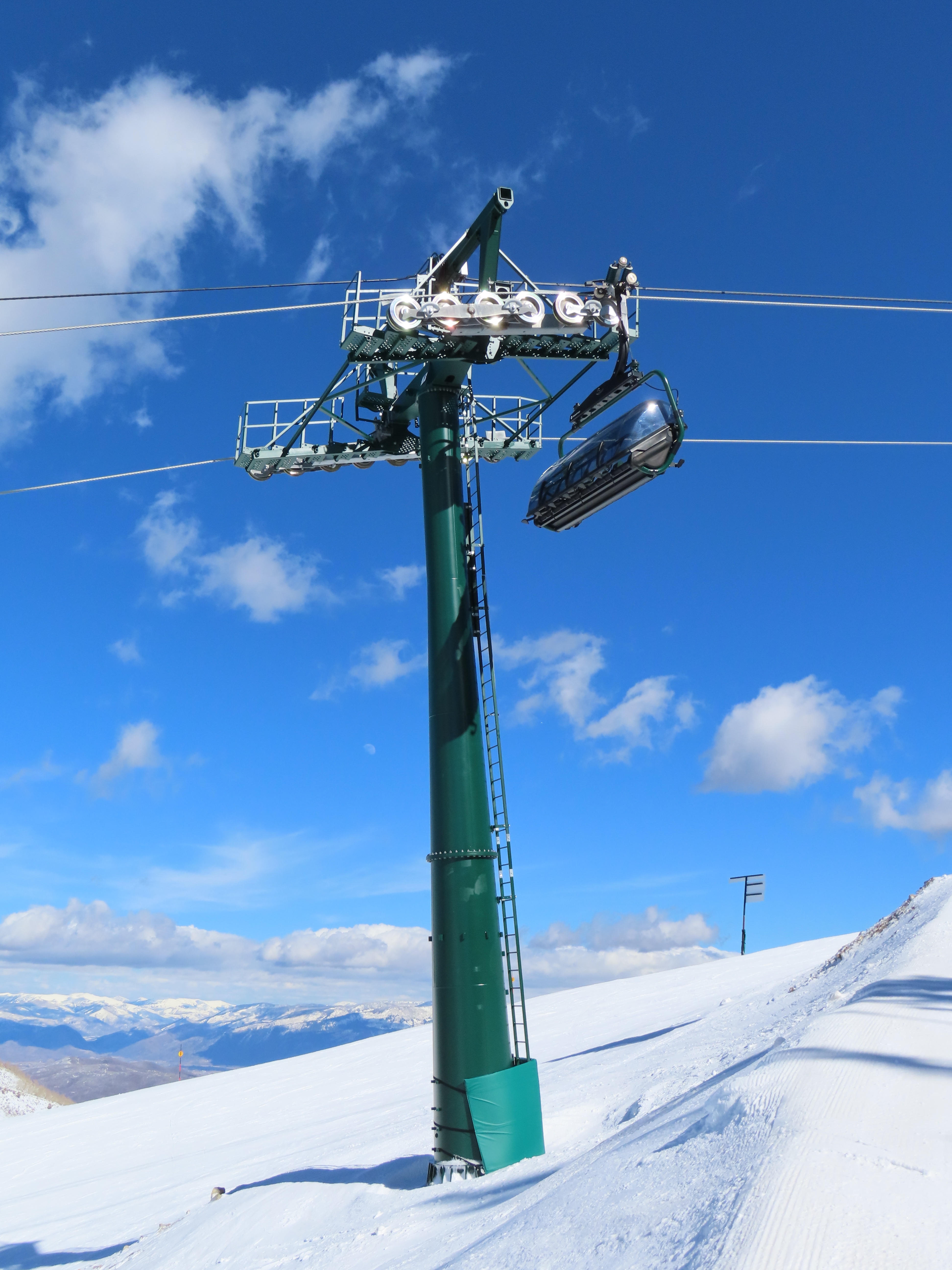 This lift is very similar to Keetley Express, built one year earlier.Doppelmayr stat sign.View riding out of the base toward Park Peak.This high alpine alignment sees lots of wind and sunshine.Tower 10.Unloading area.View from the summit back toward traditional Deer Valley and Park City Mountain.Upper station under cover.View down the middle part of the line.Side view of a conical tower.Six place bubble with heated seats.Flat middle section of the line.This lift forms a crucial link between old Deer Valley and the East Village expansion.Tower 6.Tower 3.Return terminal and maintenance bay.Side view of the drive station.Rather than a separate parking facility, chairs are parked in each station at night.Lift line seen from above.Loading area.Drive station operator controls.ABB AC motor.Evacuation drive.Wireless remote control.Traditional gearbox rather than a direct drive.D-Line station.Drive bullwheel and brakes.View from the summit.Top station just below the summit of Park Peak and Revelator.Bottom station along the Ontario ski run.