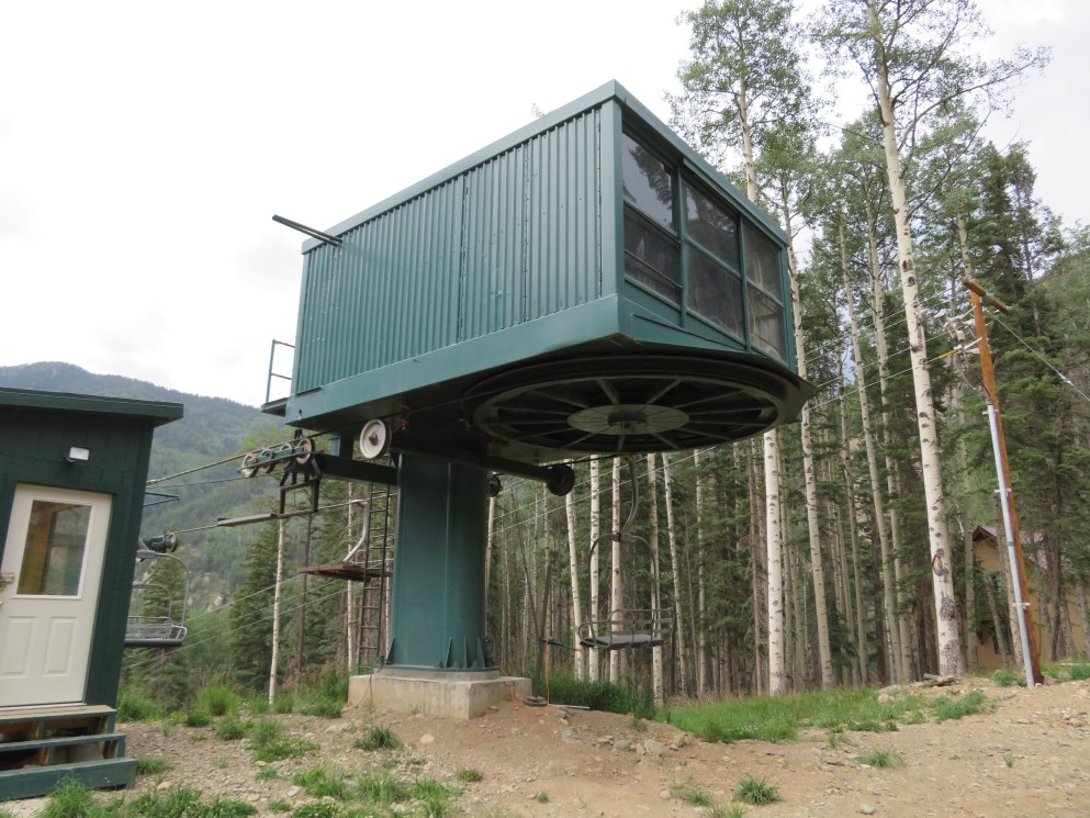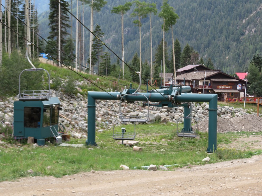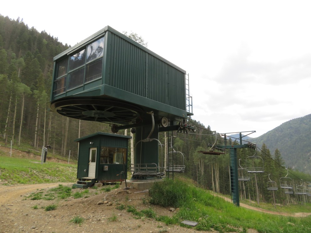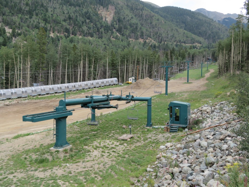 This Yan triple came from Deer Valley and retained its dark green color.Classic Lift Engineering fixed drive terminal.View down the lift line.Upper station seen from below.Looking up the lift line.Tower 2 near the bottom station.Three leg station with hydraulic tensioning and a CTEC operator house.Lift line overview.This is one of two beginner chairlifts at Taos.