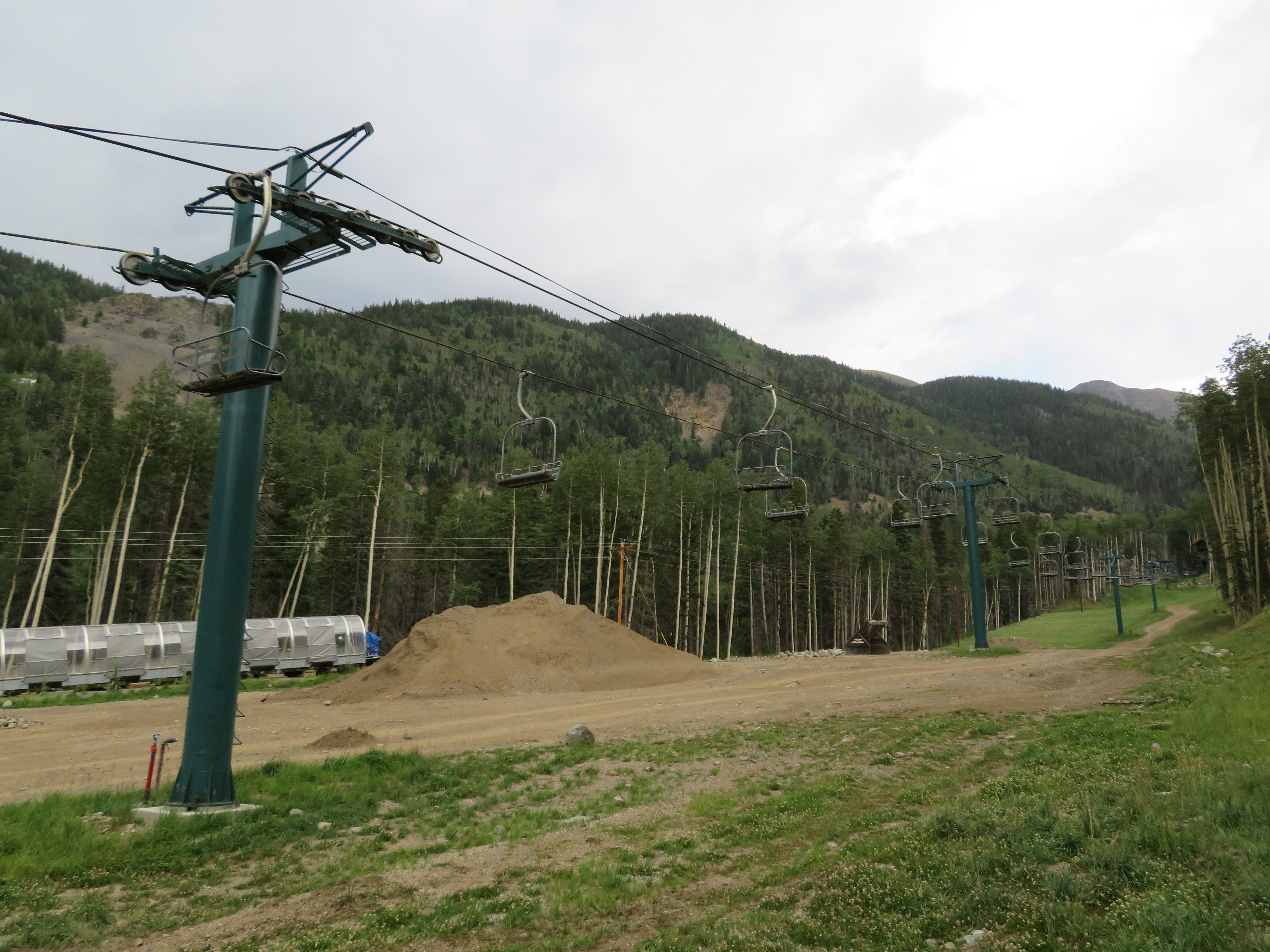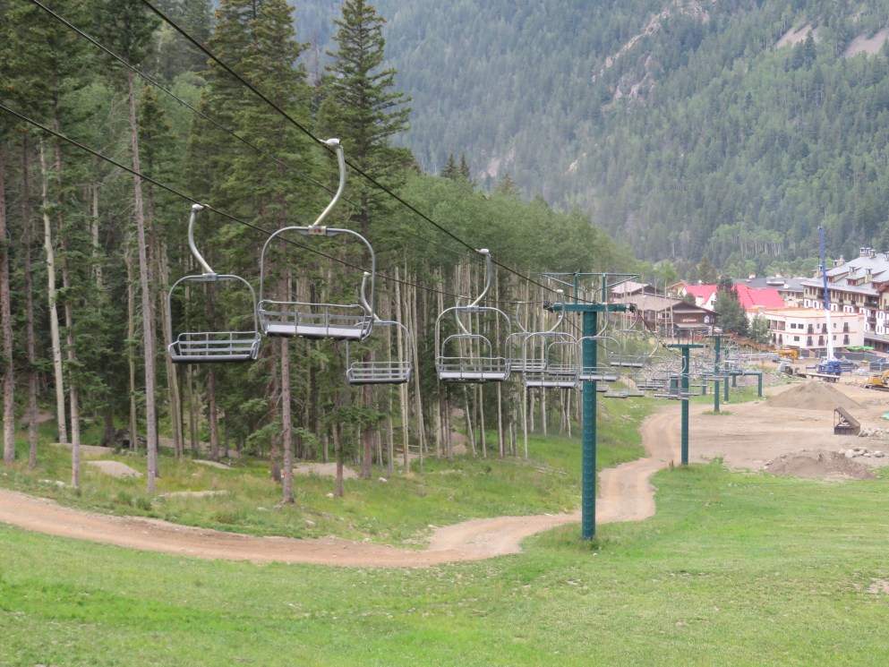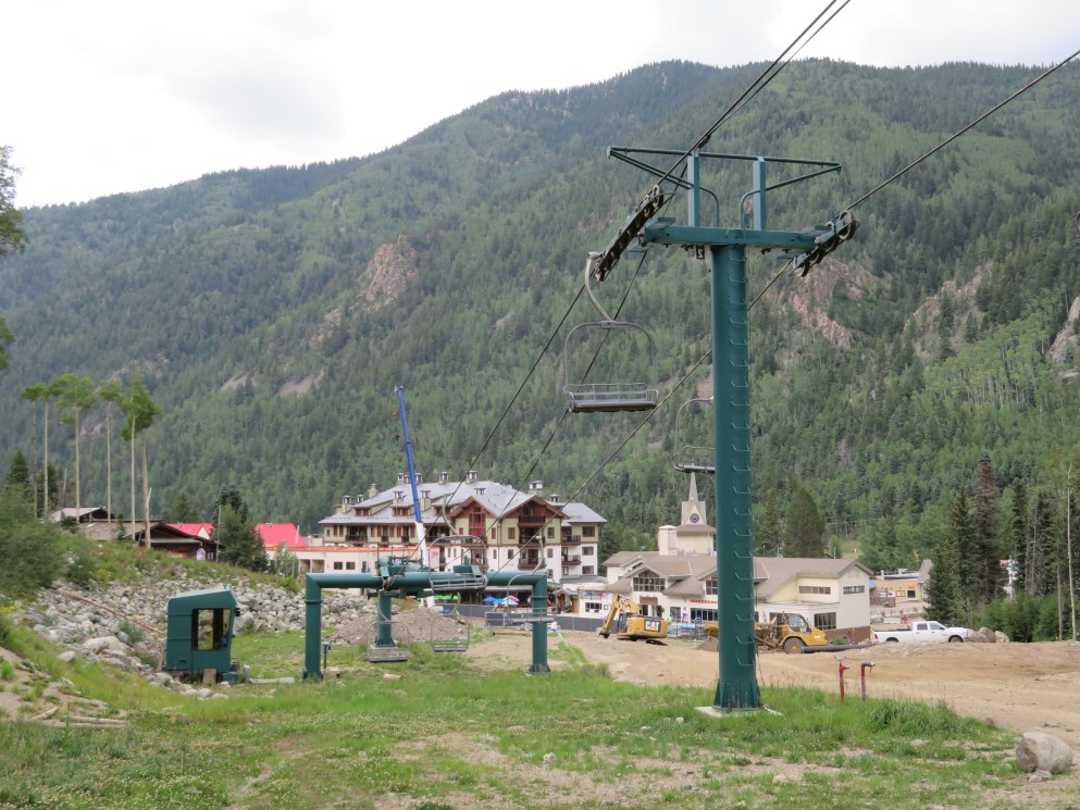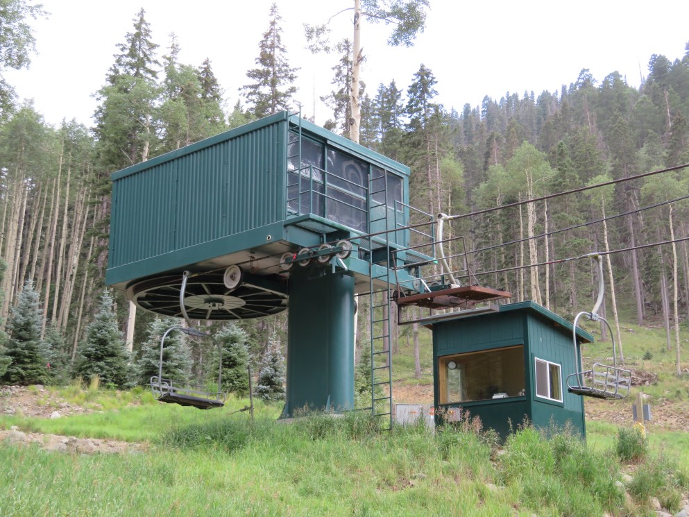 This Yan triple came from Deer Valley and retained its dark green color.Classic Lift Engineering fixed drive terminal.View down the lift line.Upper station seen from below.Looking up the lift line.Tower 2 near the bottom station.Three leg station with hydraulic tensioning and a CTEC operator house.Lift line overview.This is one of two beginner chairlifts at Taos.