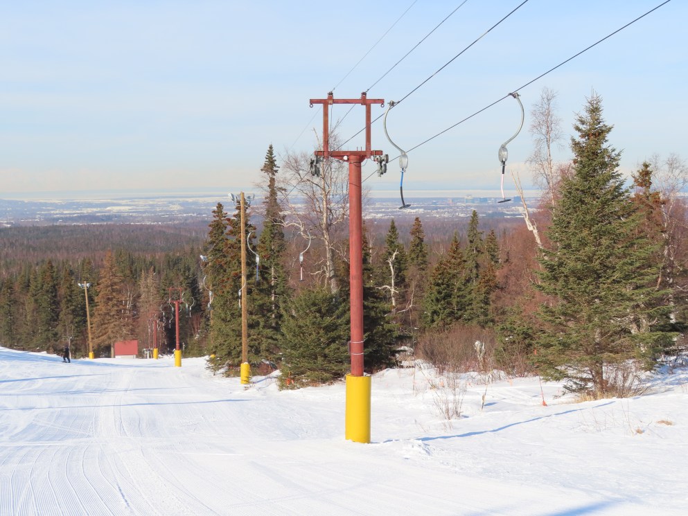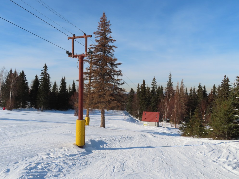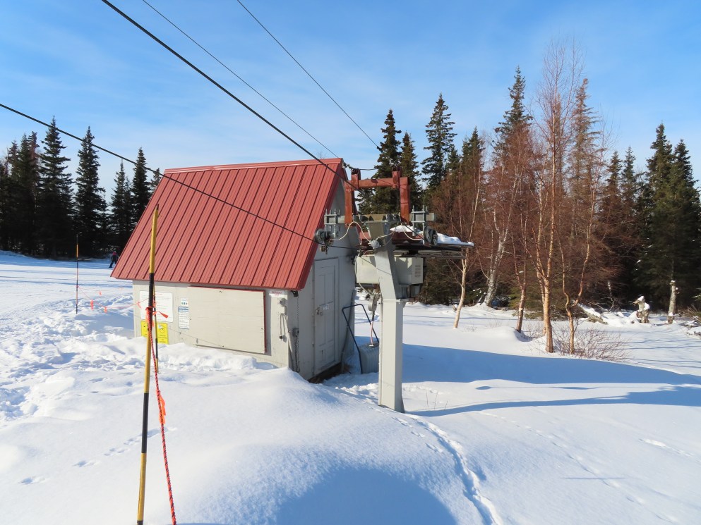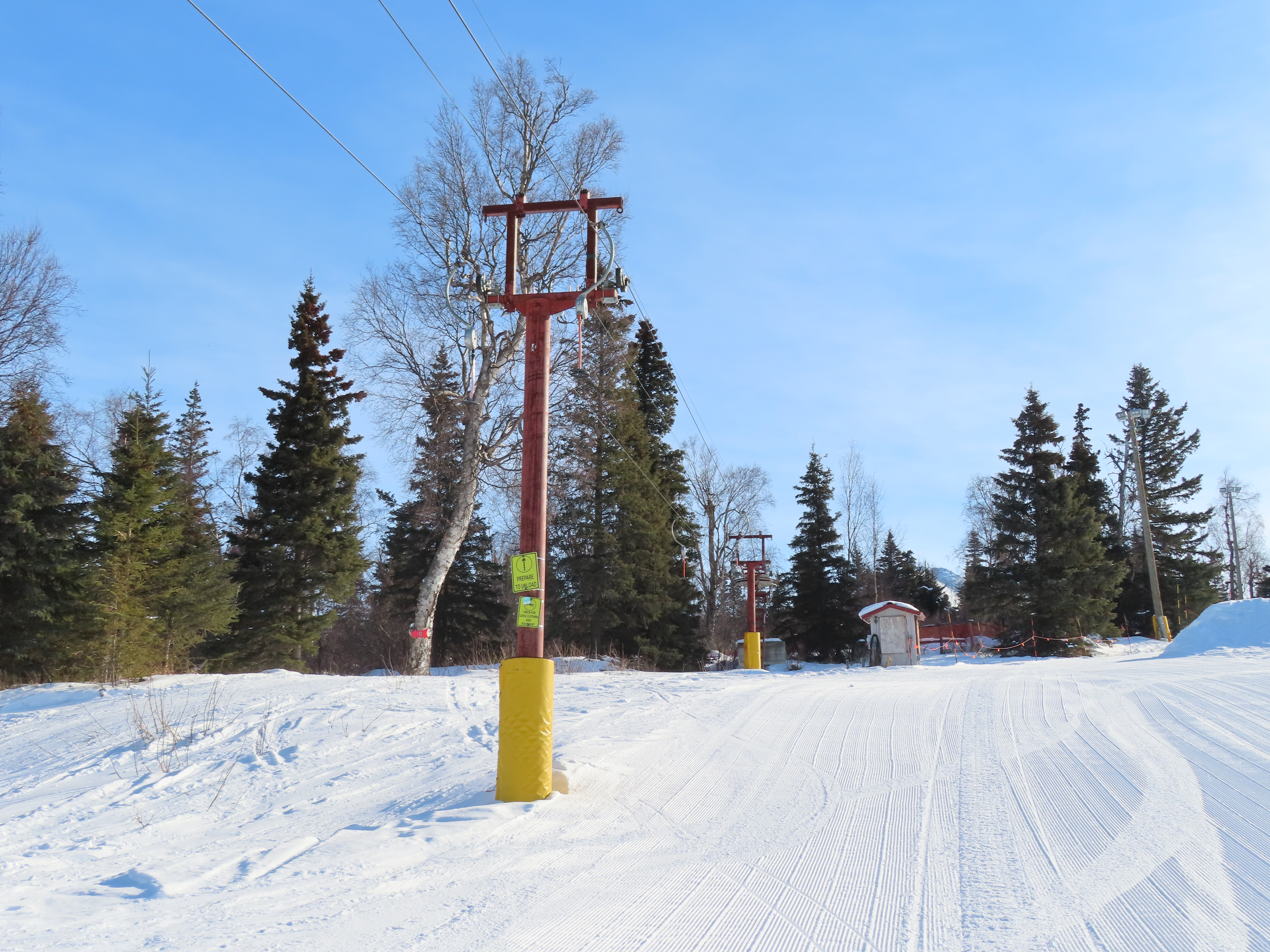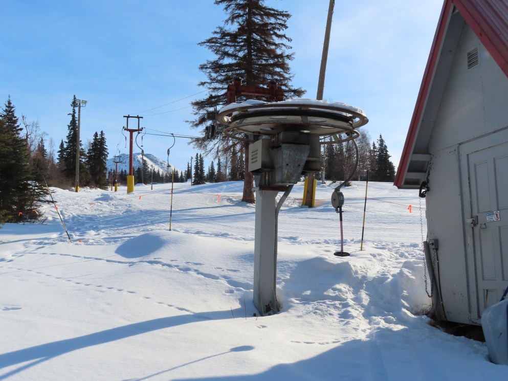 This lift was relocated from lost ski area Cleary Summit.Doppelmayr spring box platter.The top return bullwheel and counterweight.Tower 4.Looking down the short lift line.Tower head.Loading area.Angled bottom station.Another view of the drive station.Lift overview.