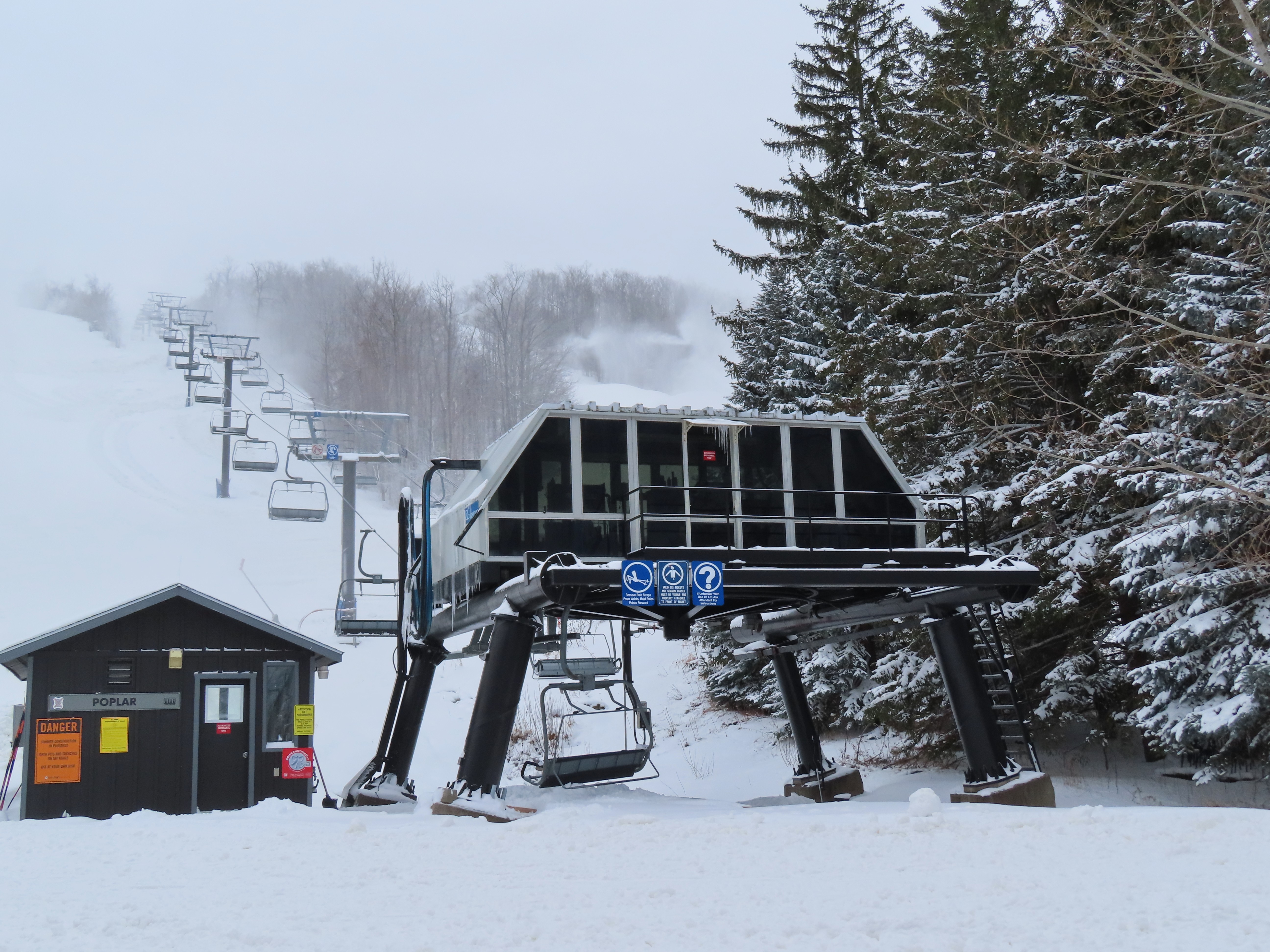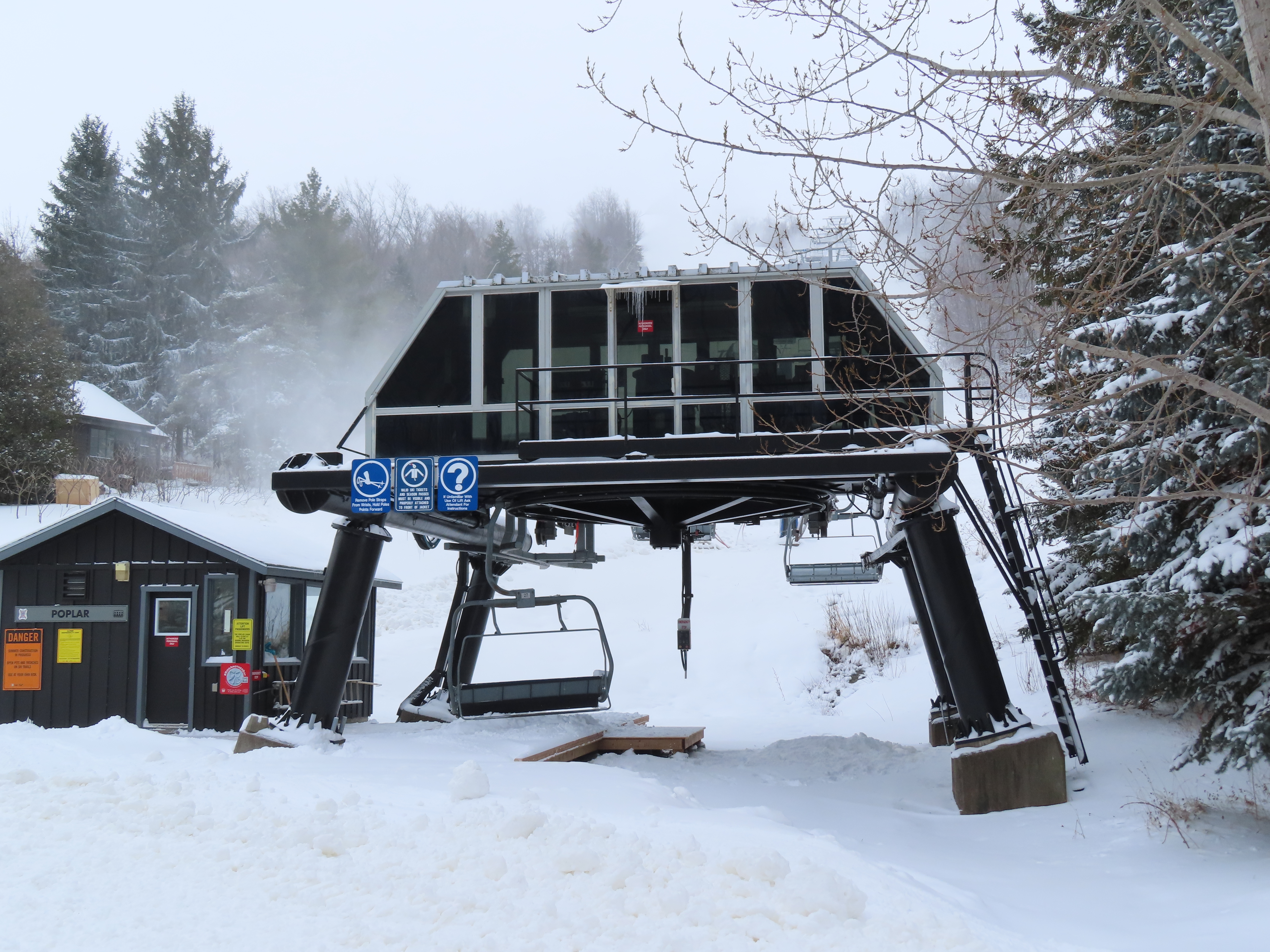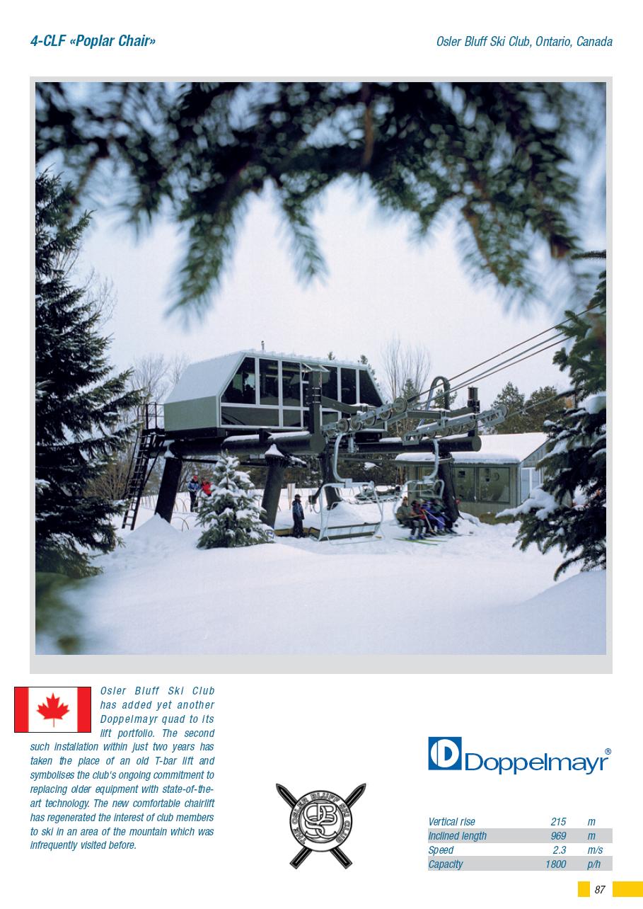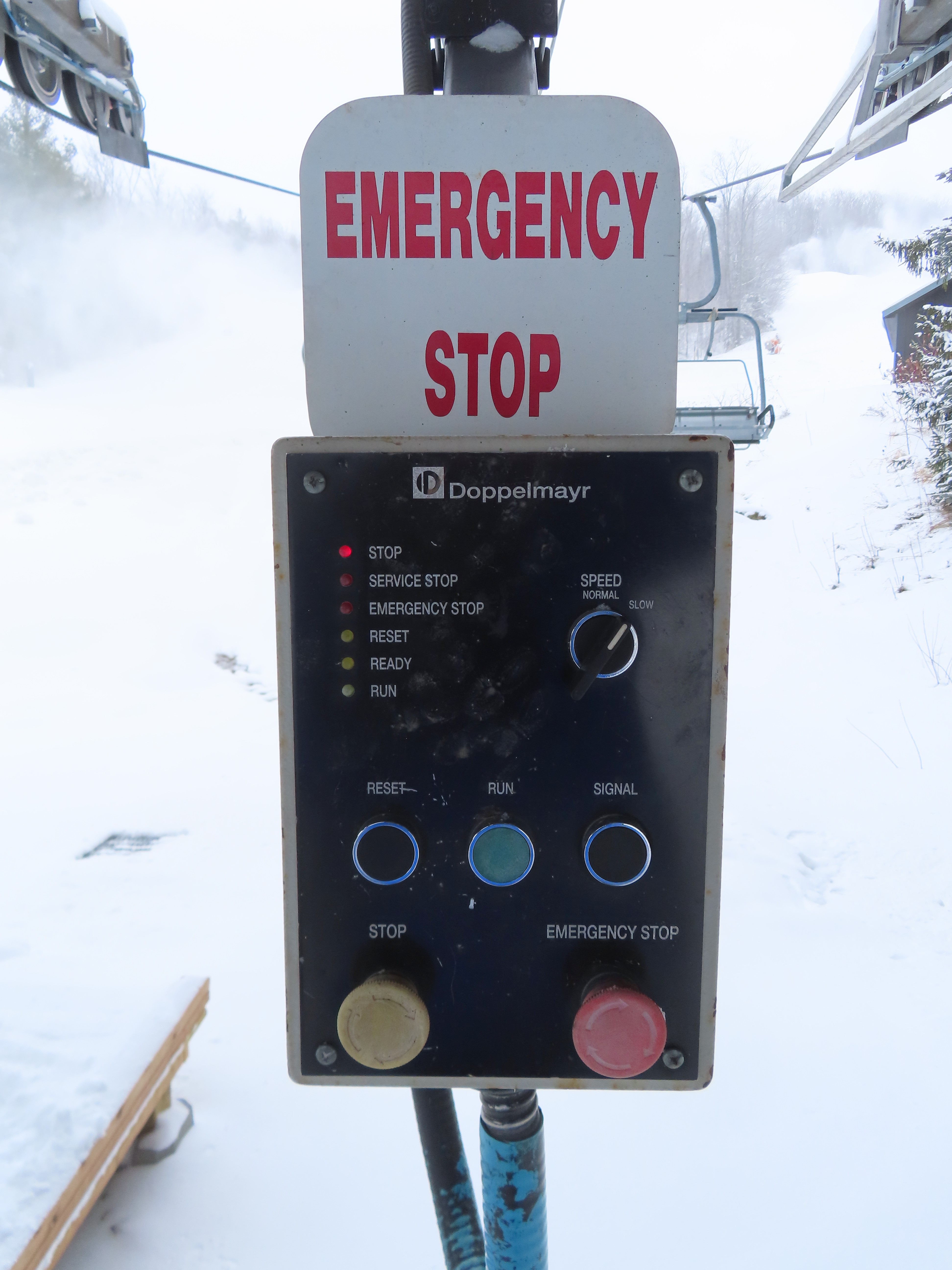 This lift services the northernmost trails at Osler and operates peak days only.Top return terminal seen from below.View down the line at tower 11.Loading area and motor room.View up from the base during snowmaking operations.Another view of the drive station.Lift overview.Outside operator controls.Brakes in the motor room.Electric motor.Backup engine.Gearbox.Top bullwheel.Breakover towers near the summit.Doppelmayr Worldbook entry.