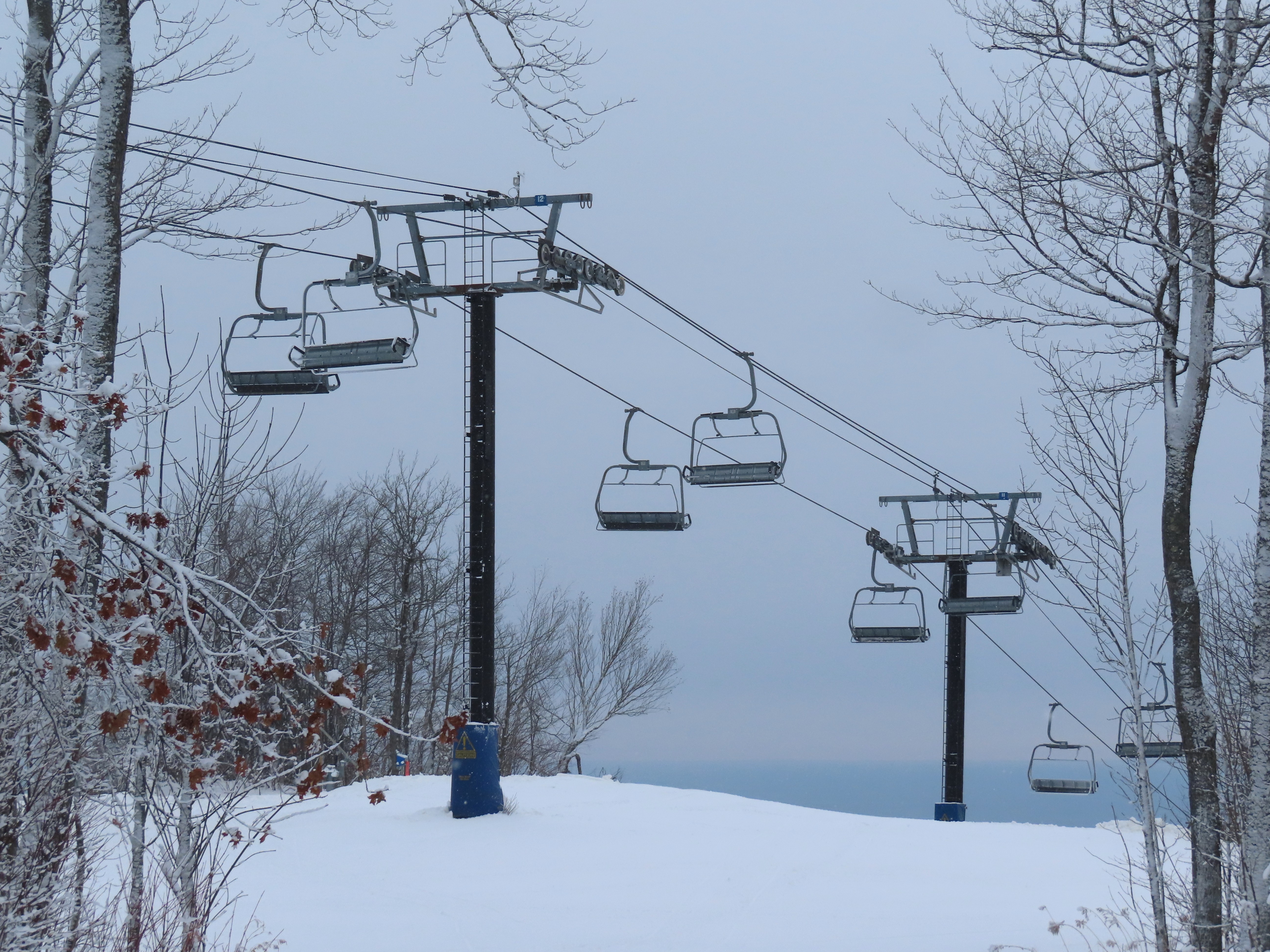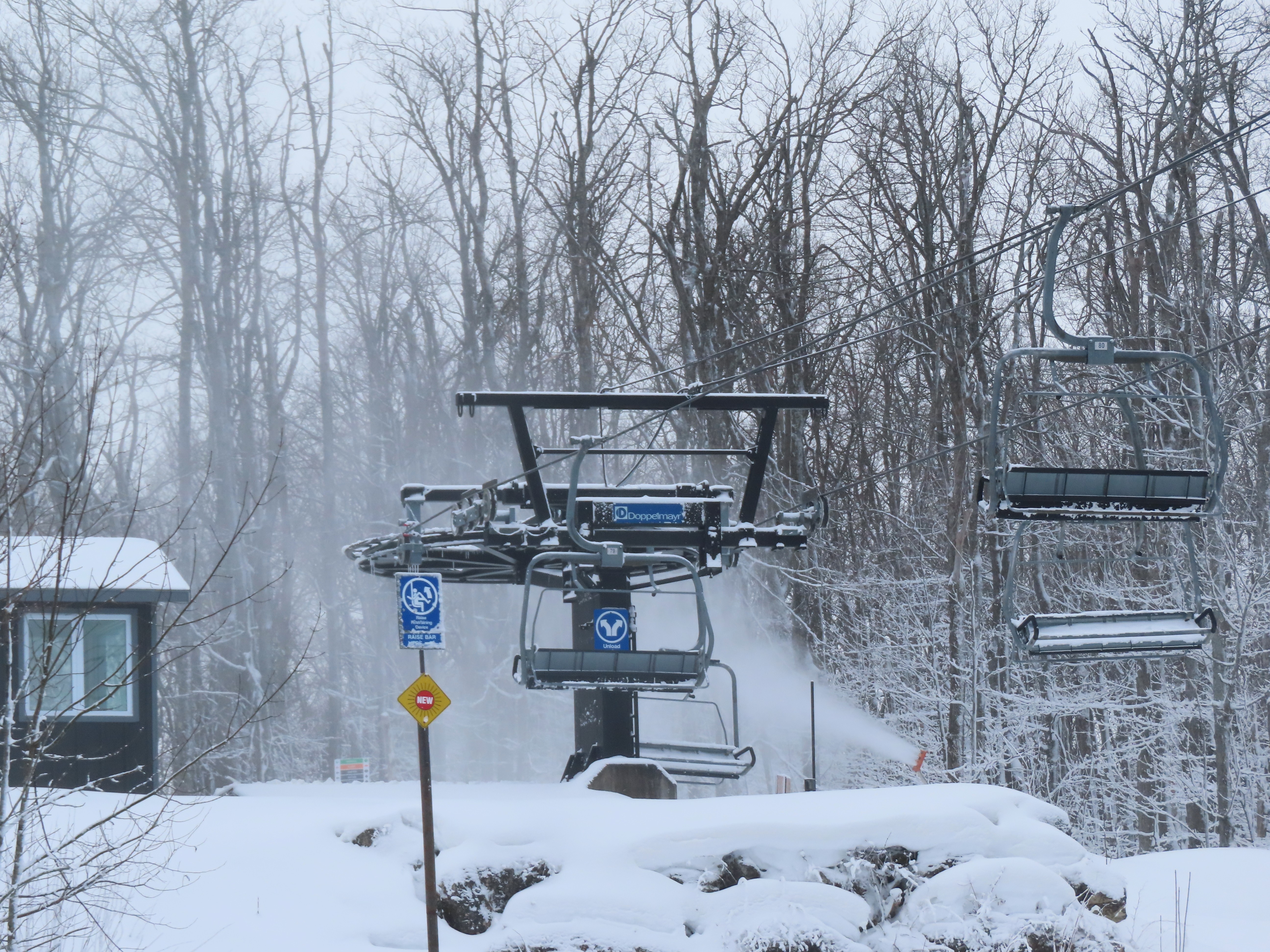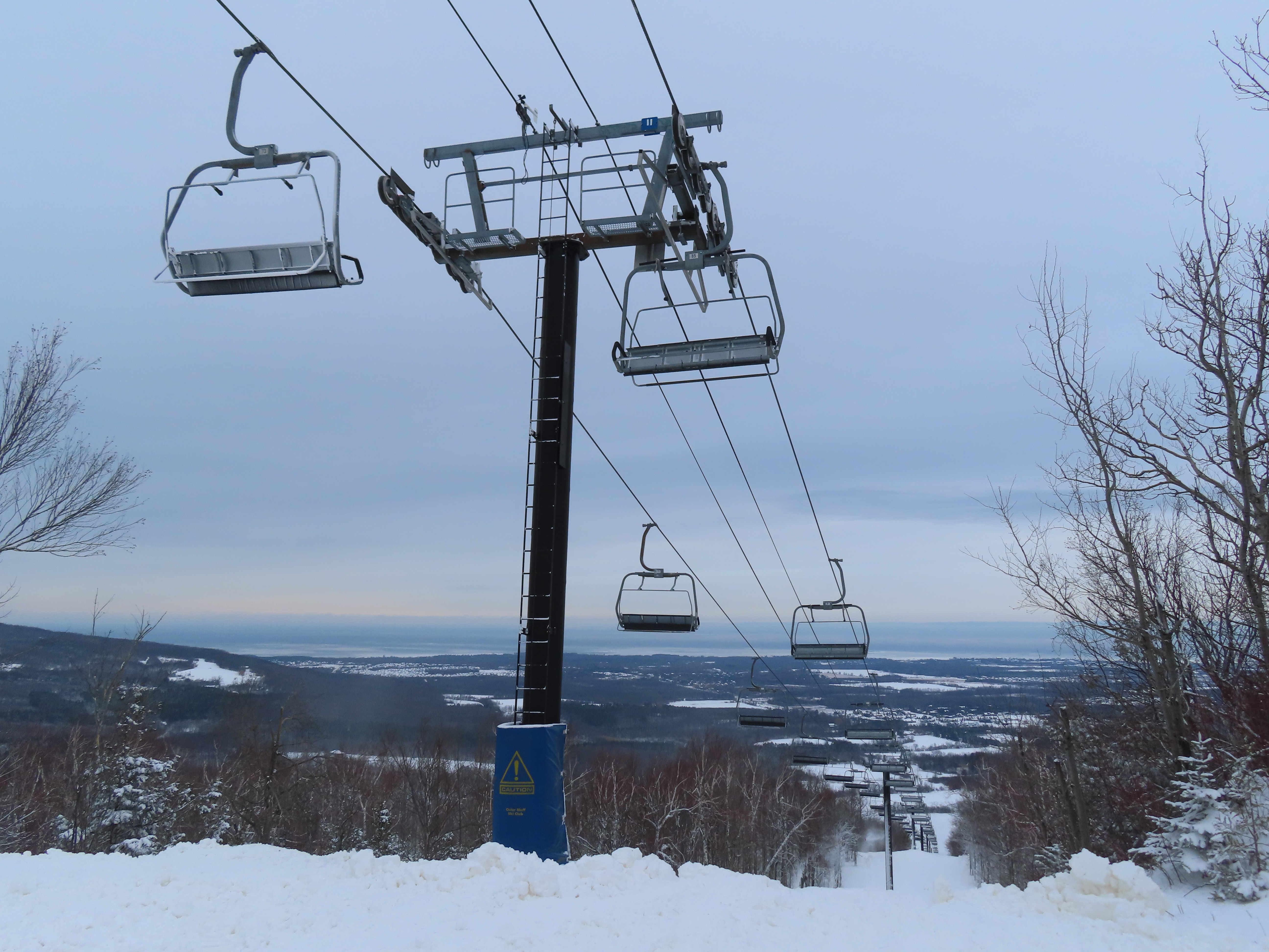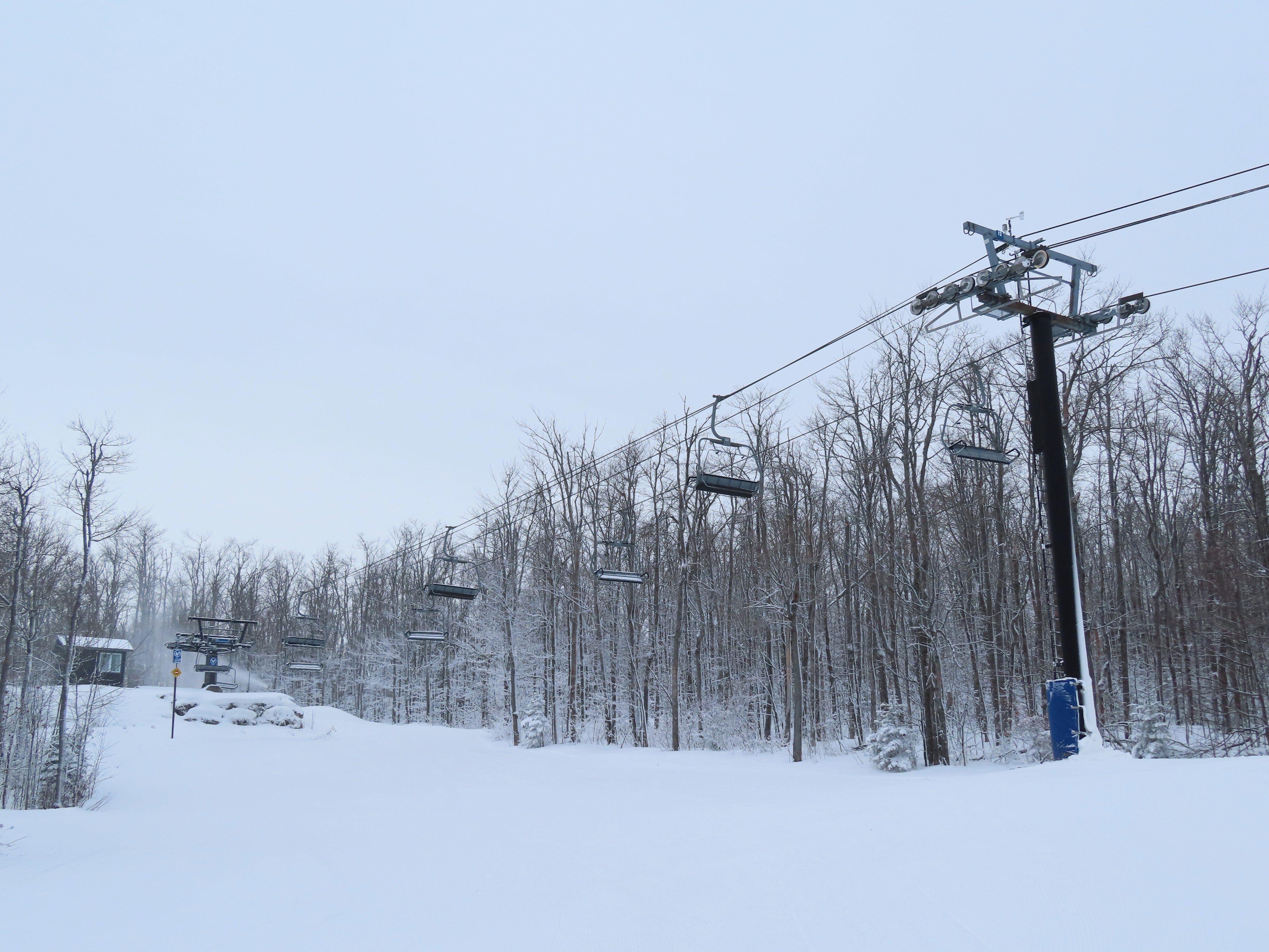 This lift services the northernmost trails at Osler and operates peak days only.Top return terminal seen from below.View down the line at tower 11.Loading area and motor room.View up from the base during snowmaking operations.Another view of the drive station.Lift overview.Outside operator controls.Brakes in the motor room.Electric motor.Backup engine.Gearbox.Top bullwheel.Breakover towers near the summit.Doppelmayr Worldbook entry.