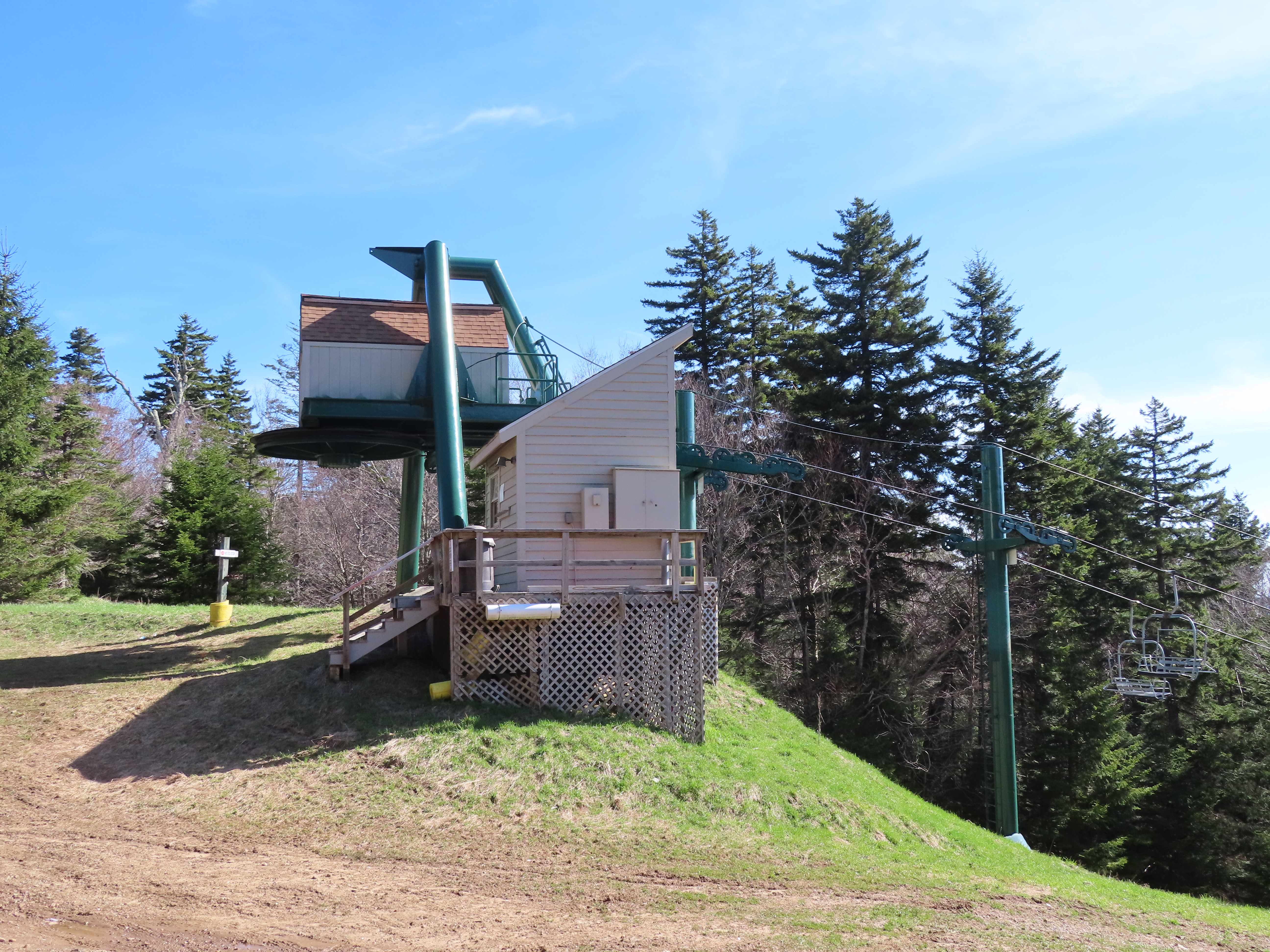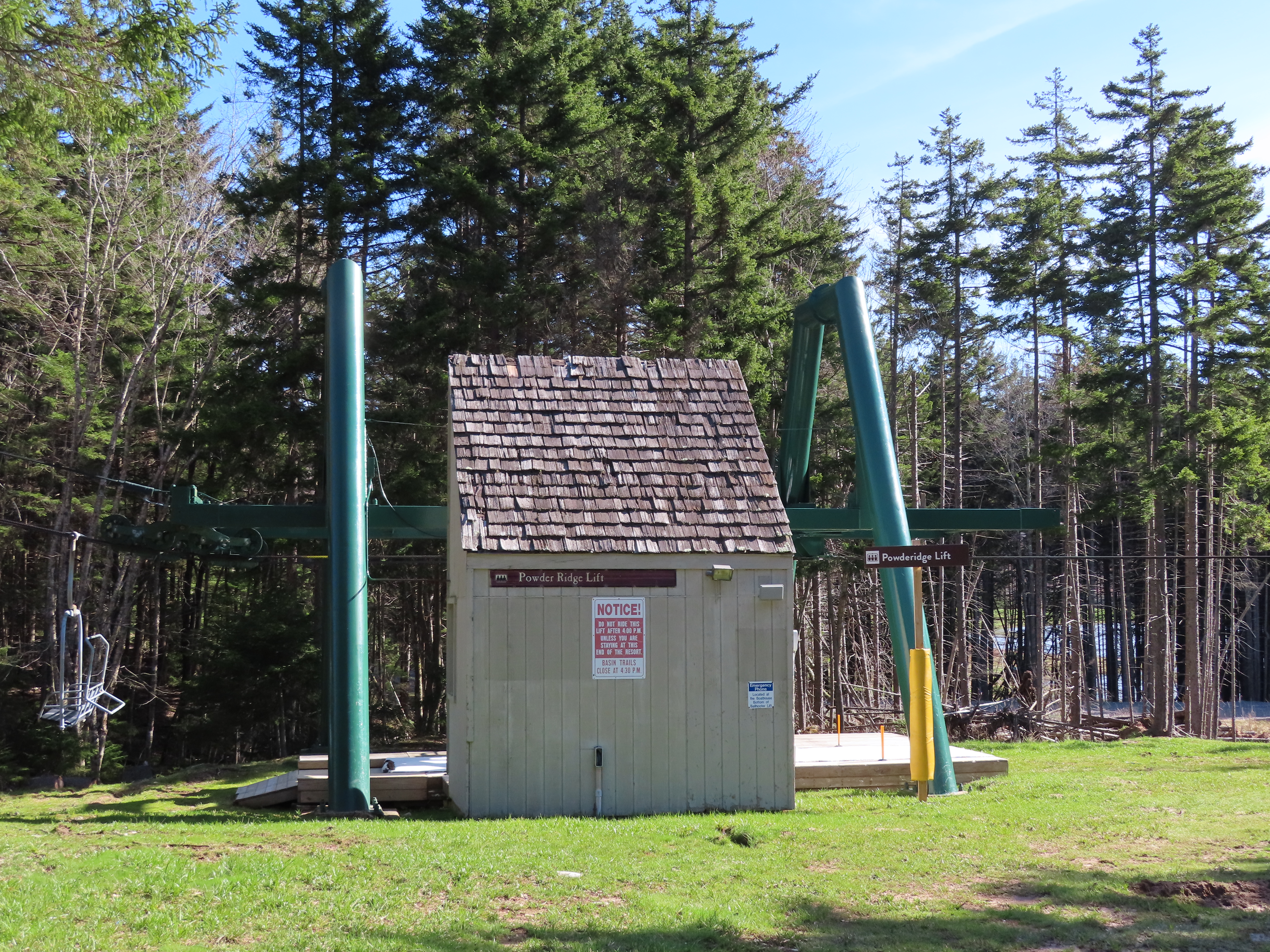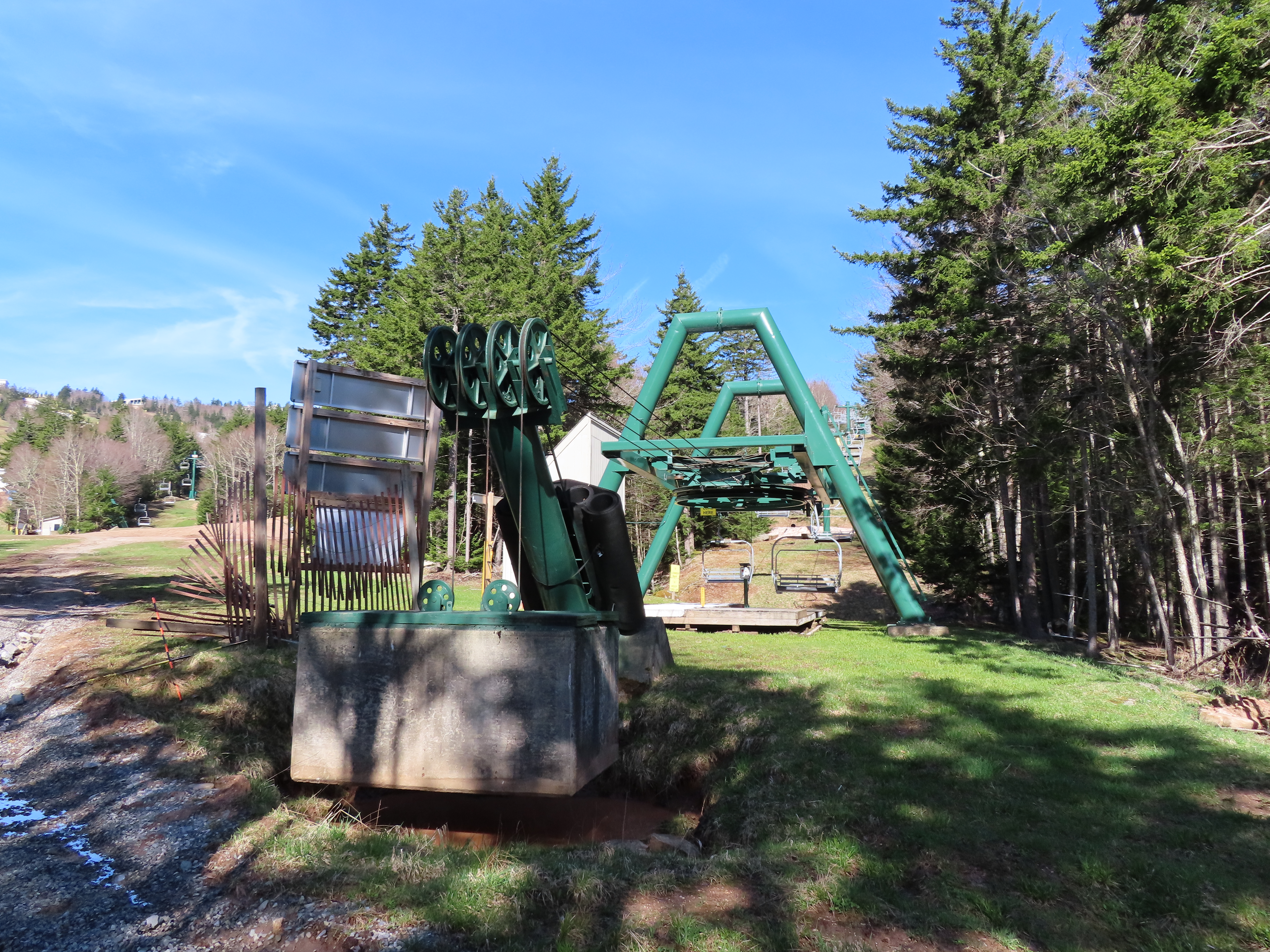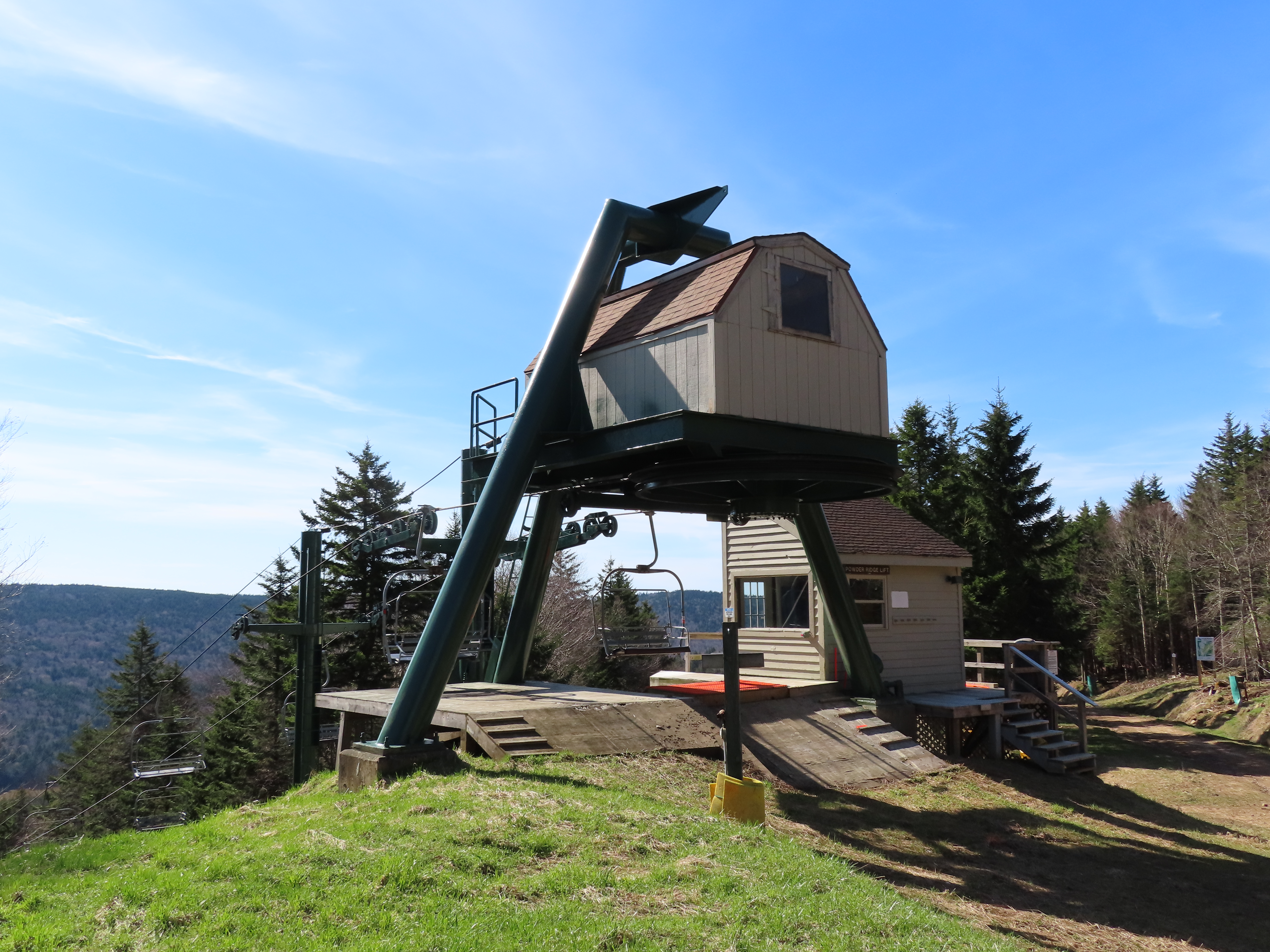 The new Powderidge lift opened circa 1990 and replaced a shorter version in a new alignment.Loading area.Counterweight tensioning.View up the long lift line.Looking down.Towers for this lift came from the old version as well as the retired, short-lived Hawthorne lift.Top drive terminal.Side view of the top terminal.