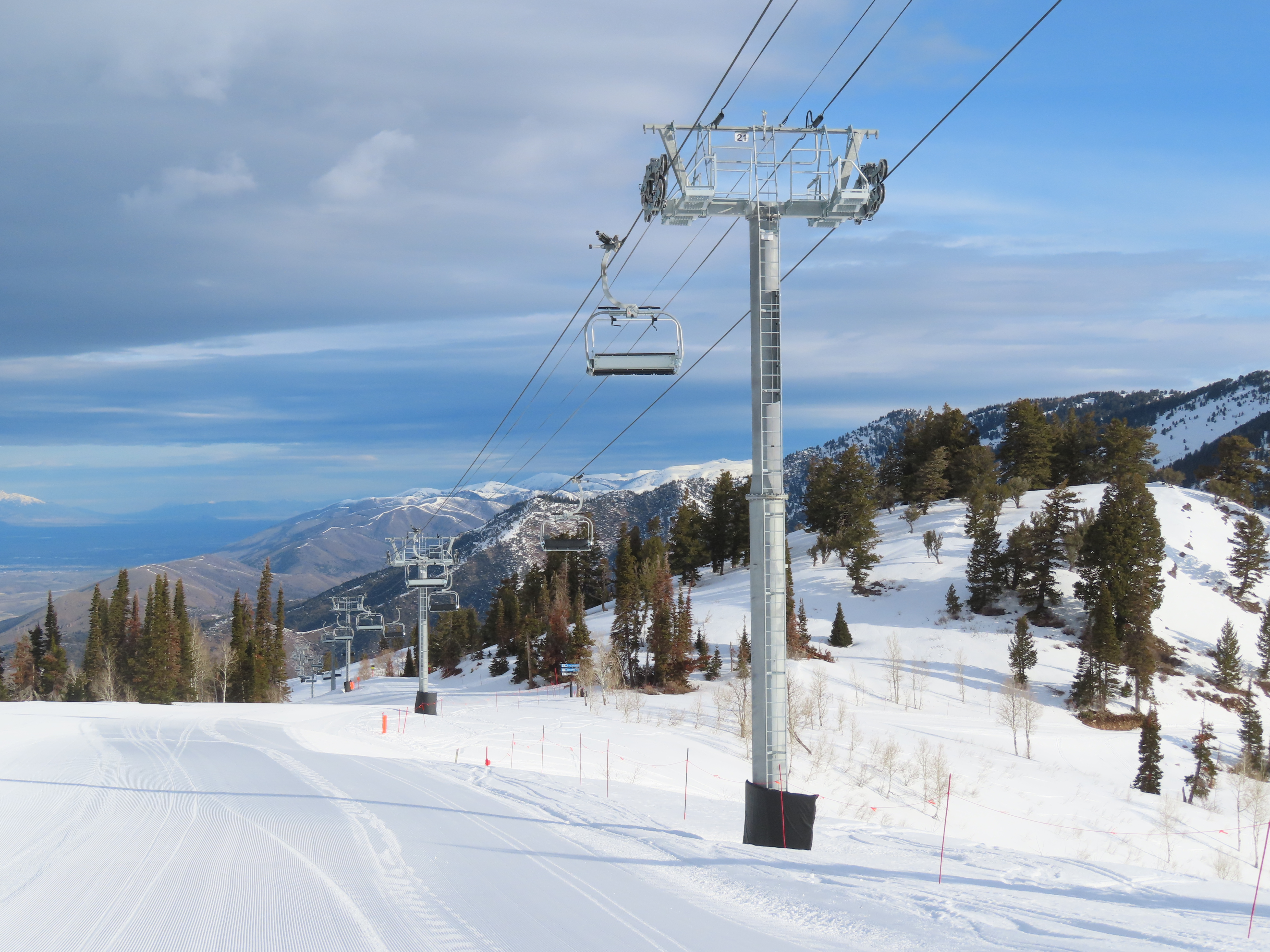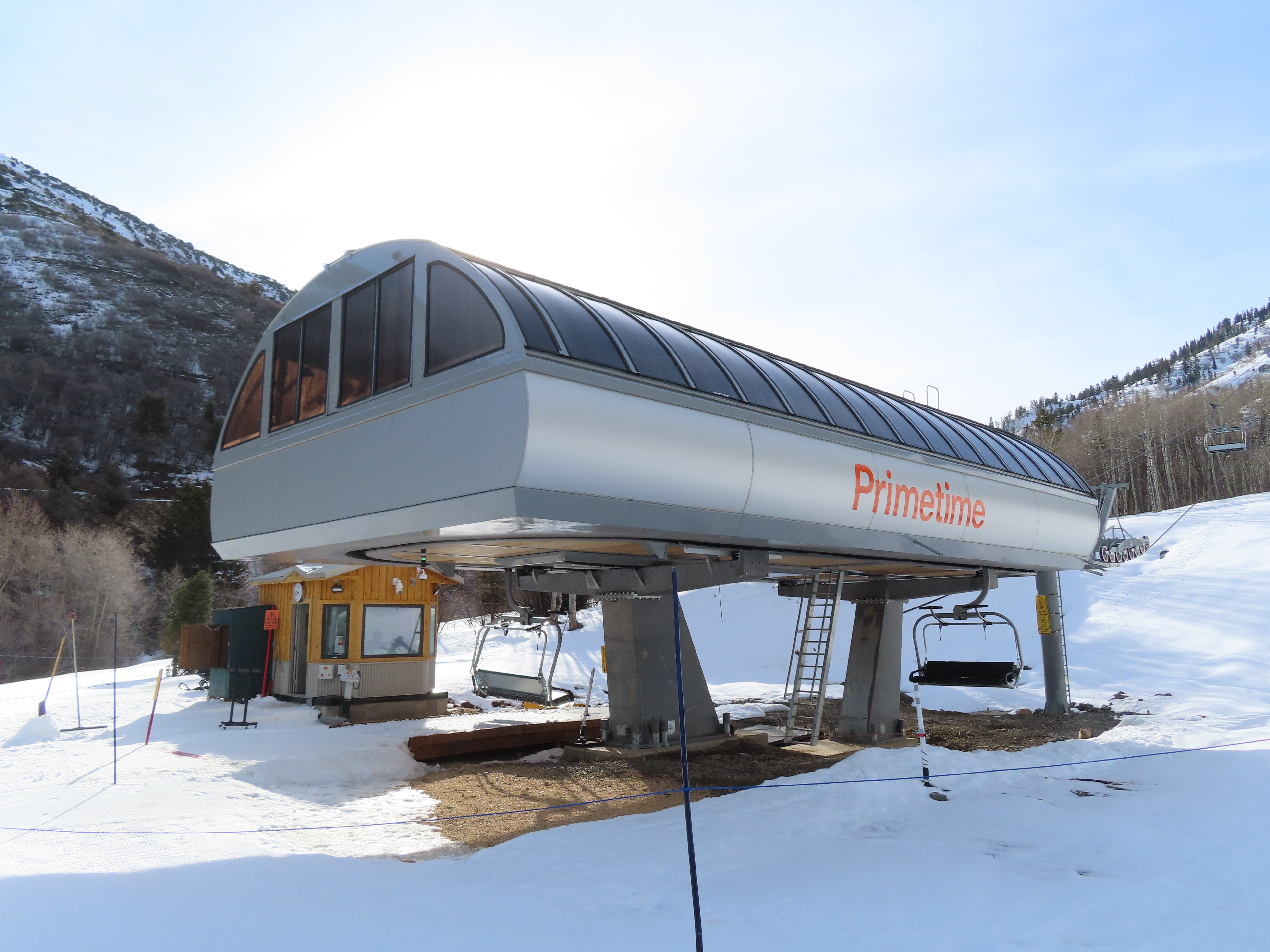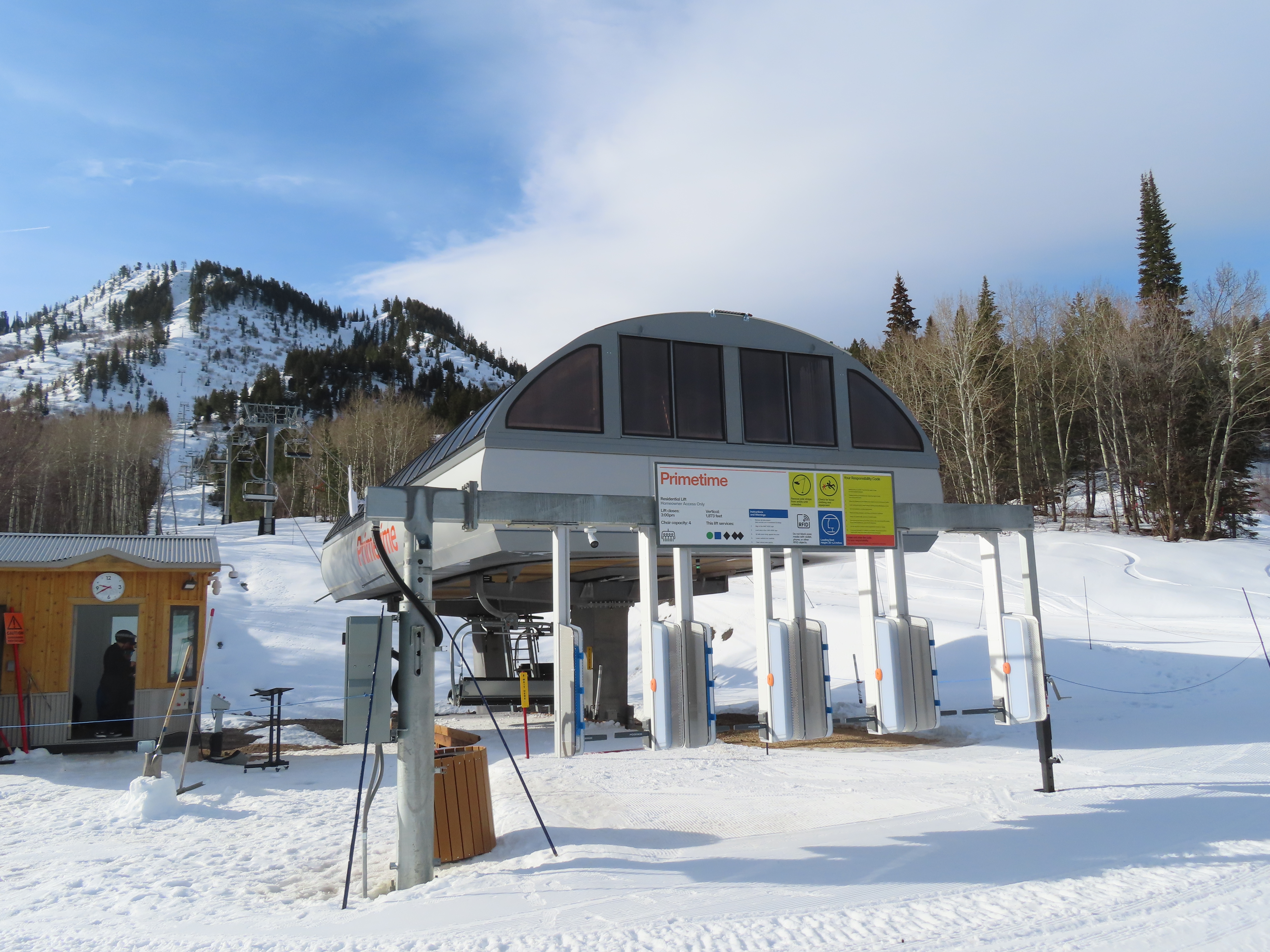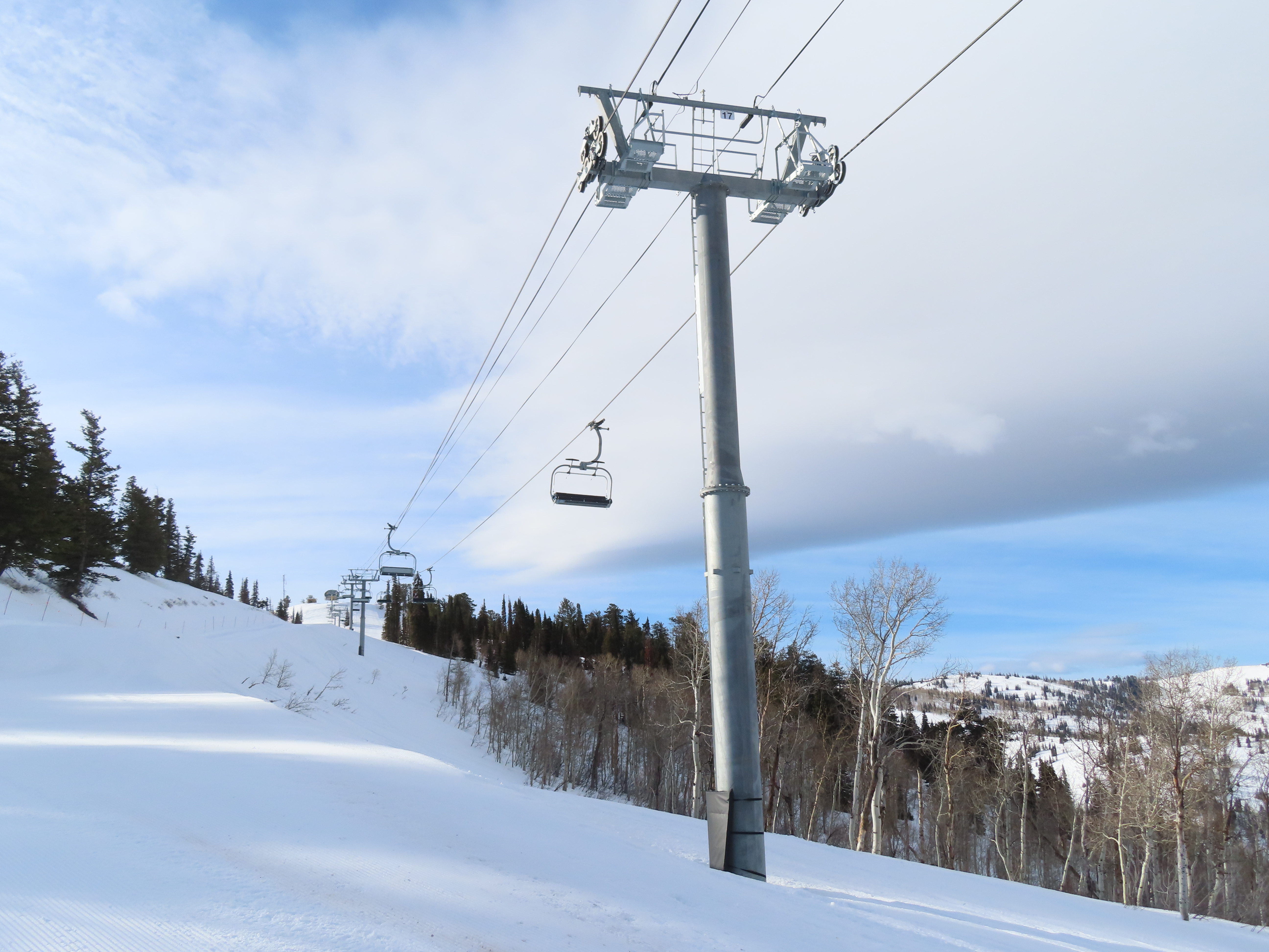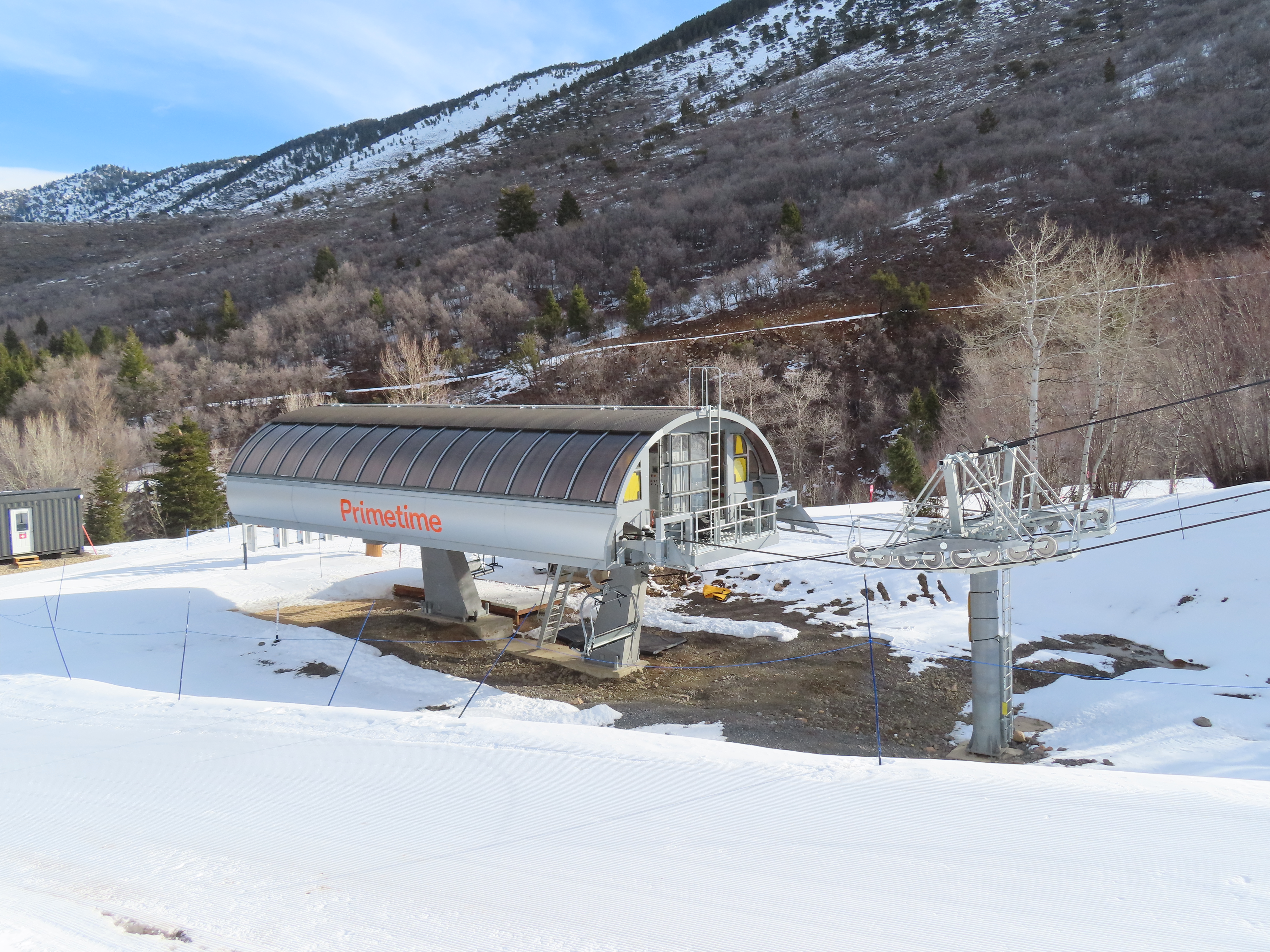 This Leitner-Poma detachable quad services a very large private skiing pod for homeowners.The top terminal sits next the private Raintree Skytrac, built one year prior.LPA station unloading area and maintenance rail.View from the summit.Side view of the top station.The upper part of the line is very low angle.Top terminal and final two towers.View up the line at tower 20.Tower 17 with combination assemblies.View up at T17.View down above the steep section of the line.The first few towers near Davenport Creek.View up the steep middle part of the line.Lower return station.Lift overview.At Powder Mountain, lifts with orange labels are private while lifts with blue labels are public.View up the steep lift line.Side view of the bottom station.
