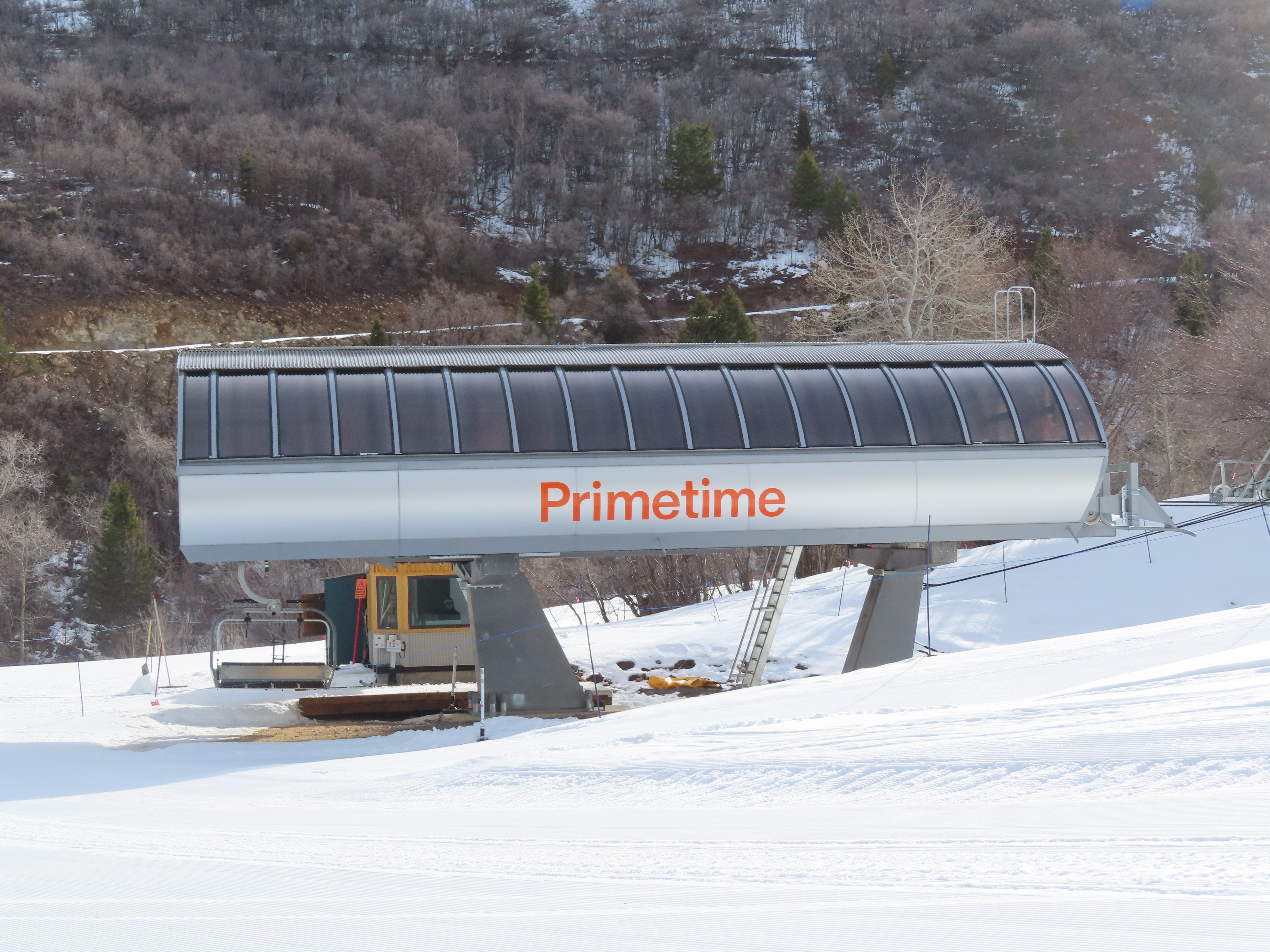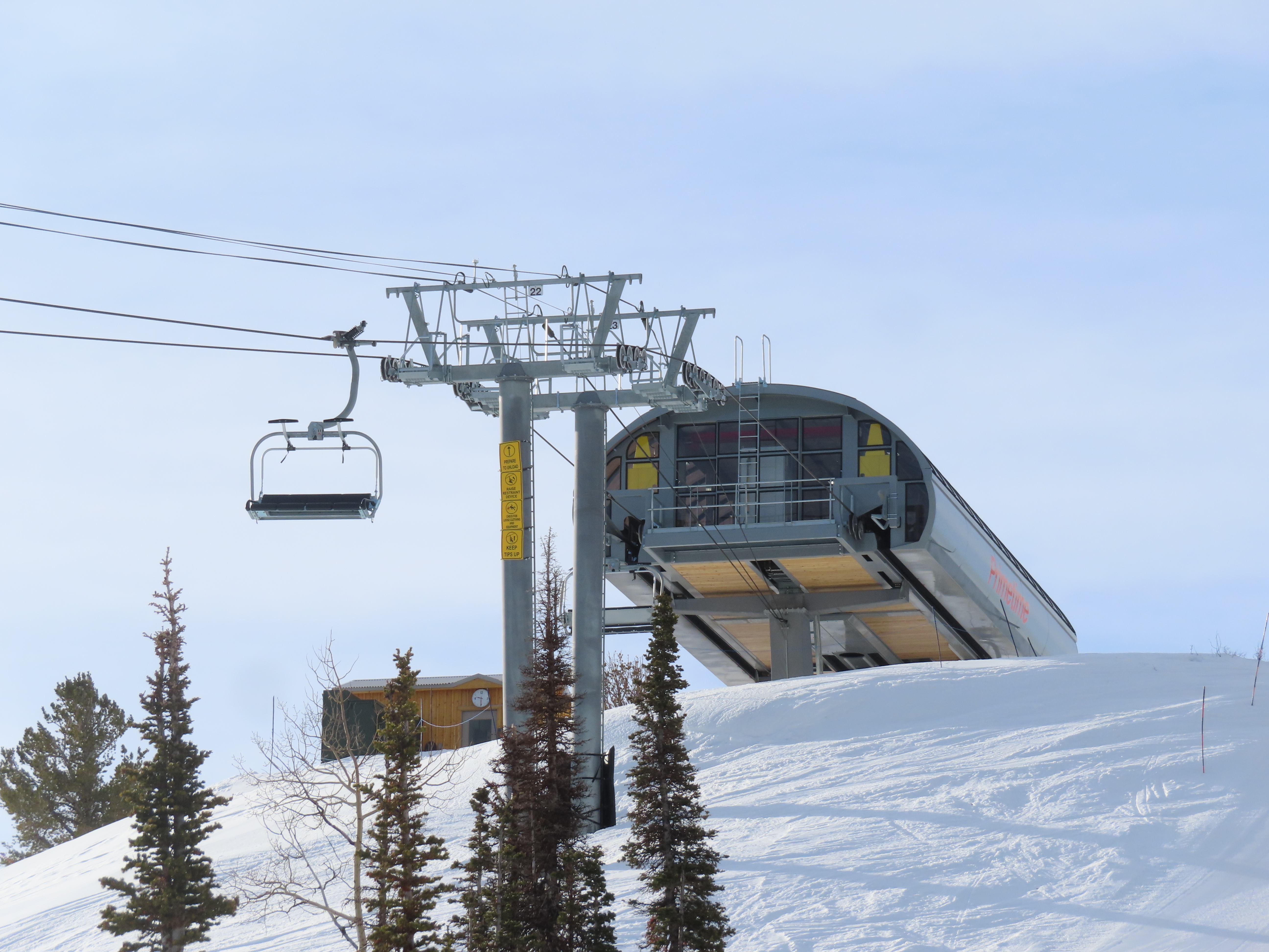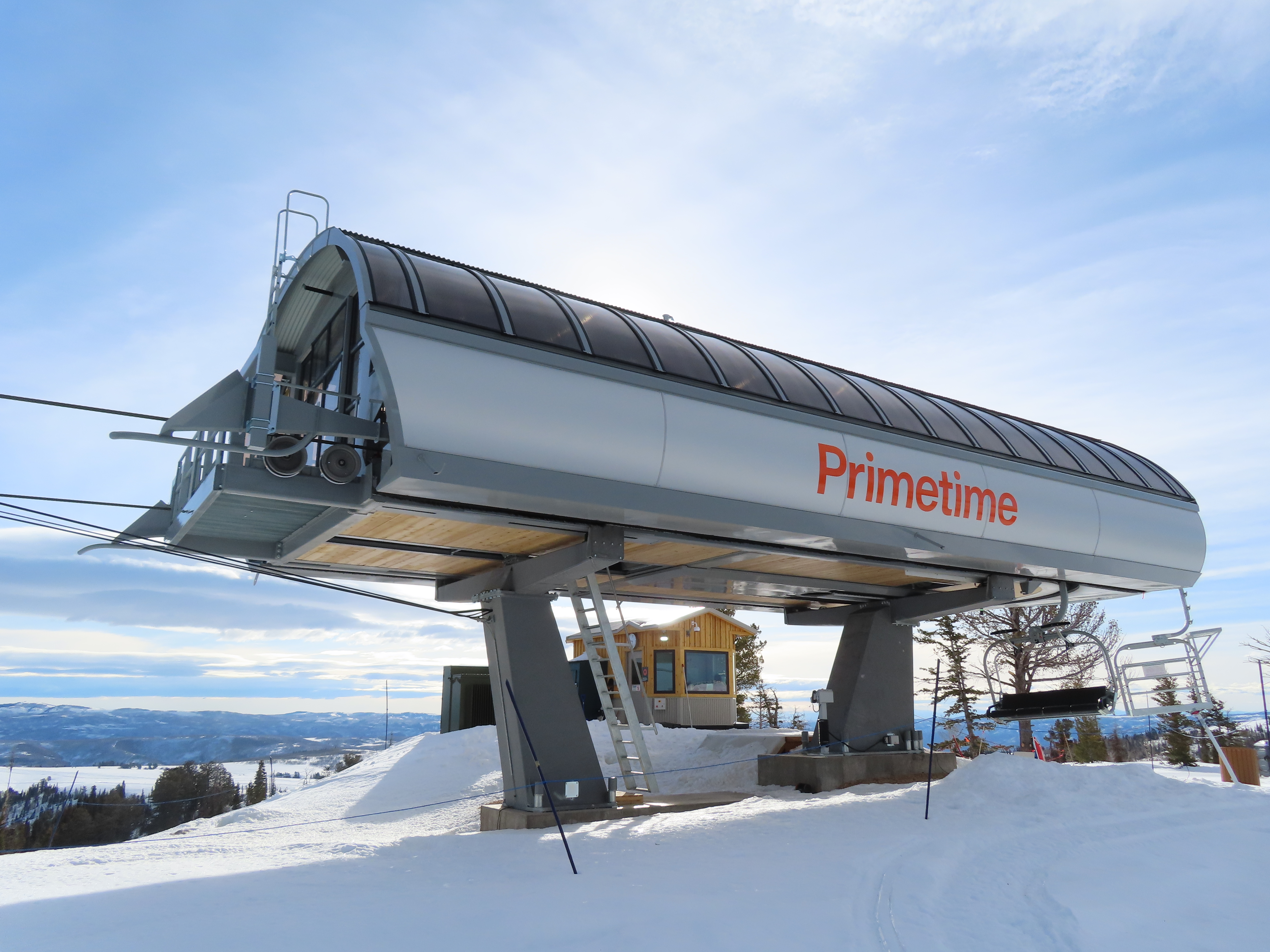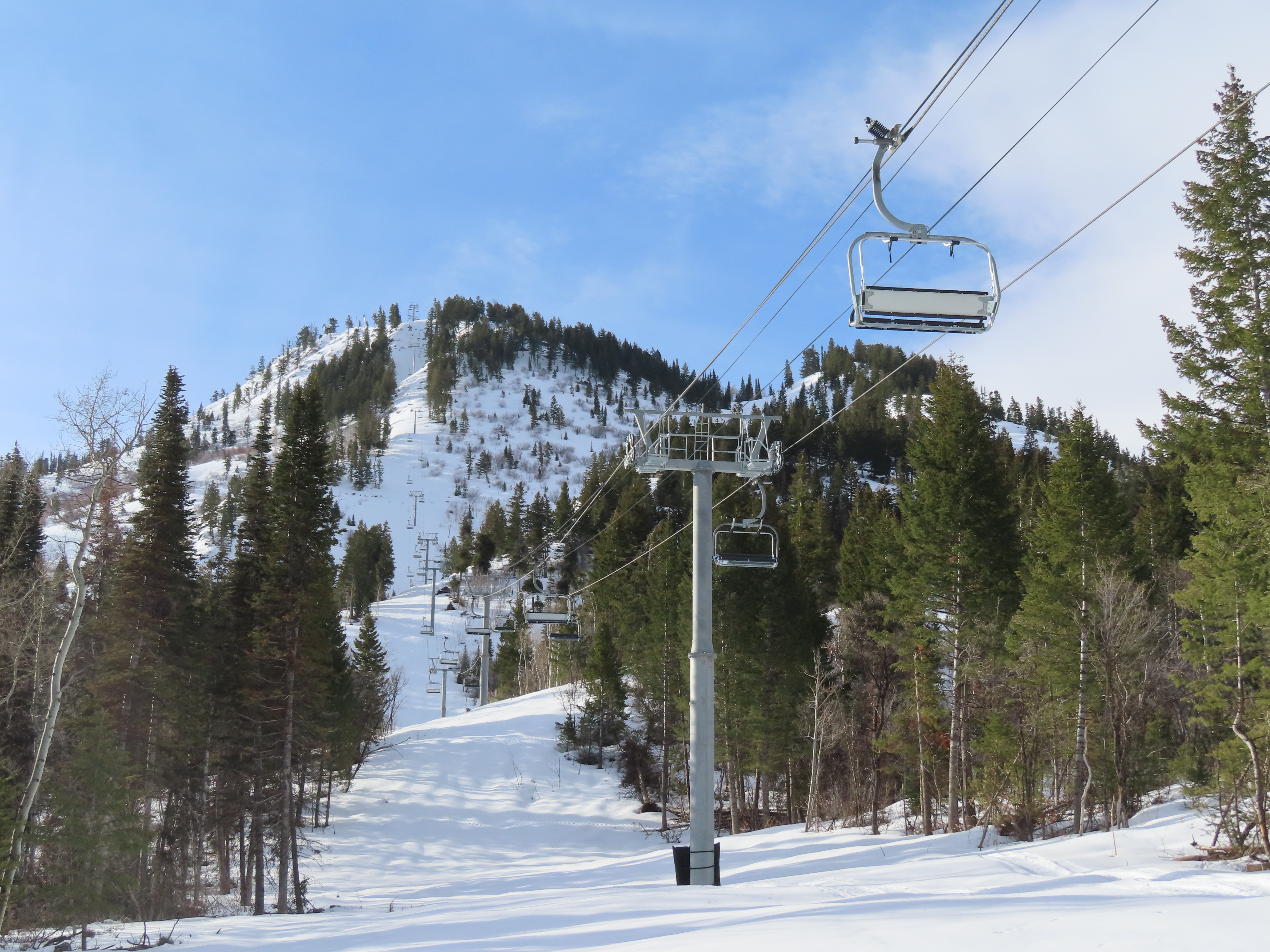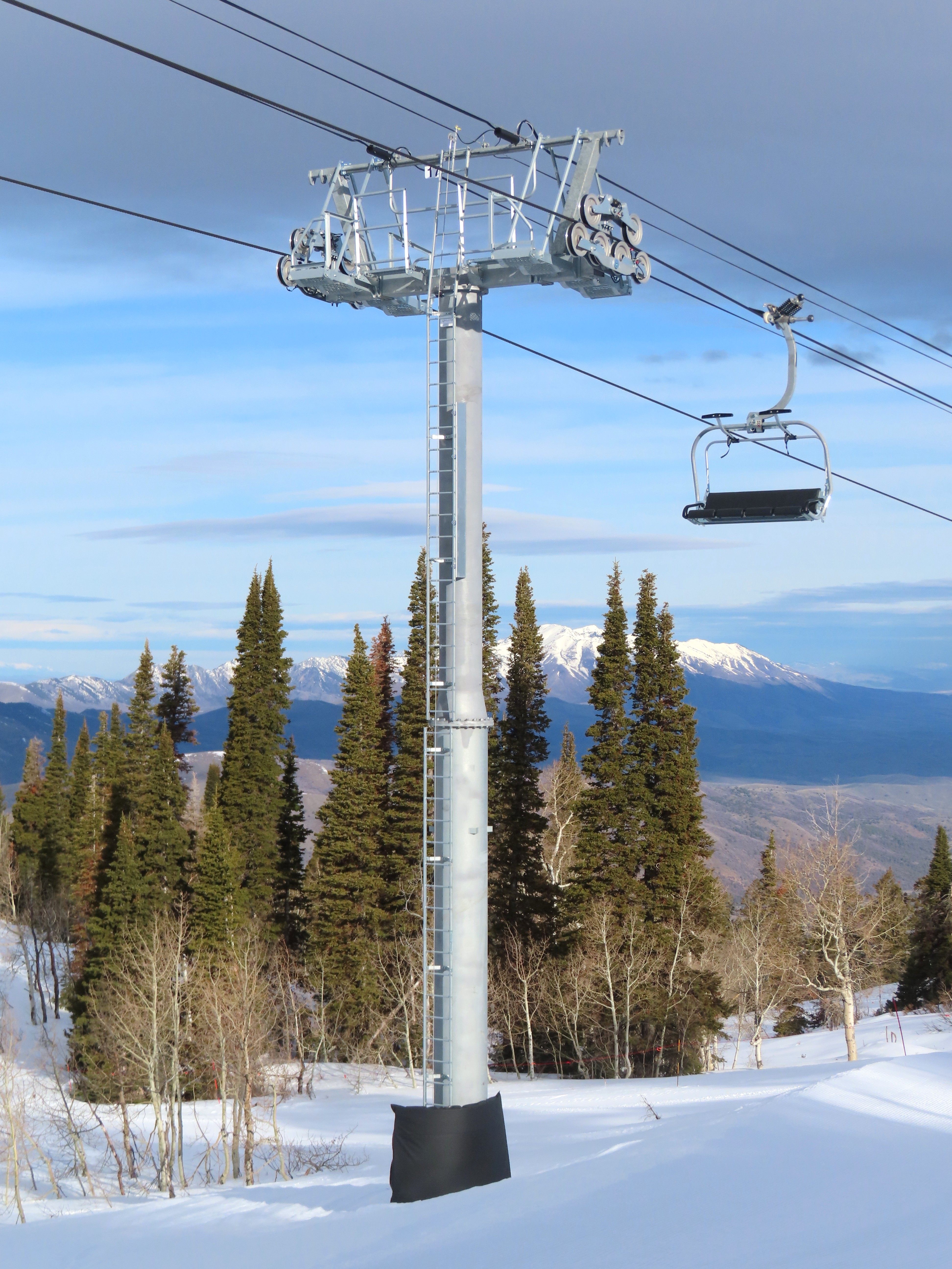 This Leitner-Poma detachable quad services a very large private skiing pod for homeowners.The top terminal sits next the private Raintree Skytrac, built one year prior.LPA station unloading area and maintenance rail.View from the summit.Side view of the top station.The upper part of the line is very low angle.Top terminal and final two towers.View up the line at tower 20.Tower 17 with combination assemblies.View up at T17.View down above the steep section of the line.The first few towers near Davenport Creek.View up the steep middle part of the line.Lower return station.Lift overview.At Powder Mountain, lifts with orange labels are private while lifts with blue labels are public.View up the steep lift line.Side view of the bottom station.