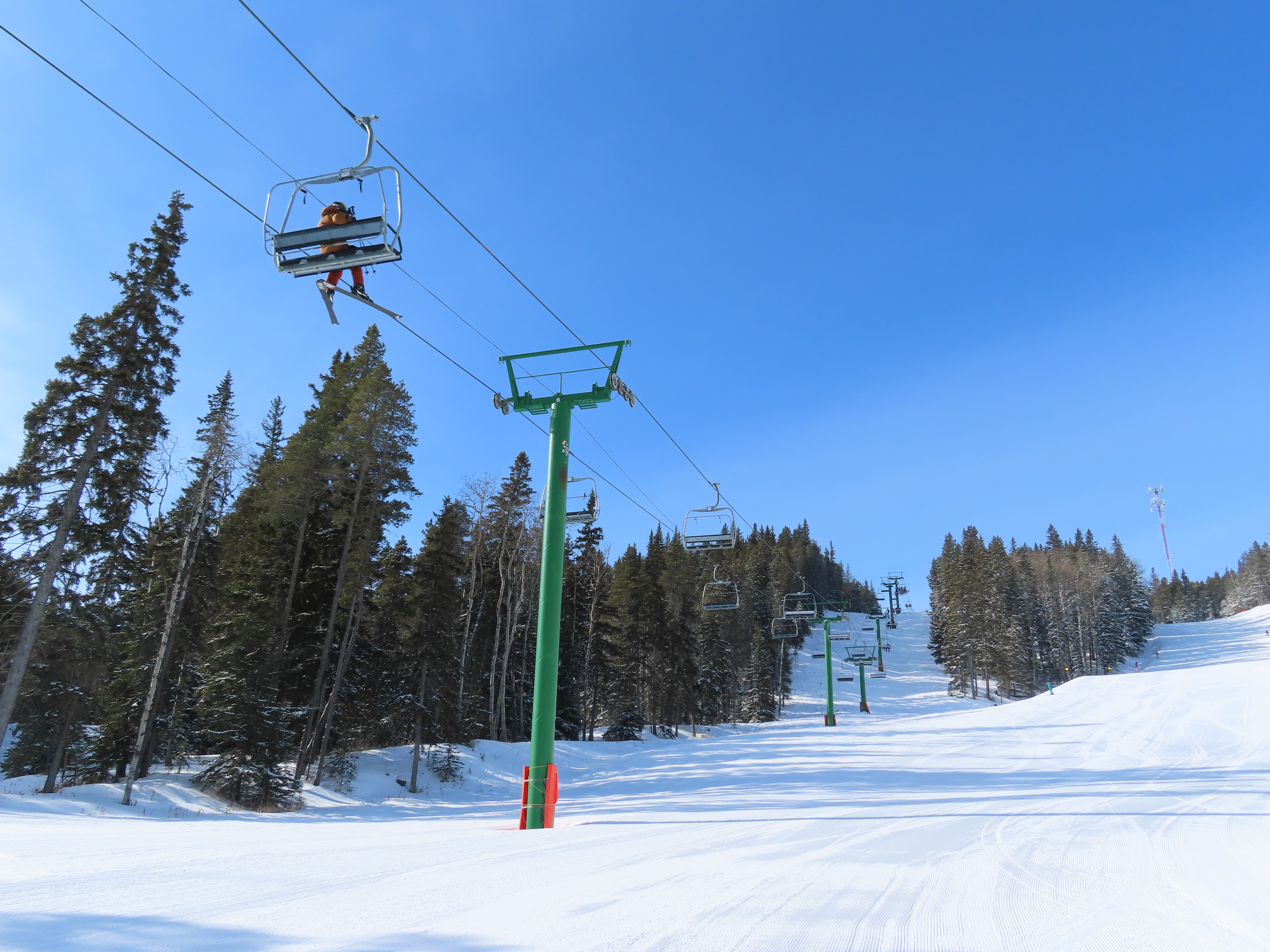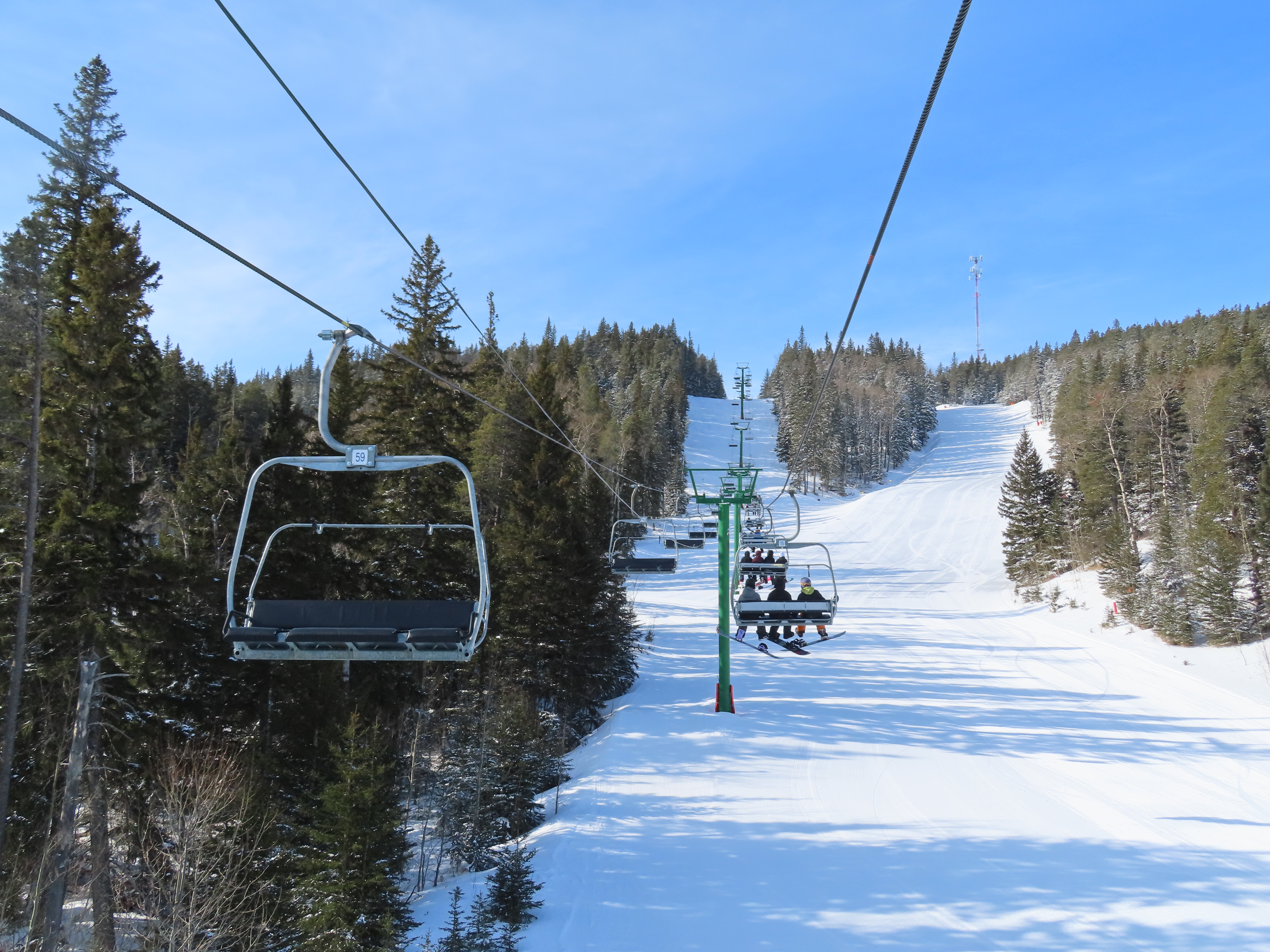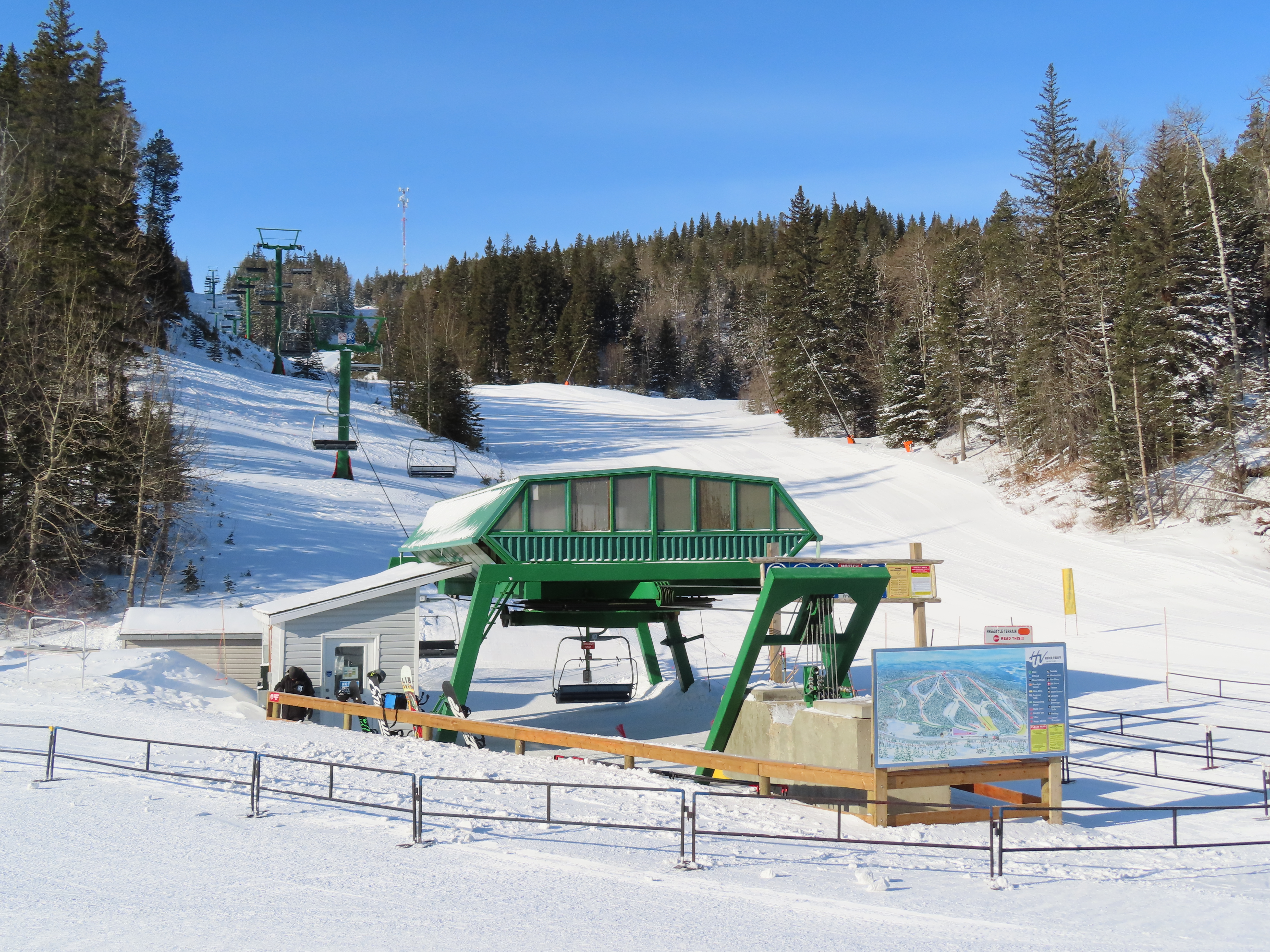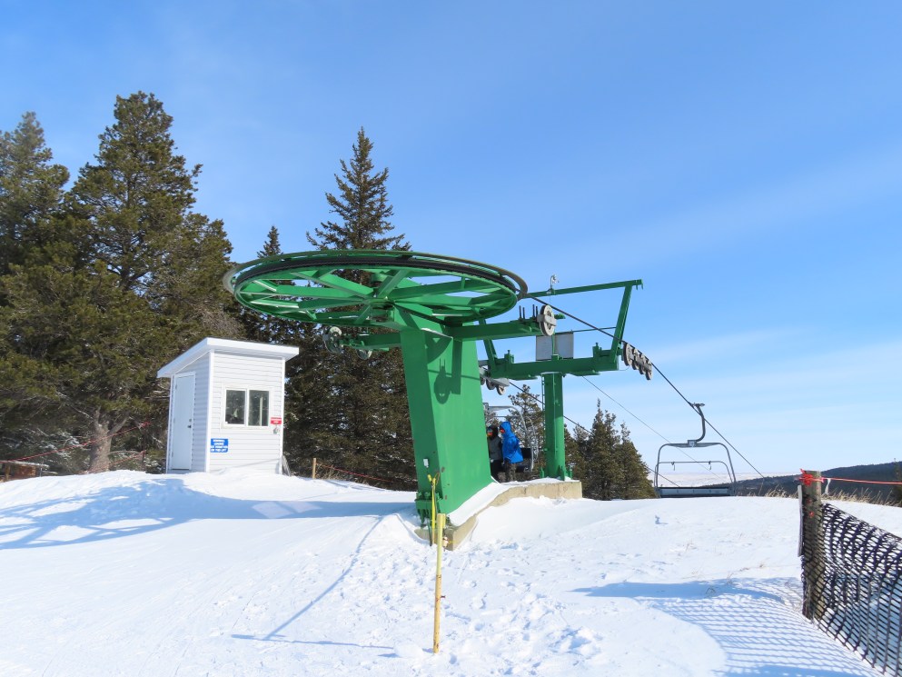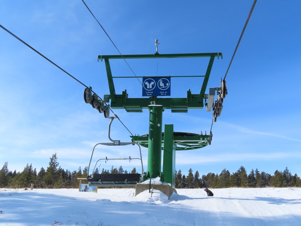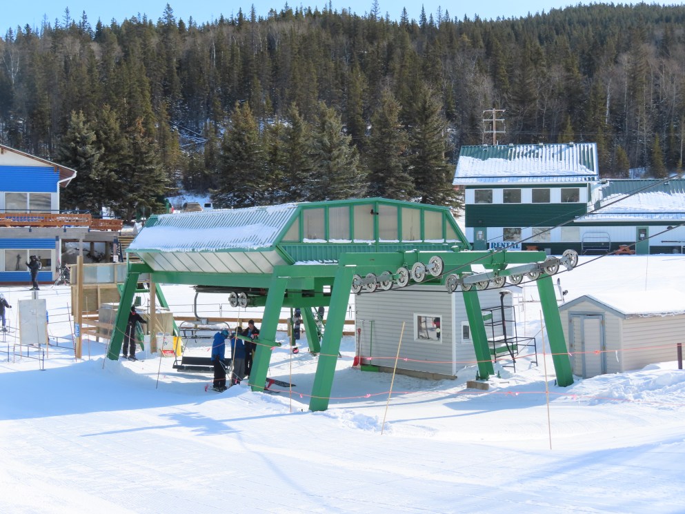 This provincially-operated ski area features a BM Lifts quad and backup Poma T-Bar.The chairs on this lift were replaced with Poma ones.Large counterweight behind the lower station.View riding up the middle part of the line.Looking back down.Nearing the summit.Tower 13.Top bullwheel.View down the line.Lower lift line.Middle part of the line.Portal tower 1 and the drive station.
