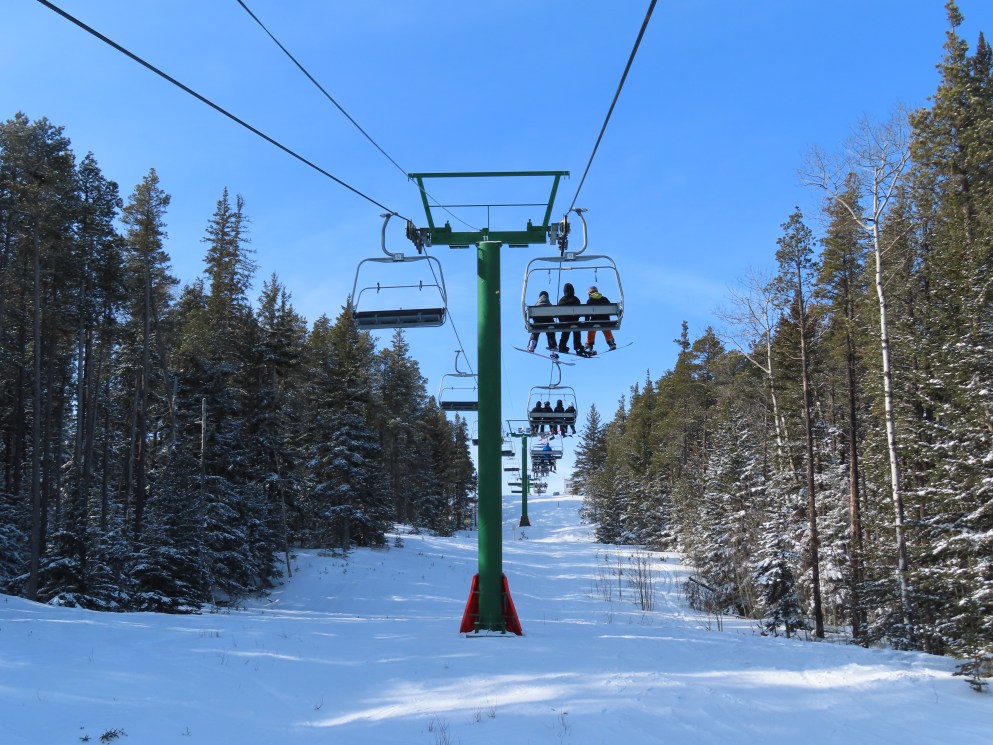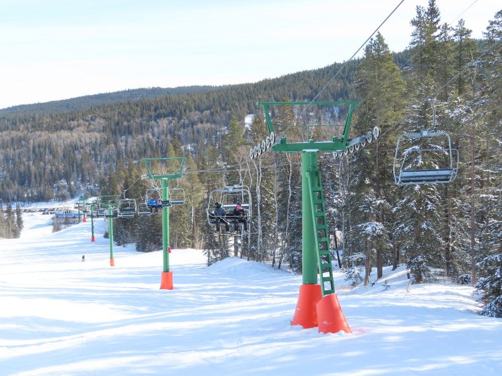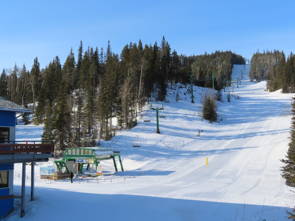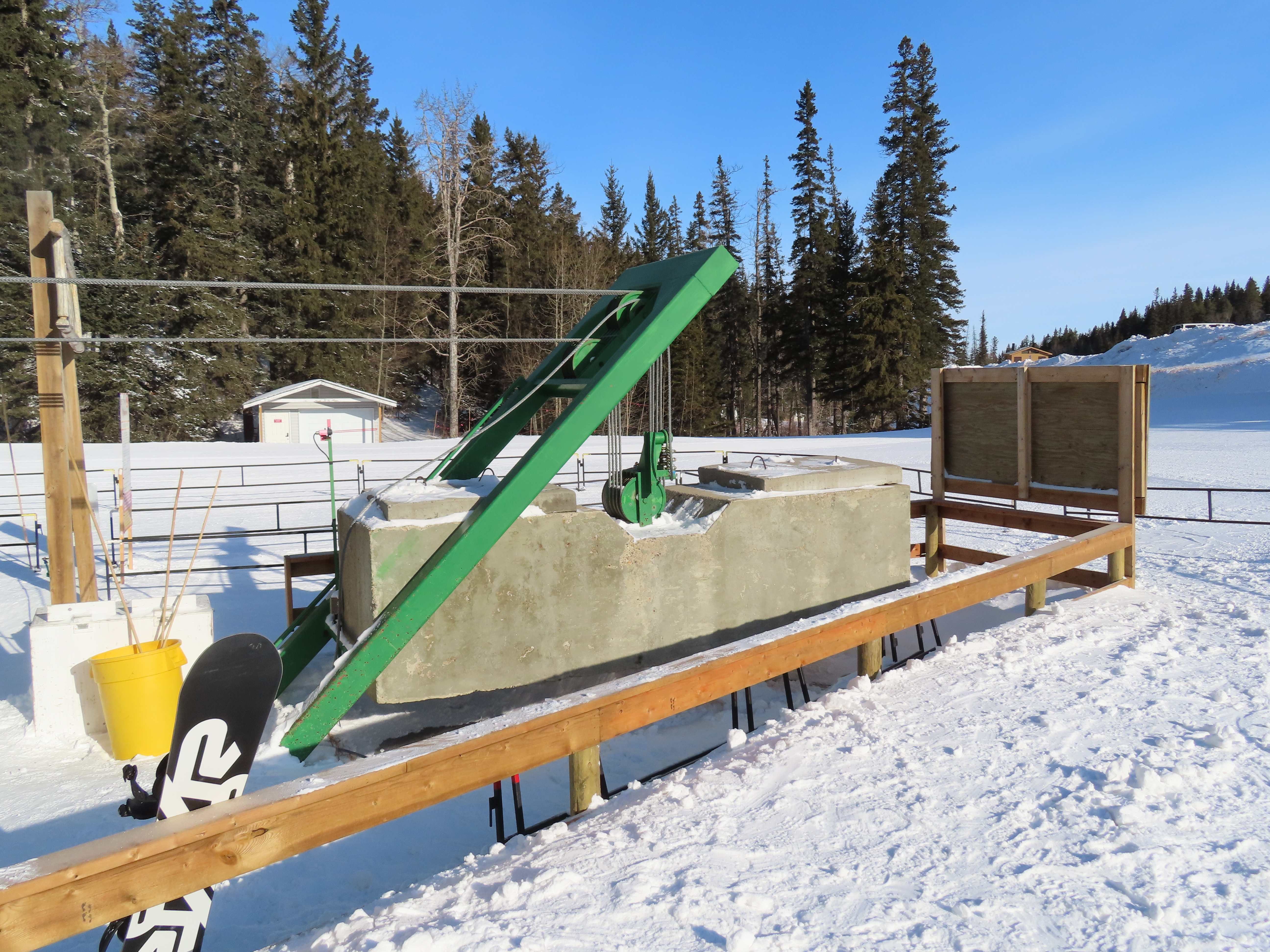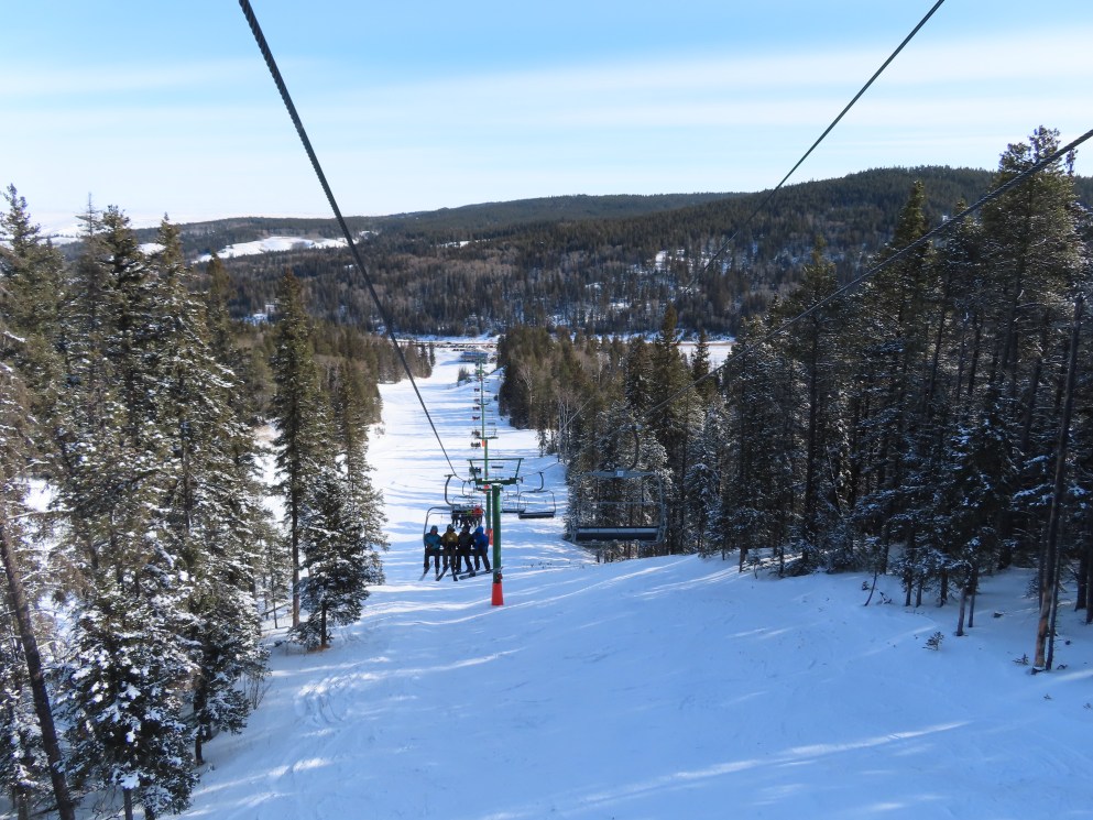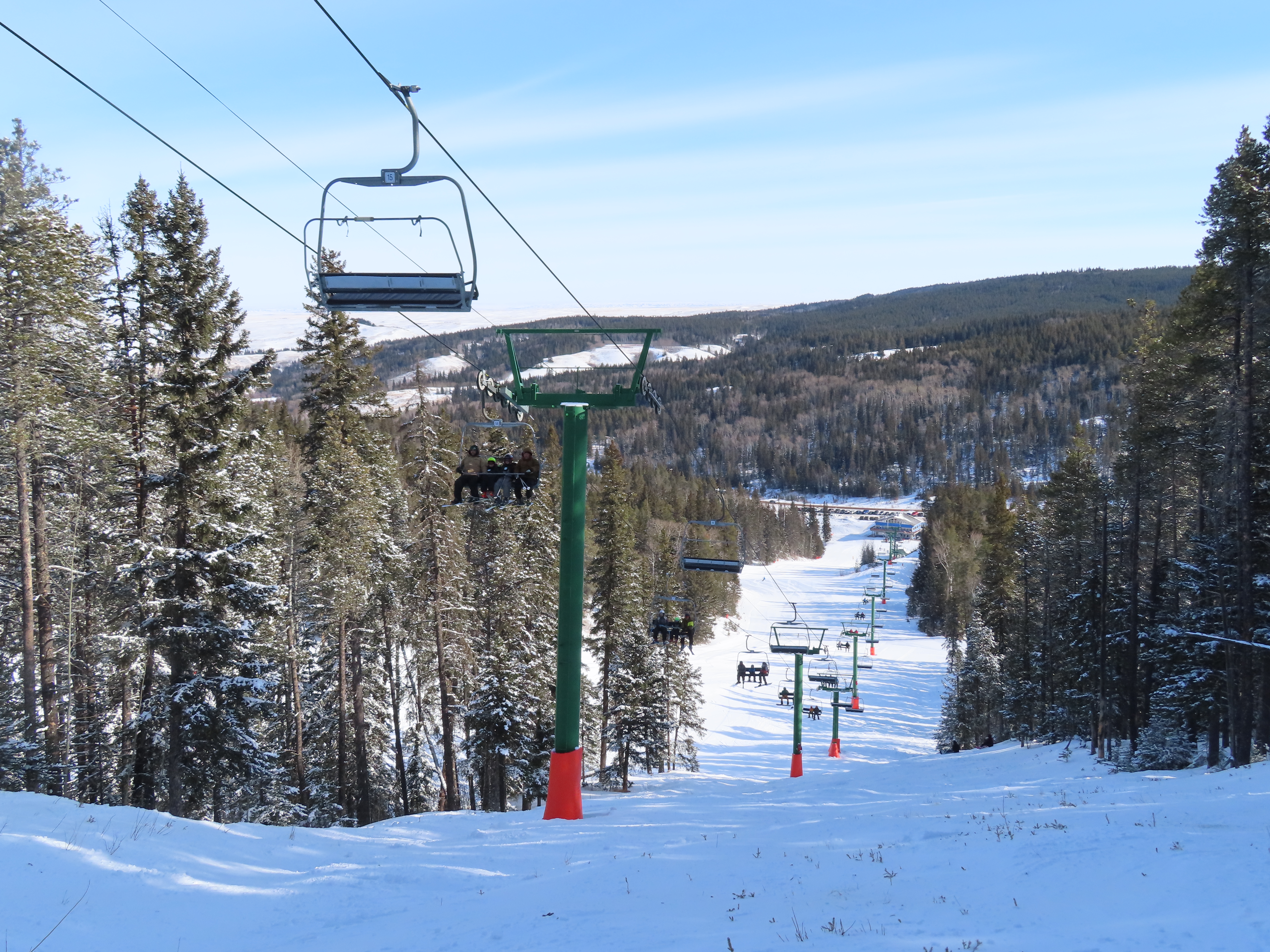 This provincially-operated ski area features a BM Lifts quad and backup Poma T-Bar.The chairs on this lift were replaced with Poma ones.Large counterweight behind the lower station.View riding up the middle part of the line.Looking back down.Nearing the summit.Tower 13.Top bullwheel.View down the line.Lower lift line.Middle part of the line.Portal tower 1 and the drive station.