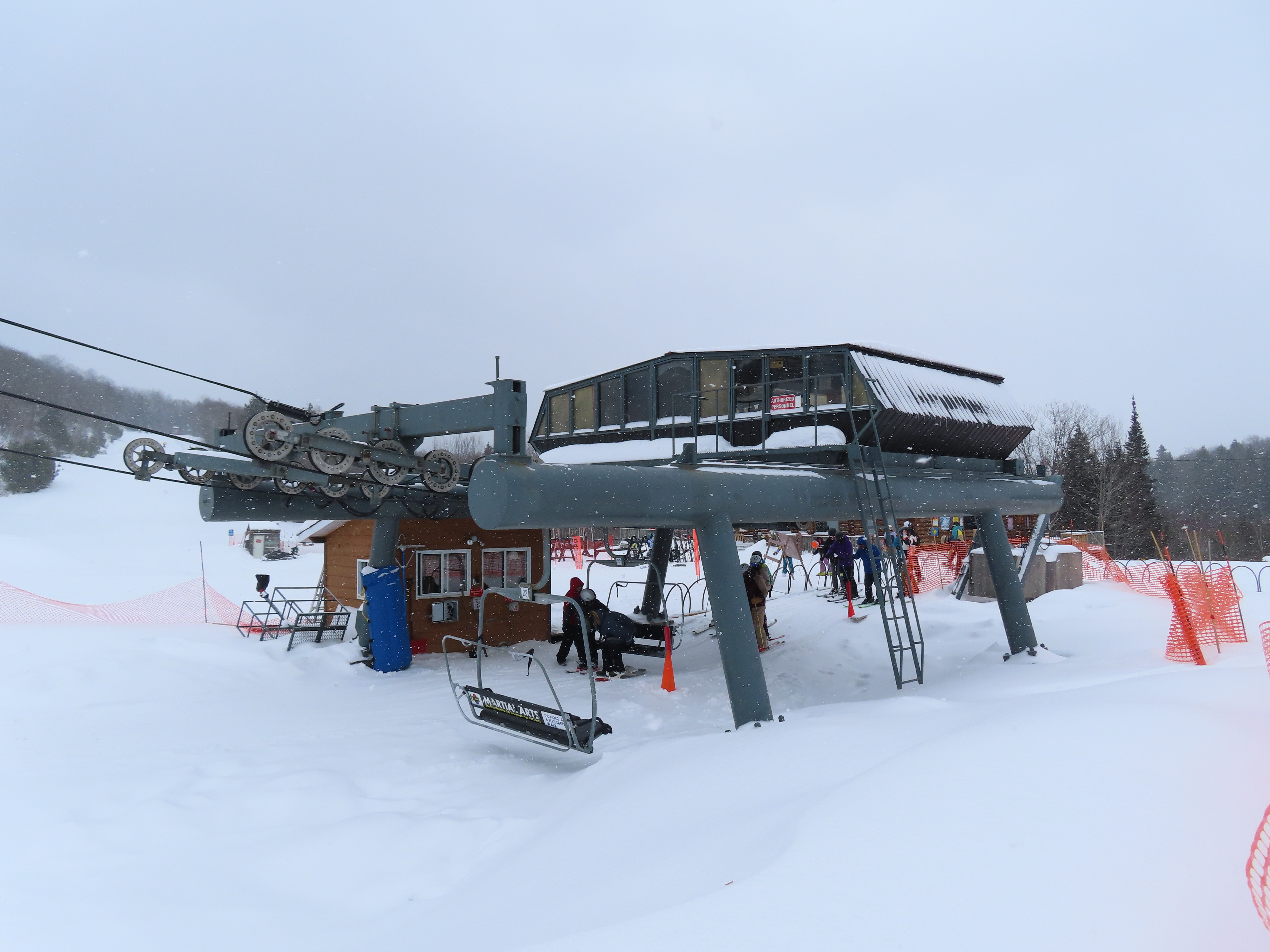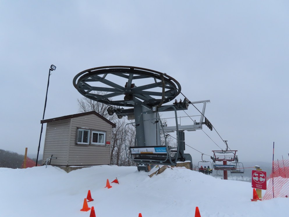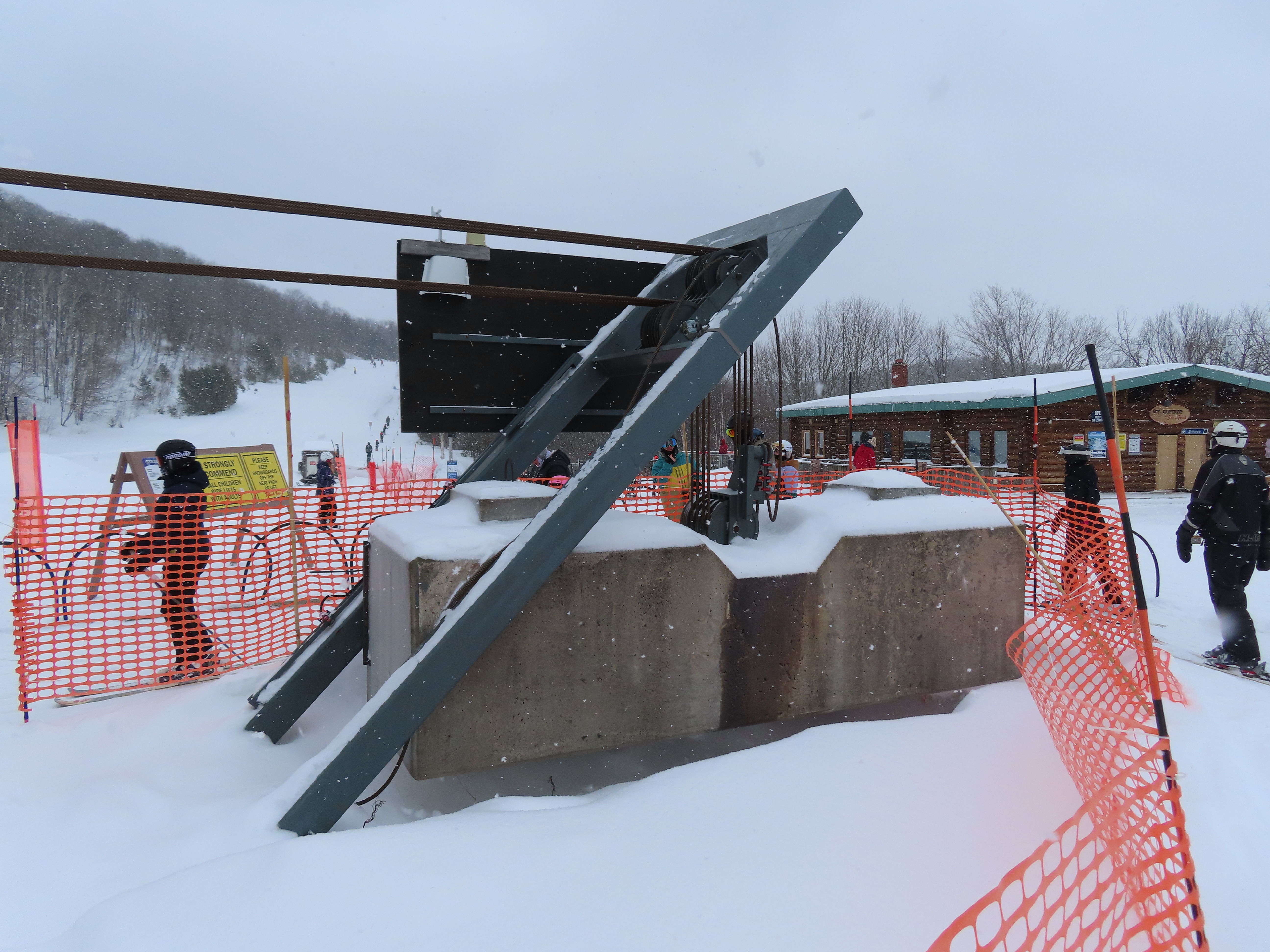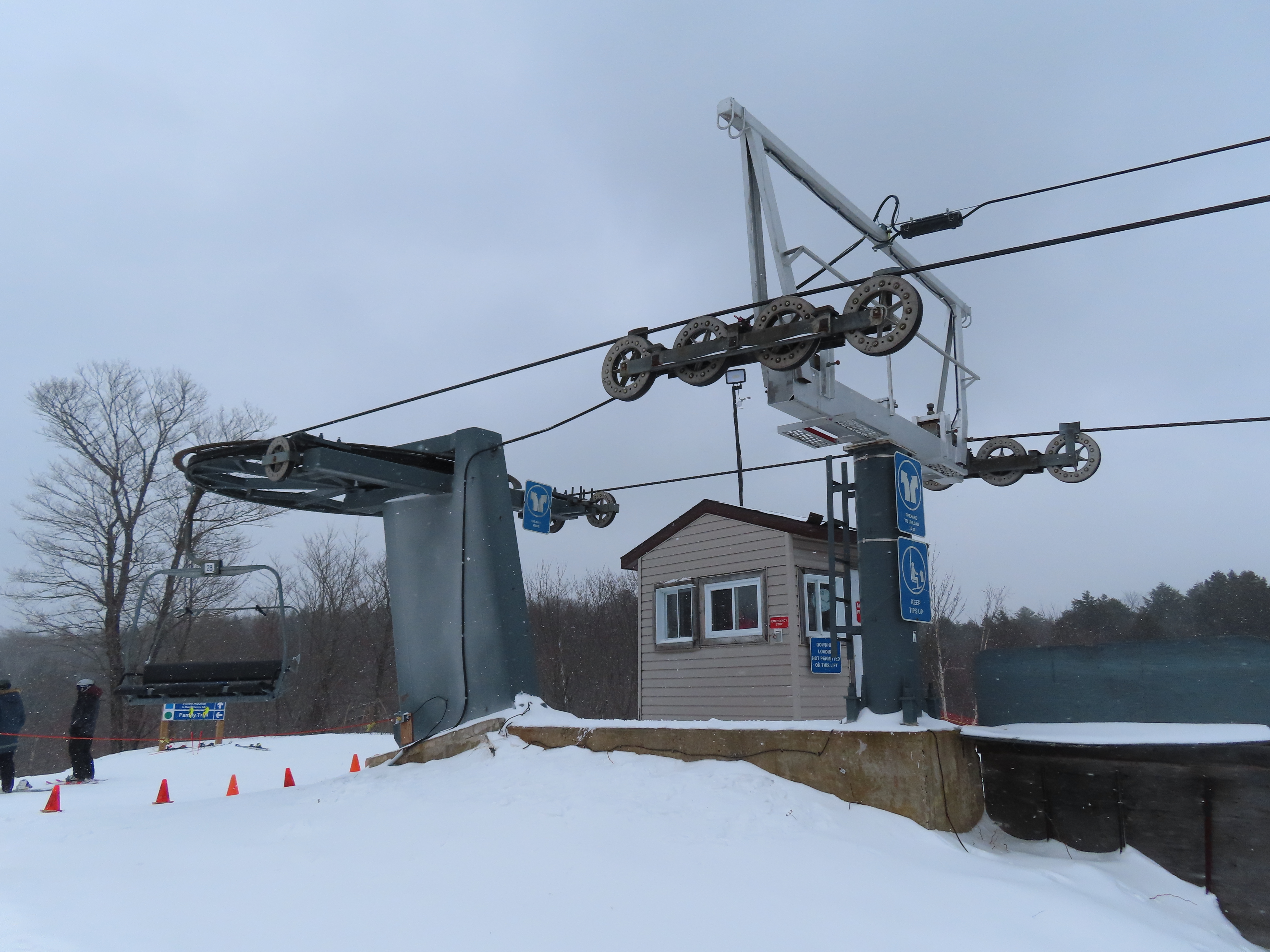 This lift services all but a beginner slope at this community ski area.BM terminal with Poma chairs.Two towers along the line only touch the heavy side.View back down the lower part of the line.Tower 6.Snowflake bullwheel up top.Top terminal and last tower sharing a foundation.View from the summit.Tower 5.Looking down at tower 4.Drive station.Concrete counterweight.Loading area.