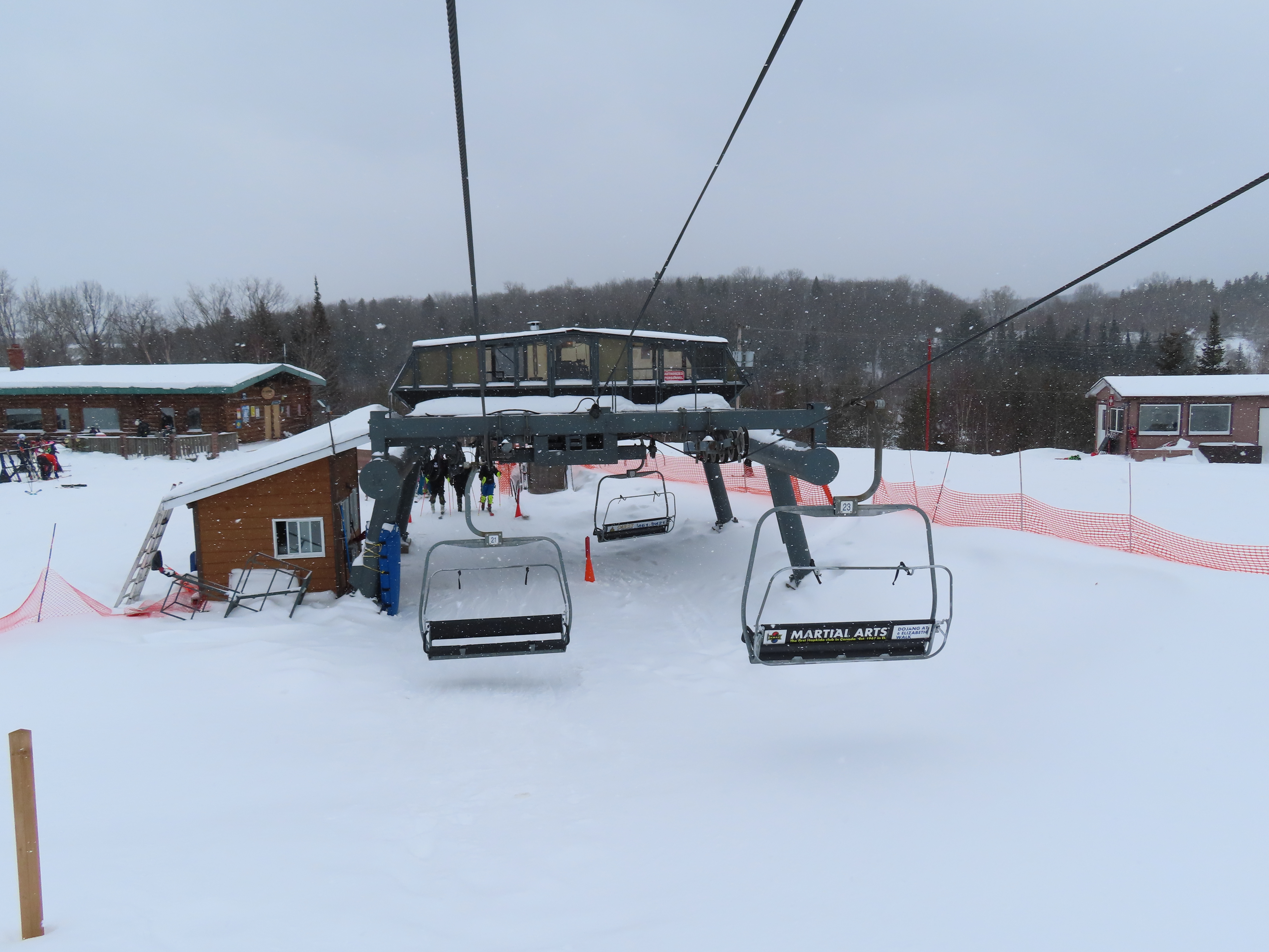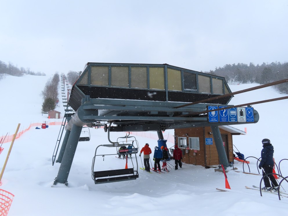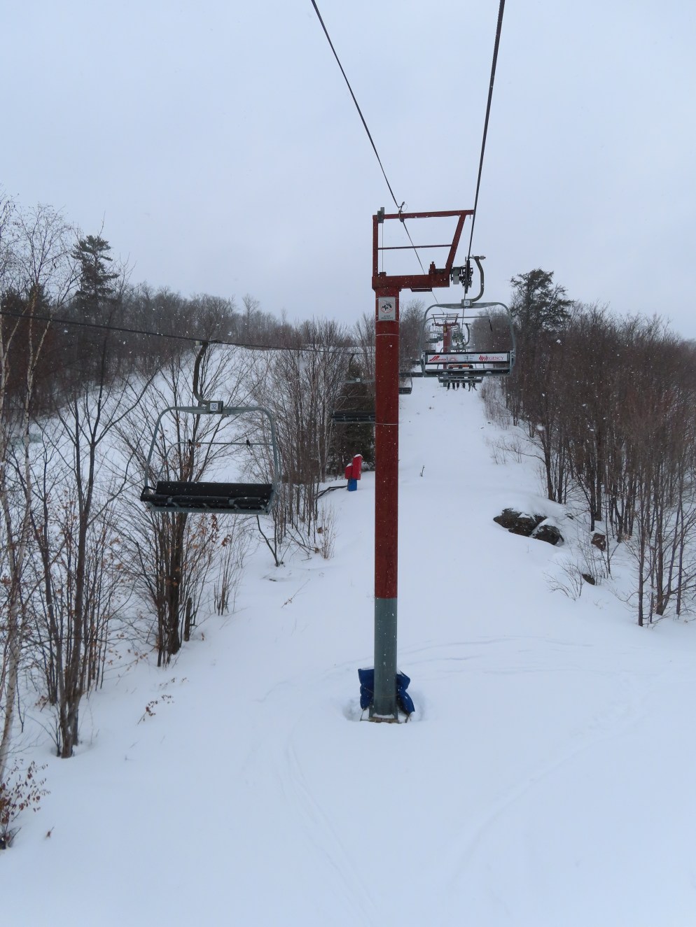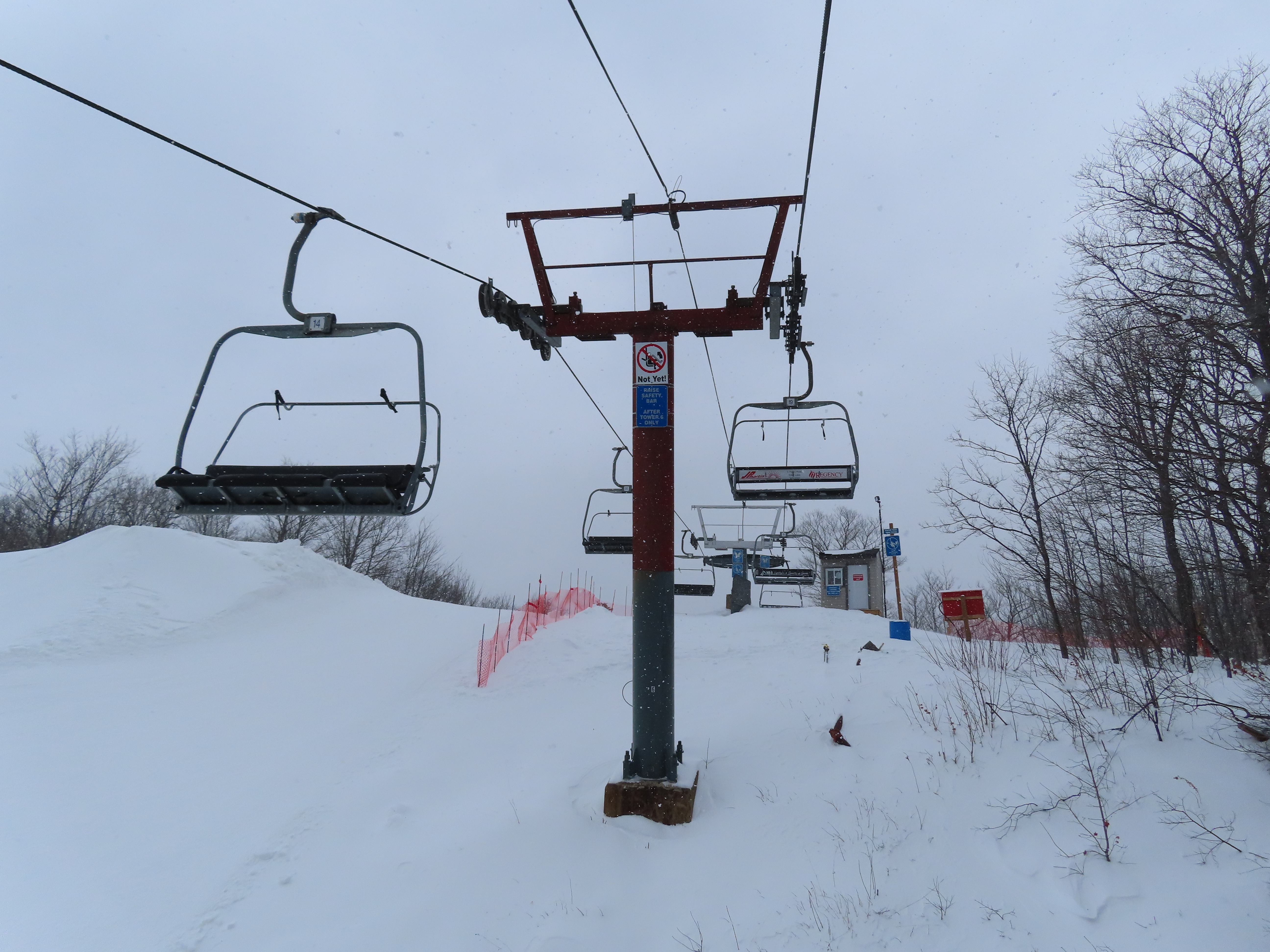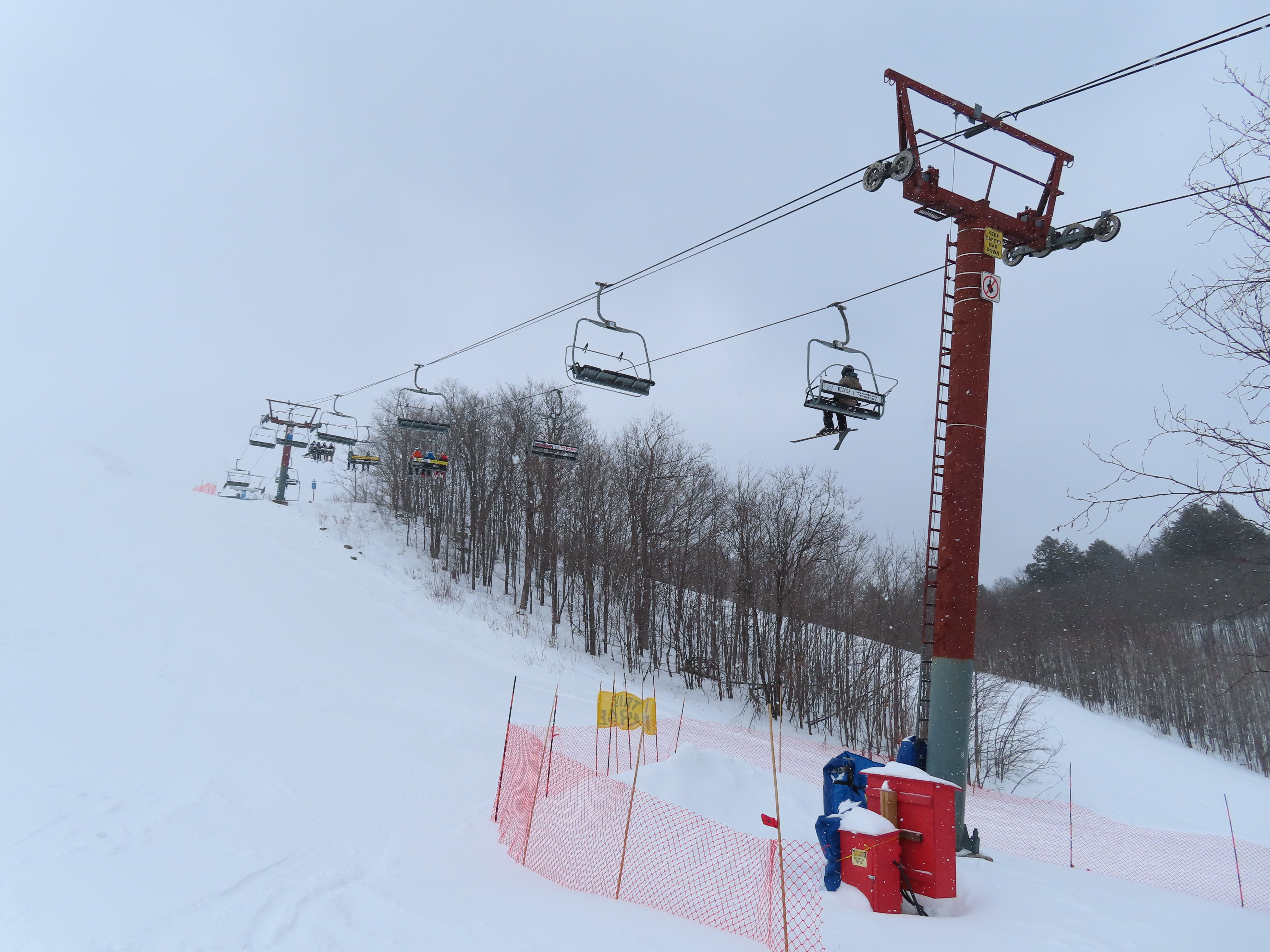 This lift services all but a beginner slope at this community ski area.BM terminal with Poma chairs.Two towers along the line only touch the heavy side.View back down the lower part of the line.Tower 6.Snowflake bullwheel up top.Top terminal and last tower sharing a foundation.View from the summit.Tower 5.Looking down at tower 4.Drive station.Concrete counterweight.Loading area.