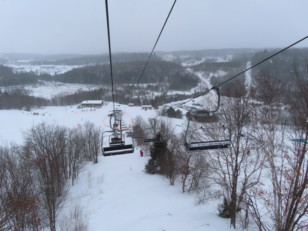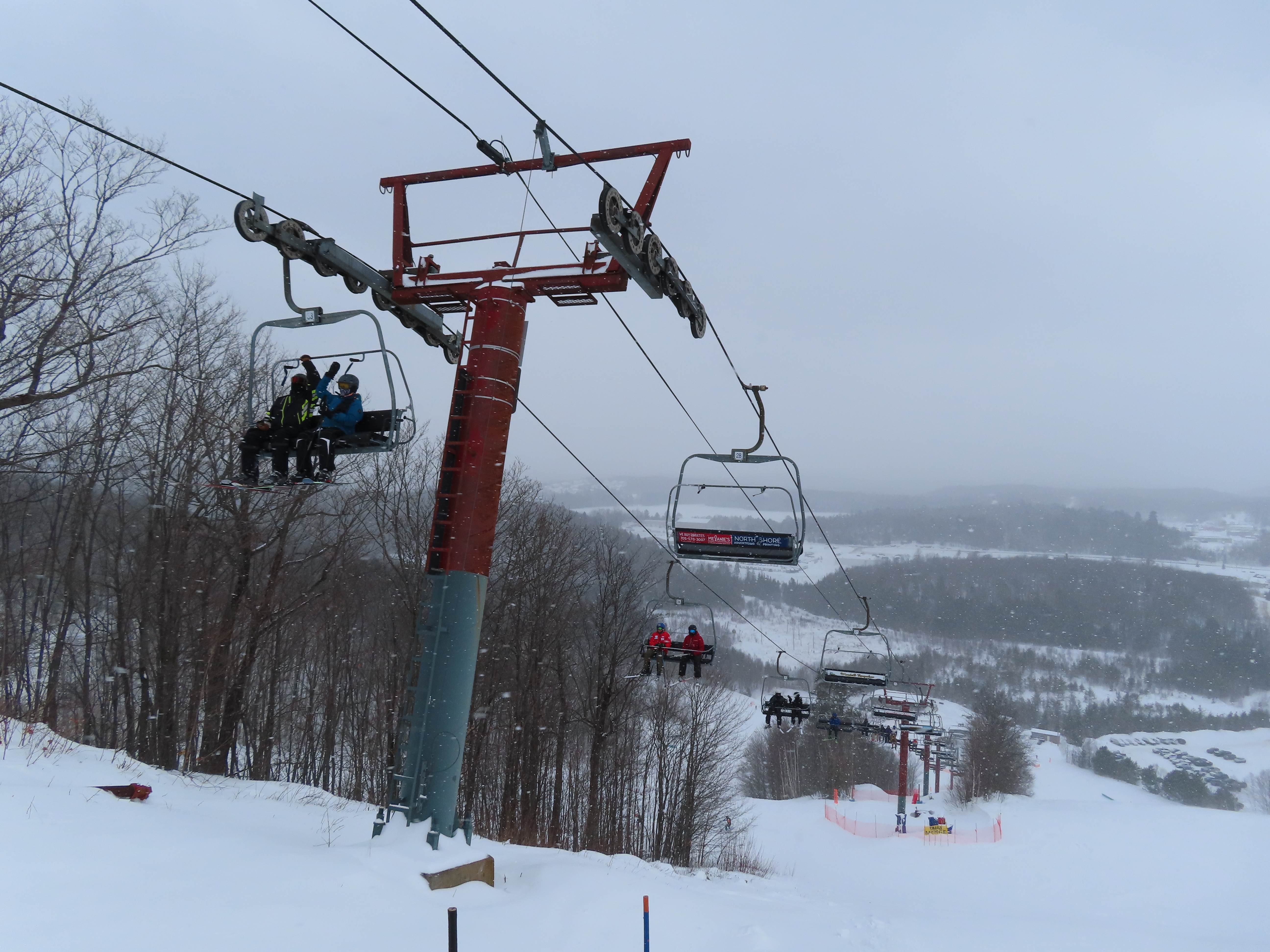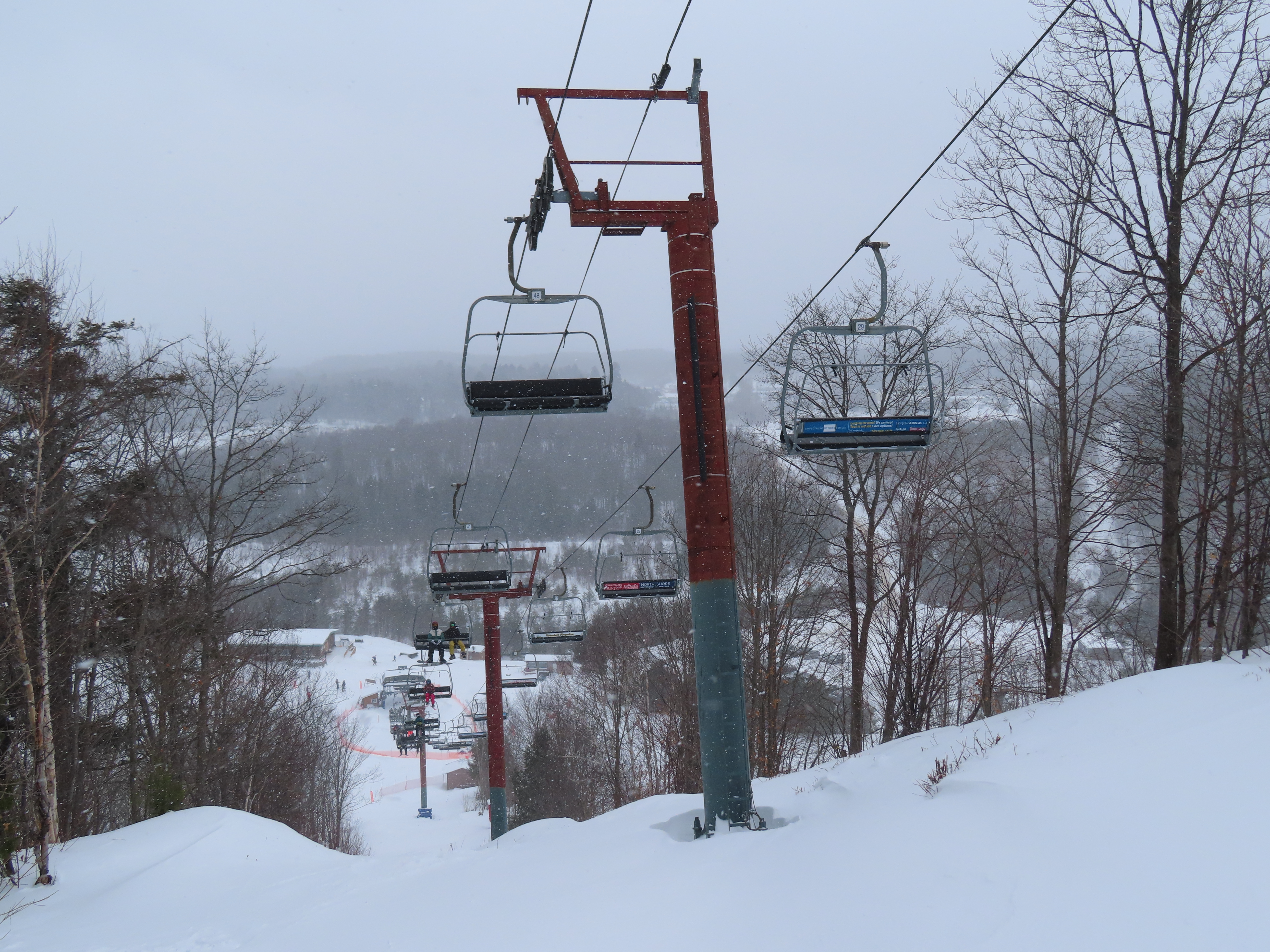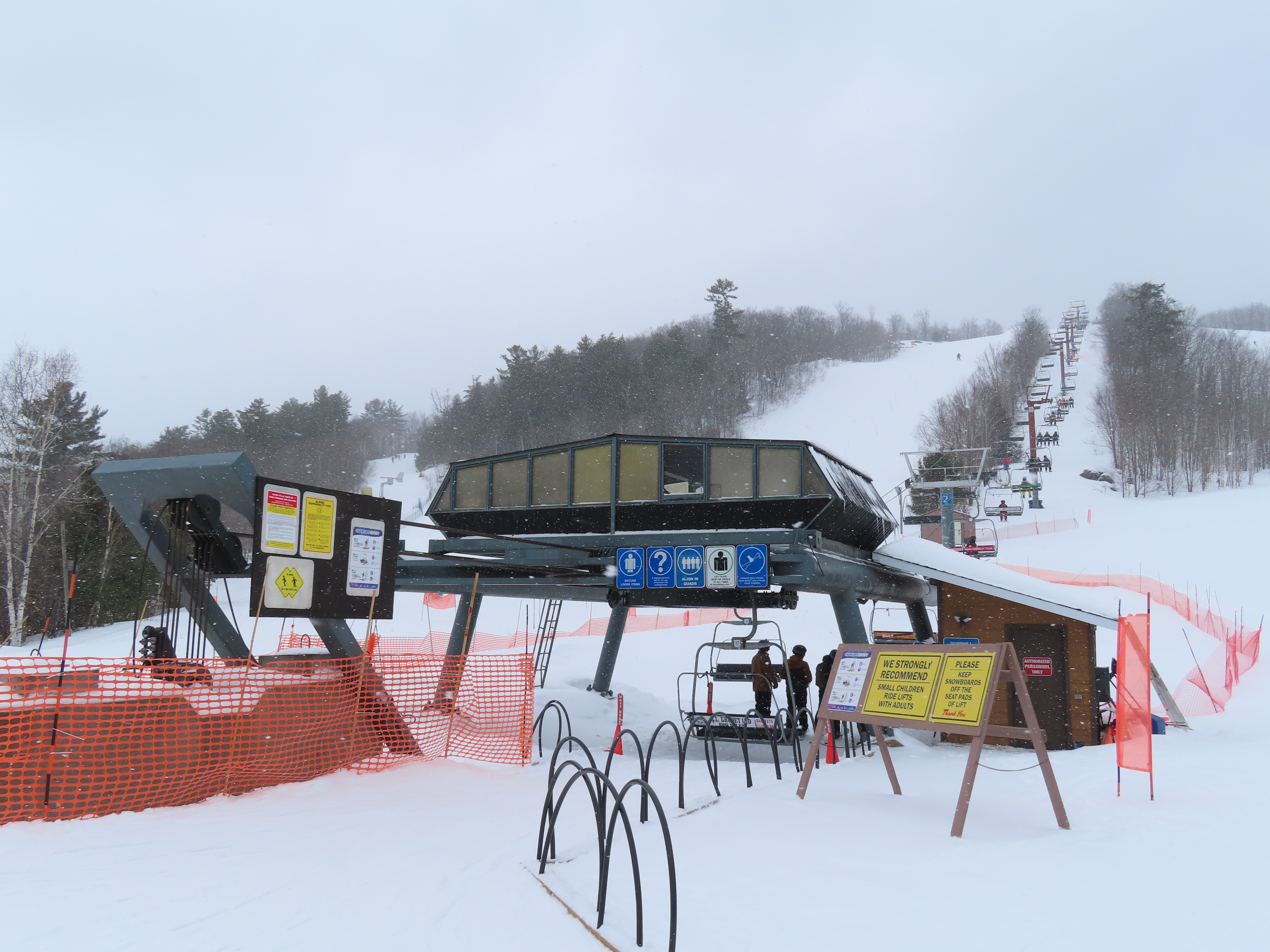 This lift services all but a beginner slope at this community ski area.BM terminal with Poma chairs.Two towers along the line only touch the heavy side.View back down the lower part of the line.Tower 6.Snowflake bullwheel up top.Top terminal and last tower sharing a foundation.View from the summit.Tower 5.Looking down at tower 4.Drive station.Concrete counterweight.Loading area.