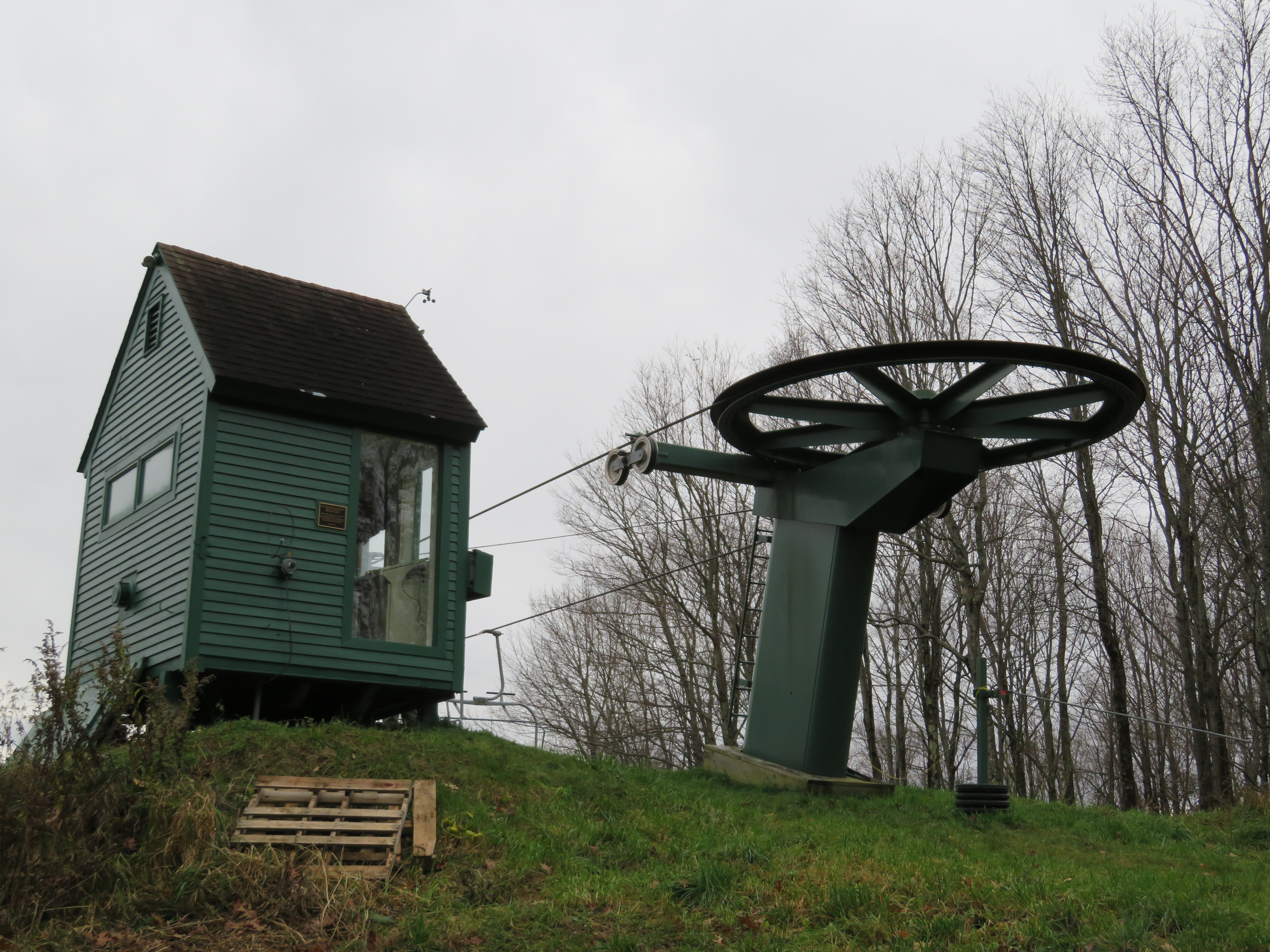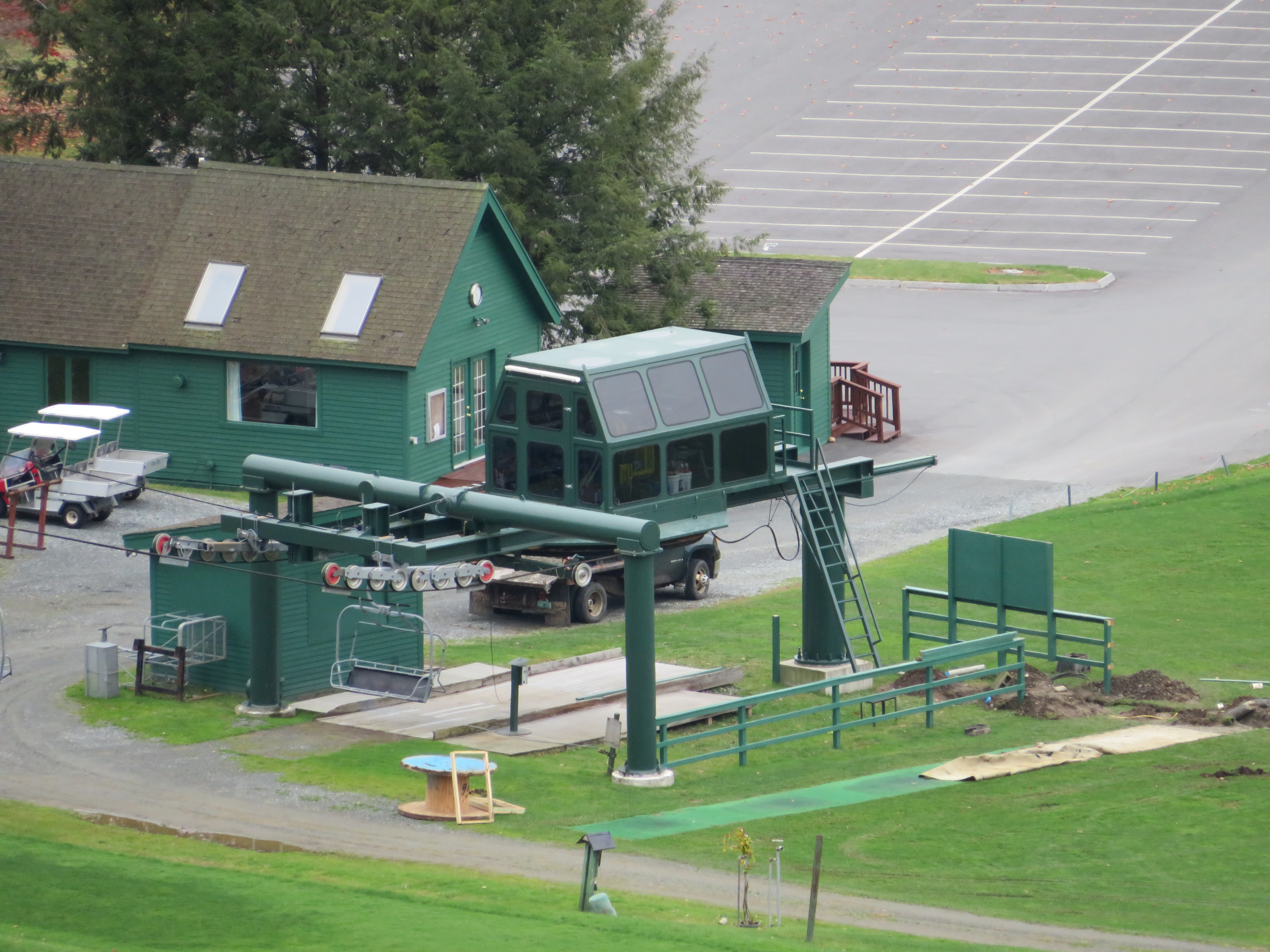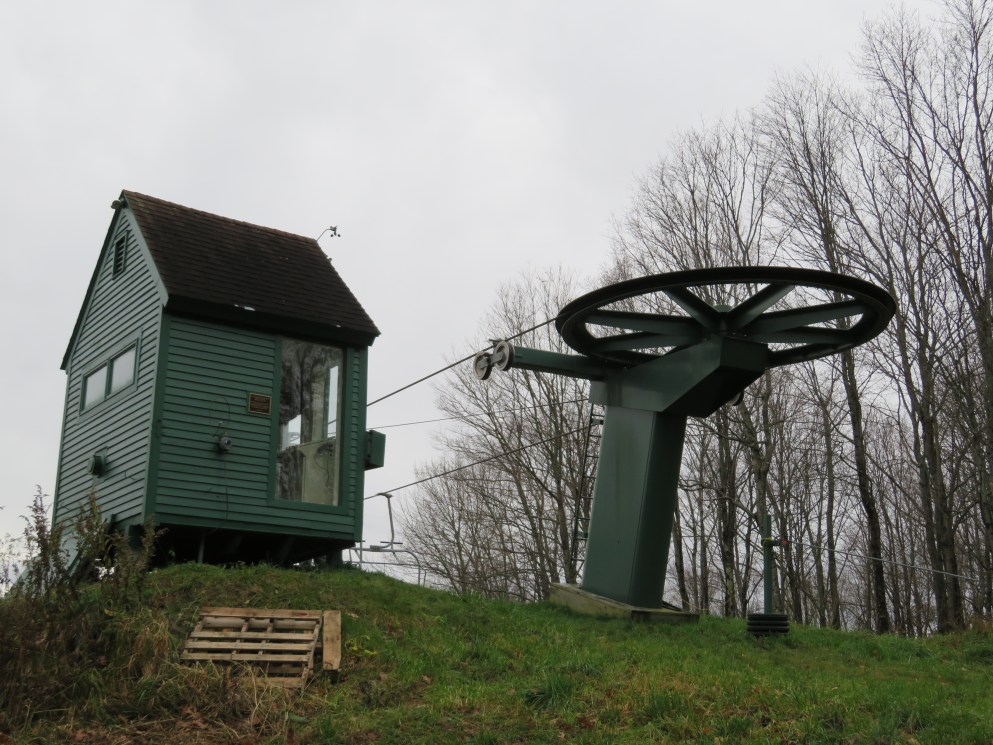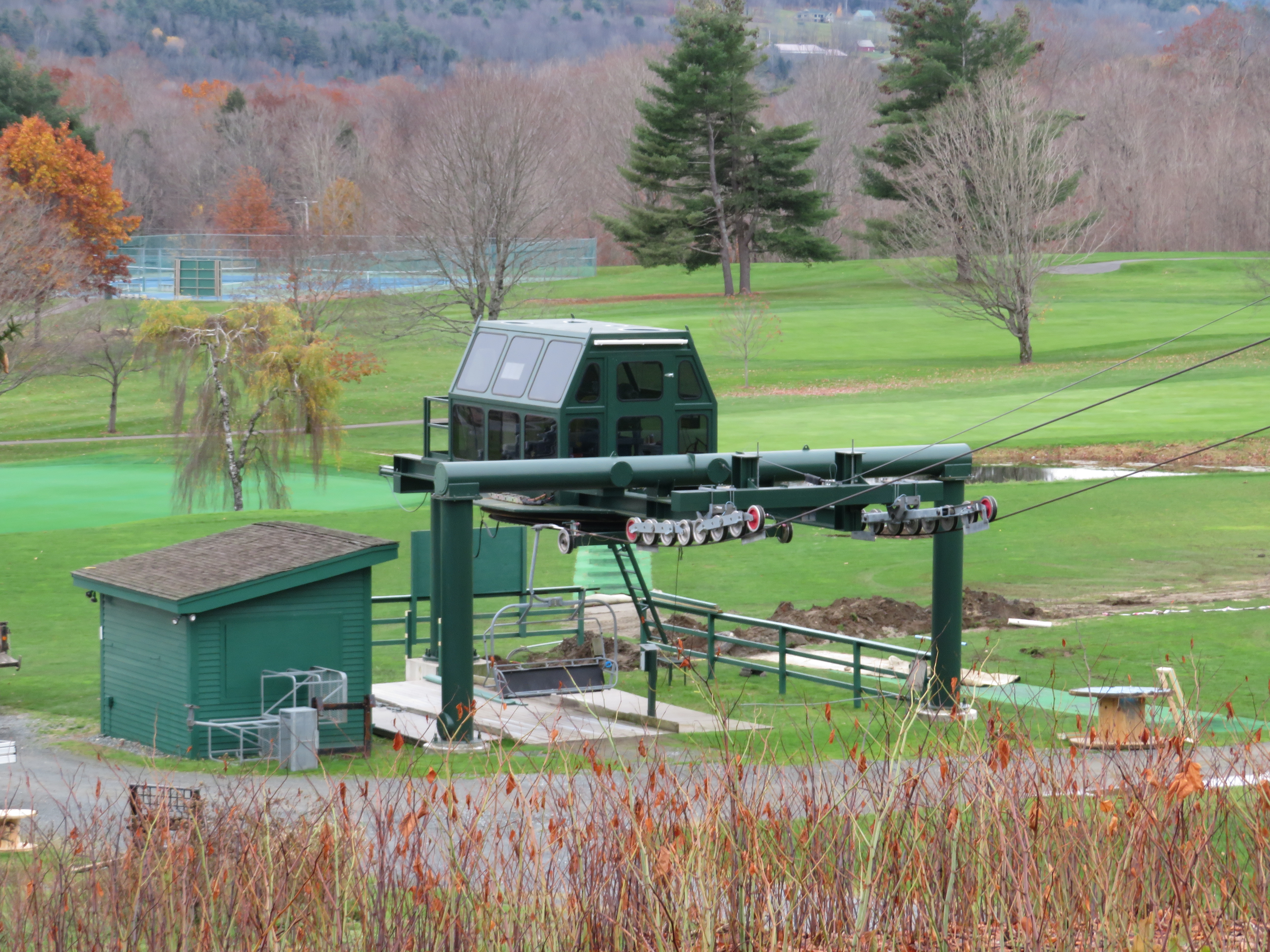 Lift line view.This is the main chairlift at the small Quechee Club ski area.View down the first section of the lift.Top few towers.Upper terminal with fixed bullwheel.Top station and operator house.Middle part of the lift line.Doppelmayr CTEC Sprint with drive and hydraulic tensioning.Lift overview.Doppelmayr Worldbook entry.