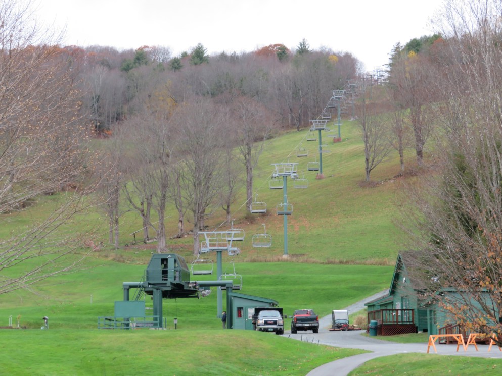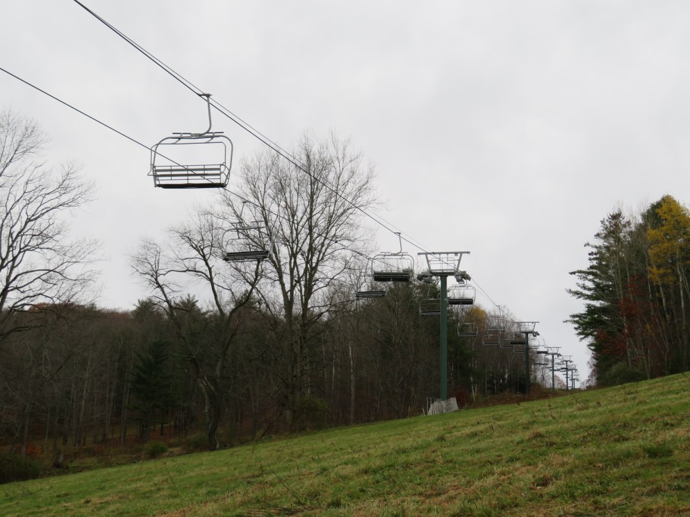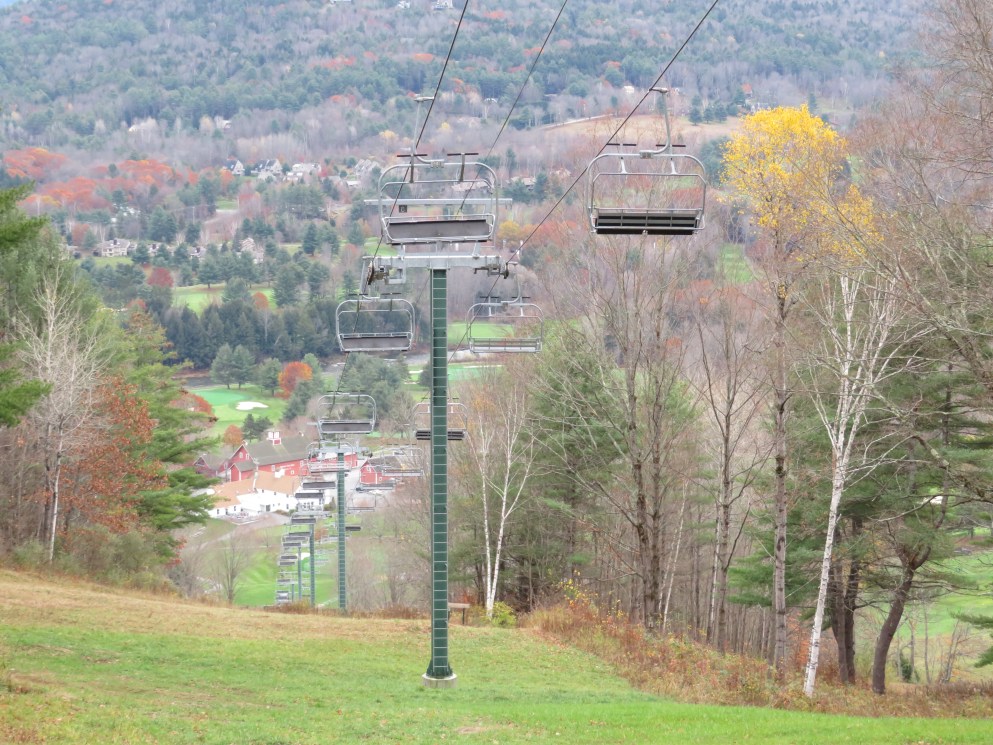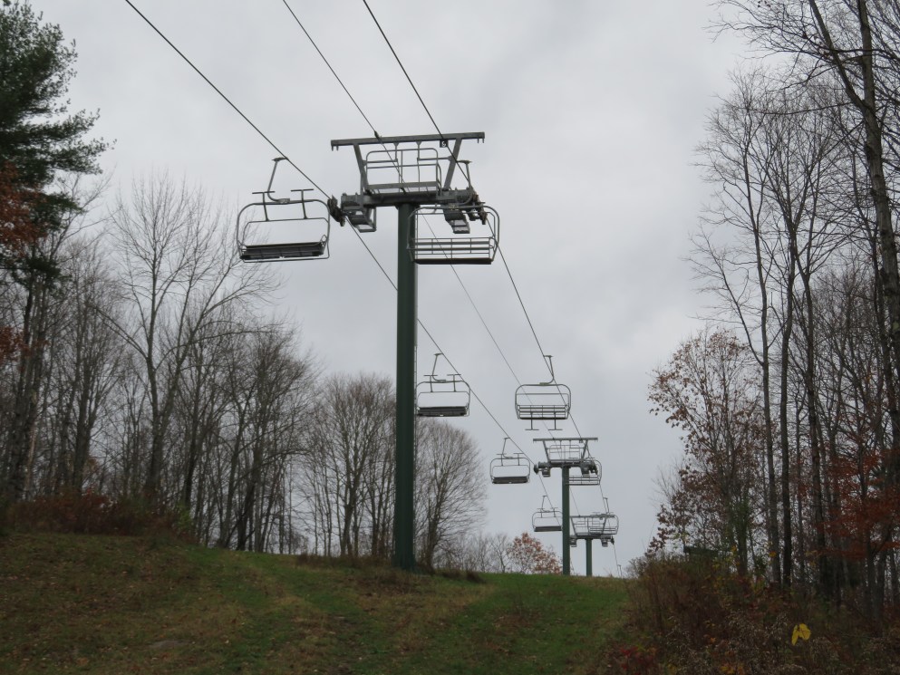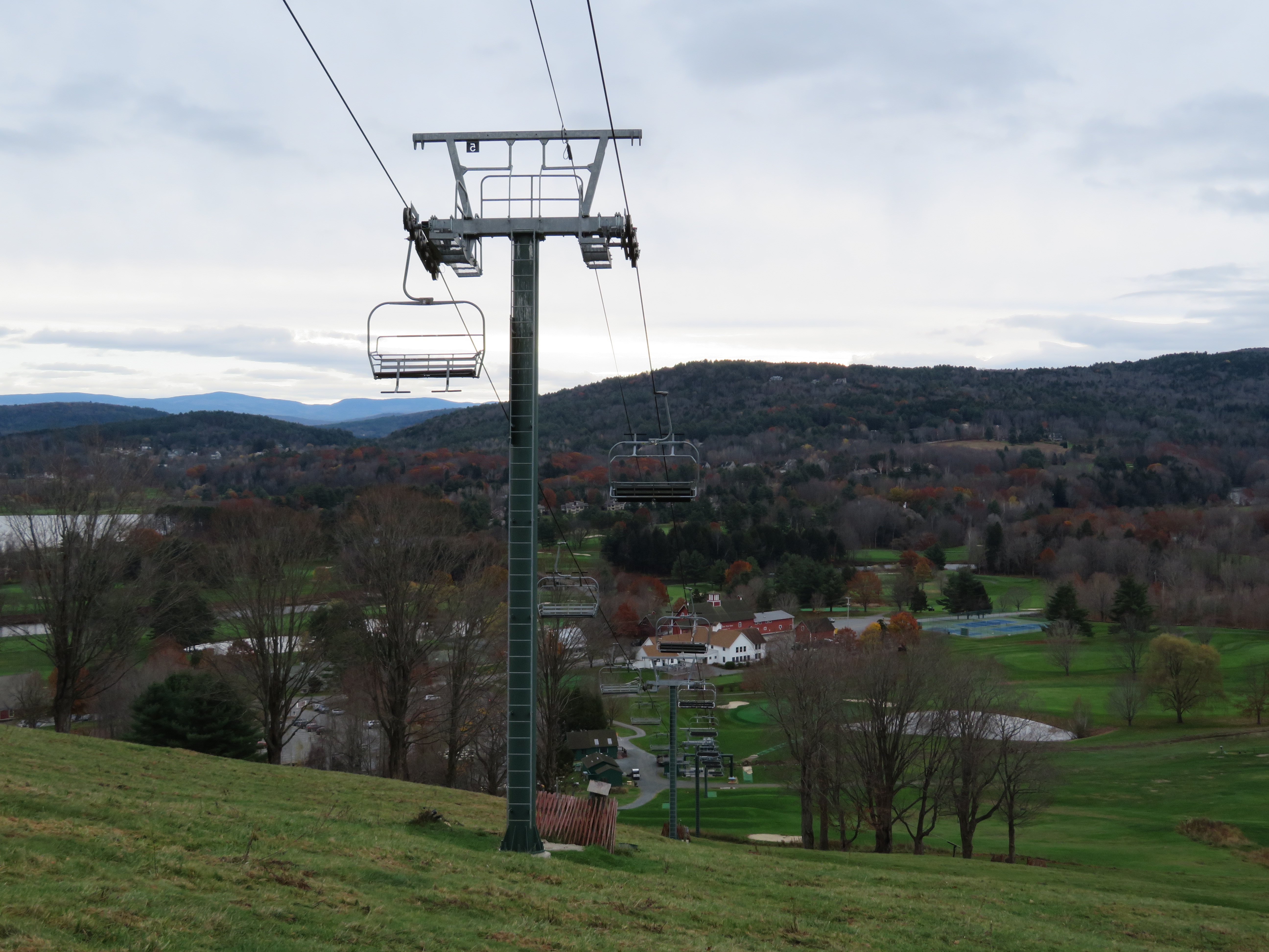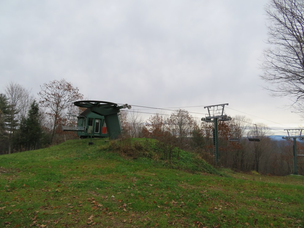 Lift line view.This is the main chairlift at the small Quechee Club ski area.View down the first section of the lift.Top few towers.Upper terminal with fixed bullwheel.Top station and operator house.Middle part of the lift line.Doppelmayr CTEC Sprint with drive and hydraulic tensioning.Lift overview.Doppelmayr Worldbook entry.