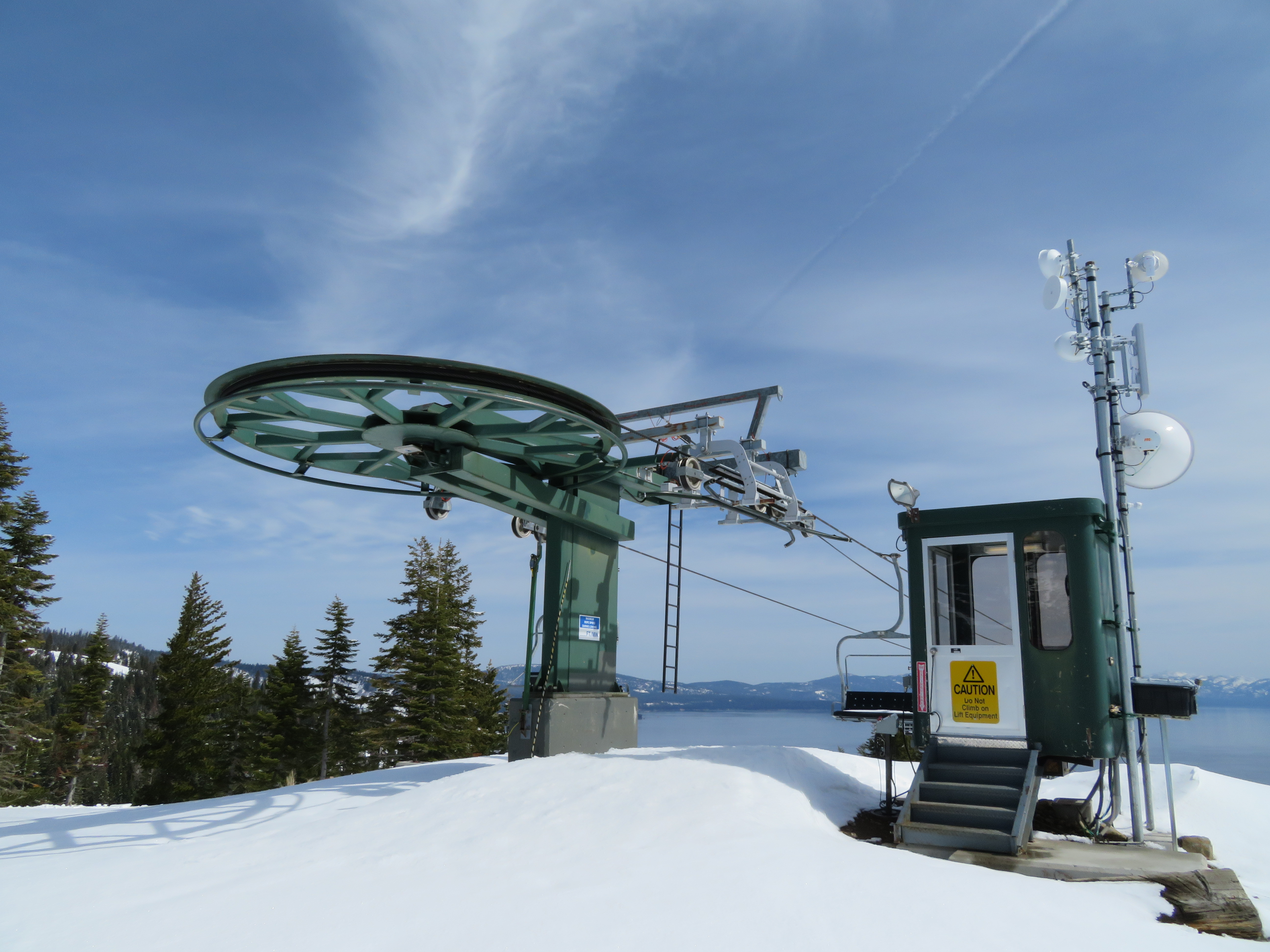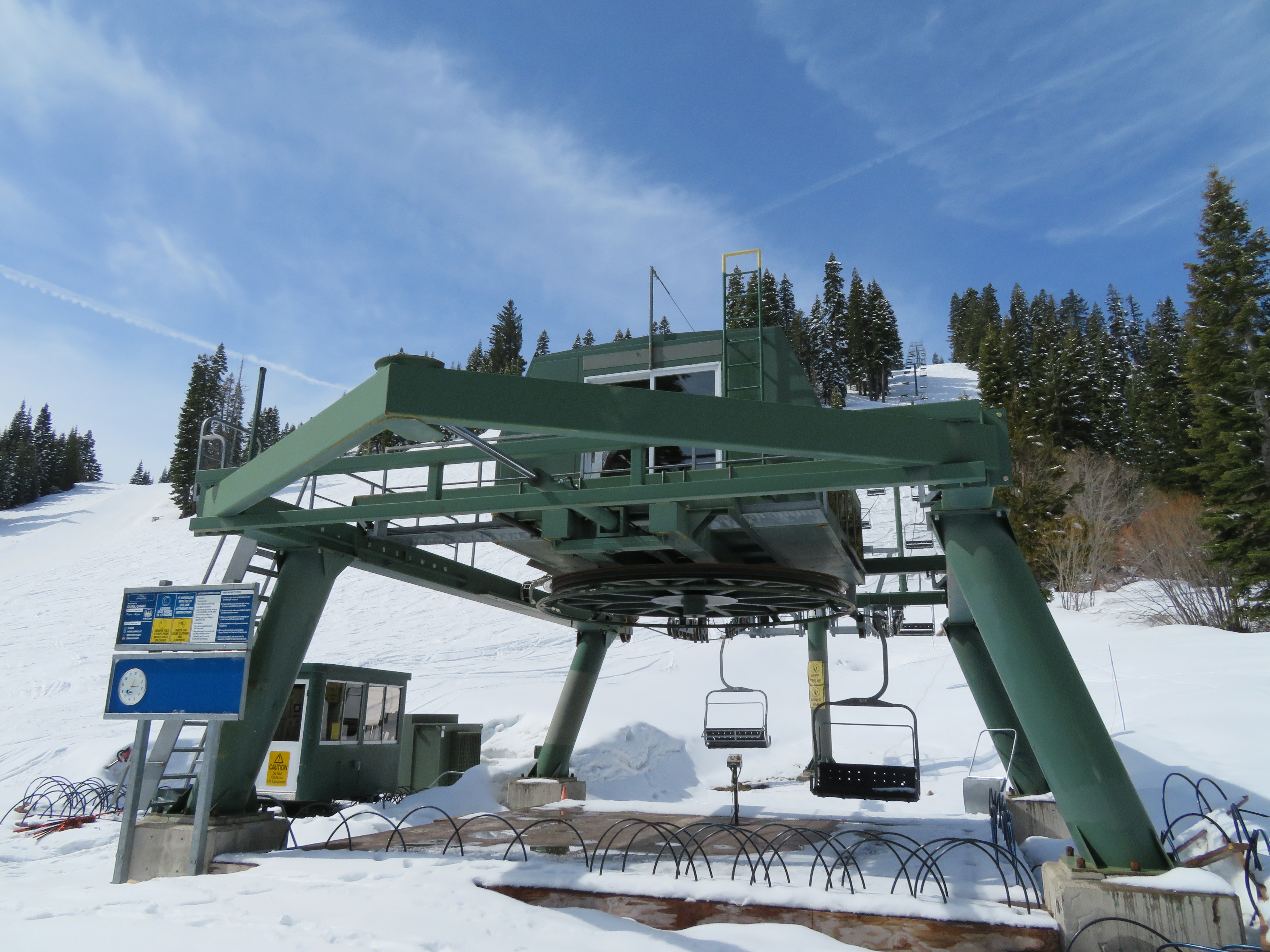 One of only two Partek lifts in the western United States.Snowflake bullwheel up top.Top terminal with fixed return.This lift only operates at peak times.Upper lift line.Lower lift line.View up from the base.Loading area and motor room with hydraulic tensioning.Drive station overview.Partek terminal and tower 1.