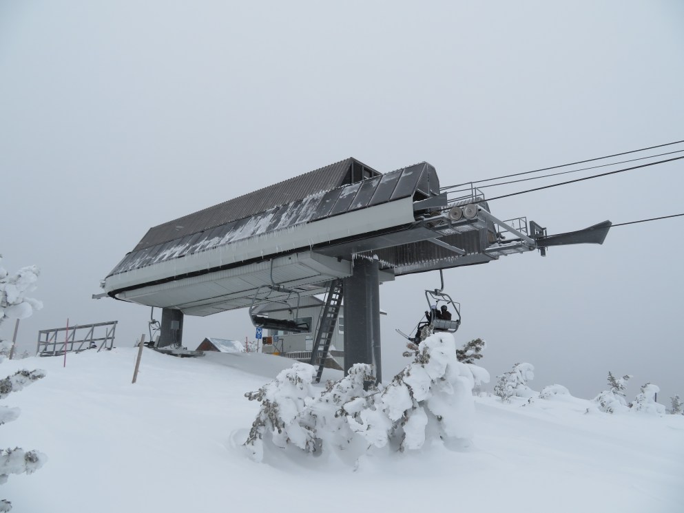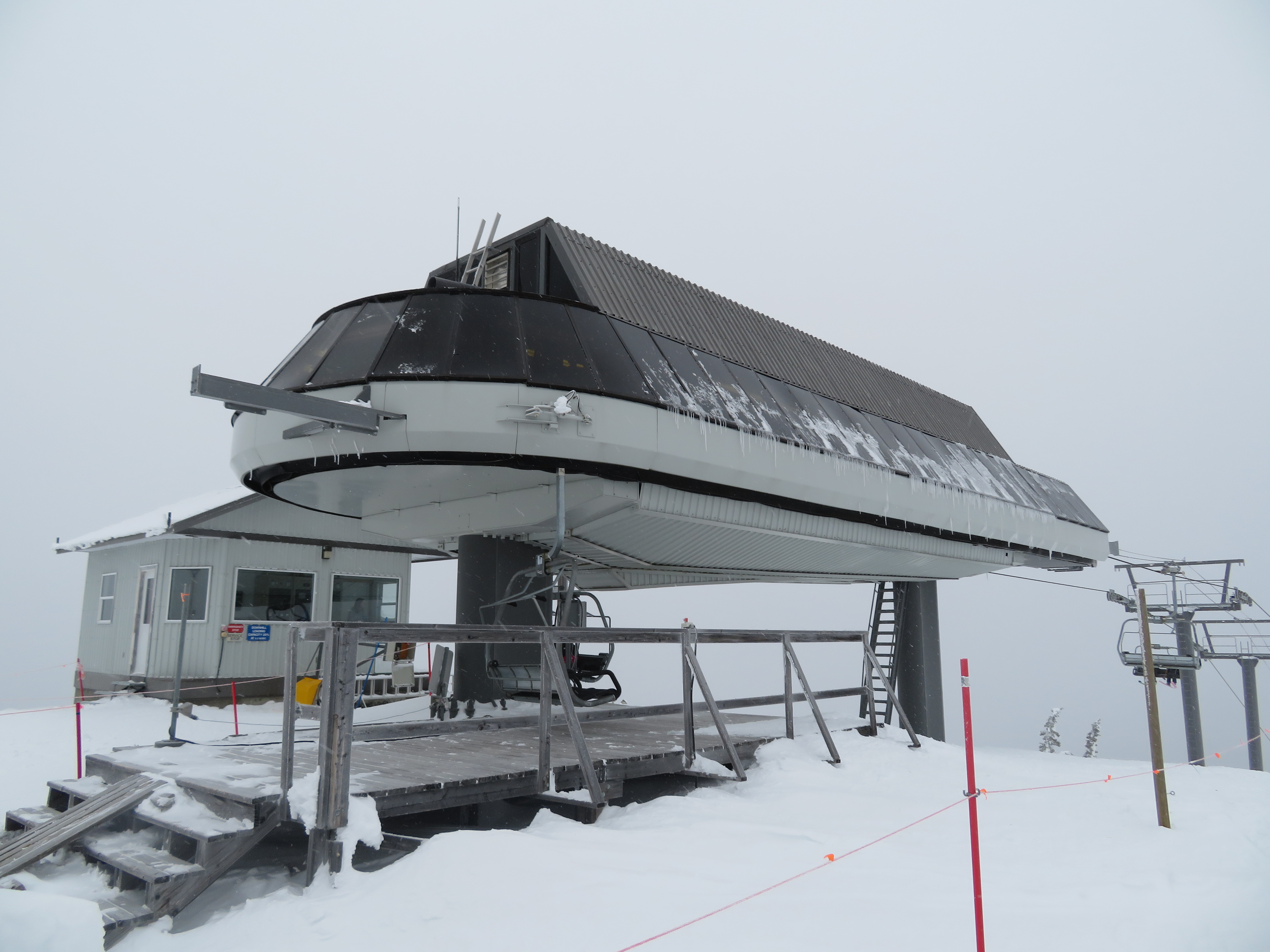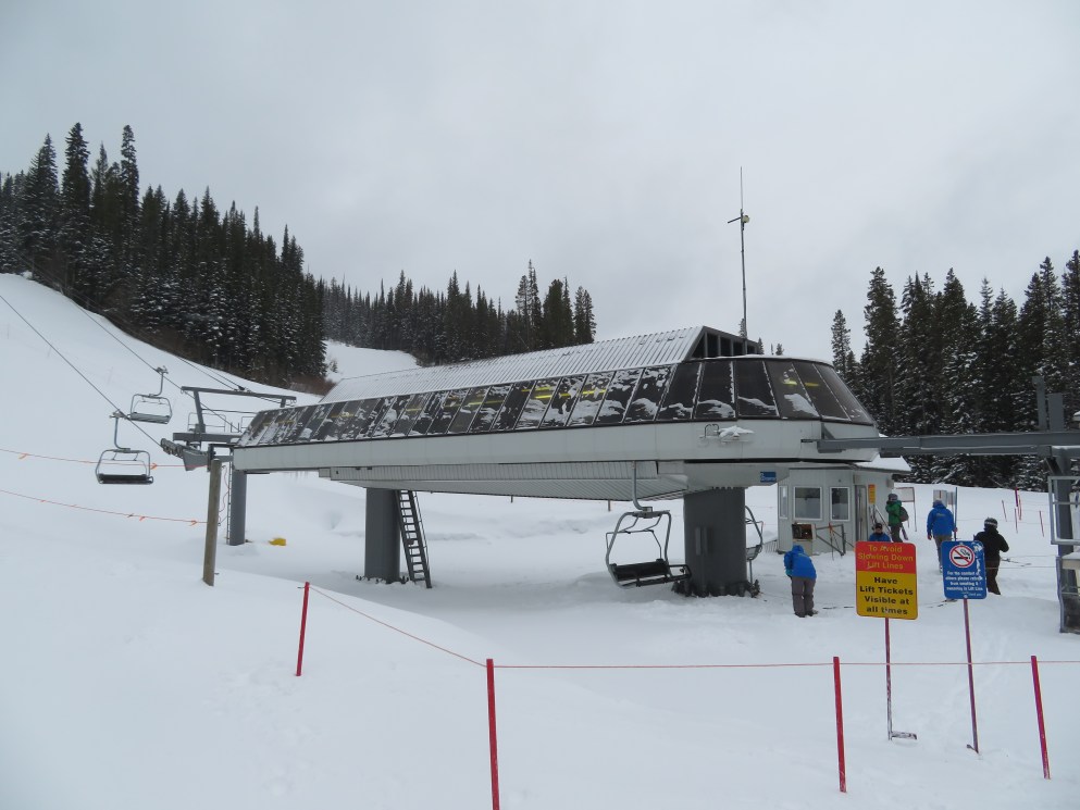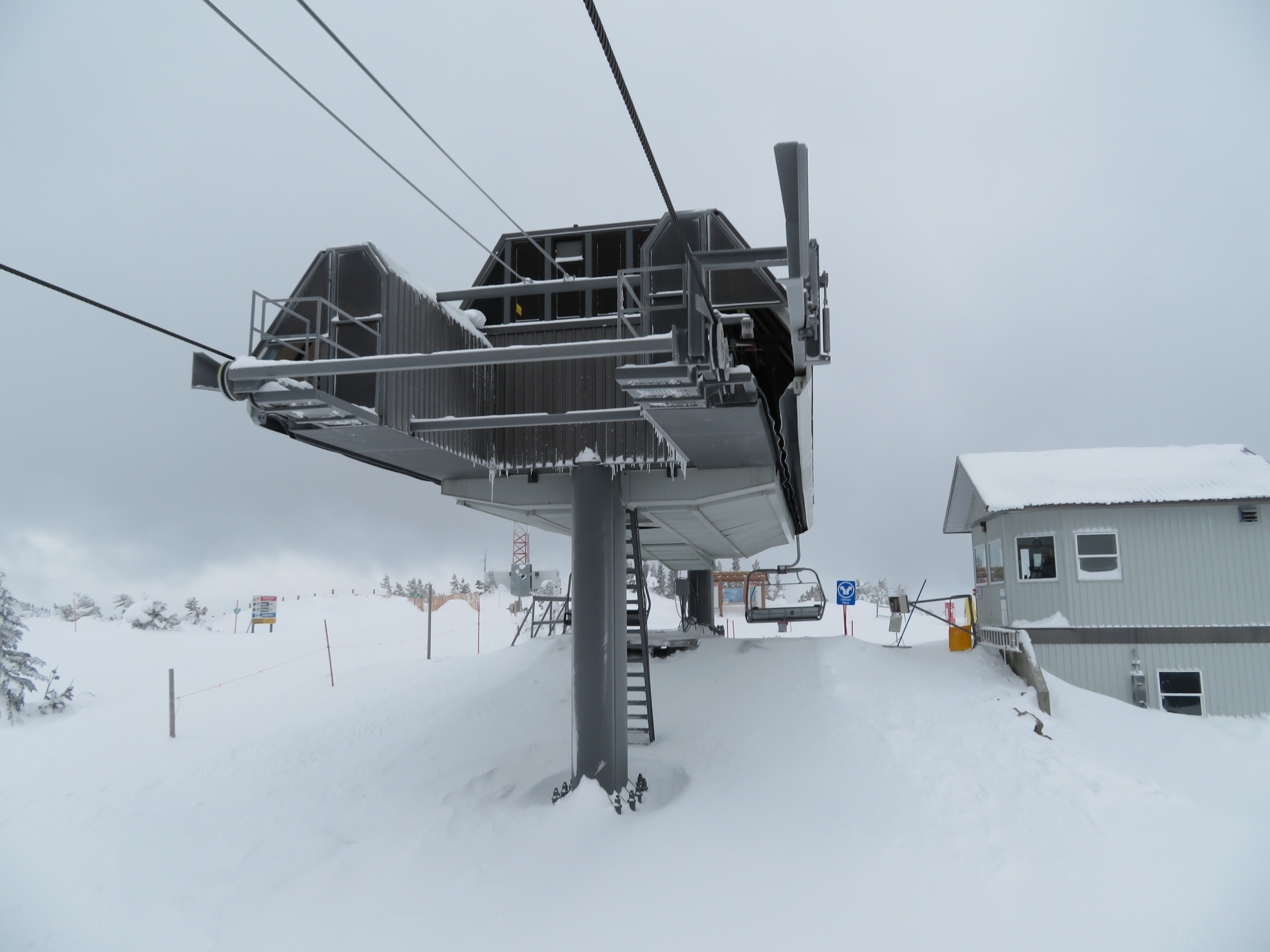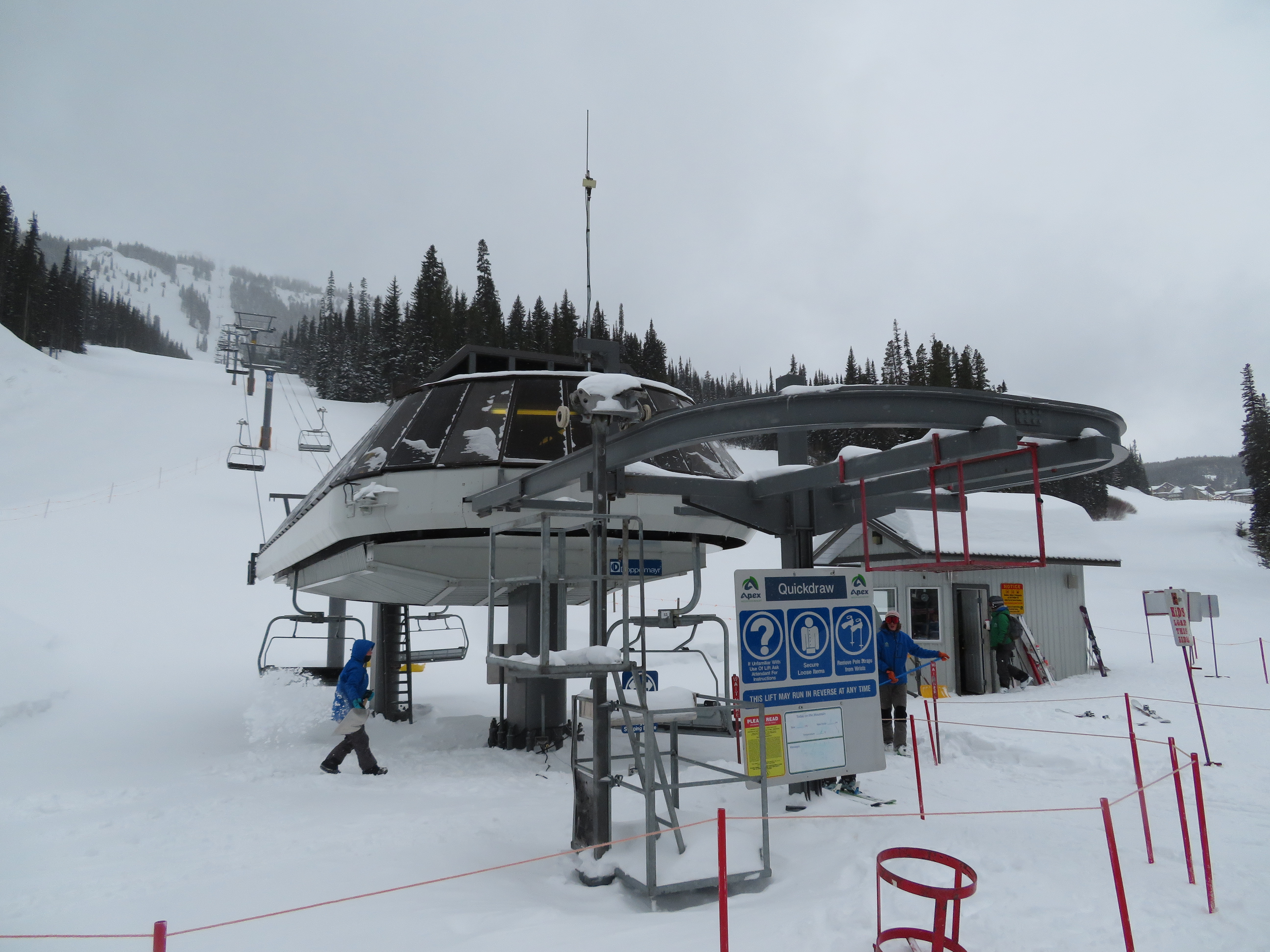 The Quickdraw lift services nearly all of Apex’s terrain and opened in 1994.The bottom terminal with a parking and maintenance rail.Side view of the lower station with tensioning.Loading area and early model Uni terminal.Riding up the line.View back down the lift line.Arriving at the drive station up top.Lift line overview.Middle section of the line.Tower 4.Another look at the line.Side view of the top terminal.Departure side at the drive station.