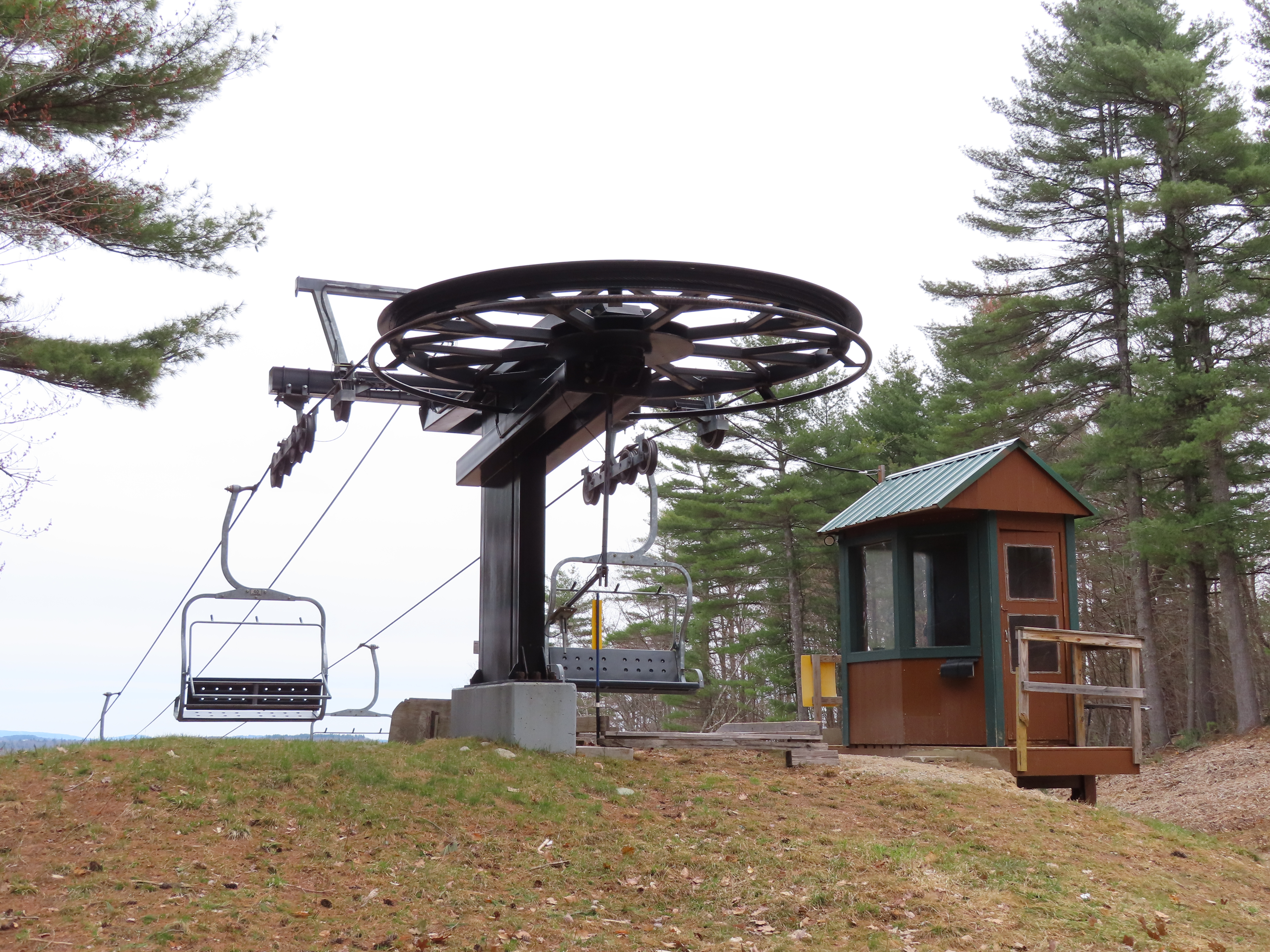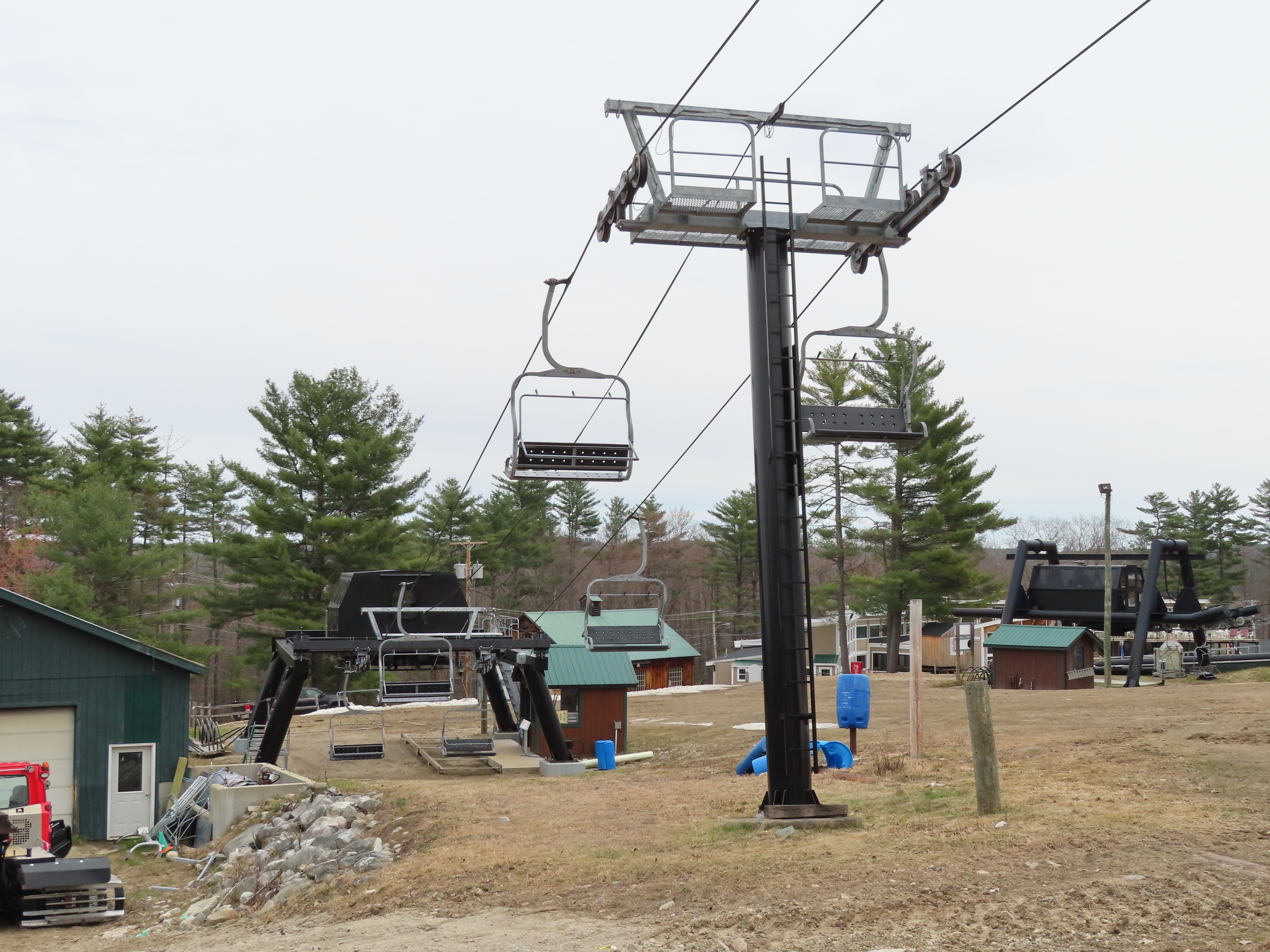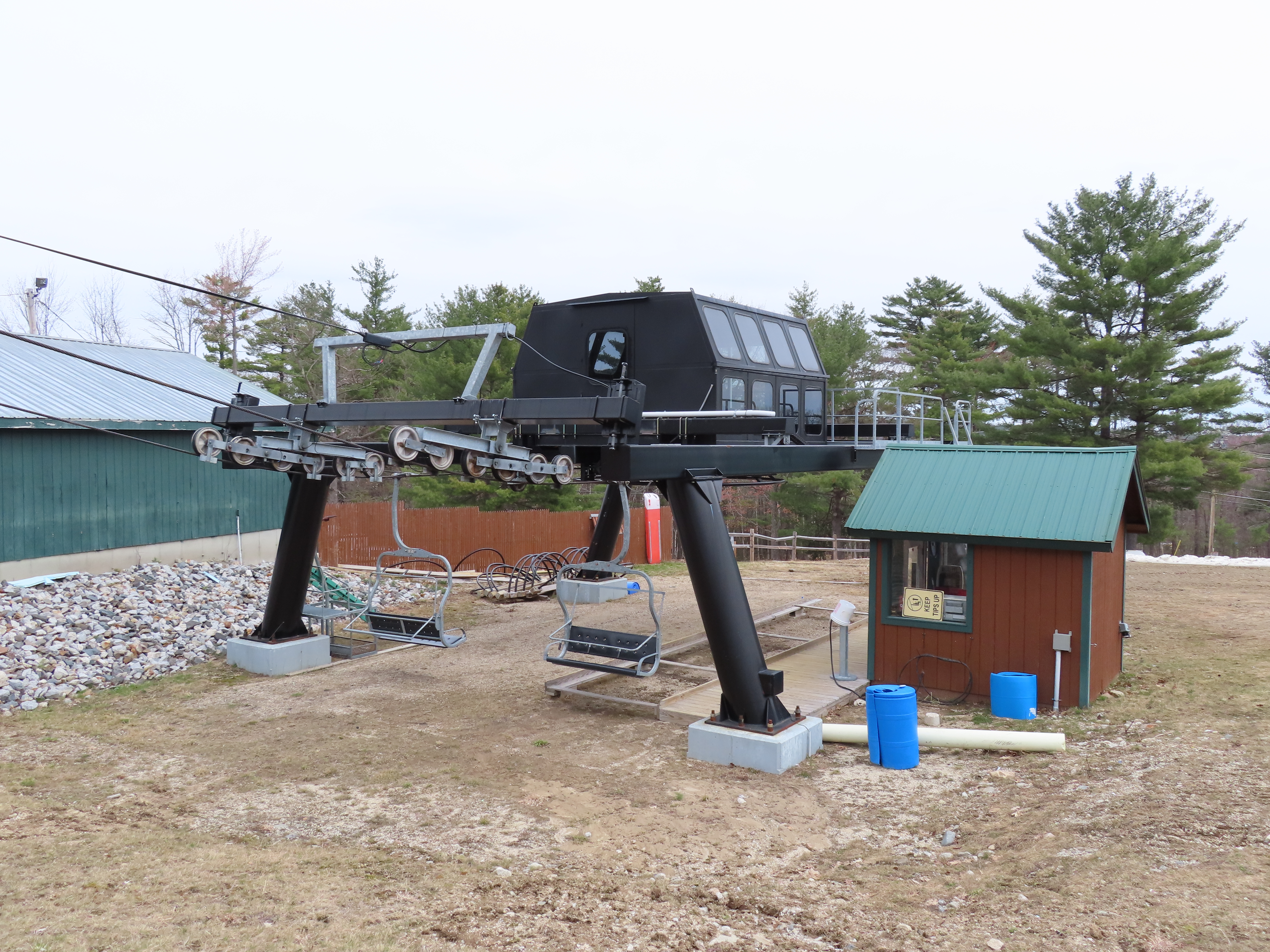 Partek replaced a Borvig double with this triple in 2014.The line is short with only four towers.Upper half of the lift line.A Partek tower with catwalks and lifting frame.T4.Fixed bullwheel up top.Lift overview.Unloading area.Tower 1 and the drive station.Loading area.