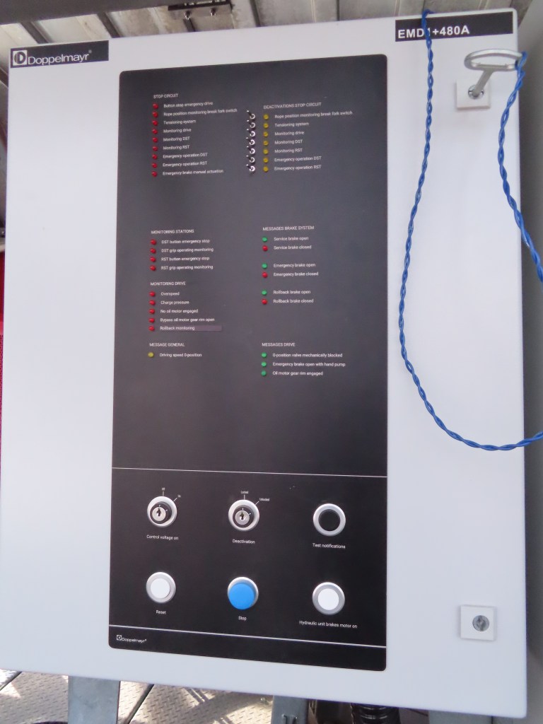 Orange: When this light is on, it will be on at both terminals, top and bottom. This light means there is a safety device that is not currently in use. If you remember when the crew from doppelmayr came and cut our haul rope, this created a problem in which our cable was too tight. This means we had to load every third chair for a few days and on the weekends to allow time for the rope to stretch out. During this time, our maintenance team decided it would be better for everyone if the lift ran without the extra bullwheel tensioning sensor. With this sensor off, it would make the orange light glow.