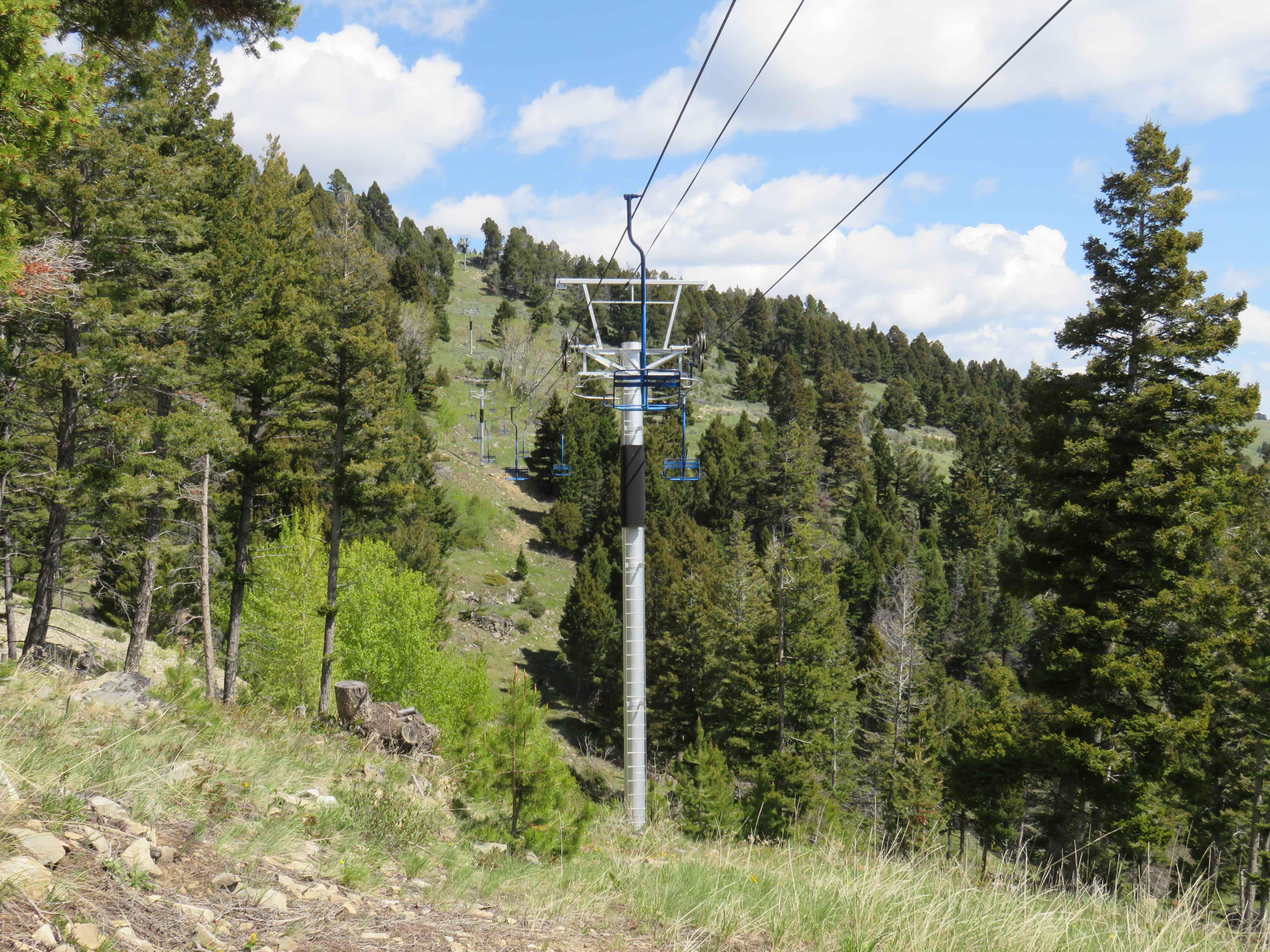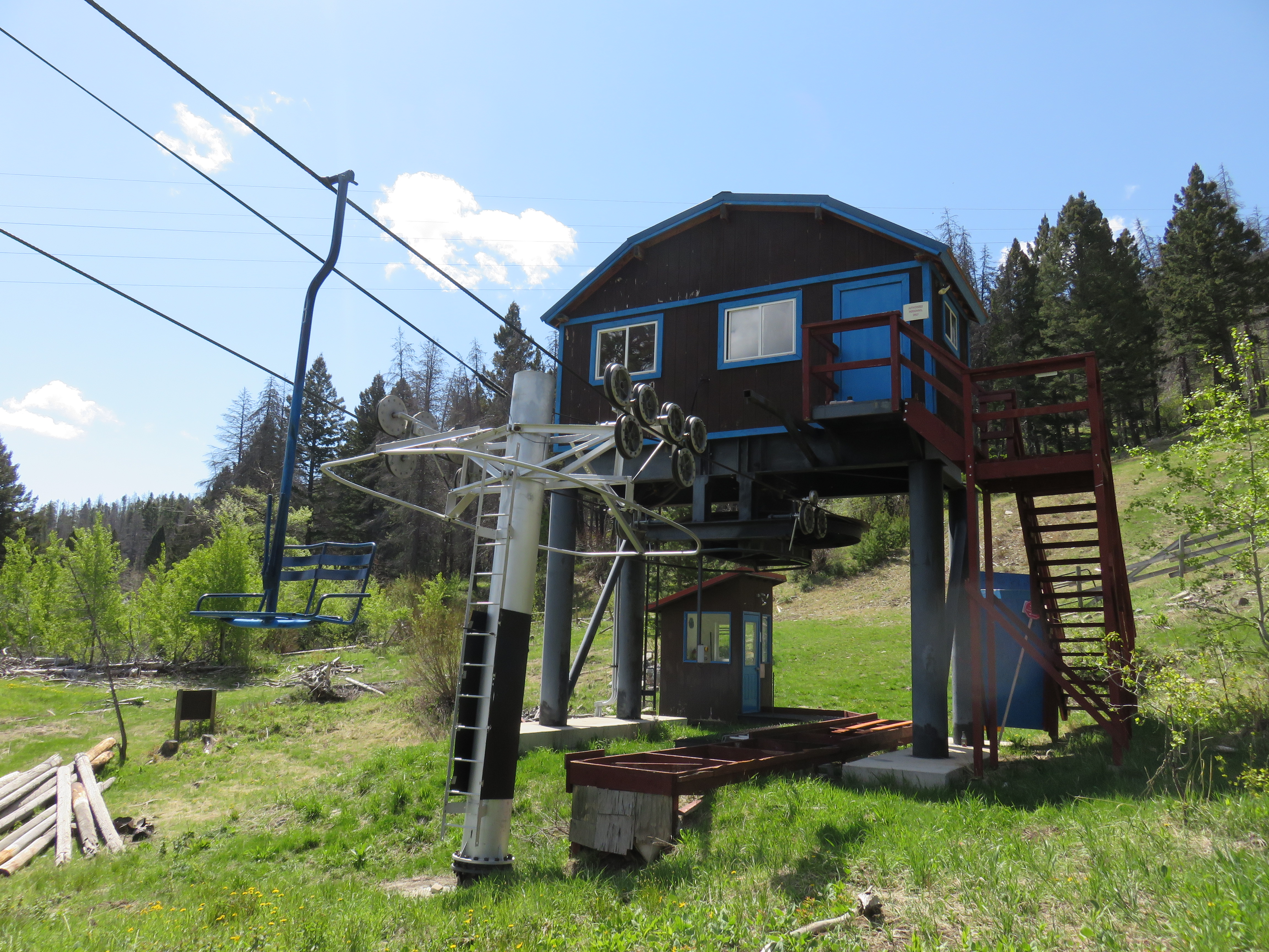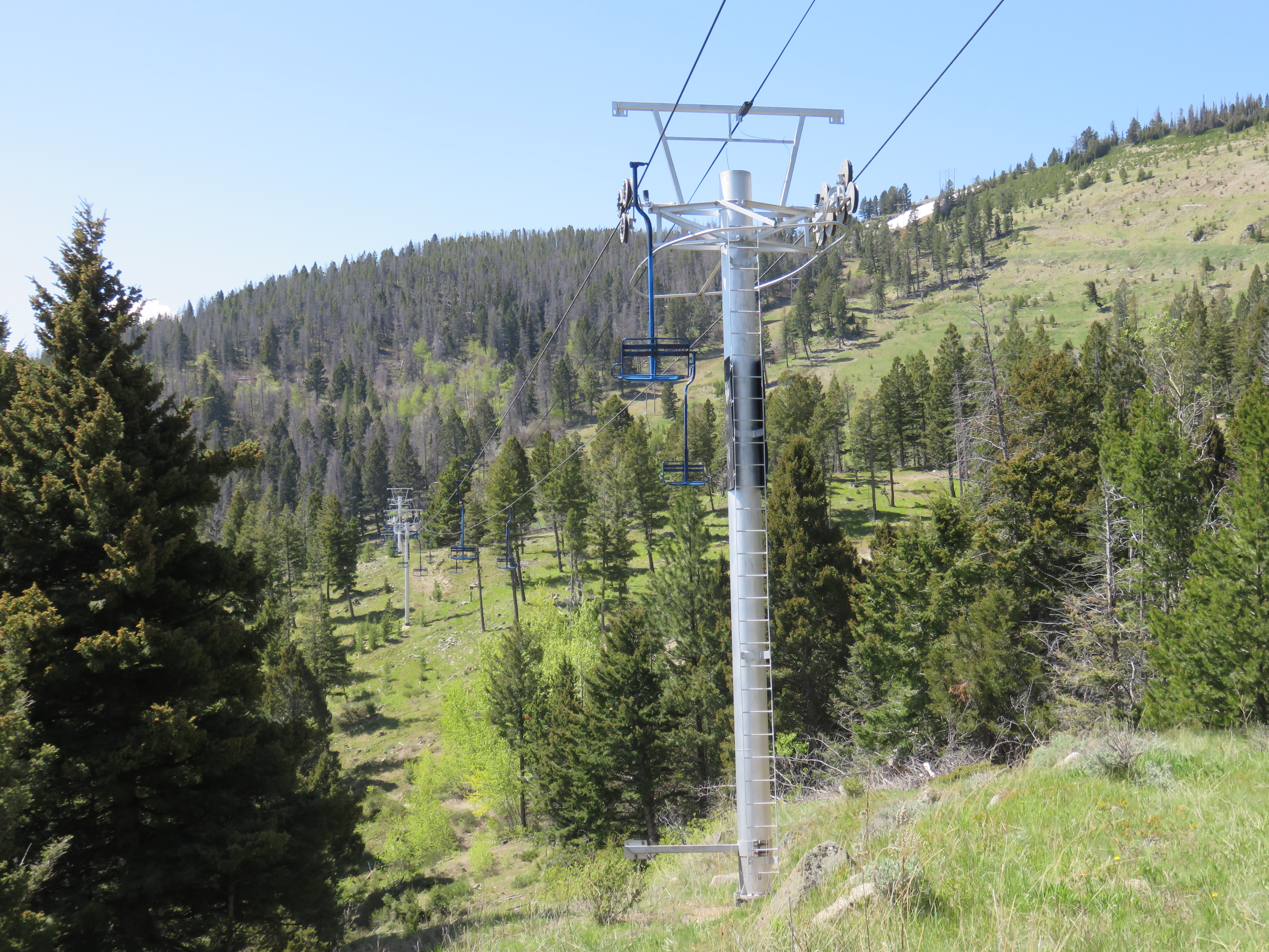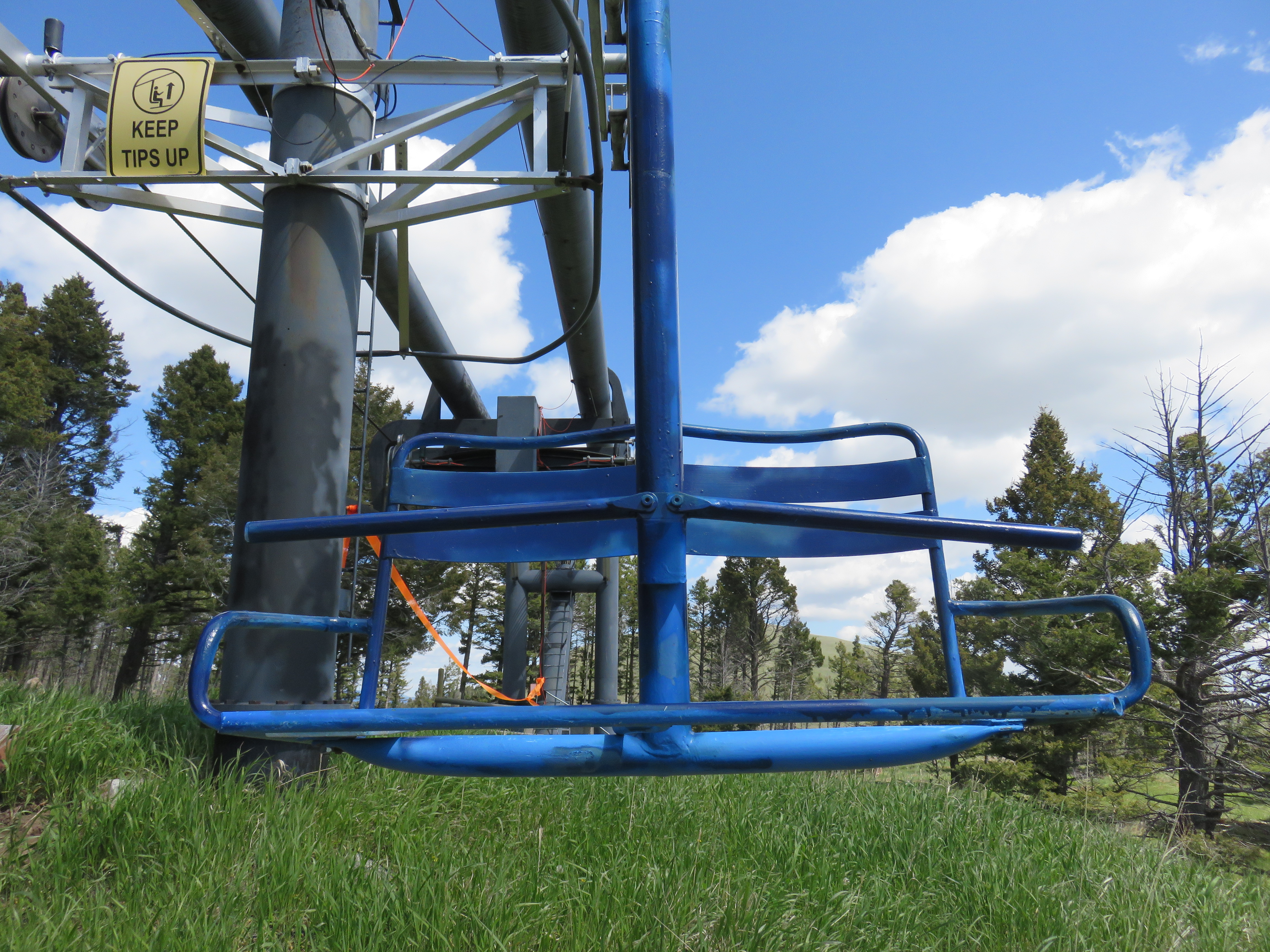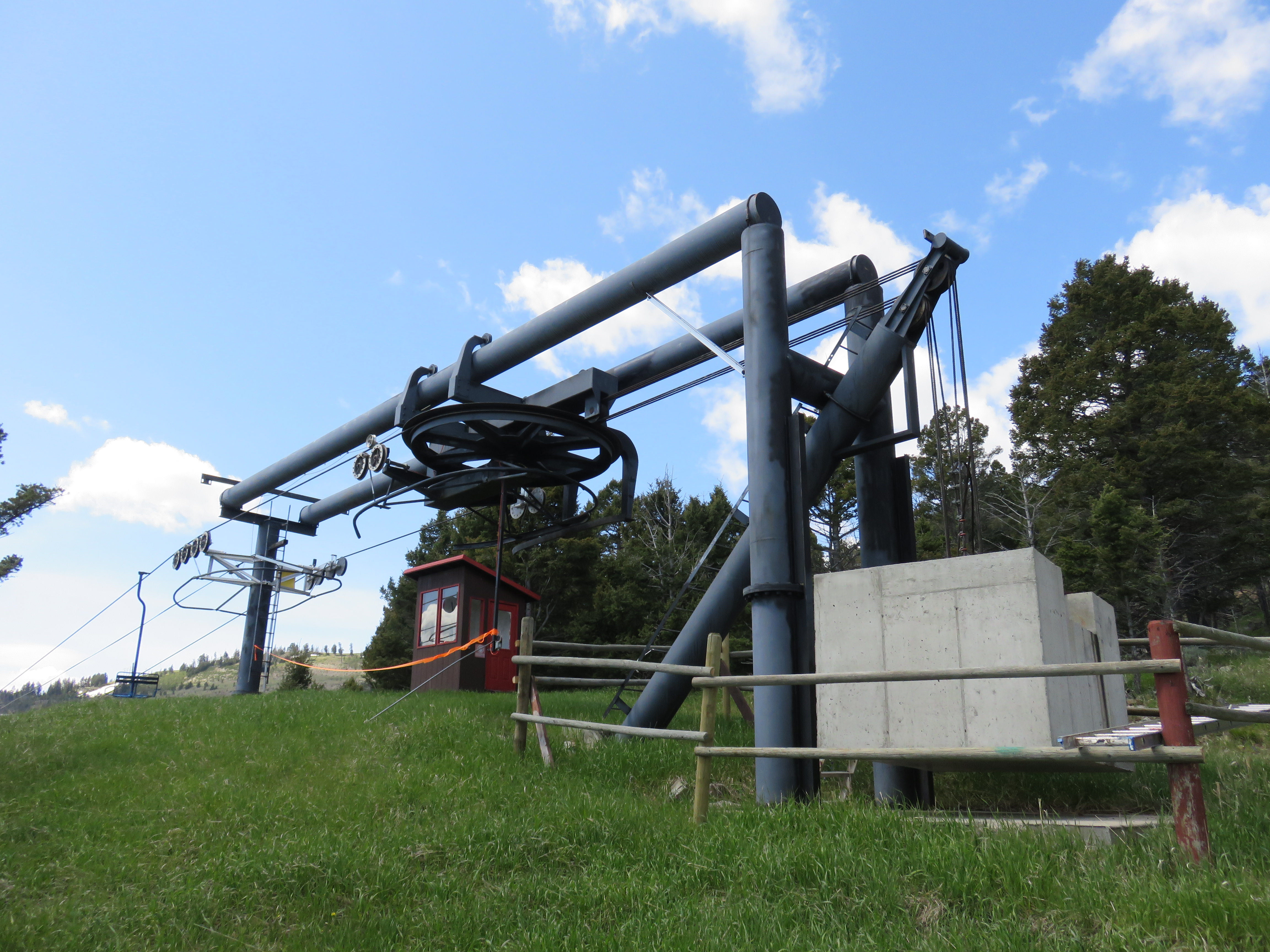 View down the lift line.This lift is flat until the last portion.Modified/relocated Riblet drive terminal.Loading area and lift shack.Center pole chair with unique restraining bars.View down from the summit.Top tension station.