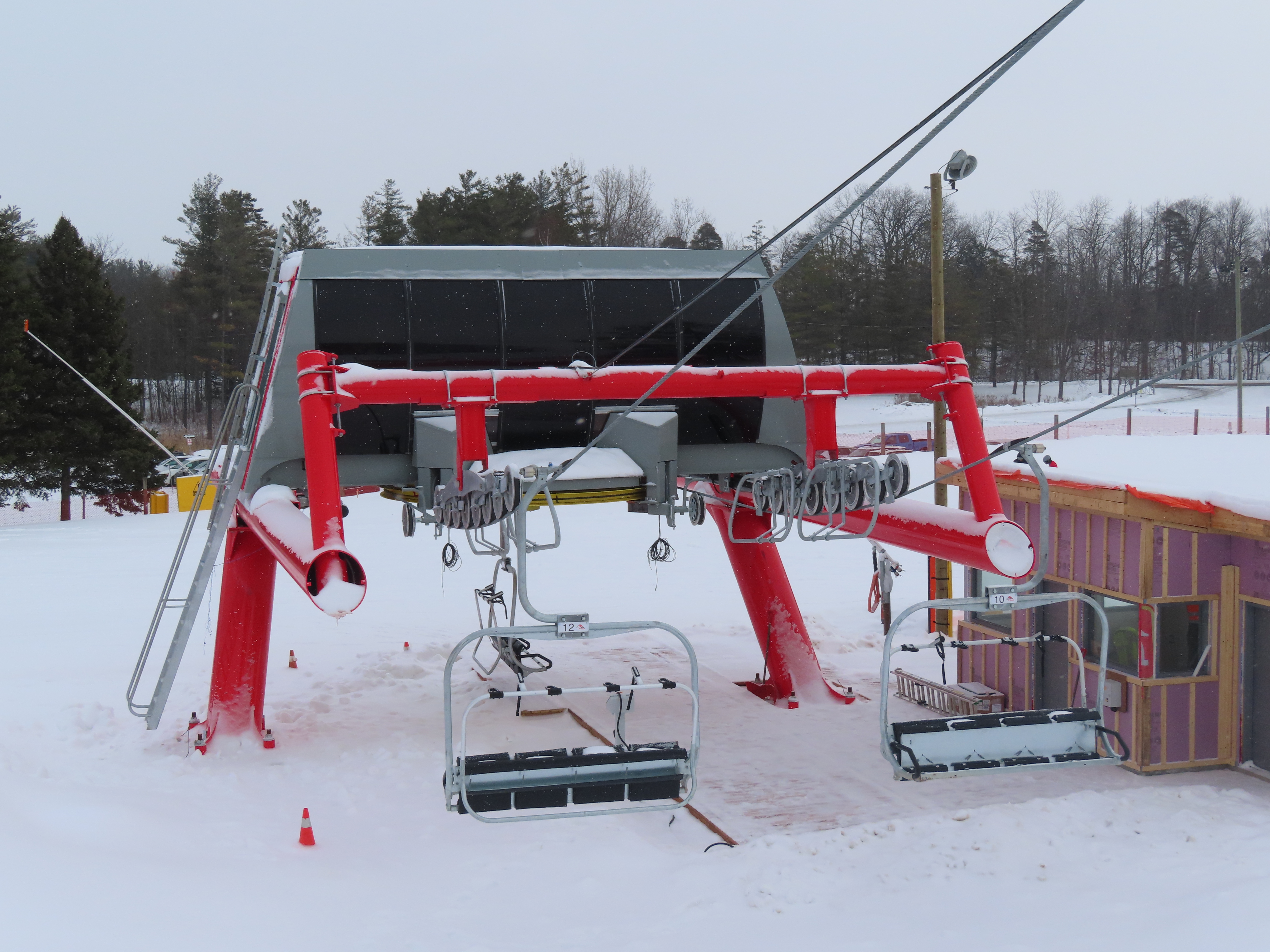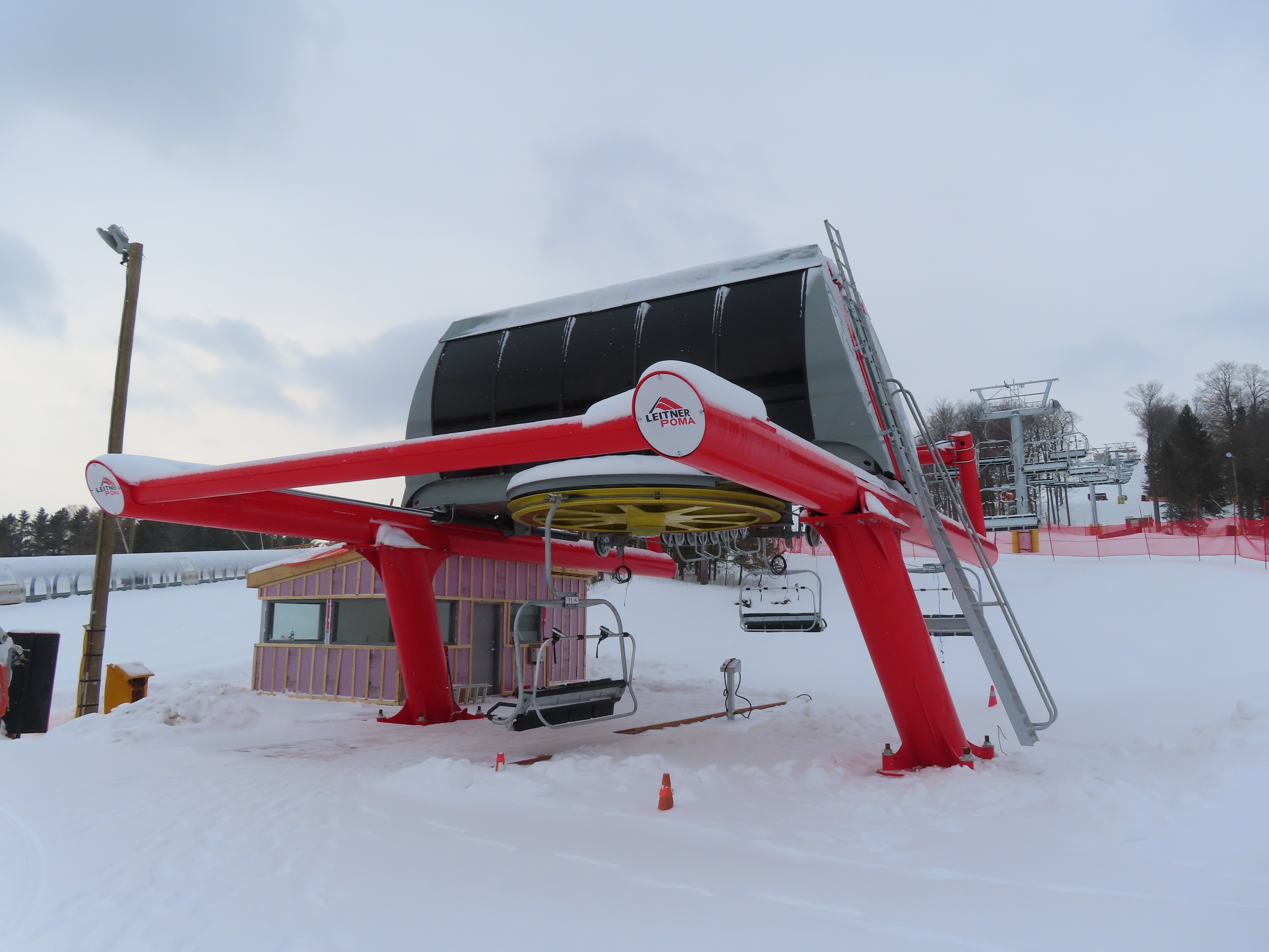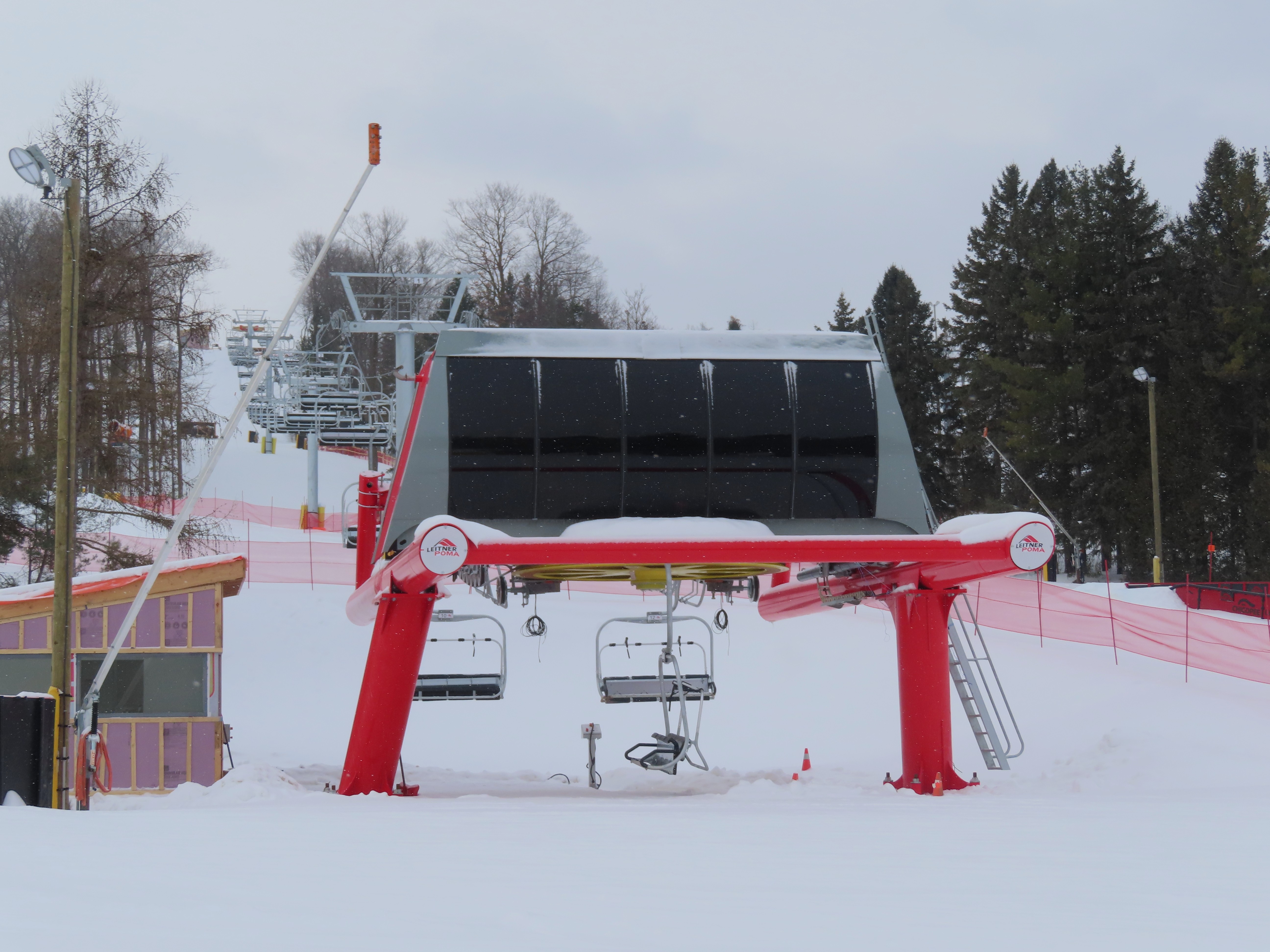 This lift indirectly replaced a Poma double chair on a longer alignment.For some reason it opened very late during its first season, 2024-25.View from the summit.Tower 4 and the top terminal.The upper station was built up on a large berm.View down at tower 3.Upper lift line.Tower 1.The only Alpha drive station produced by Leitner-Poma in 2024.Lift overview.Loading area and motor room.Side view of the bottom station.View down from the summit.Lift line crossing over a terrain park.Omega chair.Looking up the lift line.