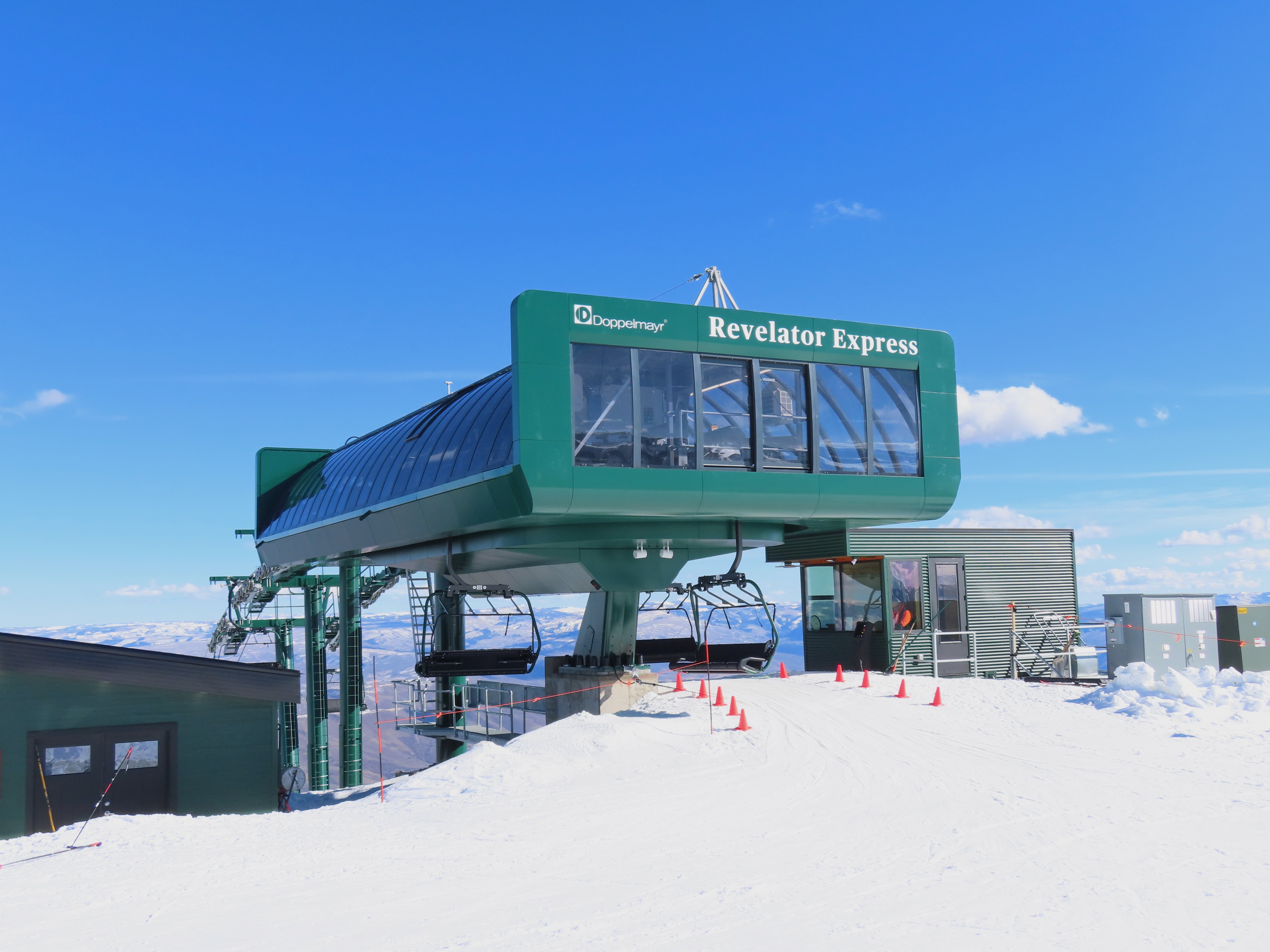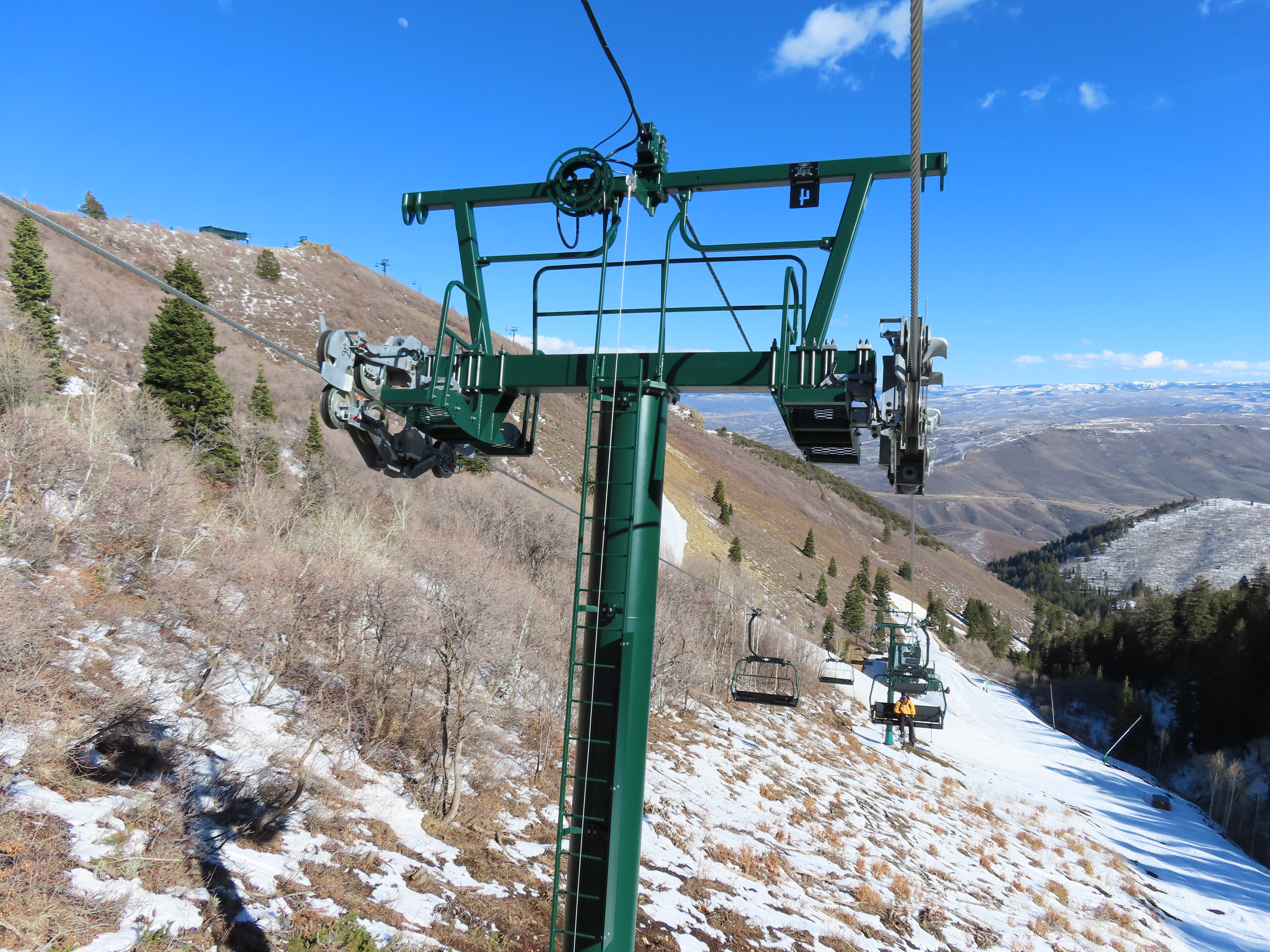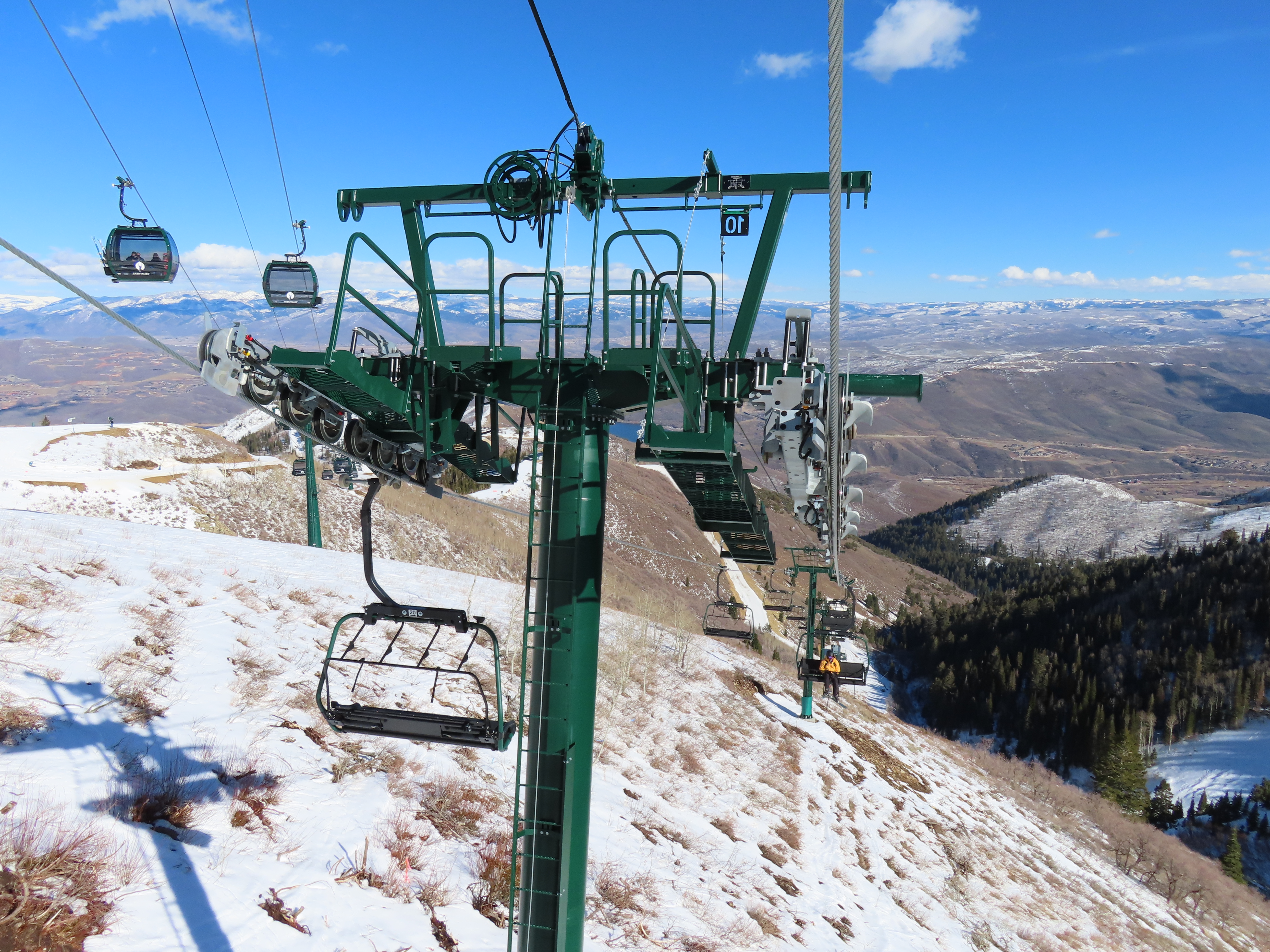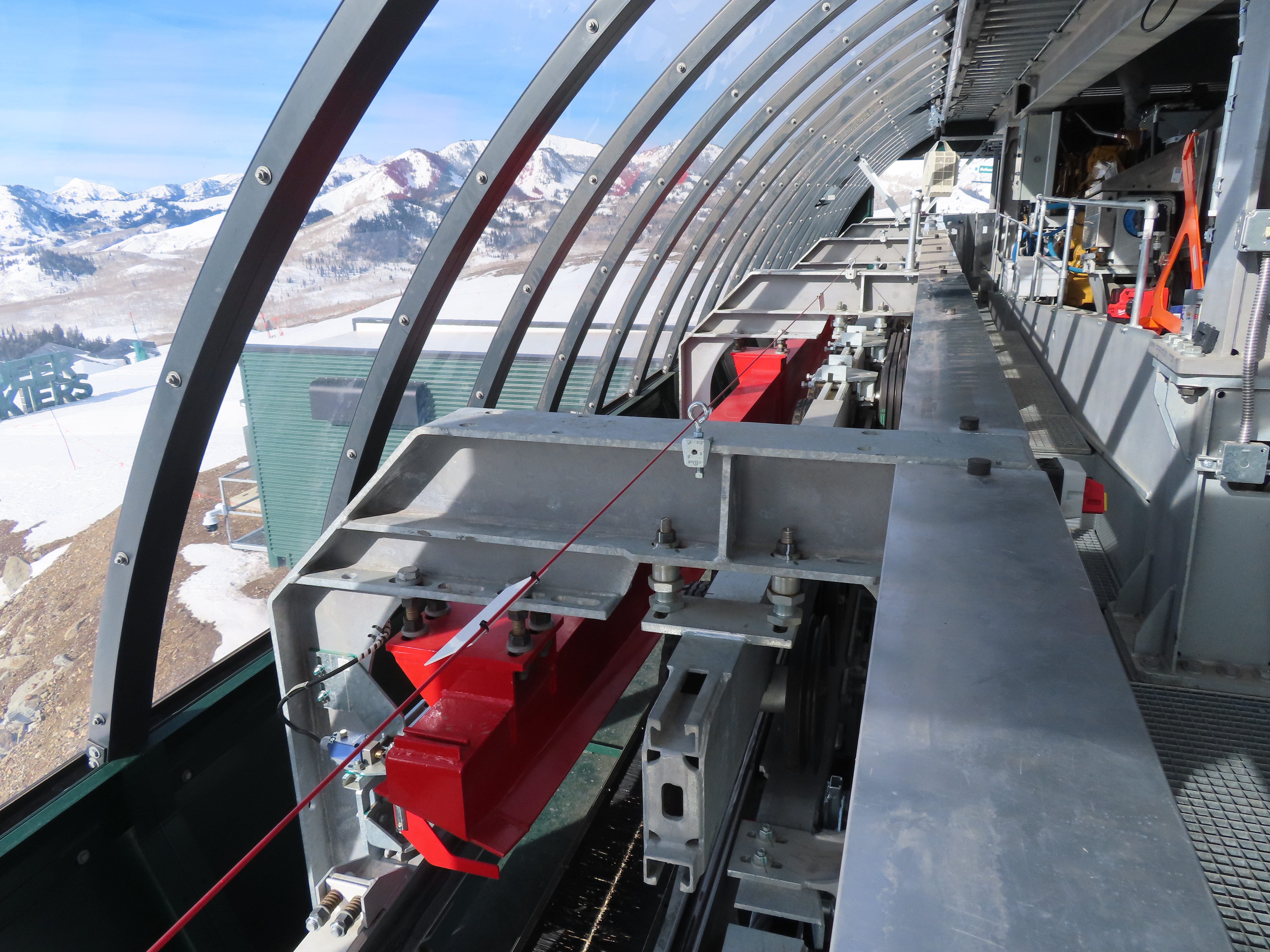 This lift serves the upper half of what was originally planned as one very long lift up the gut of Park Peak.Near the top, Revelator passes underneath the East Village Gondola section II.Lower station and tower 1 along the Catch All trail.View up the line near the bottom terminal.UNI-G station designed to mimic a D-Line.American style tower head.View riding up at tower 7.Looking back down the lower line.Tower 8.Crossing under the gondola at tower 10.View back down.Nearing the summit.Big breakover with three towers.Arriving at the drive.Unloading area on Park Peak.View toward Redemption Ridge.The entire lift seen from behind.Loading area.Riding out of the canyon.Doppelmayr Connect control system at the drive.View from the top terminal.Another view from the motor room.ABB electric motor.Due to its location, this lift incorporates both standby and evacuation engines.Controls in the station.Grip detach rail.View from the summit toward Big Dutch and Jordanelle.Side view of the drive station and breakover.Upper terminal seen from Redemption.