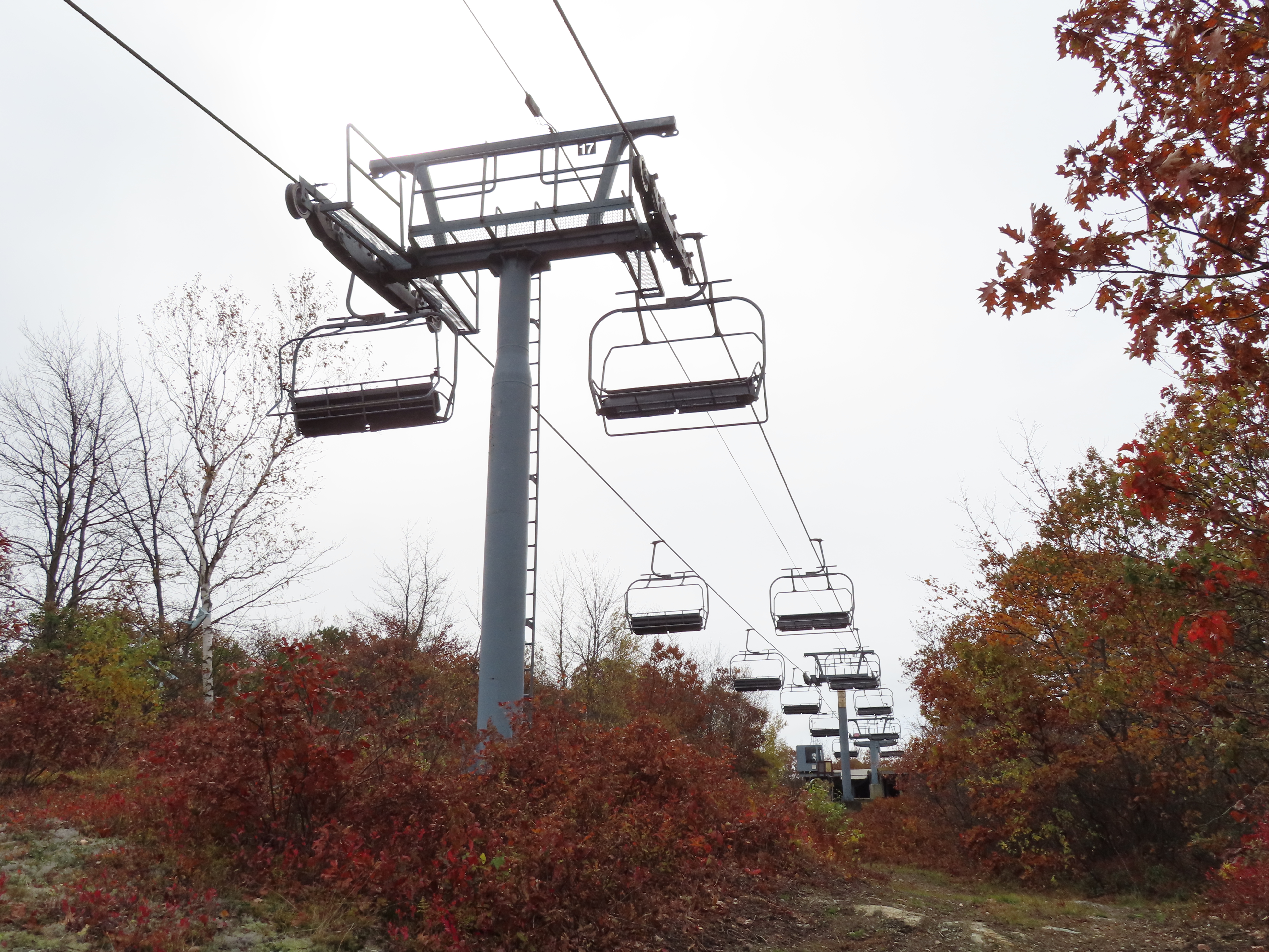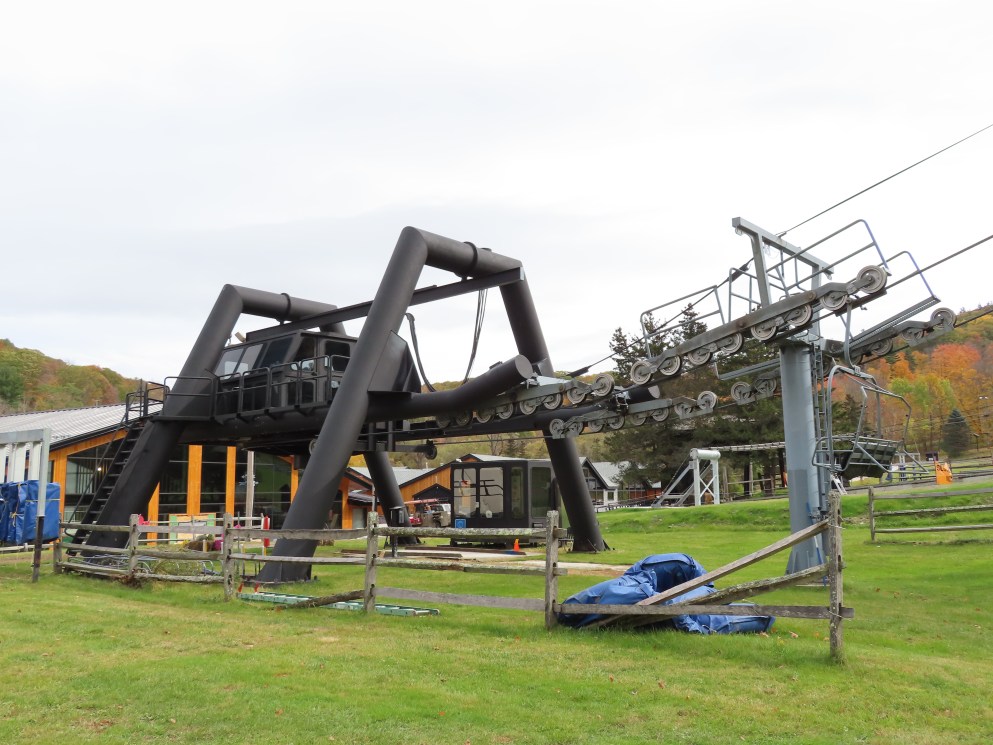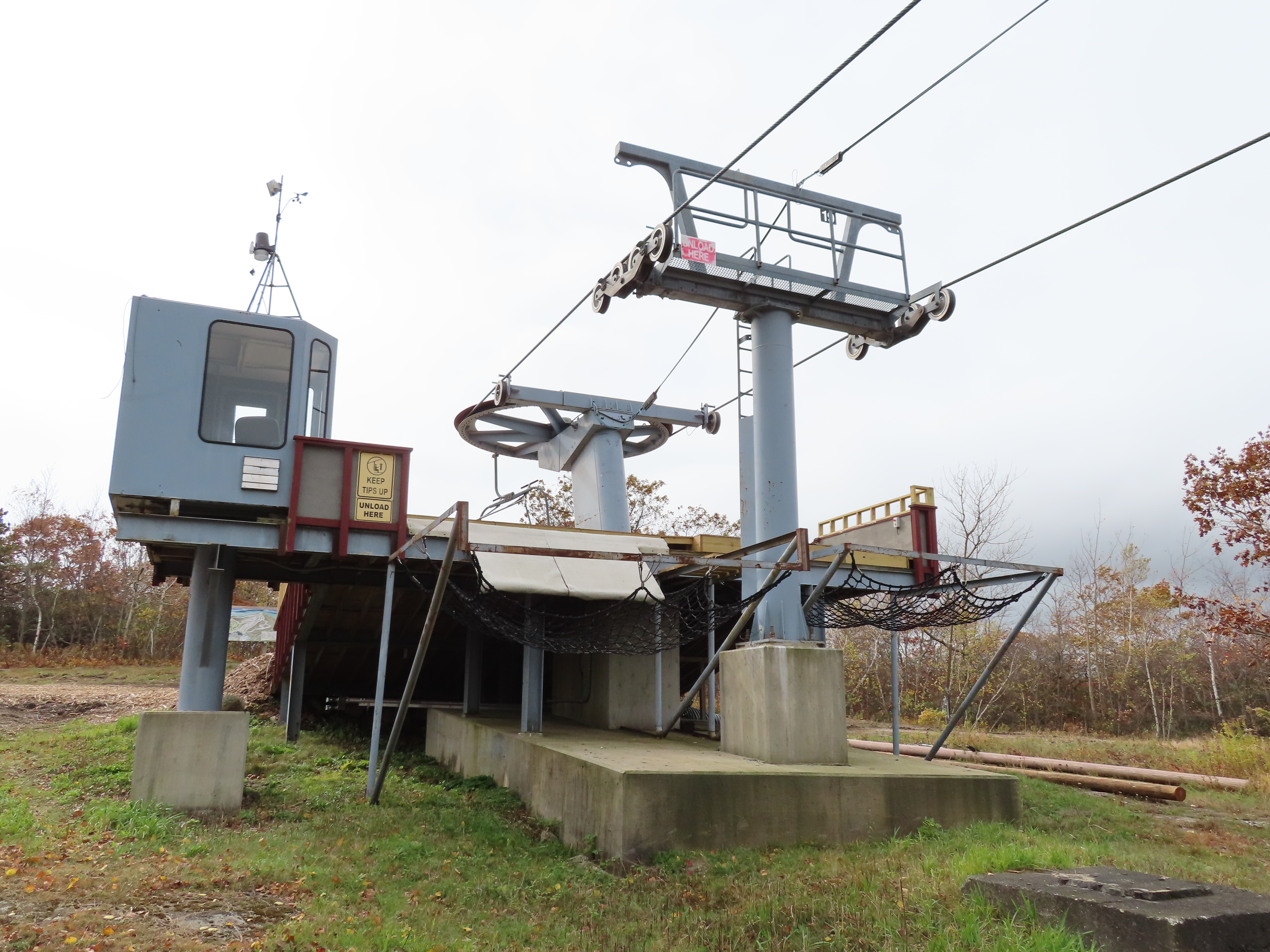 This base to summit lift came used from Belleayre.The bottom terminal is a CTEC Enterprise model.Looking down the lift line.The last few towers.Tower 19 shares a foundation with the top terminal.Orion return.Middle part of the lift line.Lower line.CTEC quad chairs.Lift line seen from the parking lot.