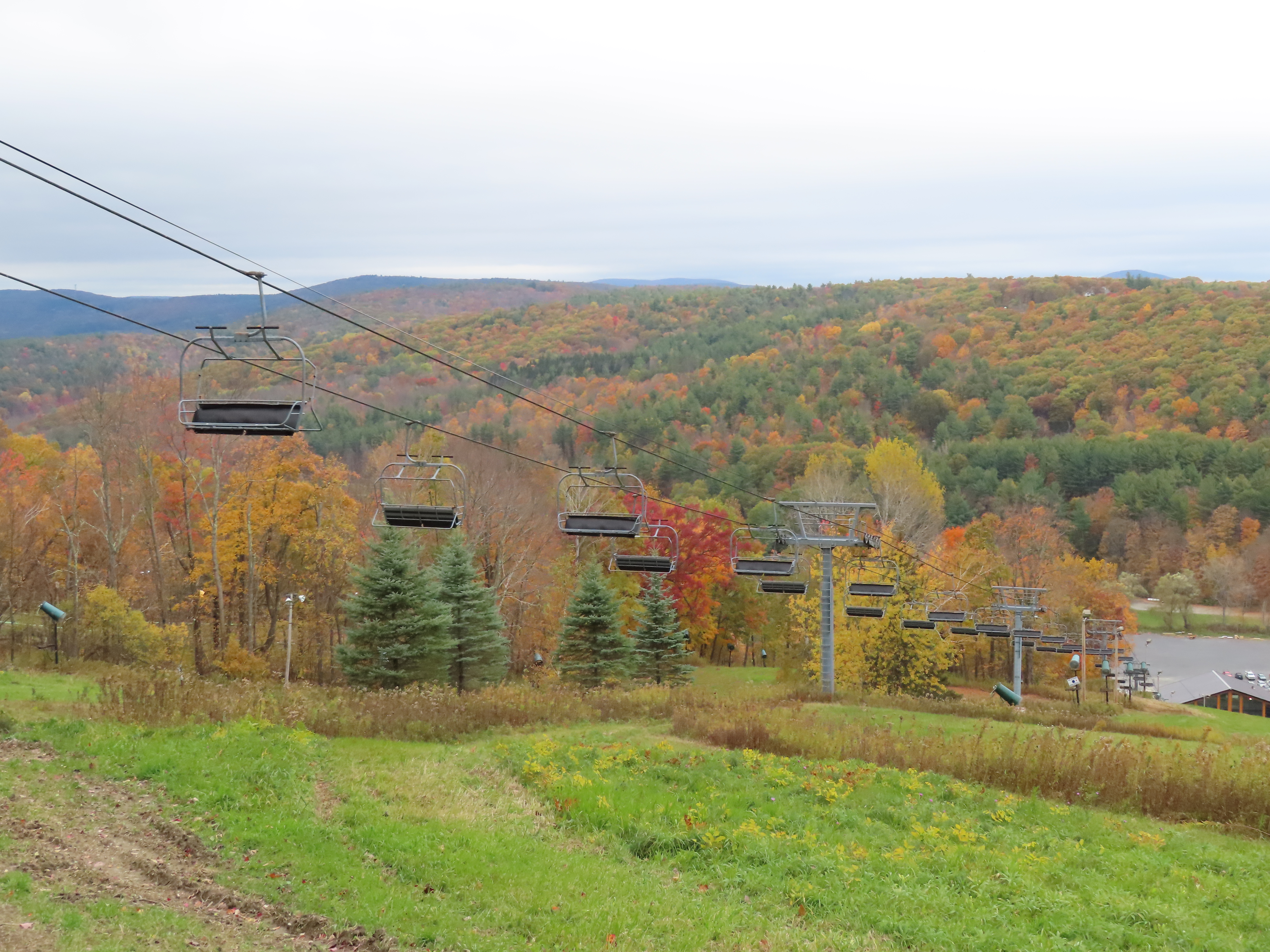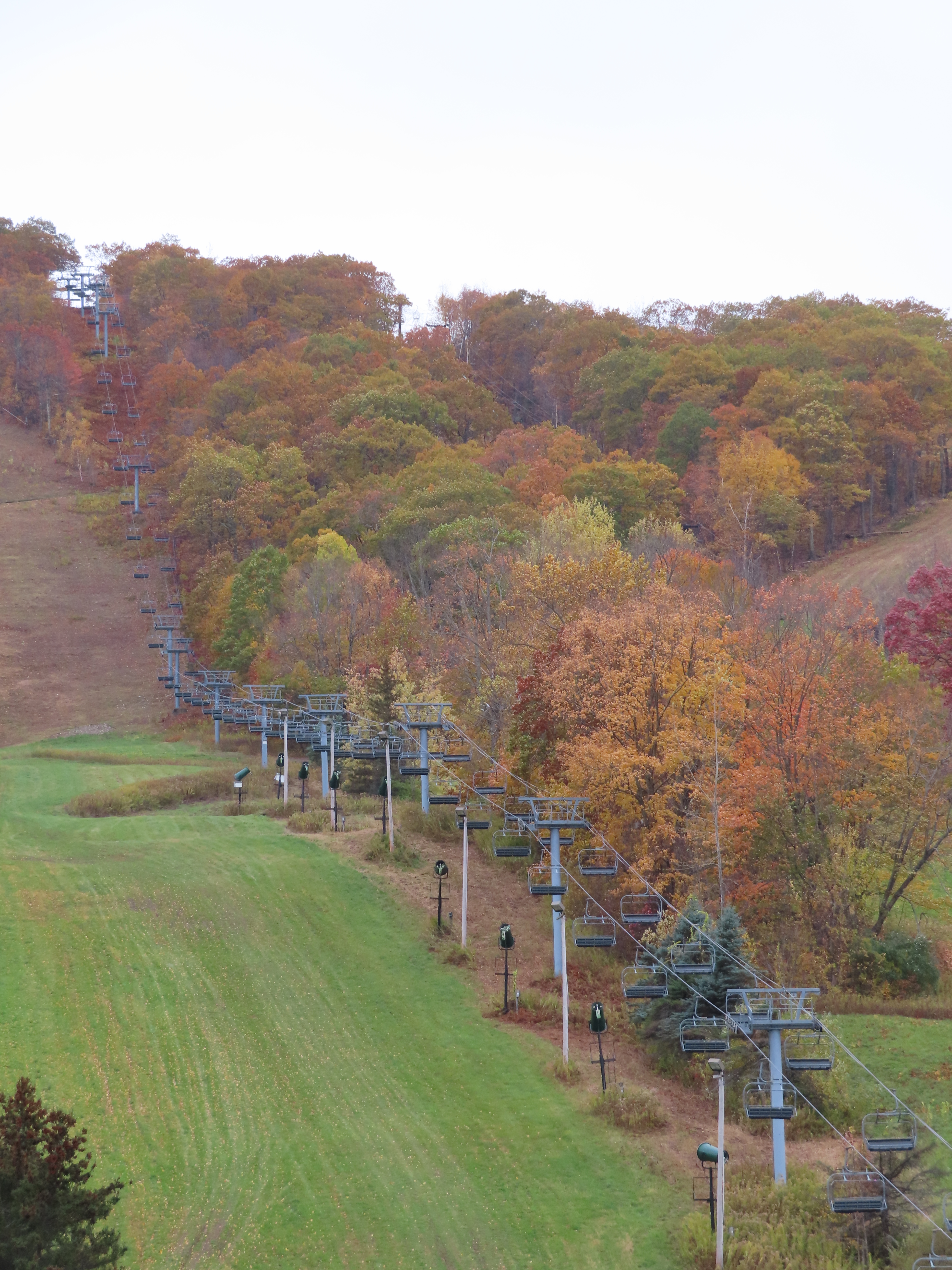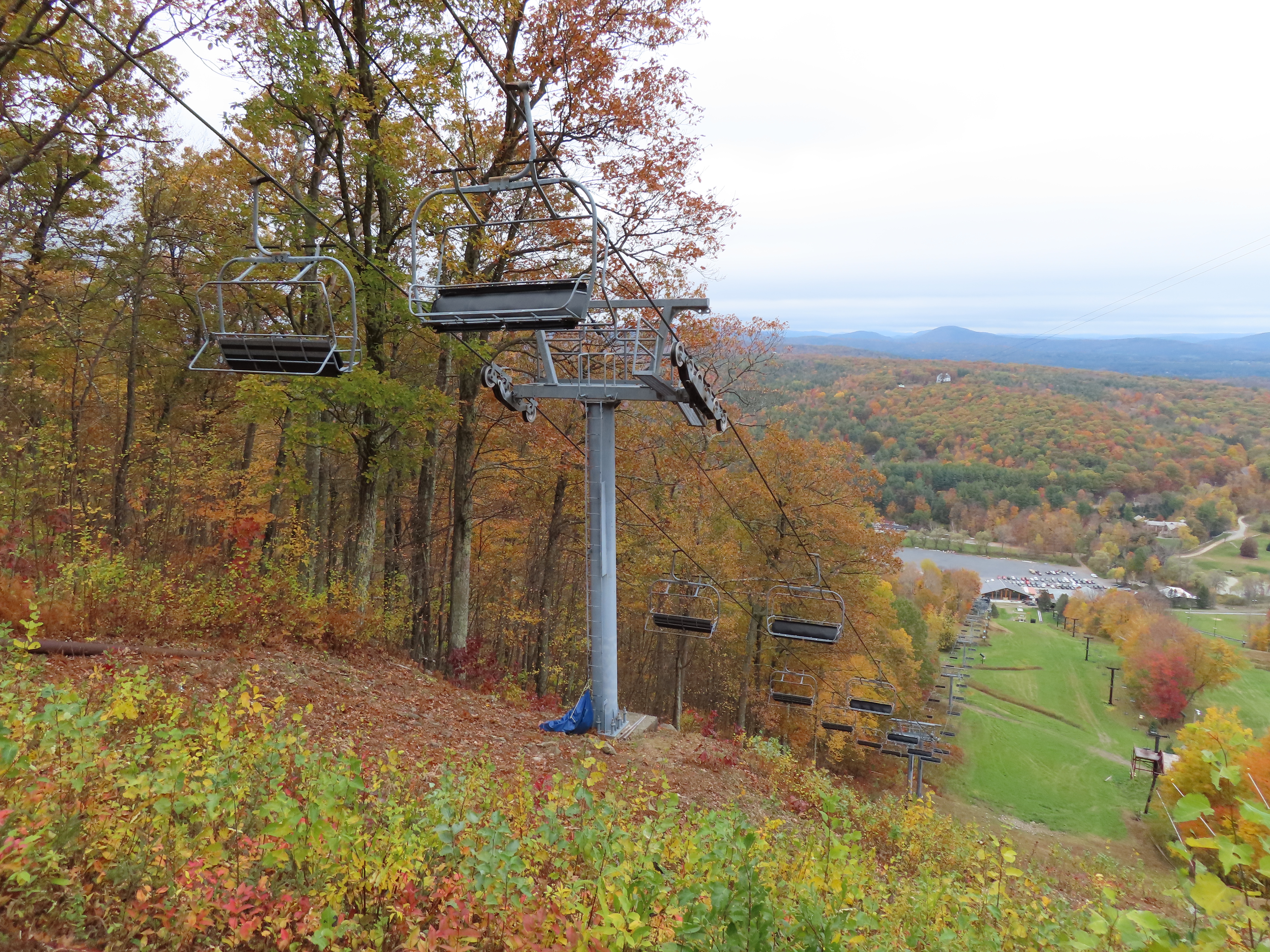 This base to summit lift came used from Belleayre.The bottom terminal is a CTEC Enterprise model.Looking down the lift line.The last few towers.Tower 19 shares a foundation with the top terminal.Orion return.Middle part of the lift line.Lower line.CTEC quad chairs.Lift line seen from the parking lot.