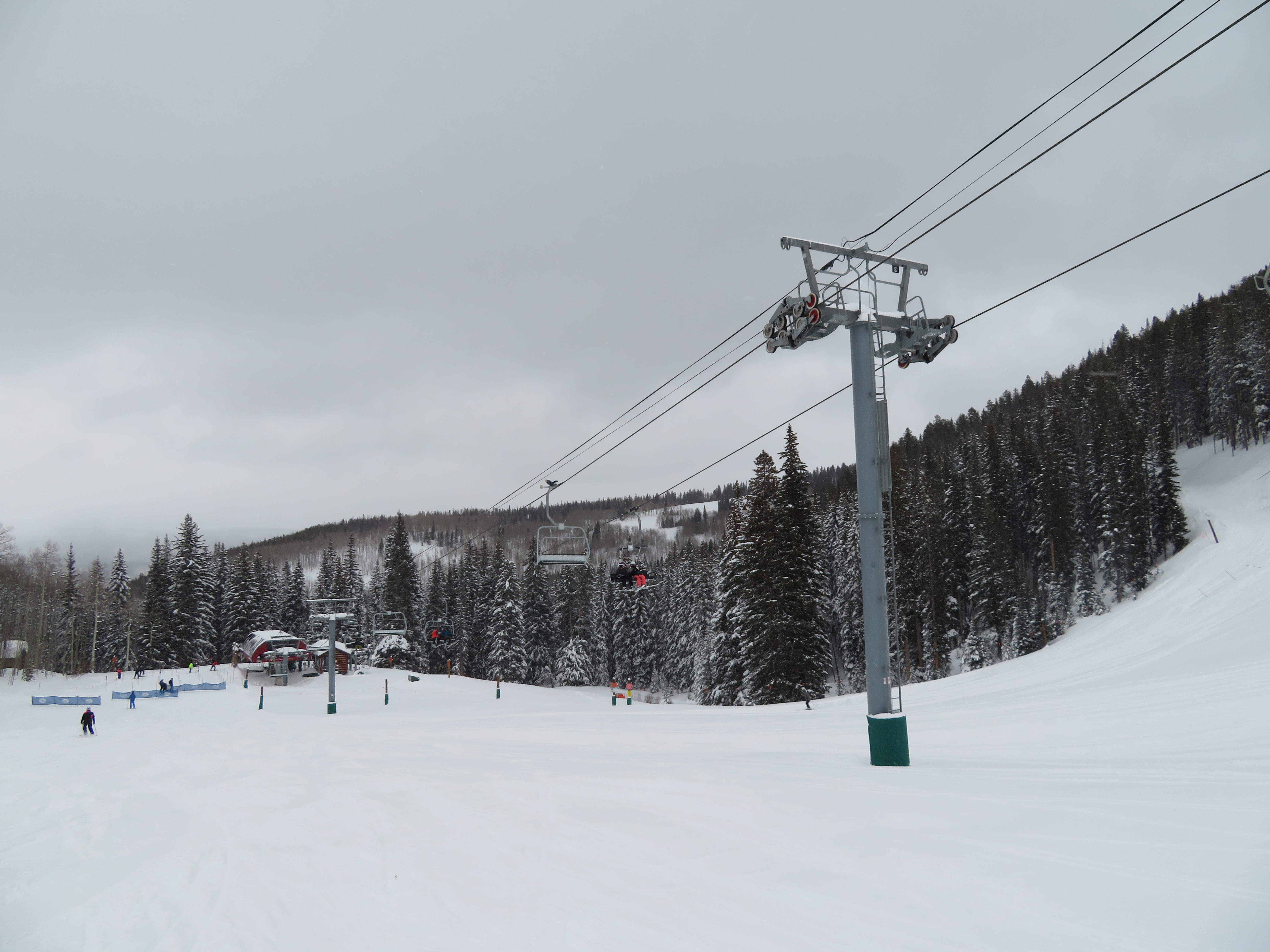 Compression tower near the base.Beaver Creek has one of the best lift paint schemes anywhere.Judging from the snow-catchers along the windows, this lift was originally designed for 90-degree loading.Riding up.The heart of Rose Bowl.Nearing the summit and Drink of Water lift.Top station, downhill end.View up of the drive.Looking down the lift line.Side view, top drive station.