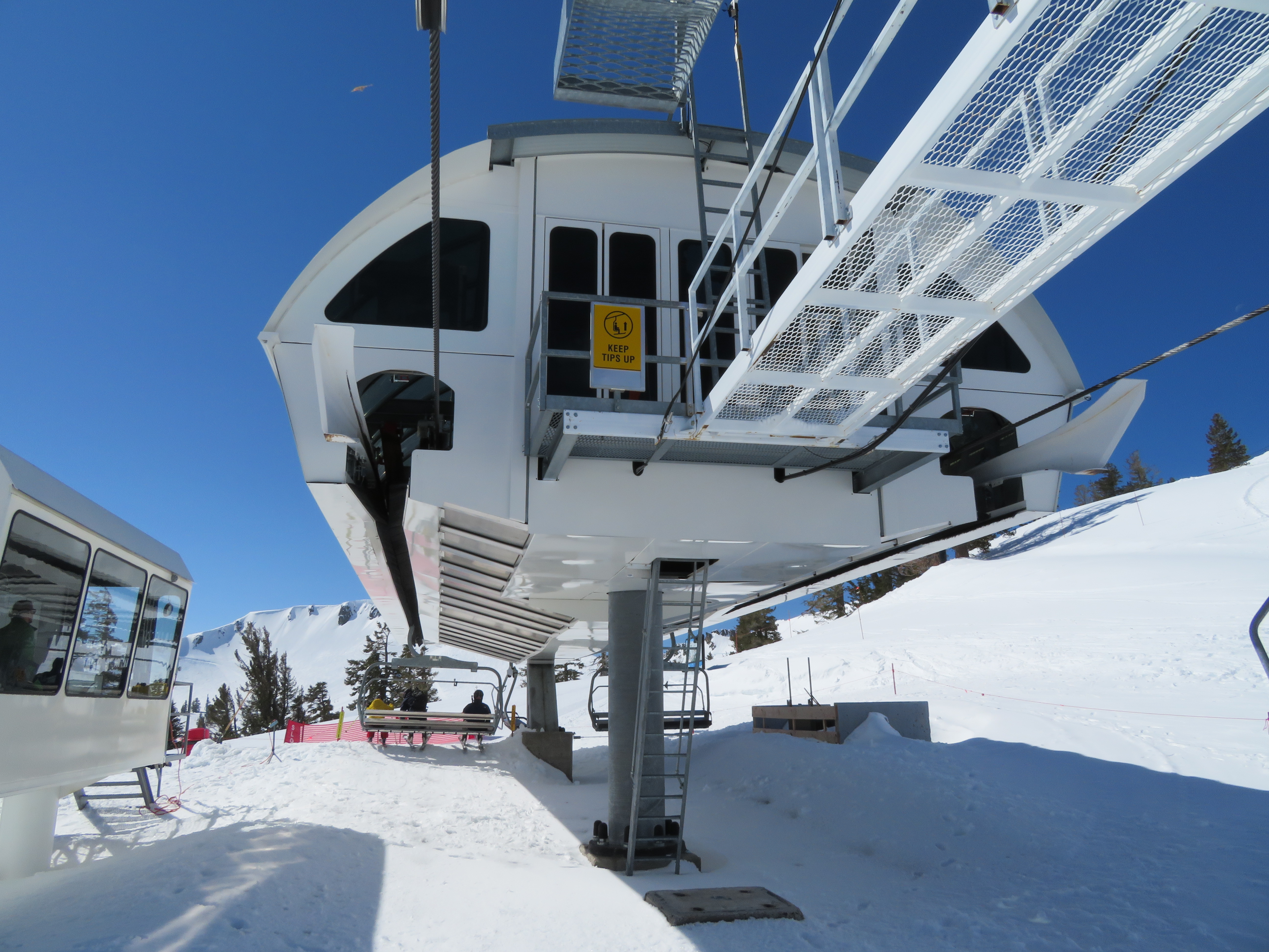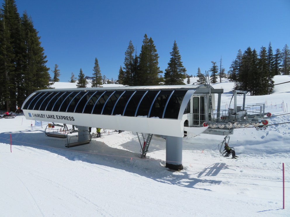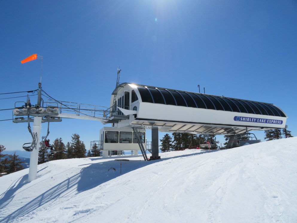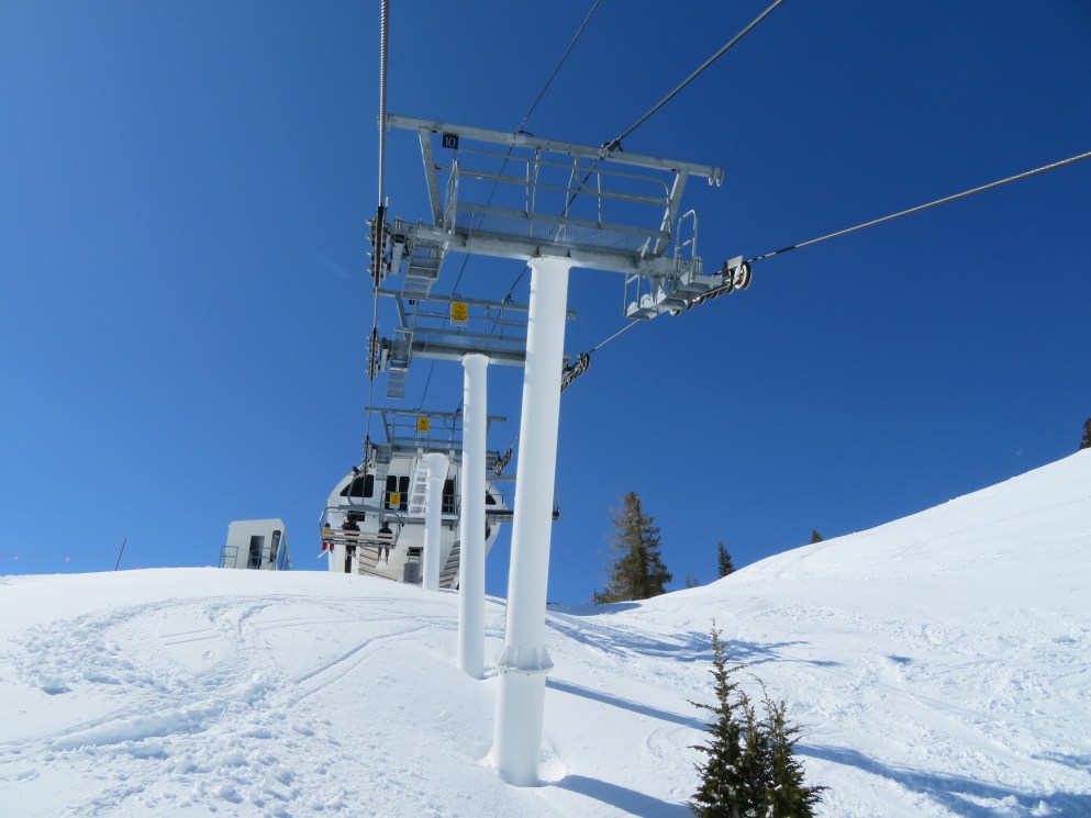 You’ll notice that the final break-over towers are painted white while the other towers, on the line, are painted black… The break-over towers, when black, absorb enough solar heat to slightly distort them and move the haul-rope’s location minutely. The electronics sensors for spacing of the chairs were often tripped, and the lift shut down, before the painting change was made. This was noticed after the original Shirley Lake Express (circa 1987) was installed.
