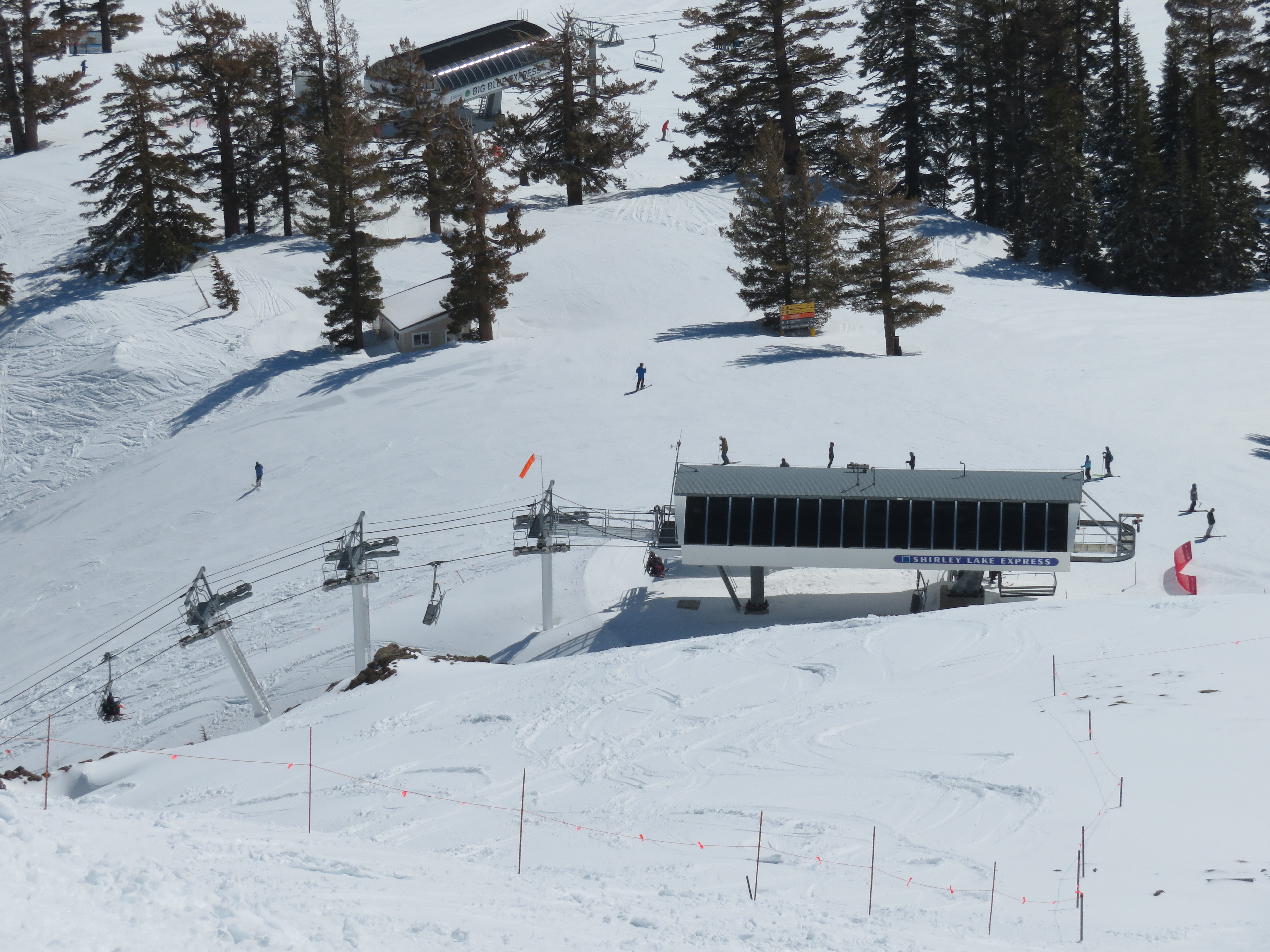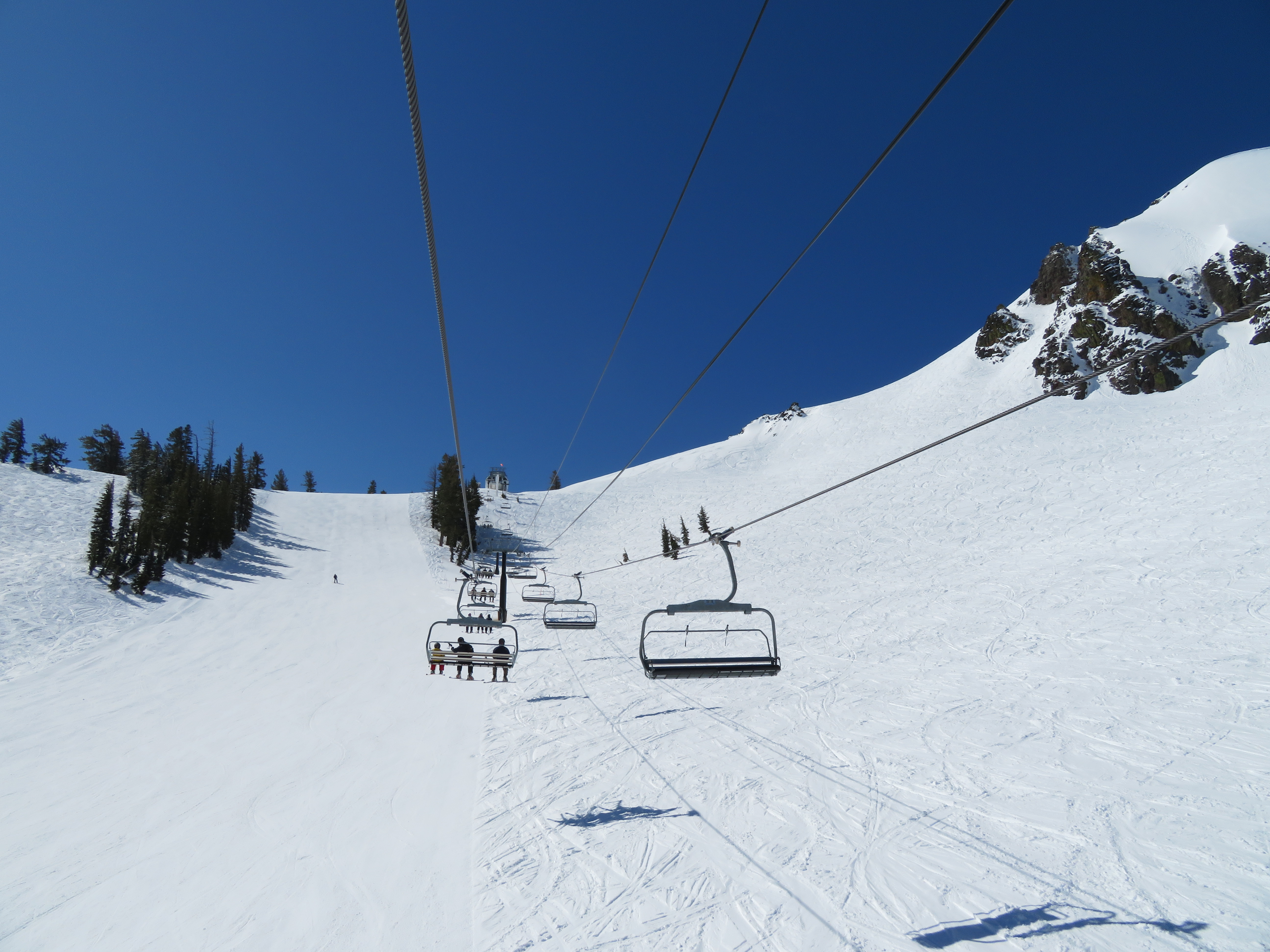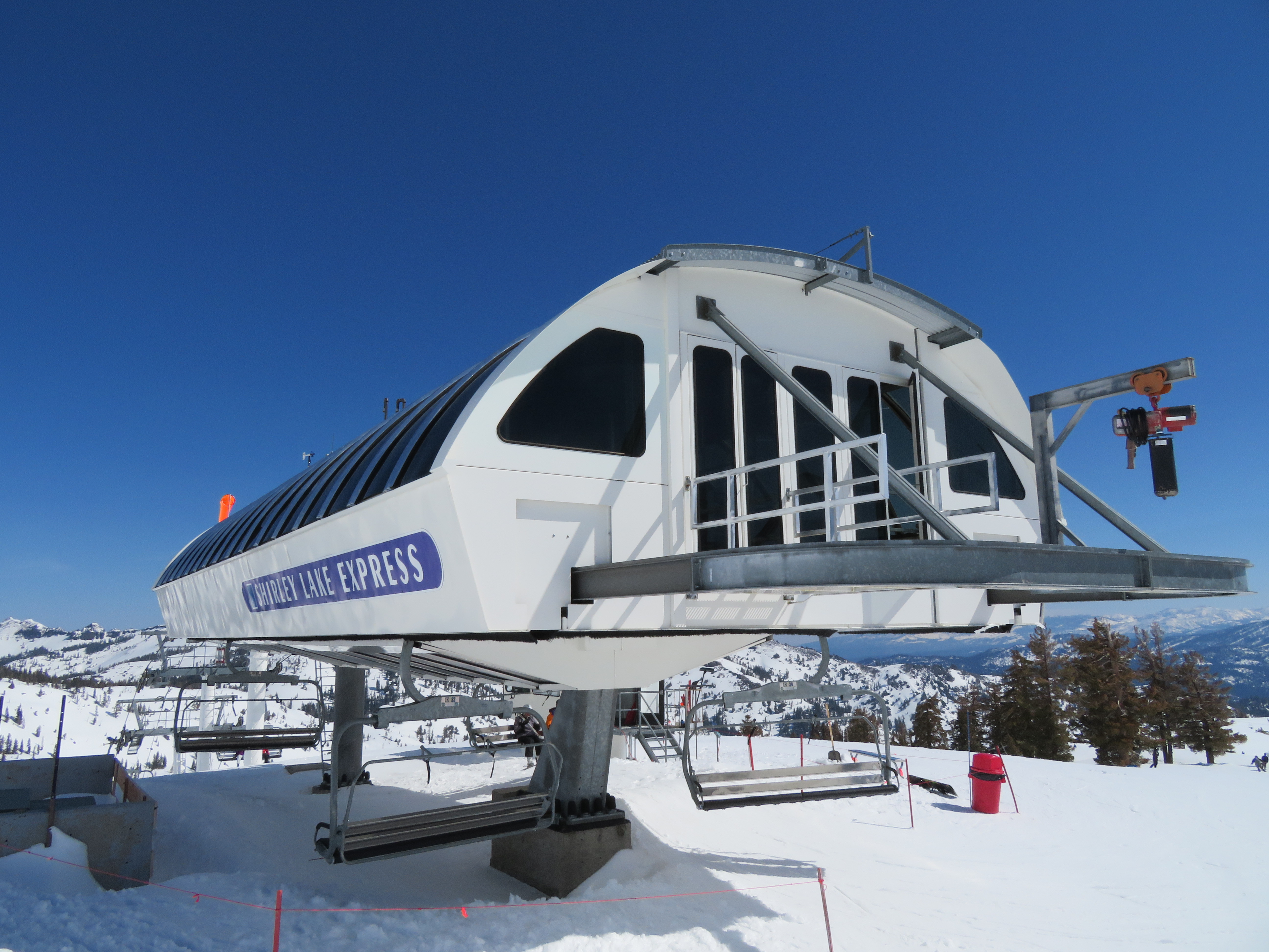 You’ll notice that the final break-over towers are painted white while the other towers, on the line, are painted black… The break-over towers, when black, absorb enough solar heat to slightly distort them and move the haul-rope’s location minutely. The electronics sensors for spacing of the chairs were often tripped, and the lift shut down, before the painting change was made. This was noticed after the original Shirley Lake Express (circa 1987) was installed.