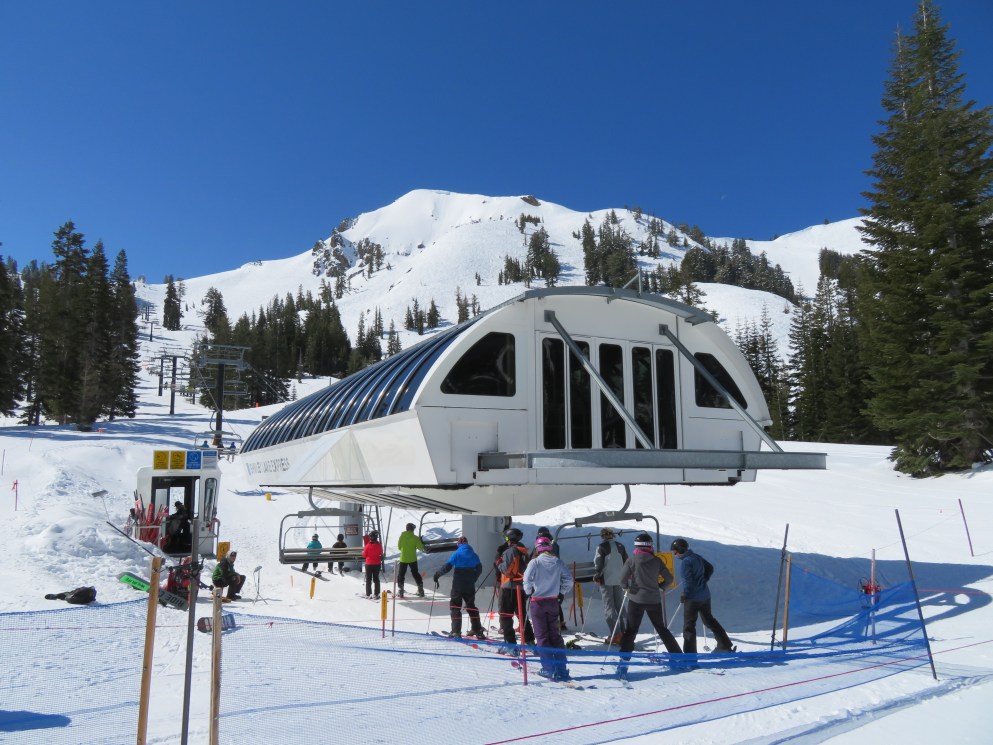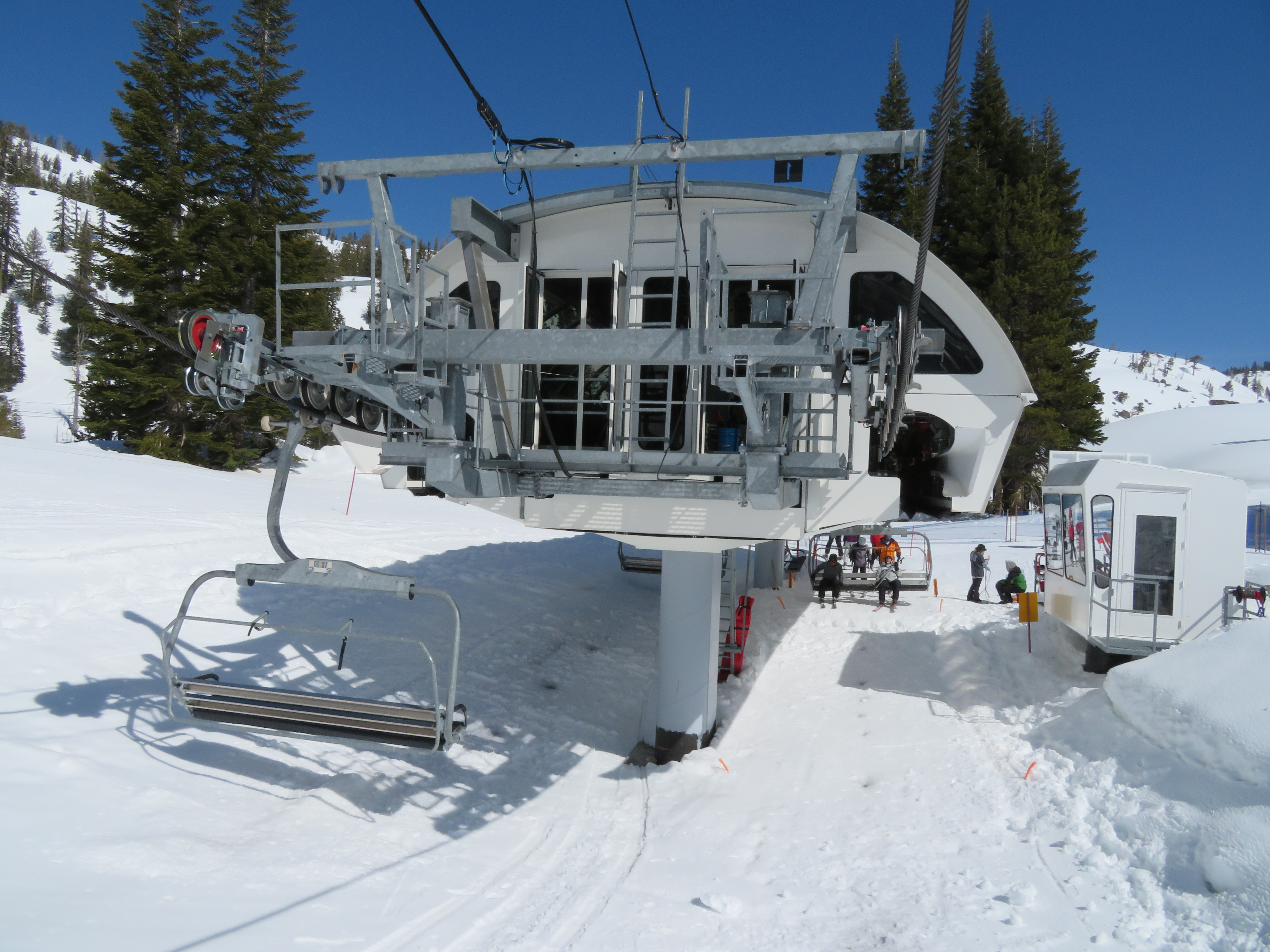 Rare Doppelmayr lift at Olympic Valley with height-adjustable Uni-GS terminals.Bottom station with small maintenance rail.Lift overview.Integrated tower 1.Look down the line.Garaventa chairs with Doppelmayr hangers.Breakover towers.Arrival up top.Top station with another maintenance rail.Drive terminal.Lower part of the line.Unload ramp.Top station above Big Blue.Doppelmayr Worldbook entry.