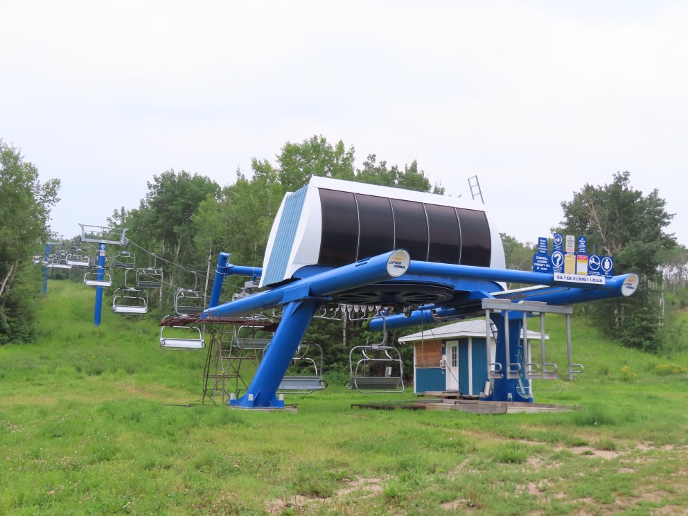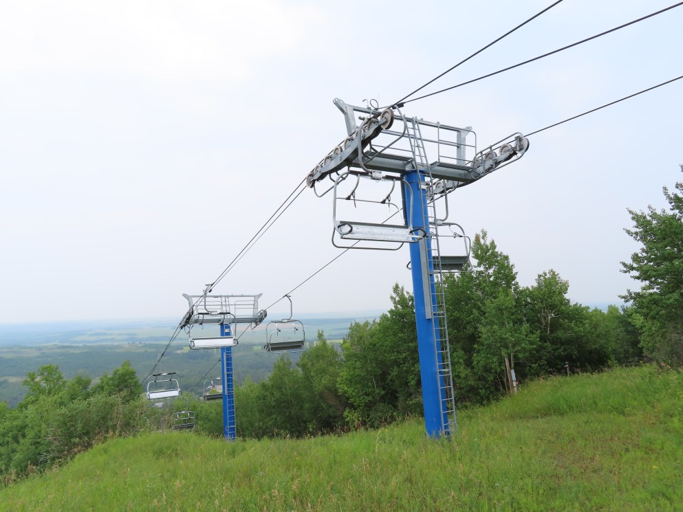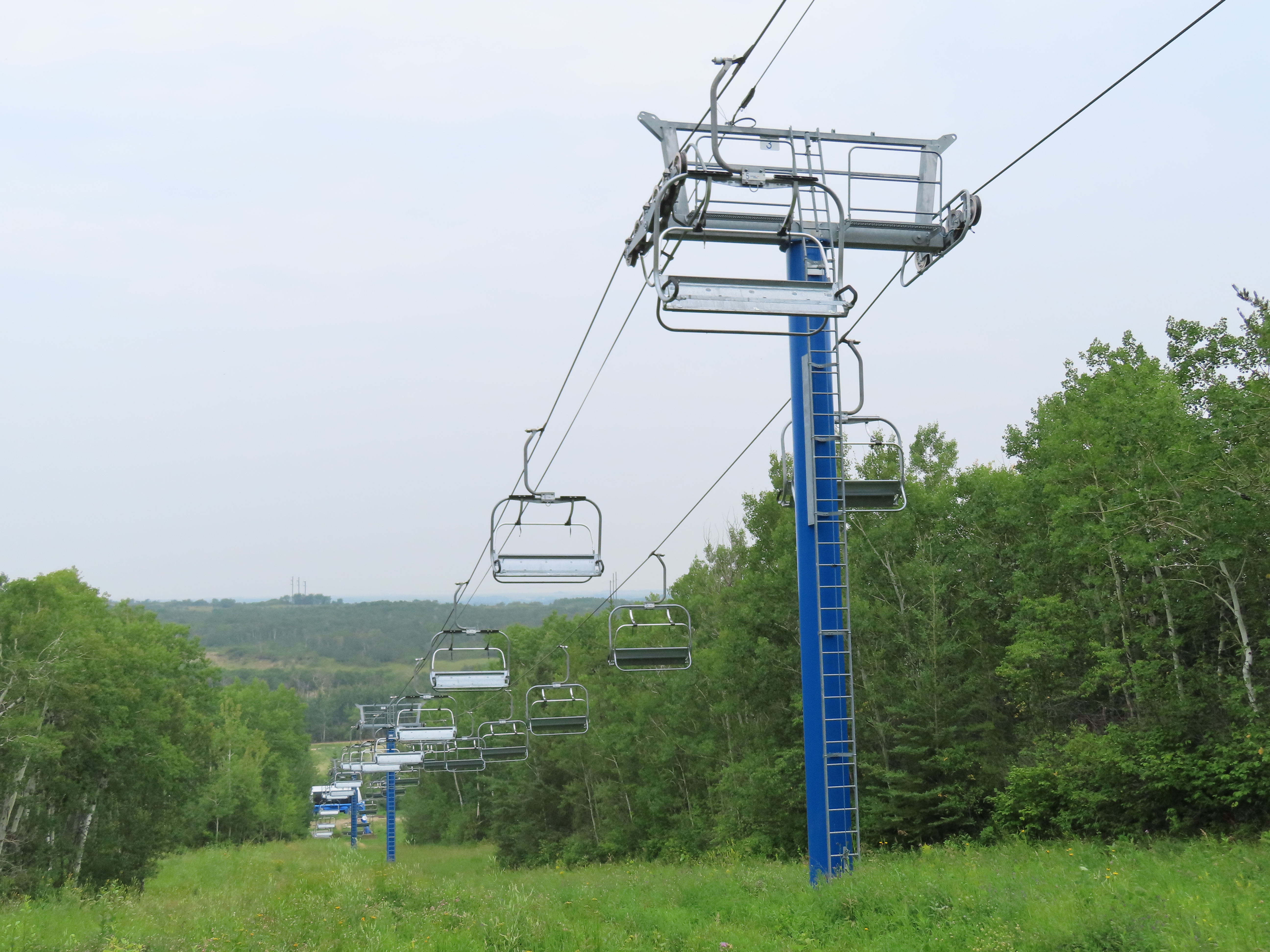 This lift services the west side of the mountain.Loading area and motor room.Base station area.Leitner-Poma painted tower.Middle section of the lift line.View up the line.Tower 5.T7.View from the summit.Breakover towers.Upper station area.Side view of the return terminal.