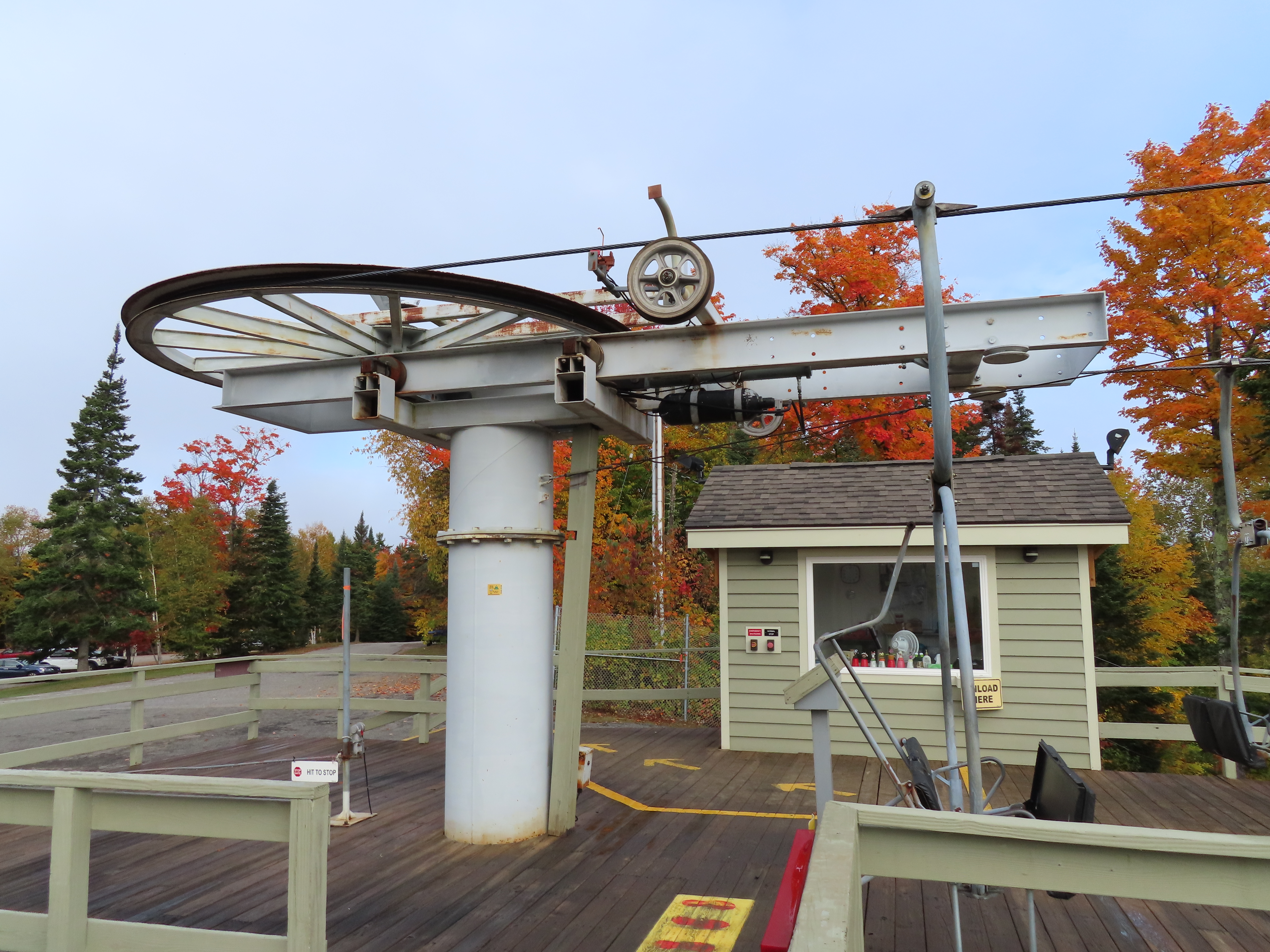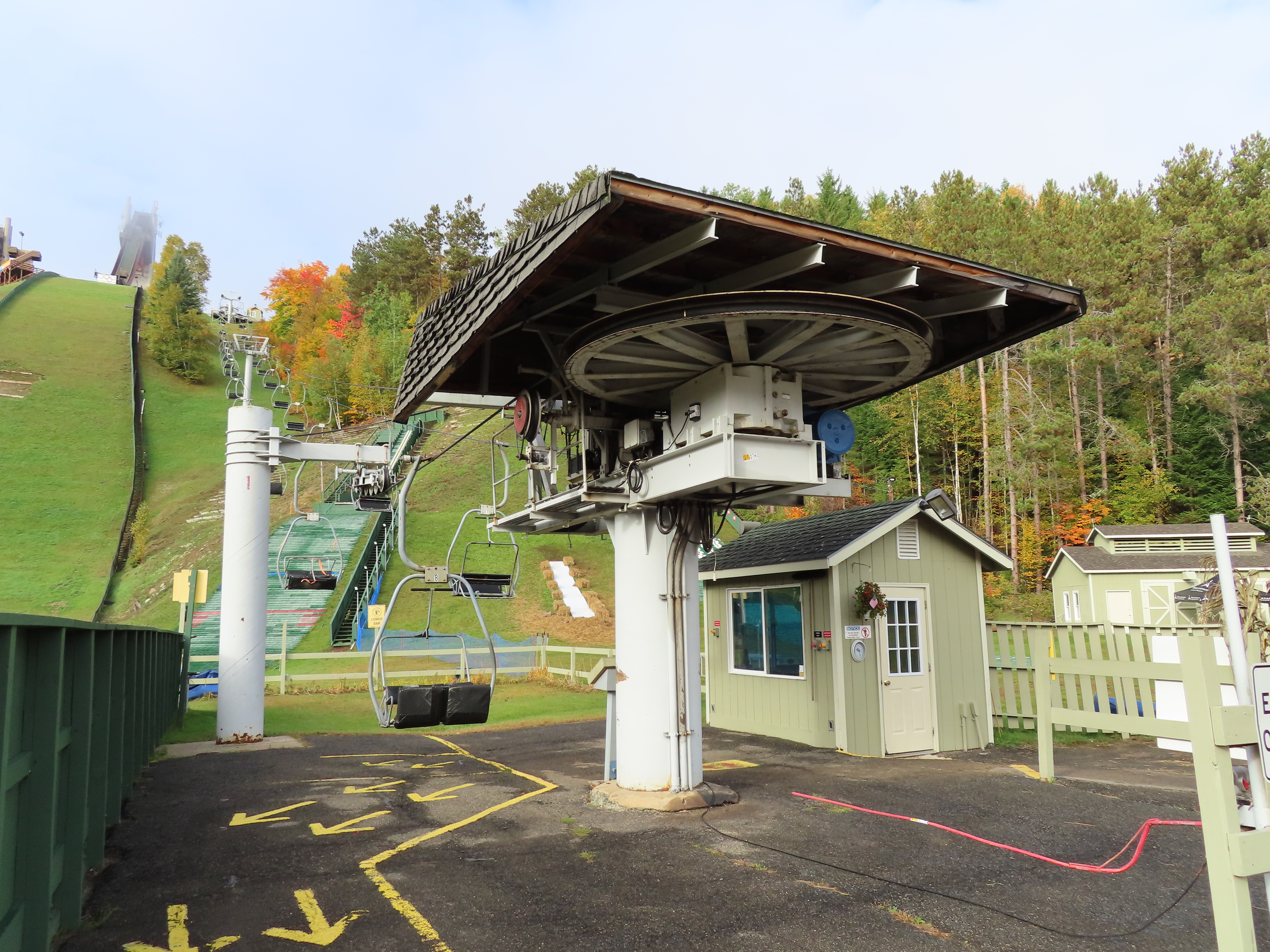 This lift was constructed in 1987 to service the ski jumping facility from the 1980 Olympics.The lift is often open to the public as part of ski jump tours.There are only three towers.The top terminal with tensioning.View down from the summit.