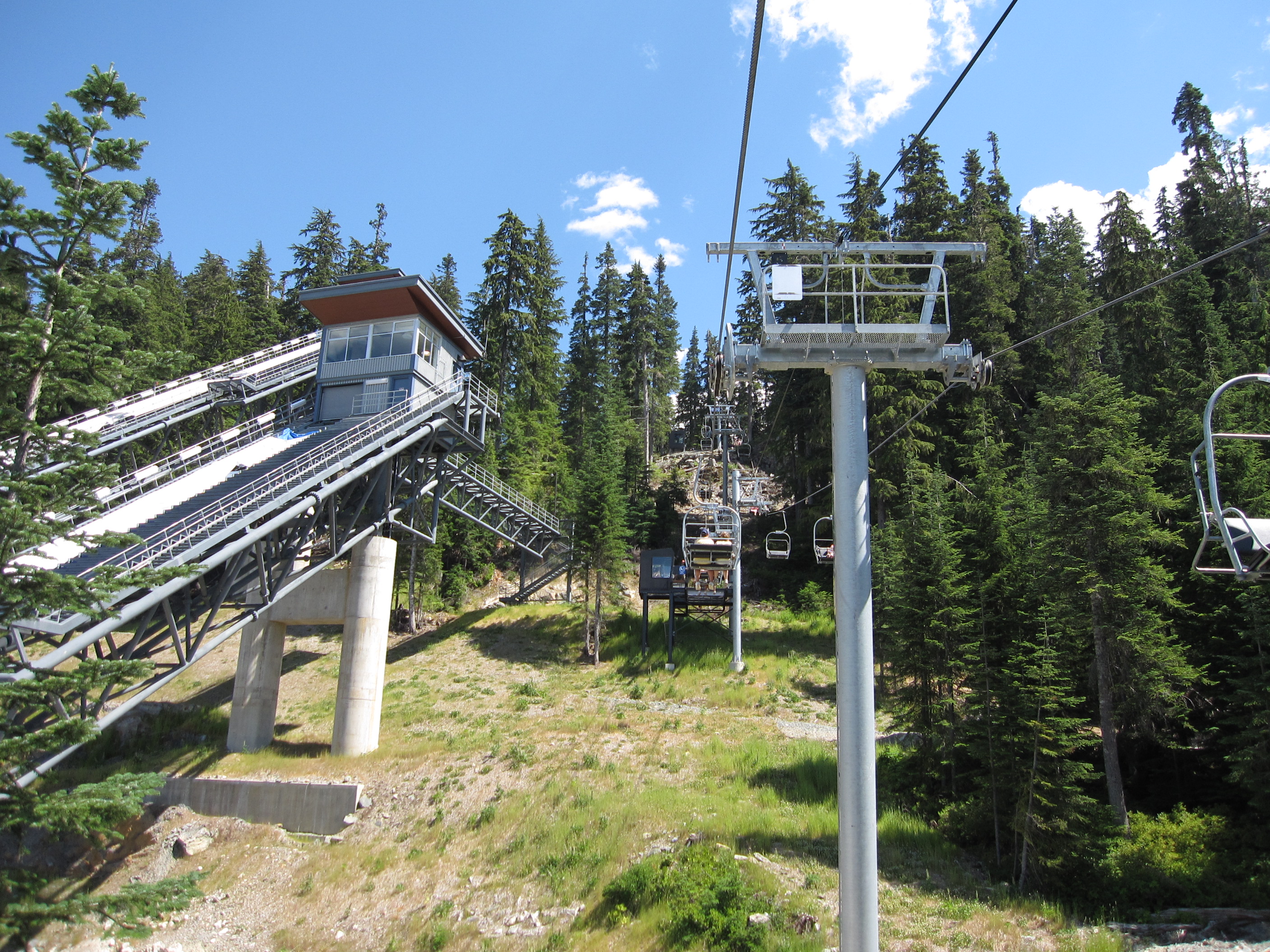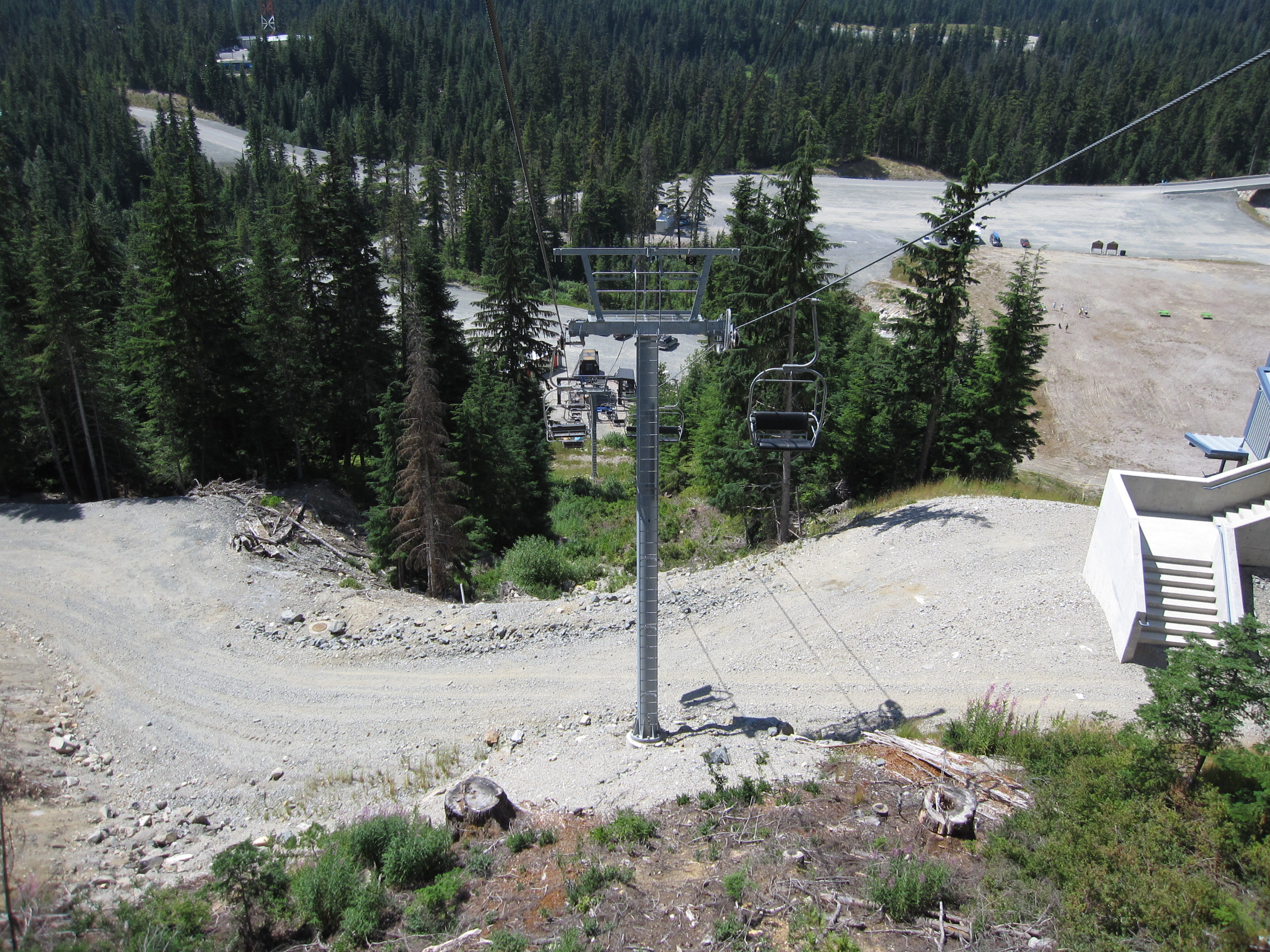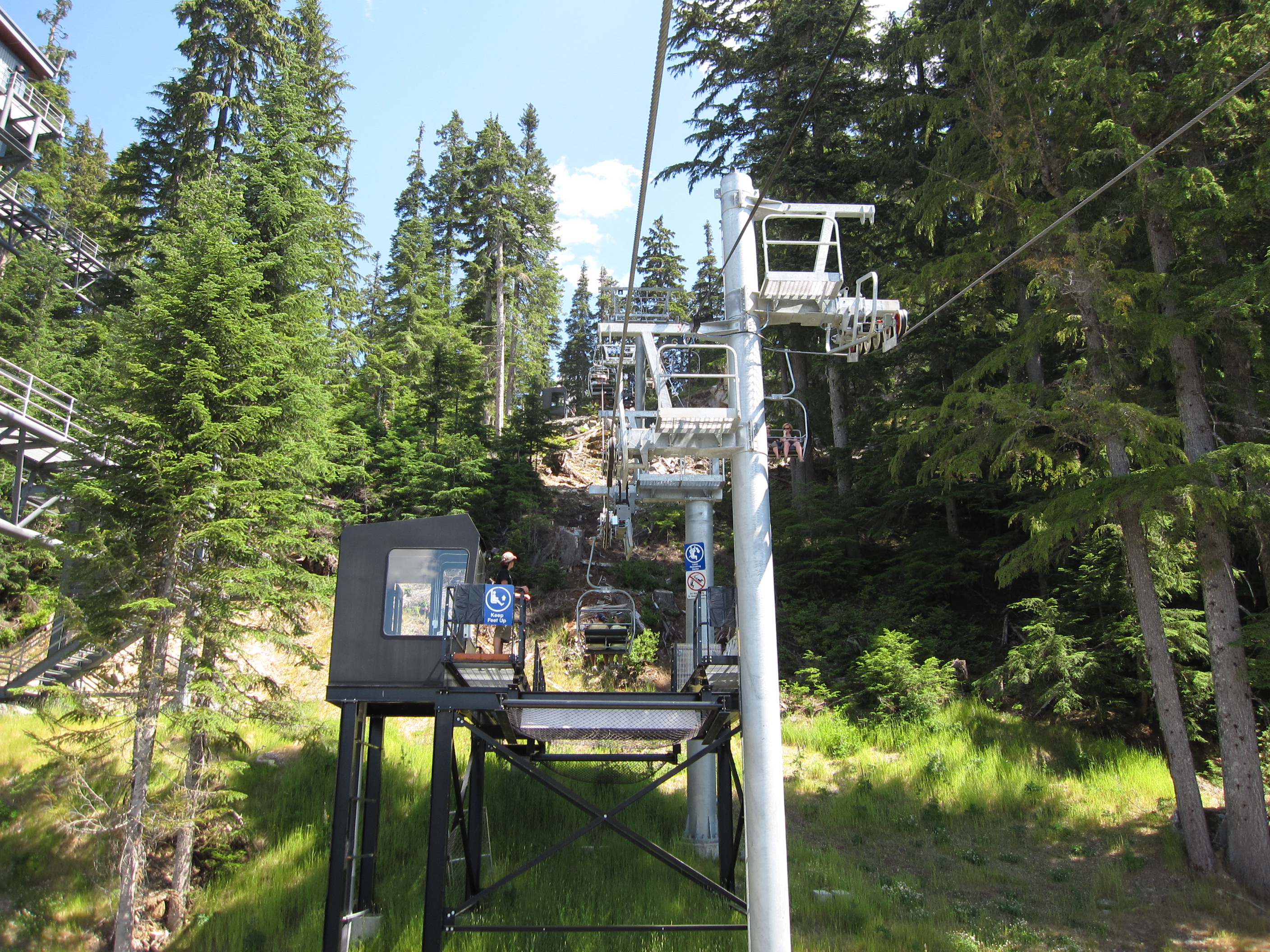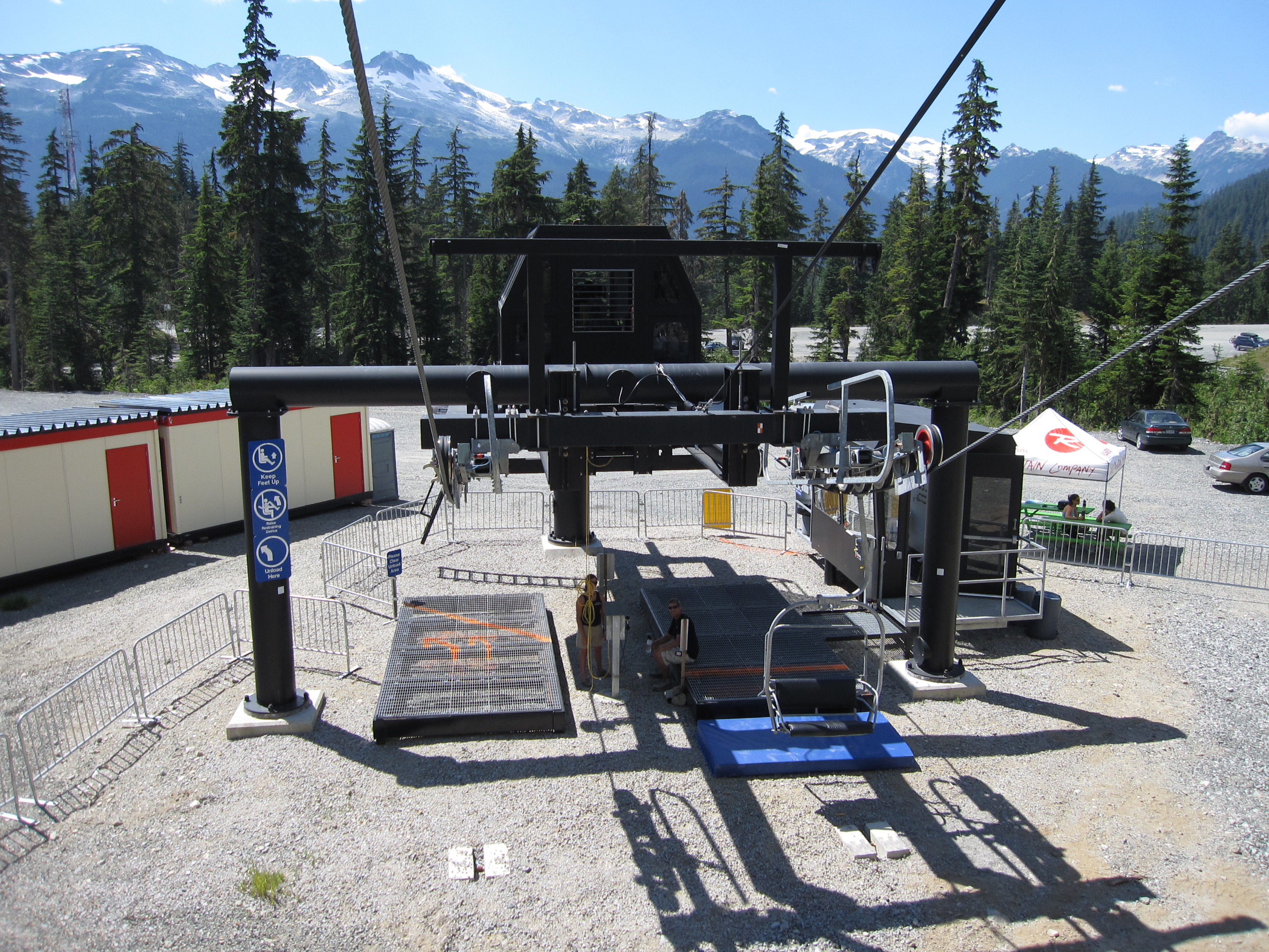 Doppelmayr CTEC Sprint drive terminal with hydraulic tensioning.Side view of the base station.Riding up in the summer.This lift serves both of the ski jumps with a mid-station unload for the smaller jump.Approaching the mid-unload.Half tower.Upper portion of the line.Top bullwheel and lift shack.Fixed bullwheel.Leaving the summit looking back.View down to the base.Bottom station from above.Doppelmayr Worldbook entry.