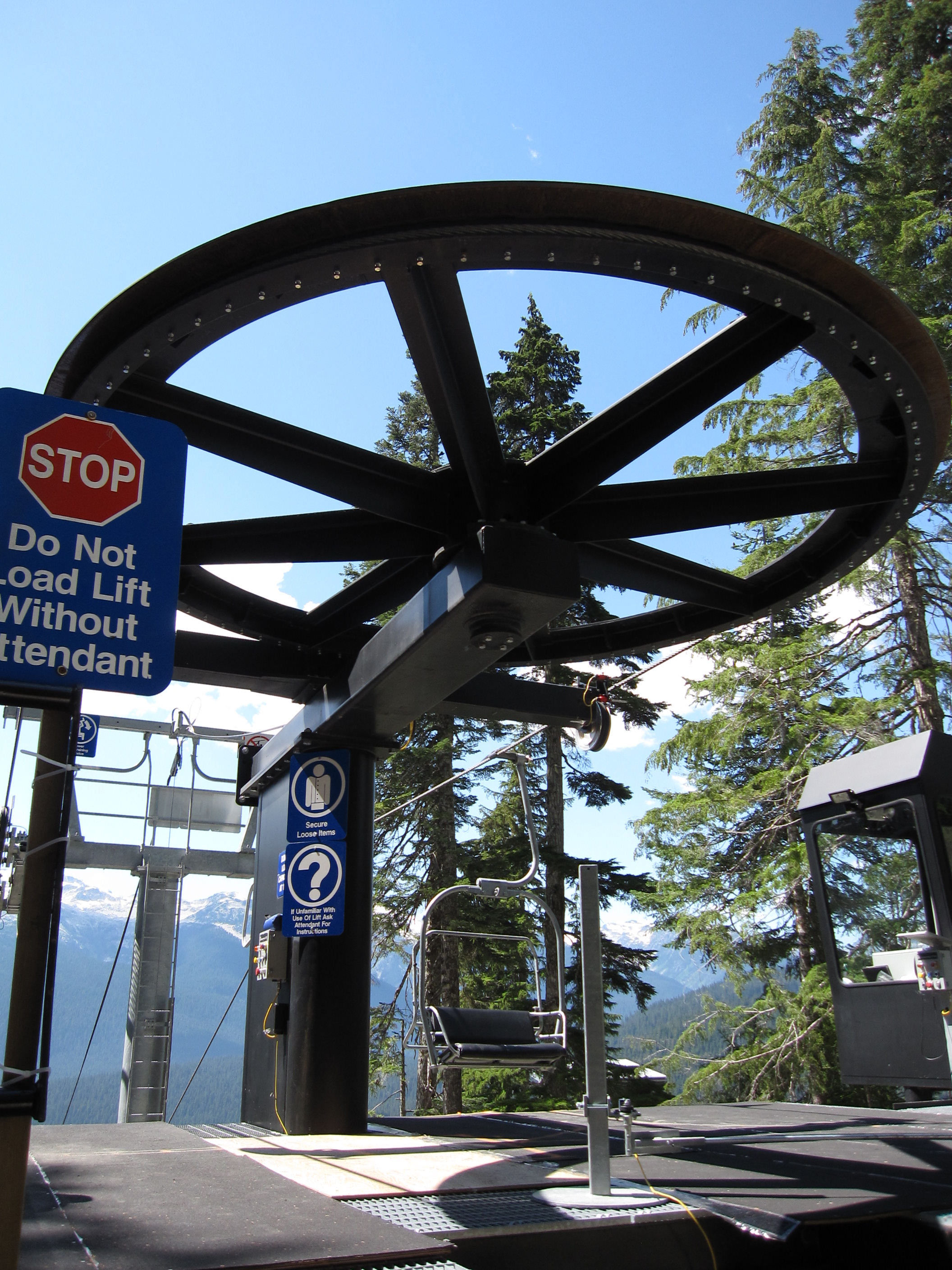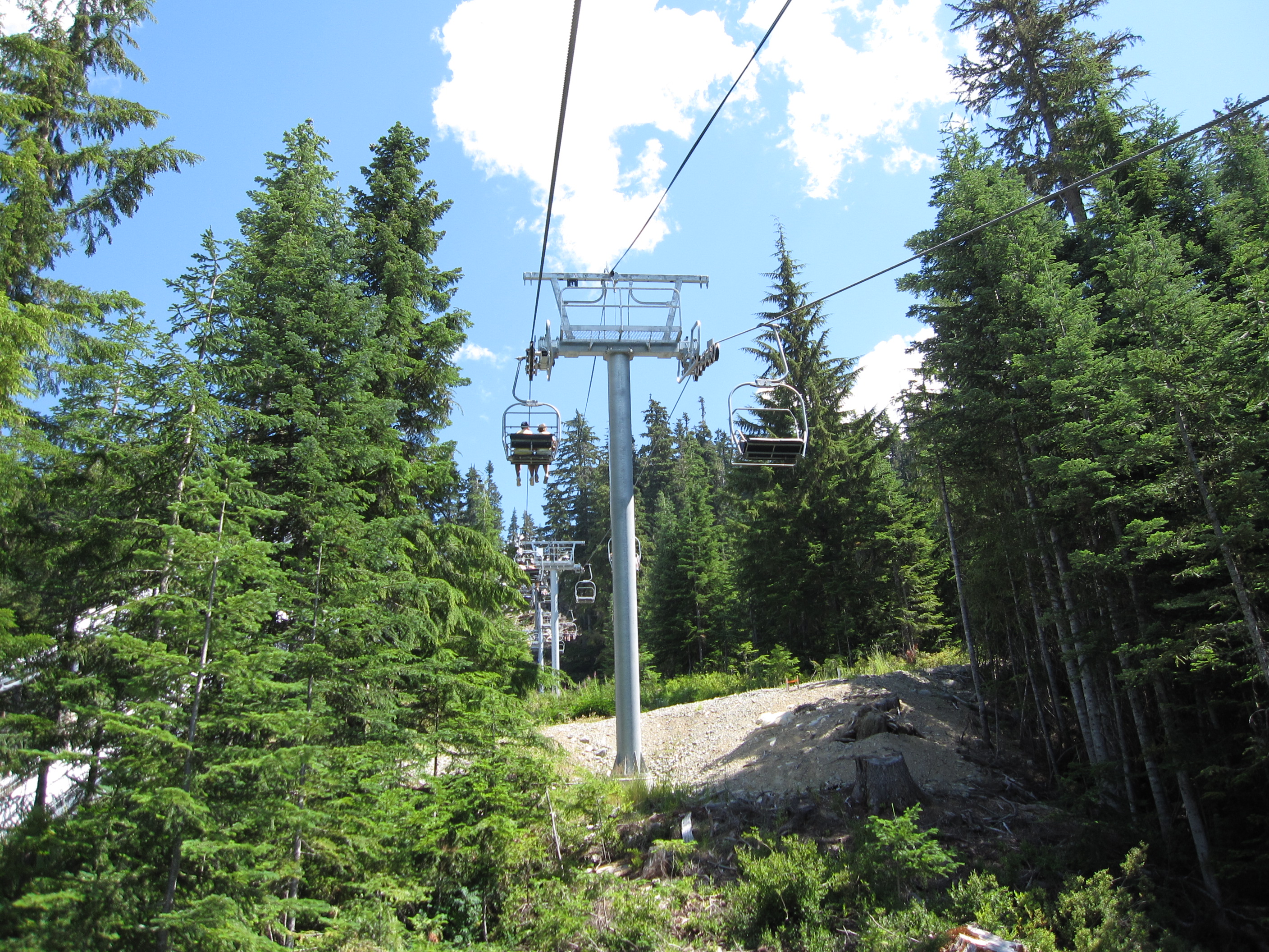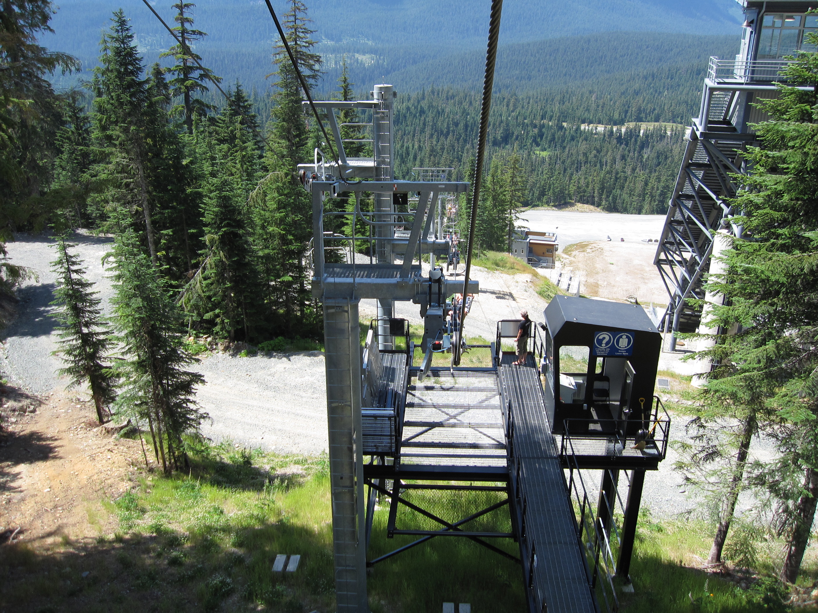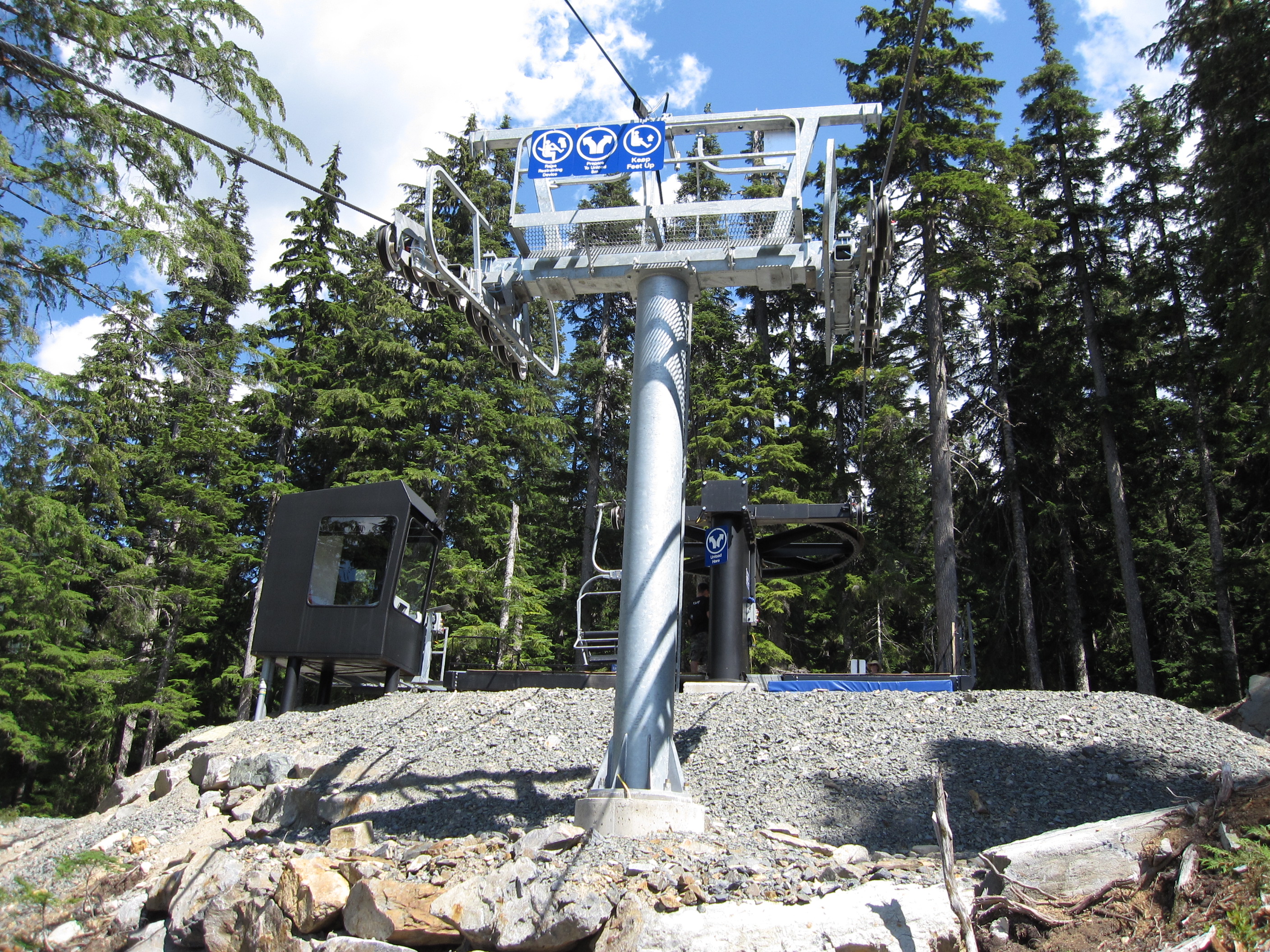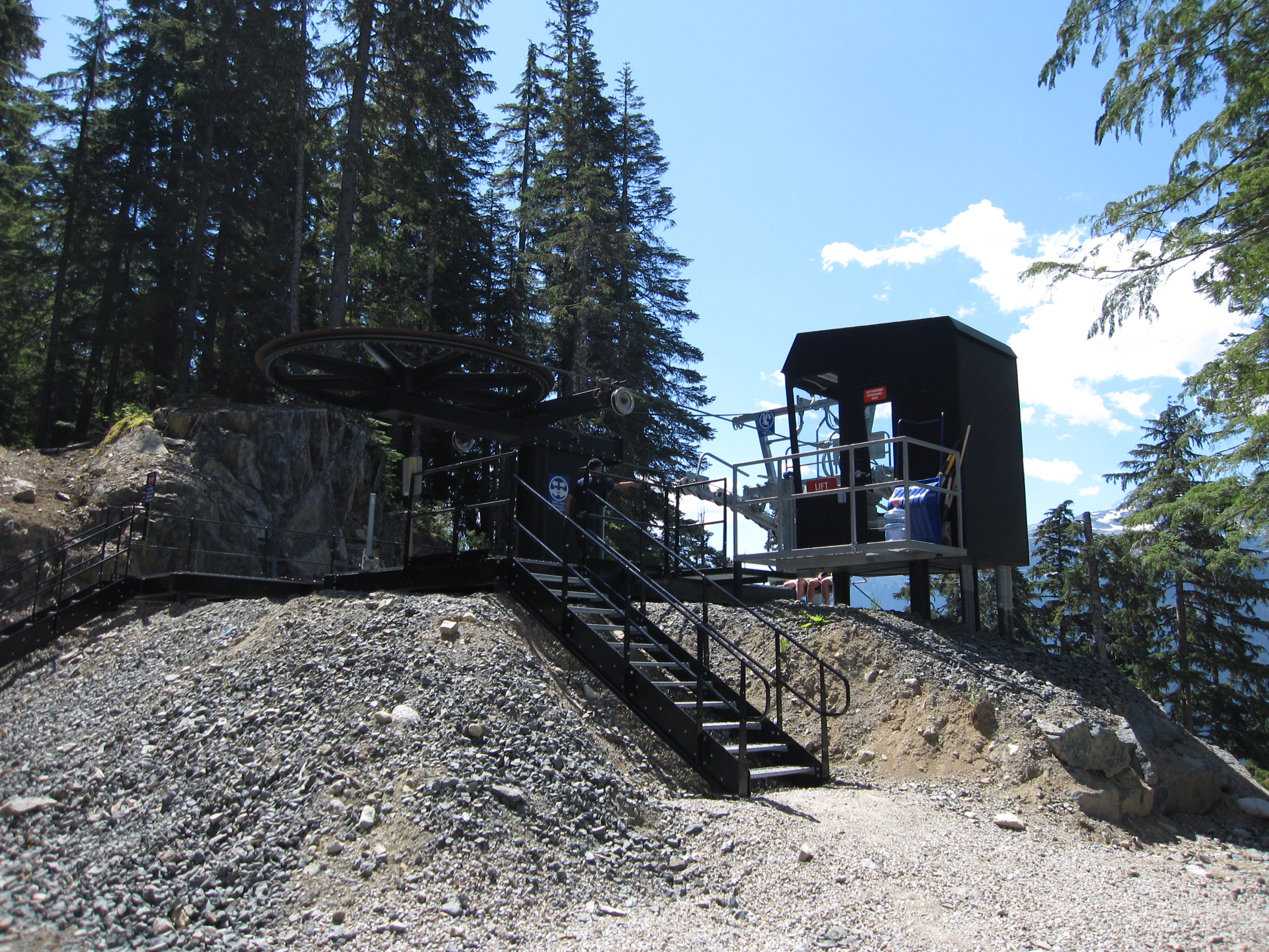 Doppelmayr CTEC Sprint drive terminal with hydraulic tensioning.Side view of the base station.Riding up in the summer.This lift serves both of the ski jumps with a mid-station unload for the smaller jump.Approaching the mid-unload.Half tower.Upper portion of the line.Top bullwheel and lift shack.Fixed bullwheel.Leaving the summit looking back.View down to the base.Bottom station from above.Doppelmayr Worldbook entry.