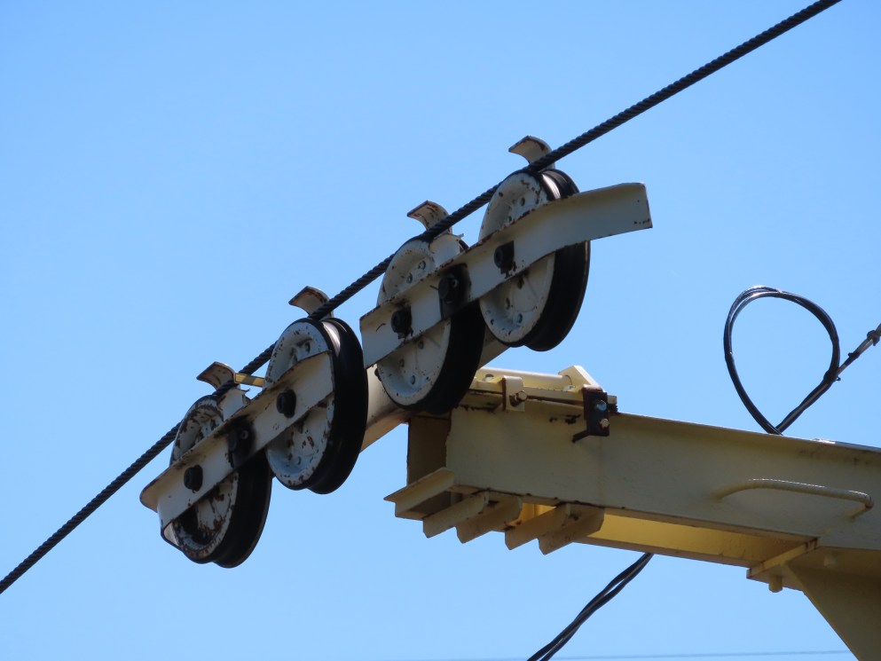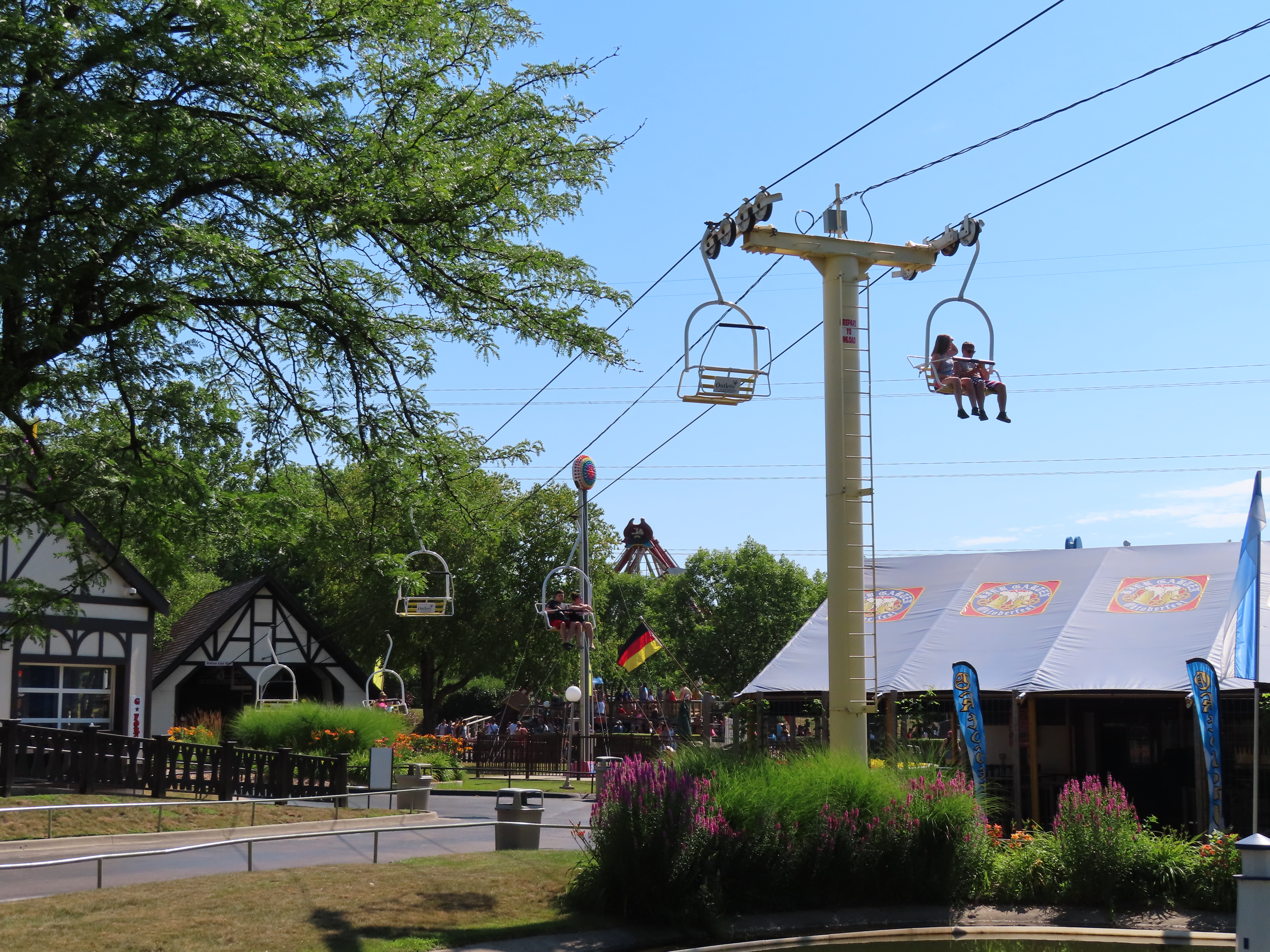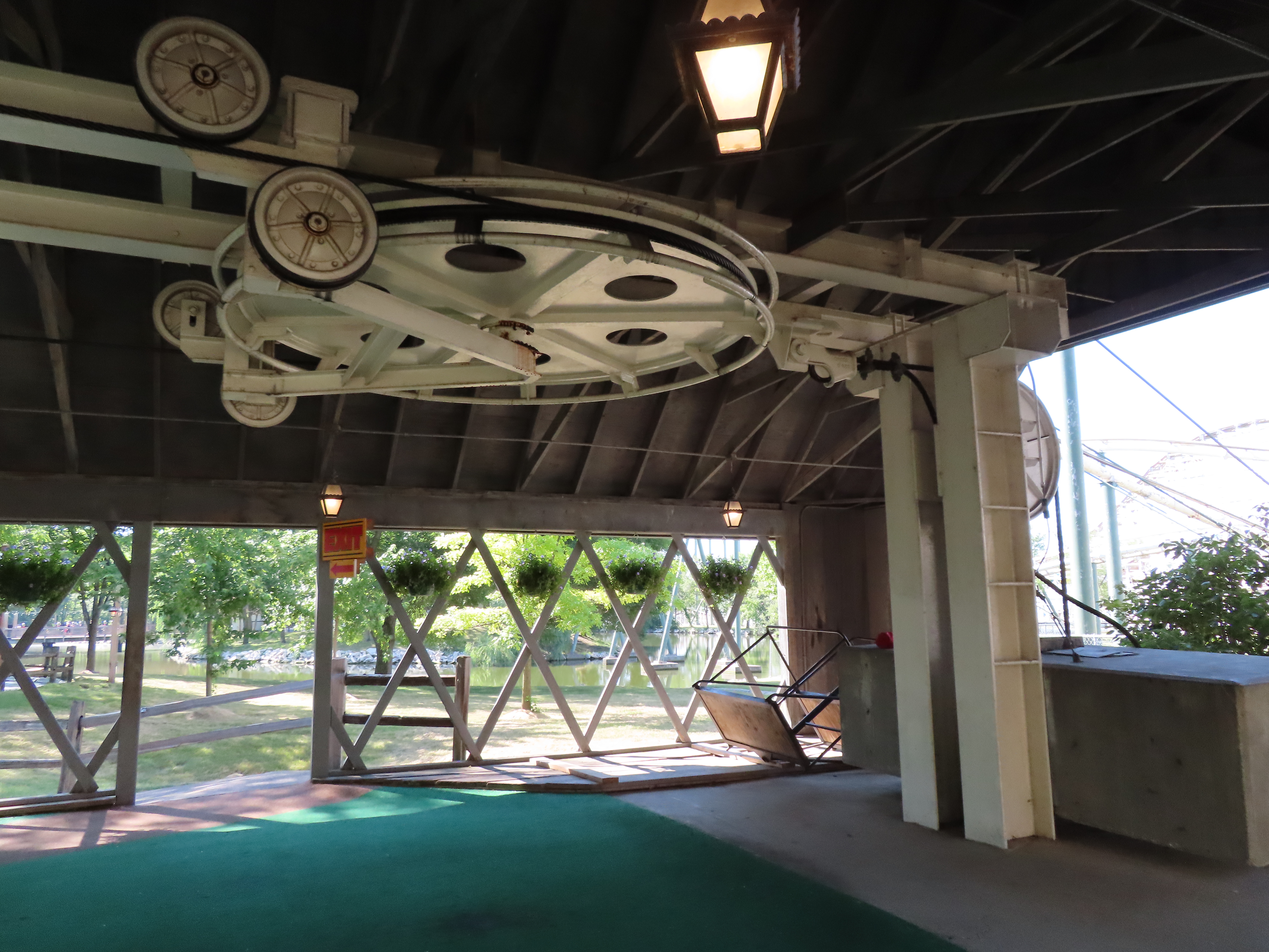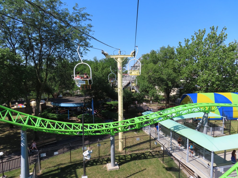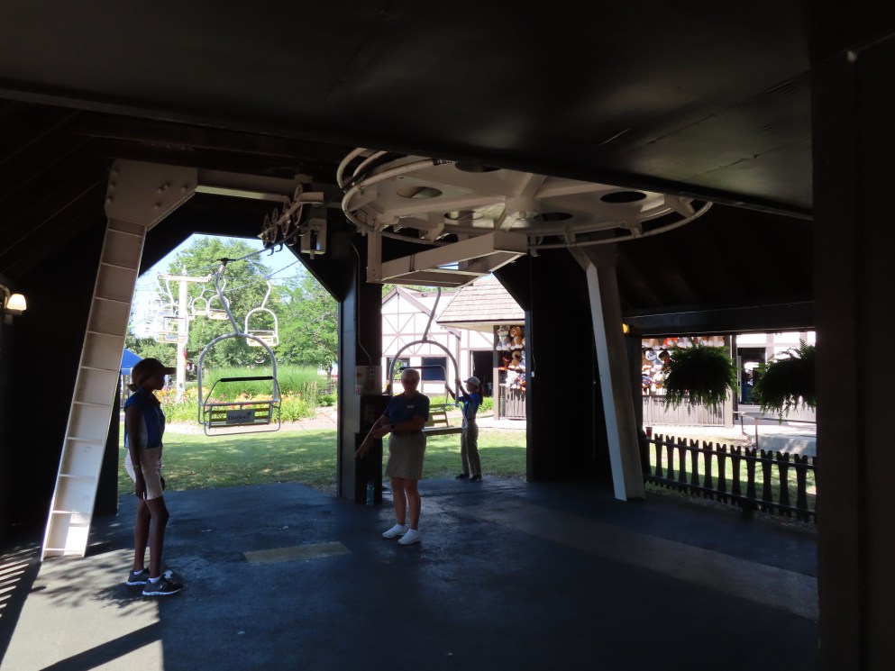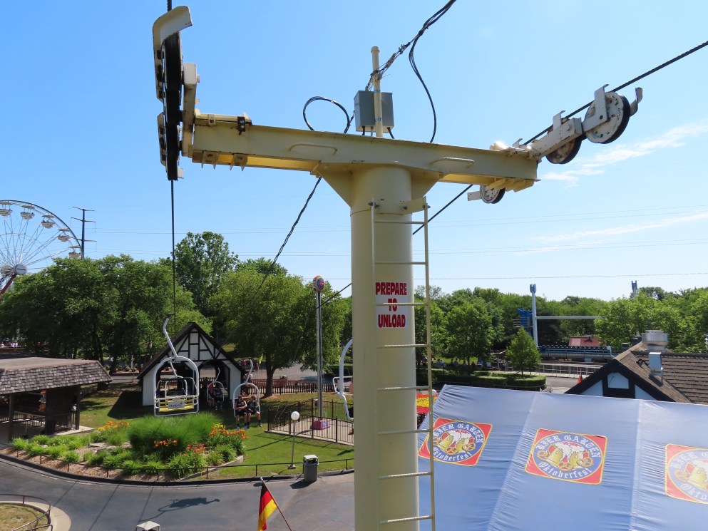 This SLI double apparently came used from the World’s Fair in Spokane, Washington.A sheave assembly.Tower 1.The lift used to cross over a log flume ride and since 2016 has gone through an Infinity Coaster called The Monster.The return terminal.Tower 5.T4.Inside the drive terminal.It appears this lift changes gauge going into the stations.Riding through The Monster.Middle part of the lift line.T5.View of the roller coaster section.The return terminal with tensioning.Counterweight and bullwheel.Station inside a small building.Side view of the tension return station.T6.Tower 5.The coaster crosses over the lift three times and under five.Threading the needle near tower 4.The top of T3.Tower 2.Near the drive station.Alpine-themed station building.View from the lift.Drive bullwheel.The smaller of the two station buildings.