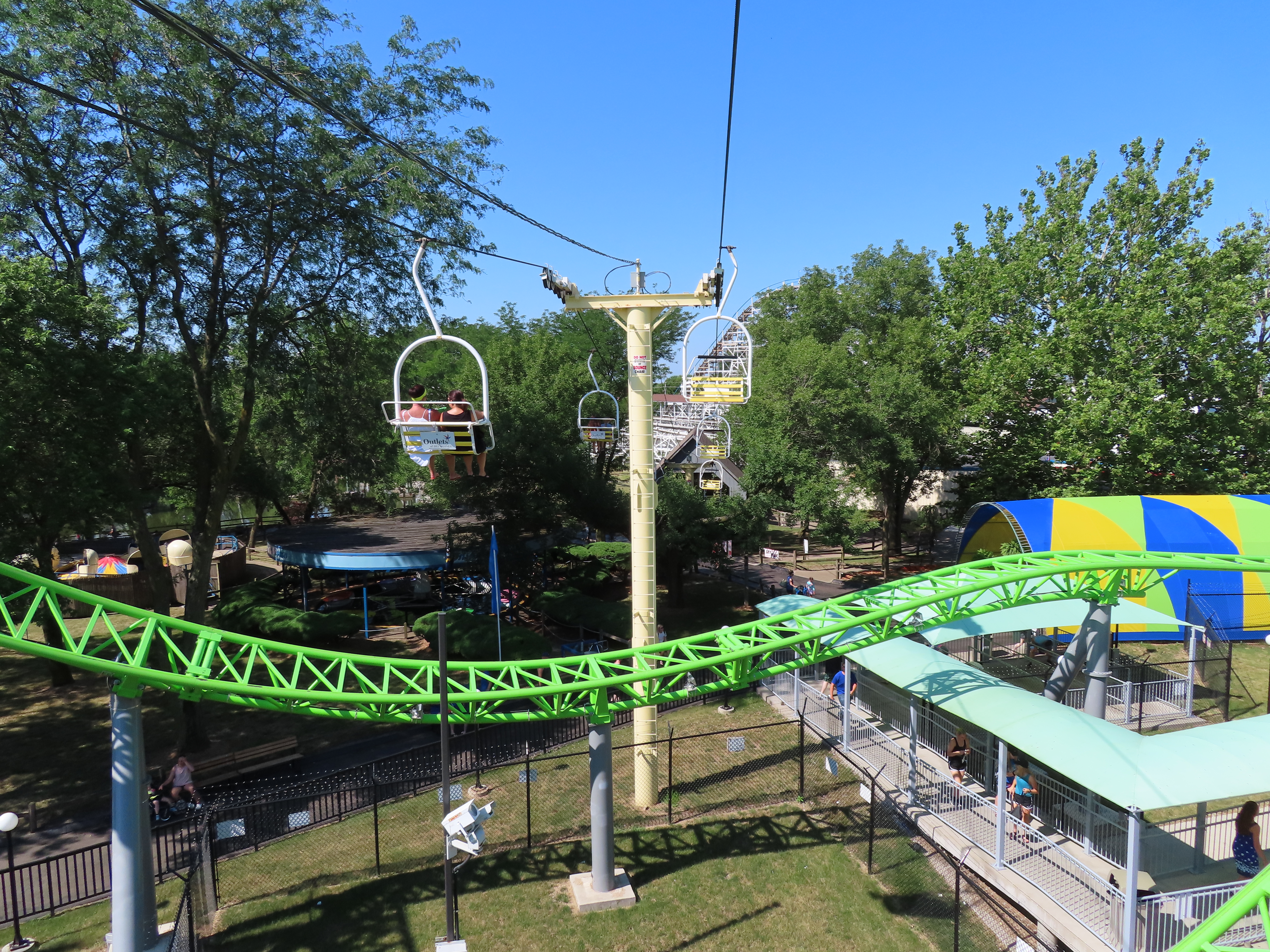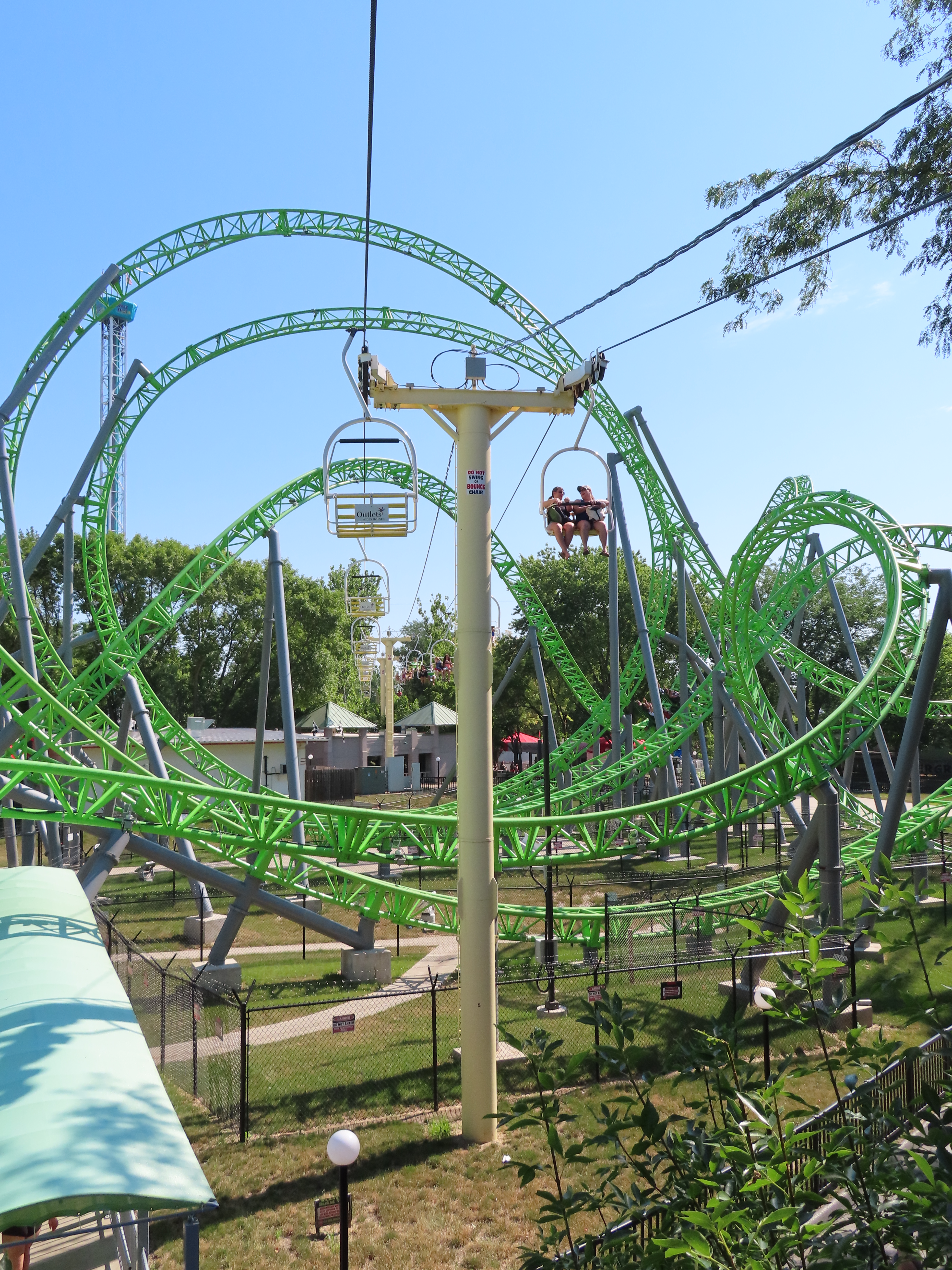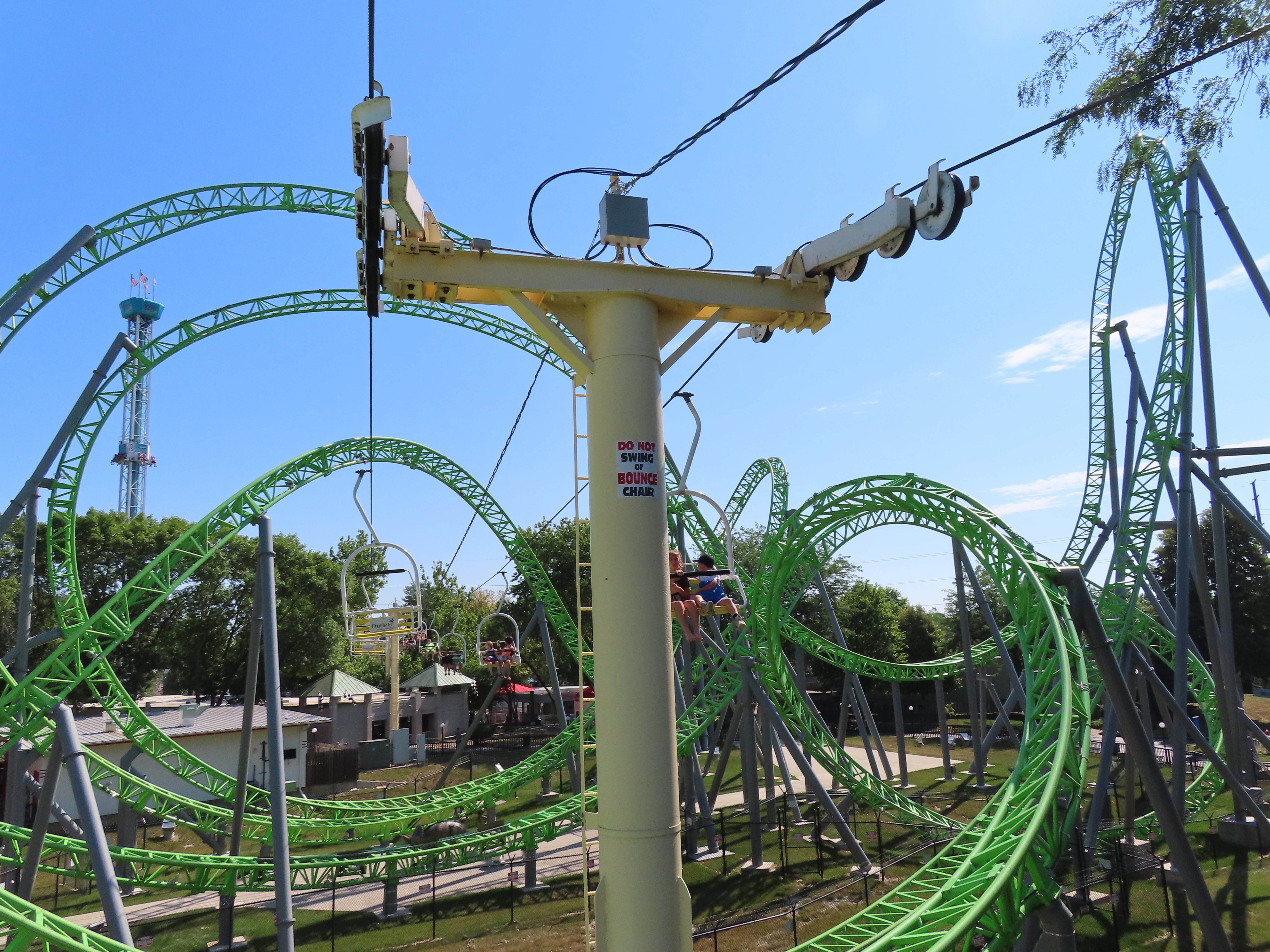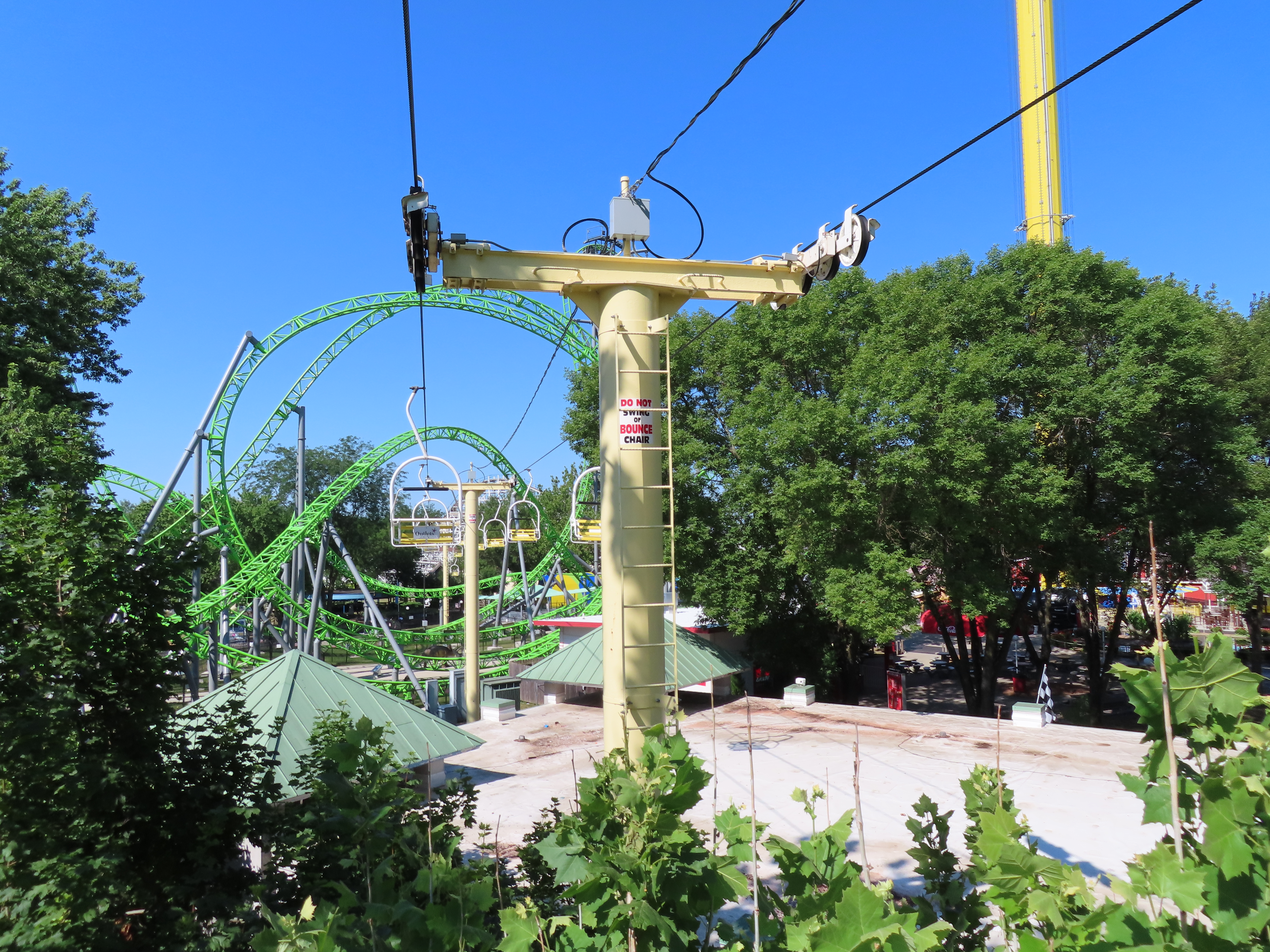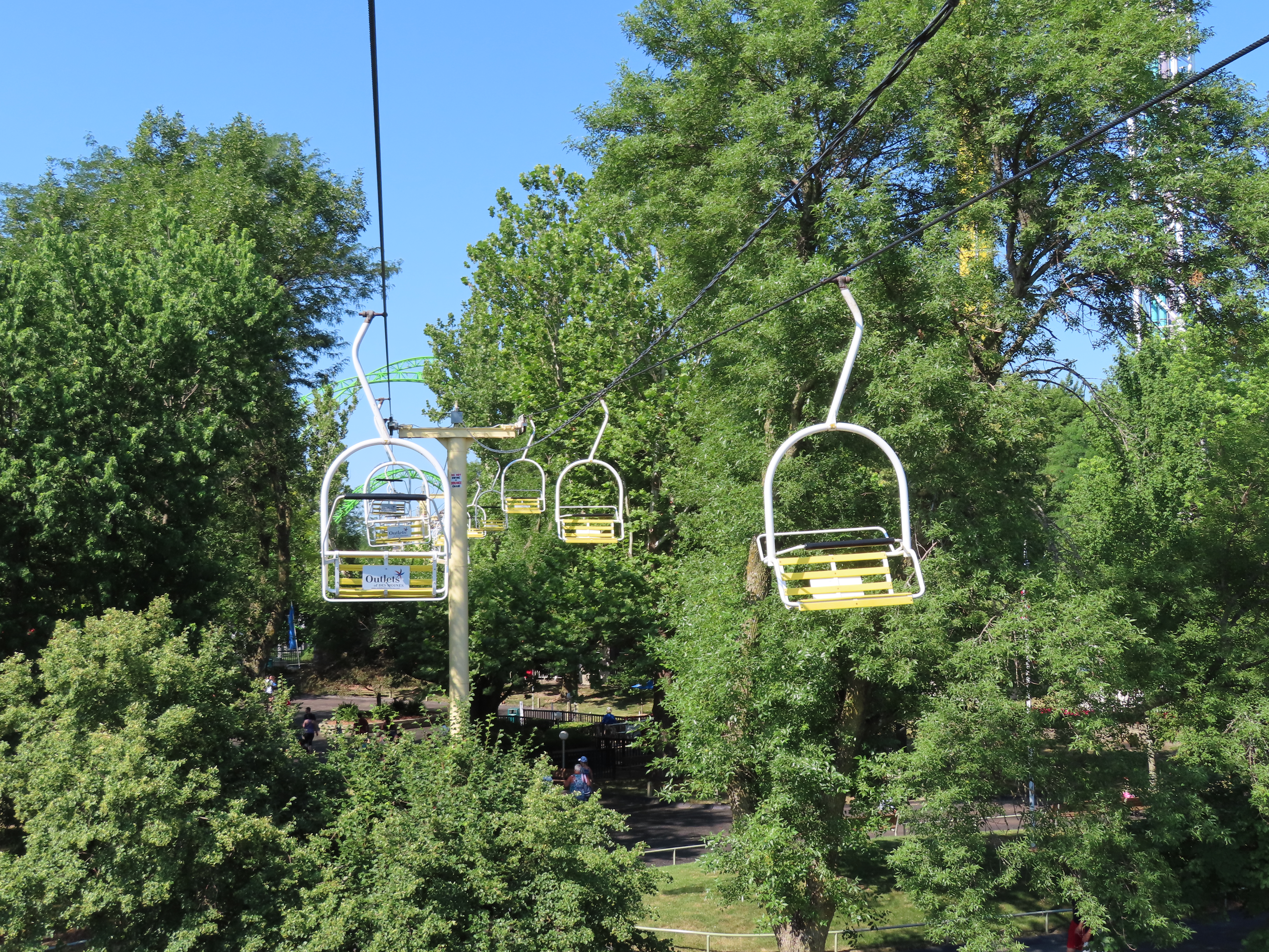 This SLI double apparently came used from the World’s Fair in Spokane, Washington.A sheave assembly.Tower 1.The lift used to cross over a log flume ride and since 2016 has gone through an Infinity Coaster called The Monster.The return terminal.Tower 5.T4.Inside the drive terminal.It appears this lift changes gauge going into the stations.Riding through The Monster.Middle part of the lift line.T5.View of the roller coaster section.The return terminal with tensioning.Counterweight and bullwheel.Station inside a small building.Side view of the tension return station.T6.Tower 5.The coaster crosses over the lift three times and under five.Threading the needle near tower 4.The top of T3.Tower 2.Near the drive station.Alpine-themed station building.View from the lift.Drive bullwheel.The smaller of the two station buildings.