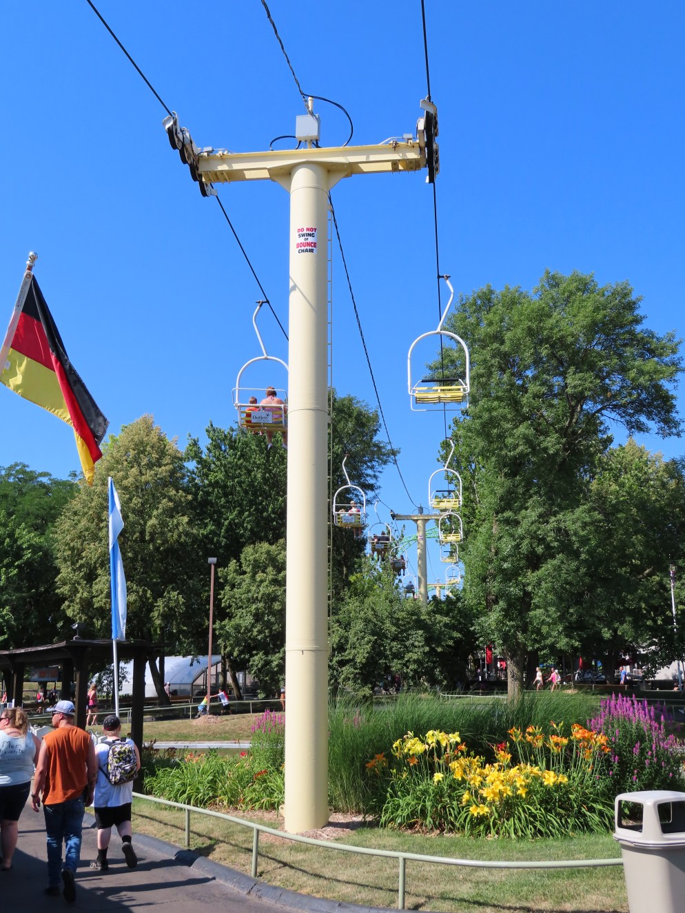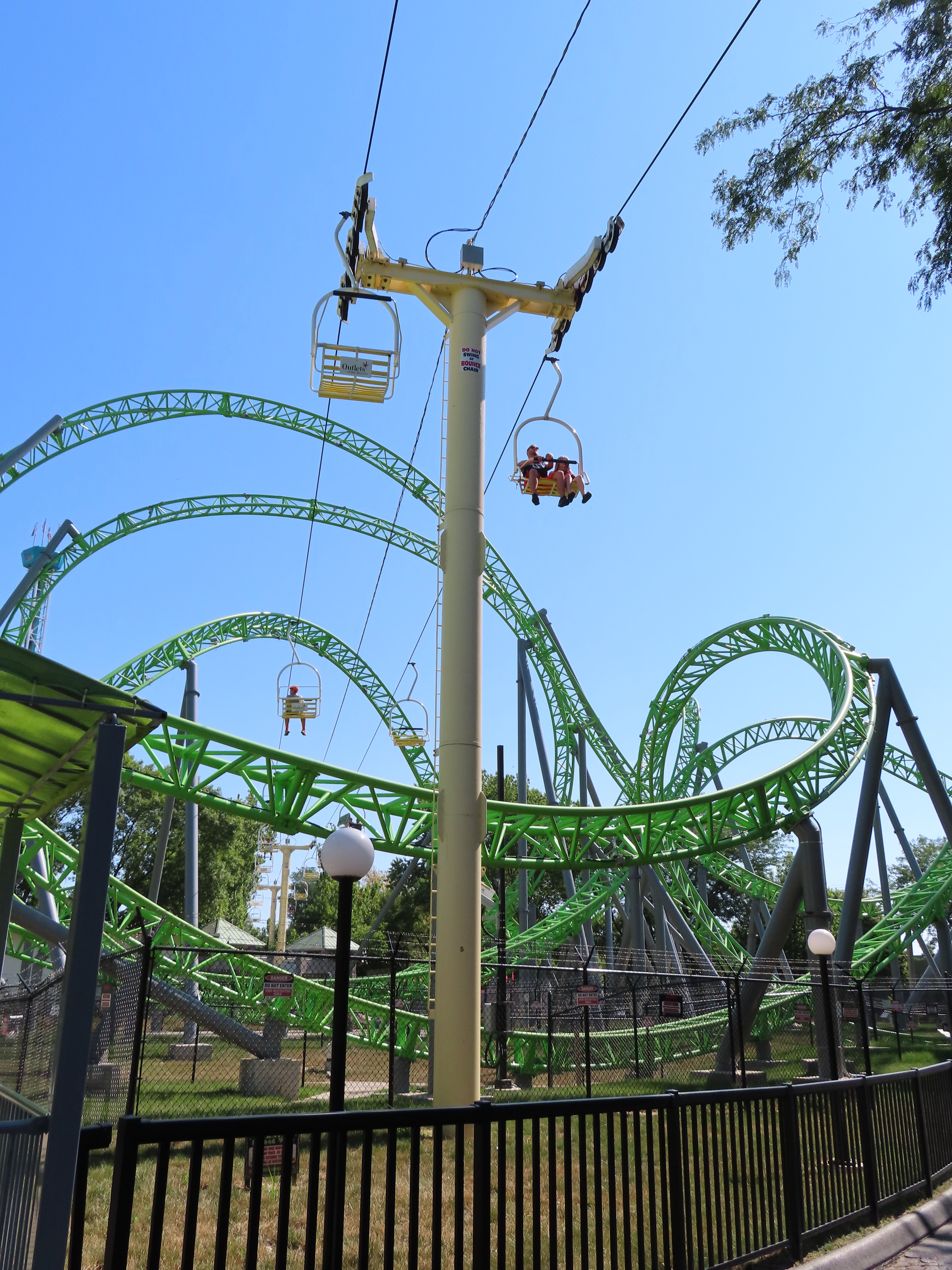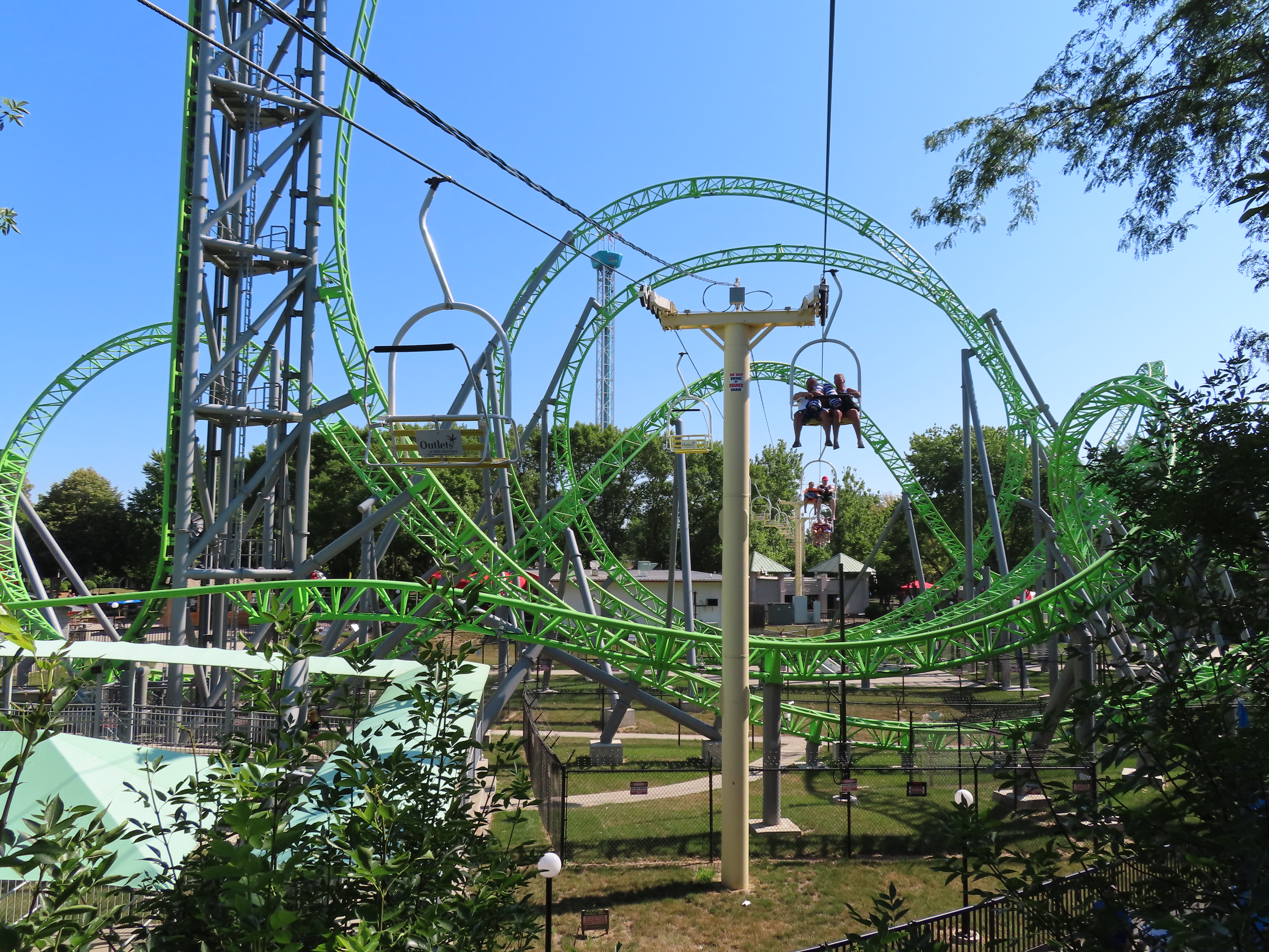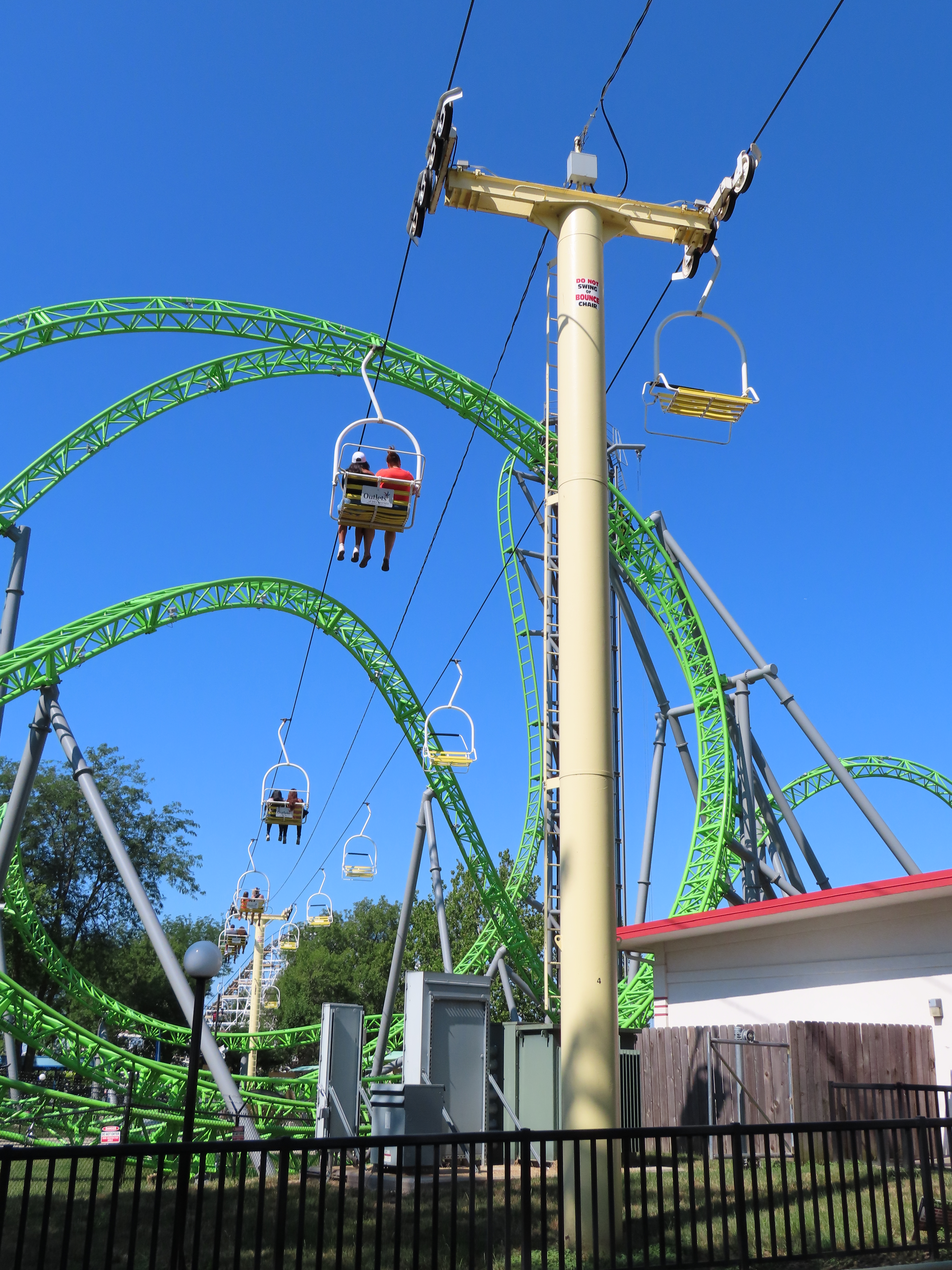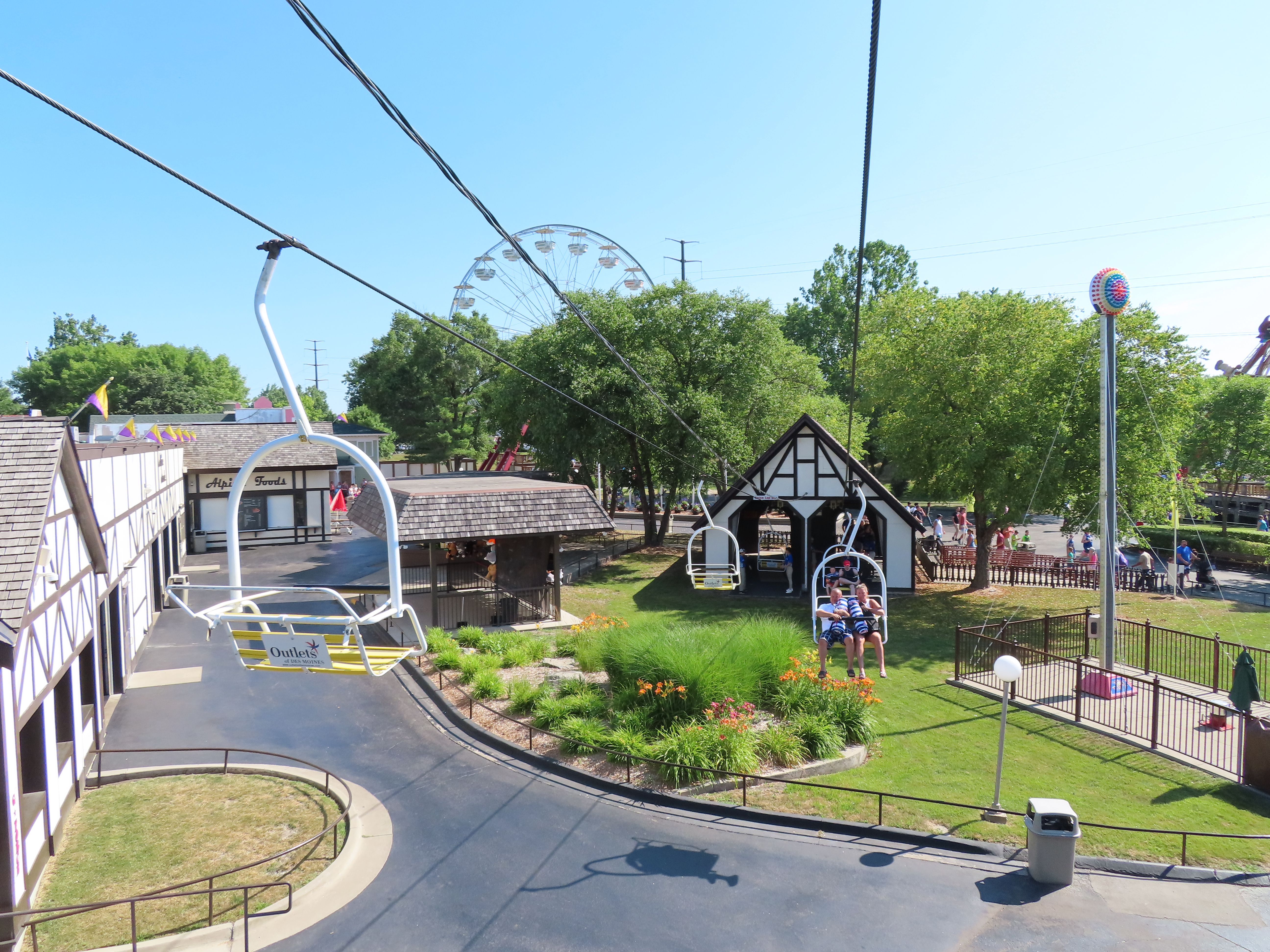 This SLI double apparently came used from the World’s Fair in Spokane, Washington.A sheave assembly.Tower 1.The lift used to cross over a log flume ride and since 2016 has gone through an Infinity Coaster called The Monster.The return terminal.Tower 5.T4.Inside the drive terminal.It appears this lift changes gauge going into the stations.Riding through The Monster.Middle part of the lift line.T5.View of the roller coaster section.The return terminal with tensioning.Counterweight and bullwheel.Station inside a small building.Side view of the tension return station.T6.Tower 5.The coaster crosses over the lift three times and under five.Threading the needle near tower 4.The top of T3.Tower 2.Near the drive station.Alpine-themed station building.View from the lift.Drive bullwheel.The smaller of the two station buildings.