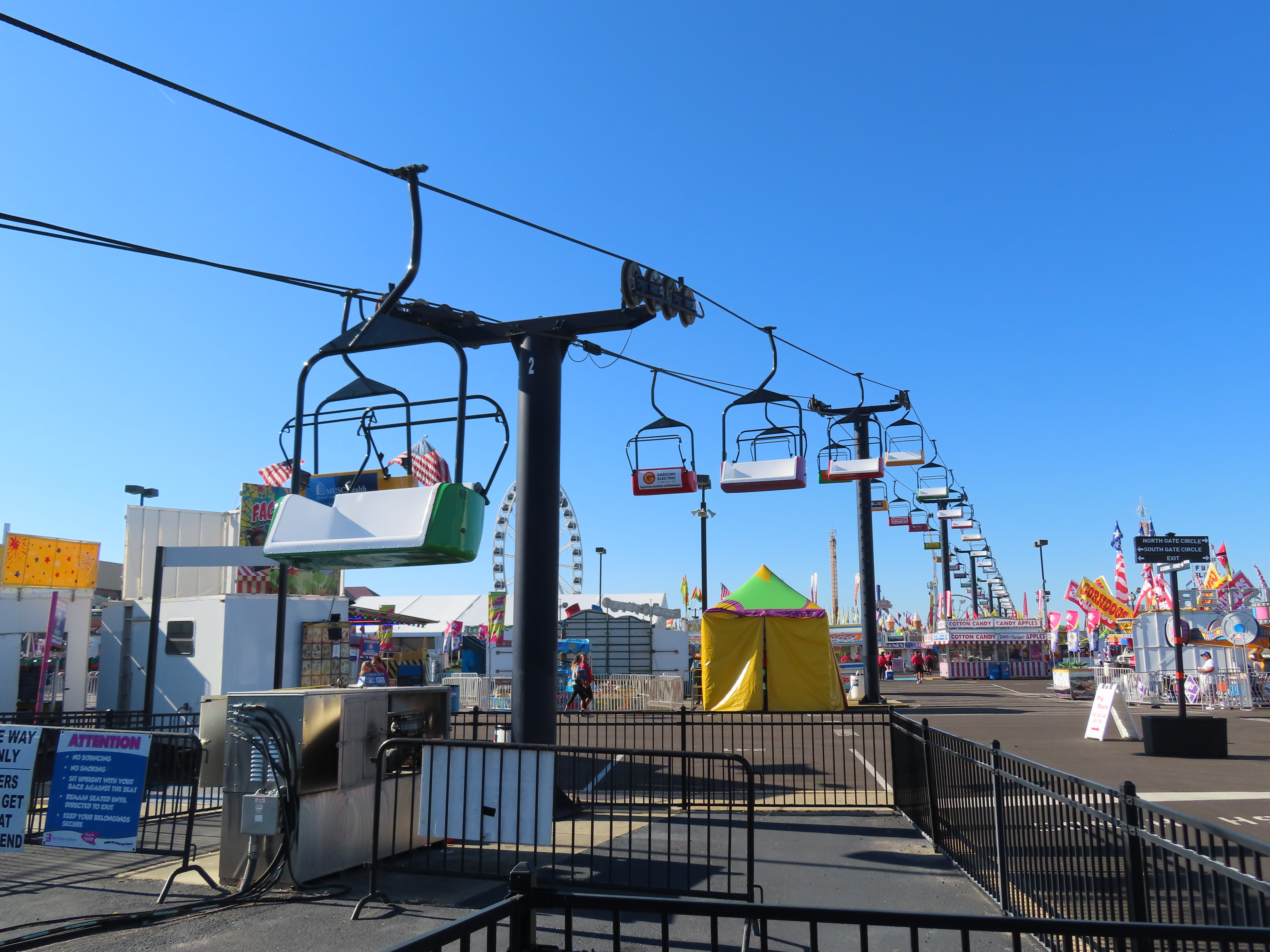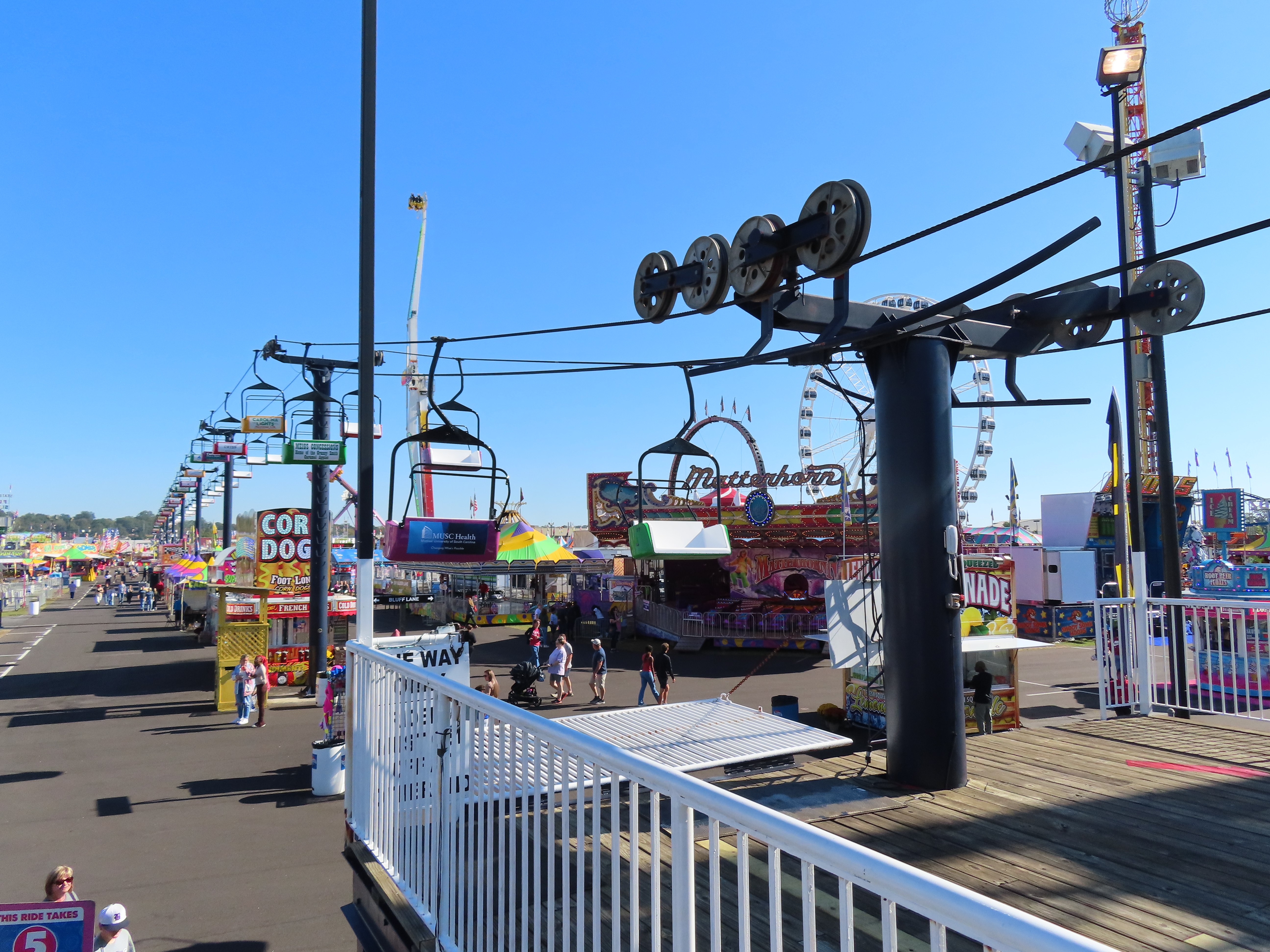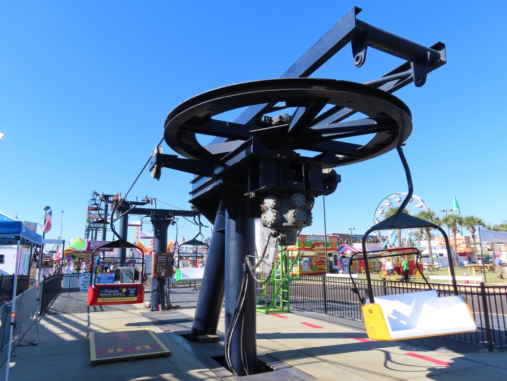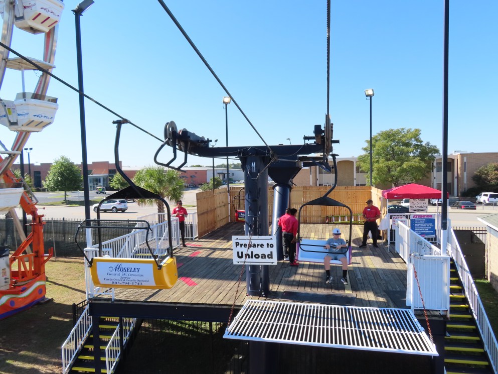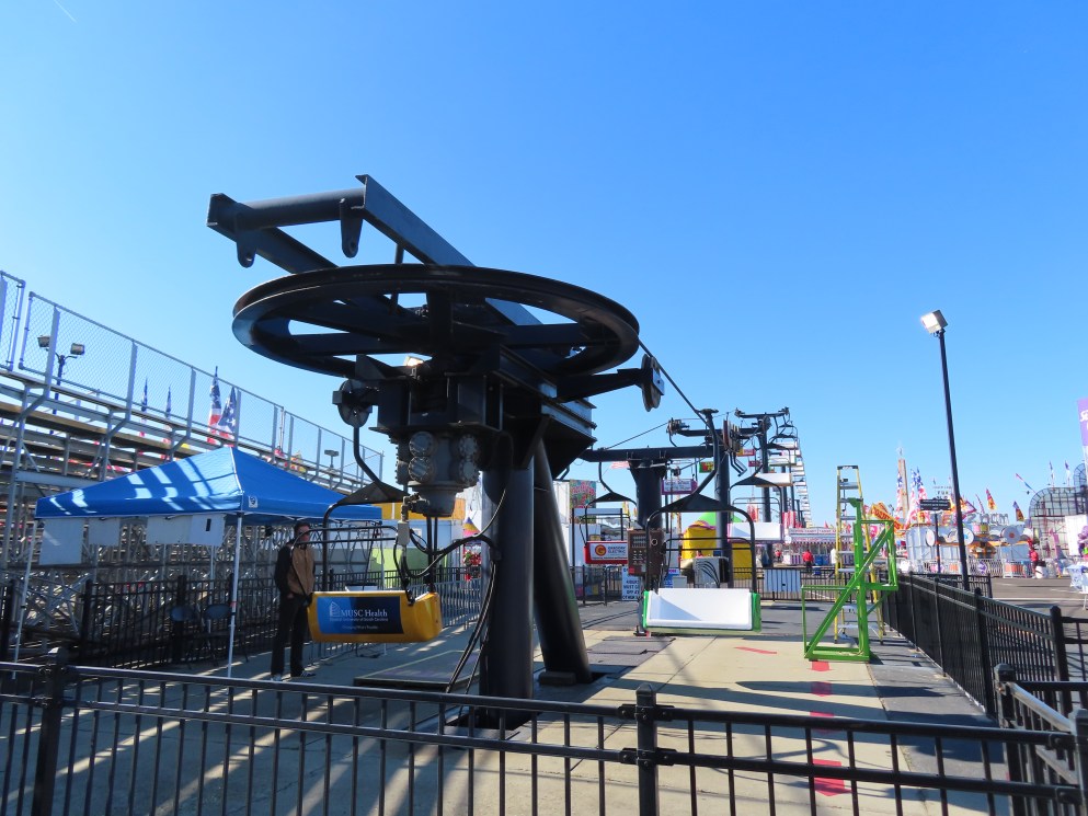 This lift runs across the midway at the South Carolina State Fair and is one of only two lifts in the state.View southwest.Tower 1.View southwest at tower 5.Lift line.Tall towers.The first few towers.The return terminal is elevated and riders load/unload on a platform.View from the return terminal.The drive station loading area.Drive bullwheel.Another view of the drive station.Operator controls.View northeast at tower 11.The raised loading area.Tower 11.View riding toward the drive terminal.SkyTrans carrier.T4.Looking south at tower 3.Arriving at the drive terminal.