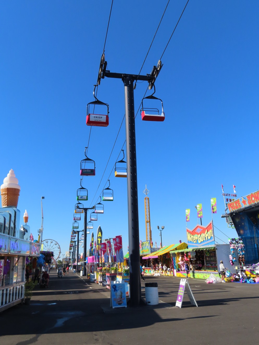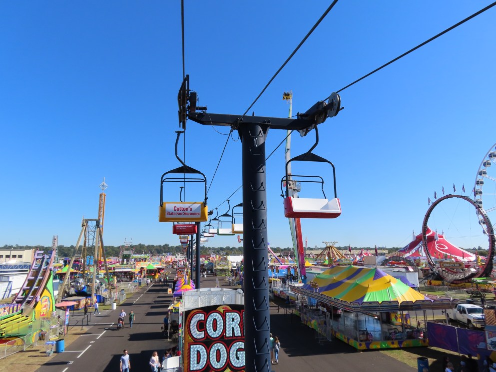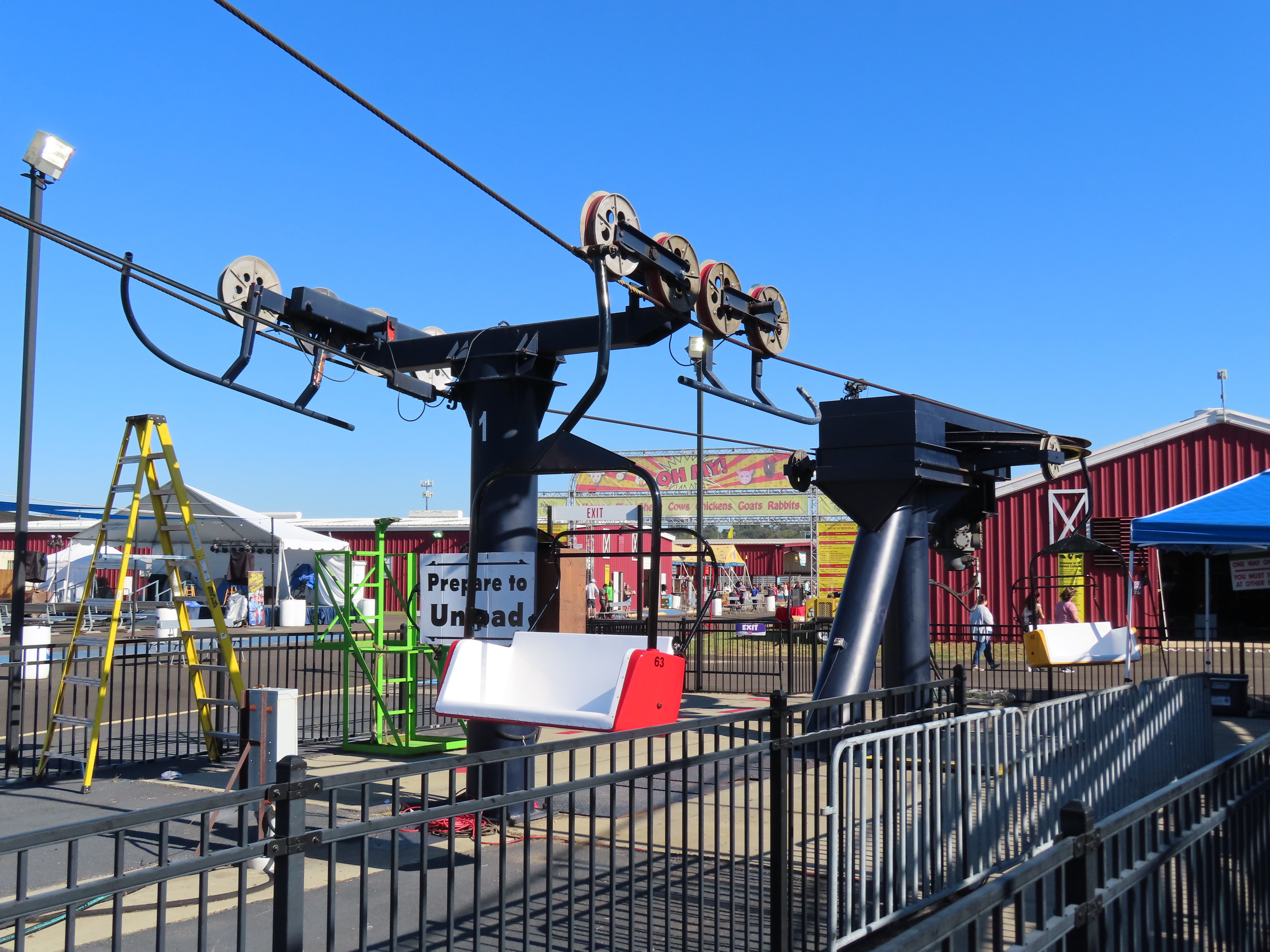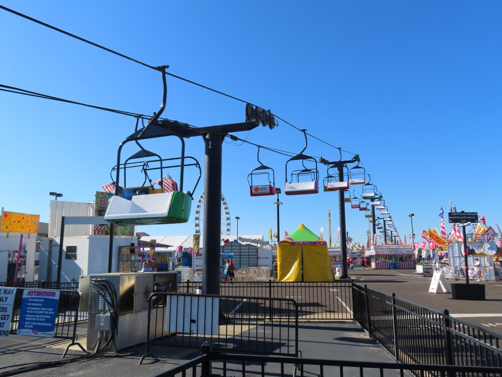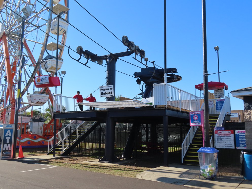This lift runs across the midway at the South Carolina State Fair and is one of only two lifts in the state.View southwest.Tower 1.View southwest at tower 5.Lift line.Tall towers.The first few towers.The return terminal is elevated and riders load/unload on a platform.View from the return terminal.The drive station loading area.Drive bullwheel.Another view of the drive station.Operator controls.View northeast at tower 11.The raised loading area.Tower 11.View riding toward the drive terminal.SkyTrans carrier.T4.Looking south at tower 3.Arriving at the drive terminal.