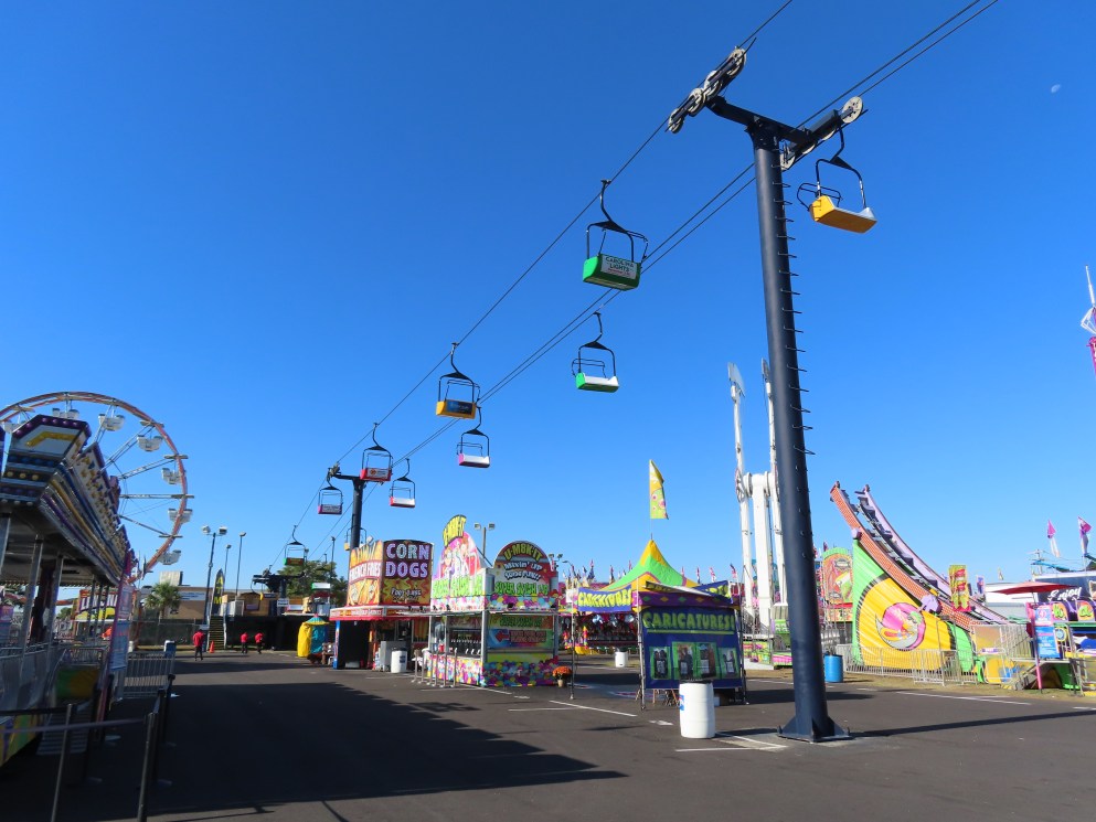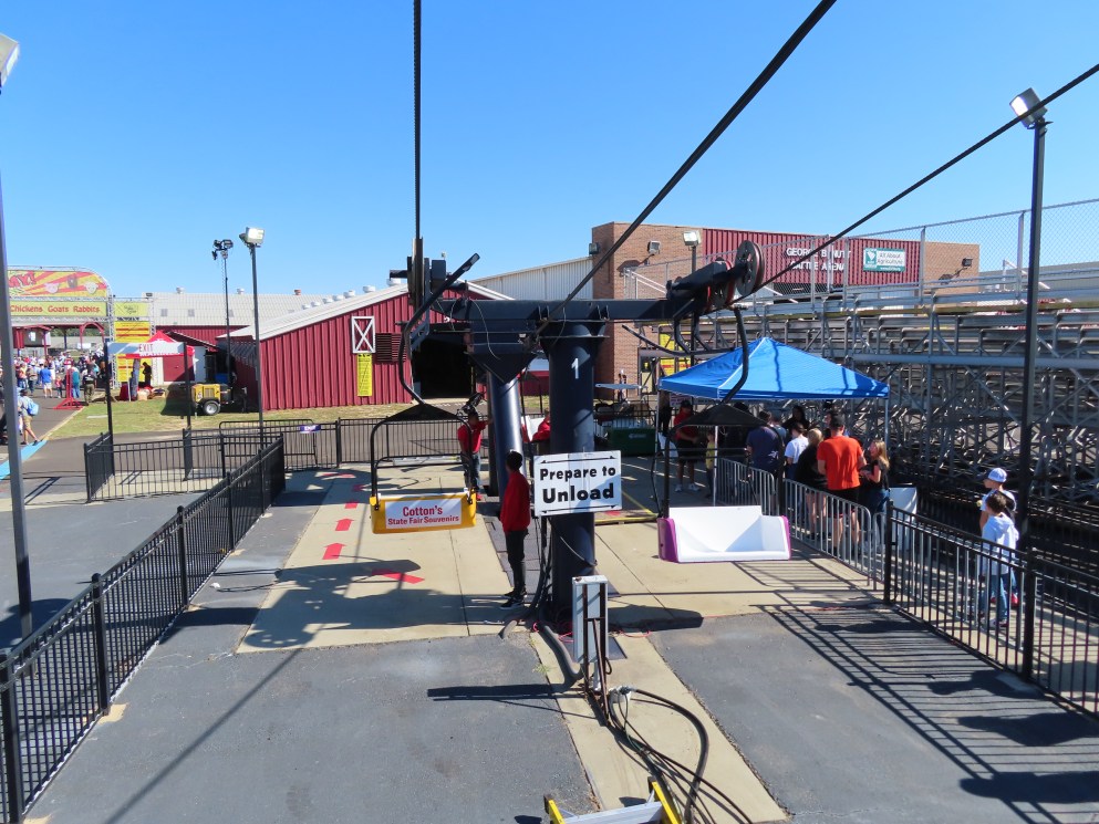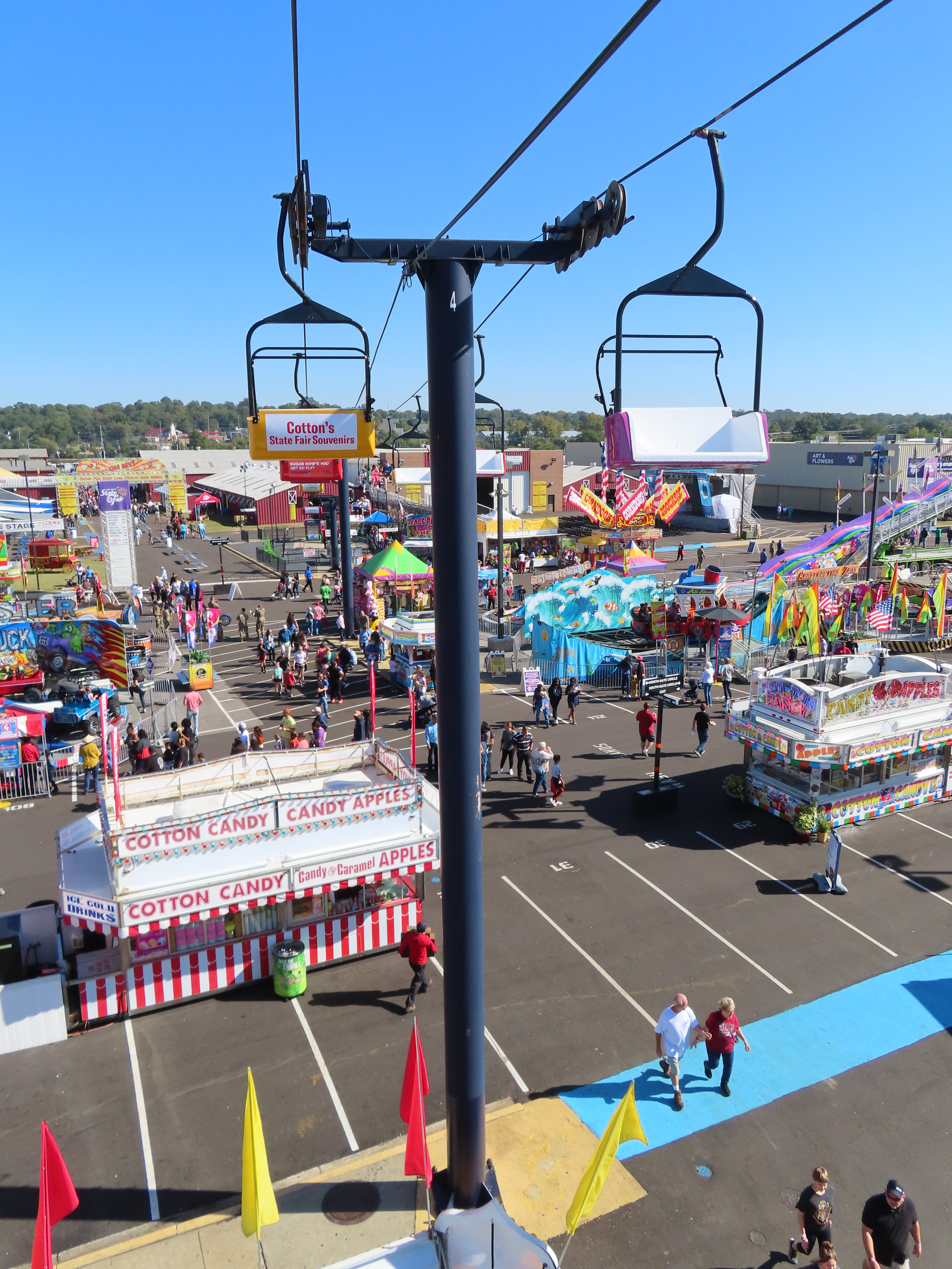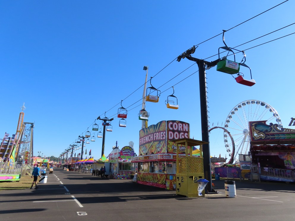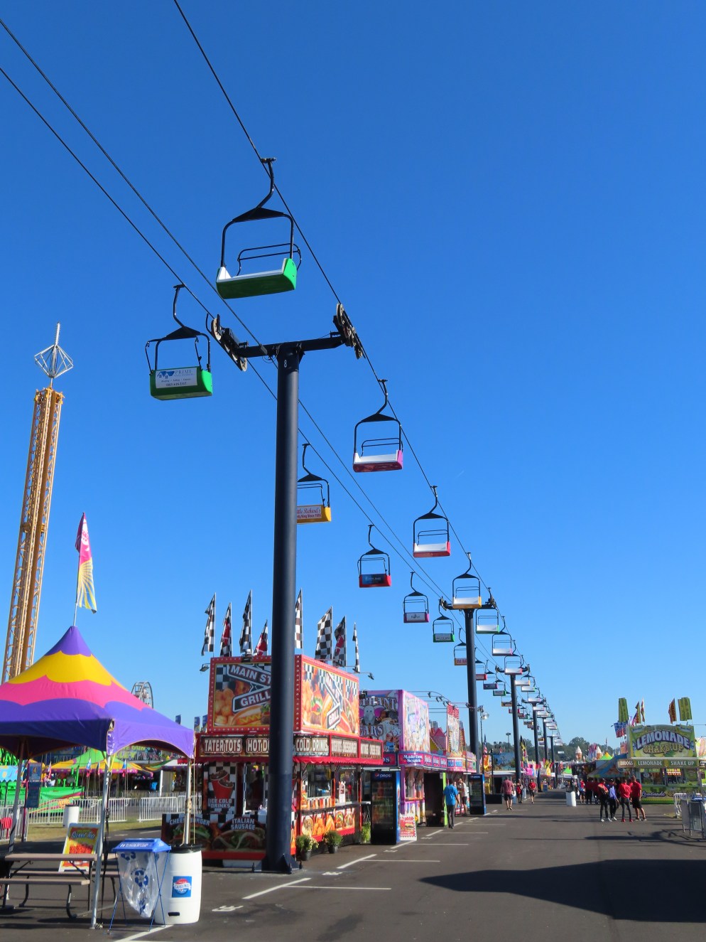 This lift runs across the midway at the South Carolina State Fair and is one of only two lifts in the state.View southwest.Tower 1.View southwest at tower 5.Lift line.Tall towers.The first few towers.The return terminal is elevated and riders load/unload on a platform.View from the return terminal.The drive station loading area.Drive bullwheel.Another view of the drive station.Operator controls.View northeast at tower 11.The raised loading area.Tower 11.View riding toward the drive terminal.SkyTrans carrier.T4.Looking south at tower 3.Arriving at the drive terminal.