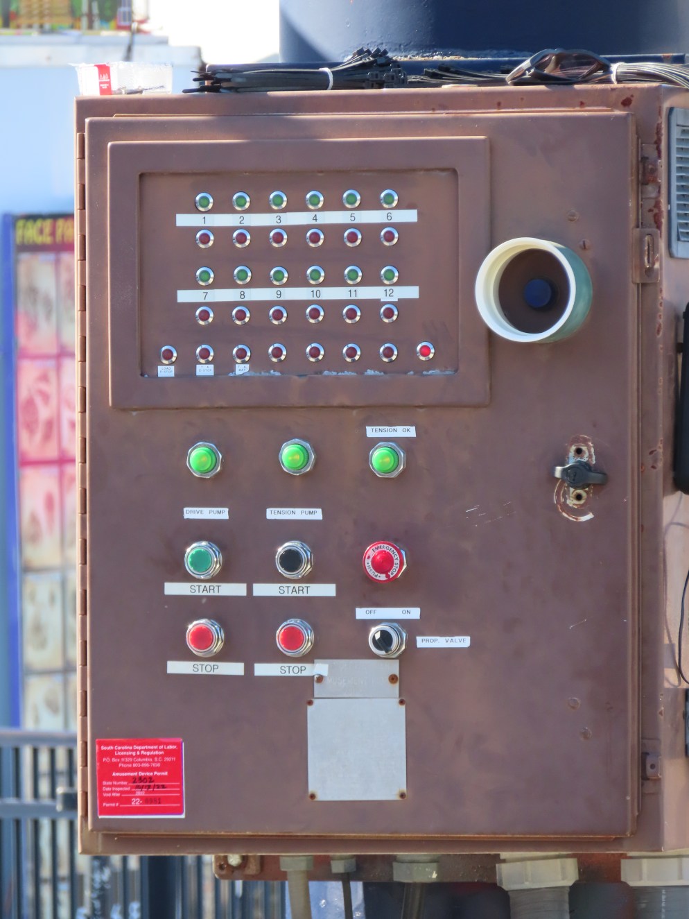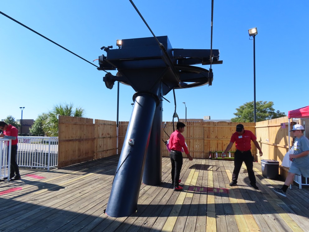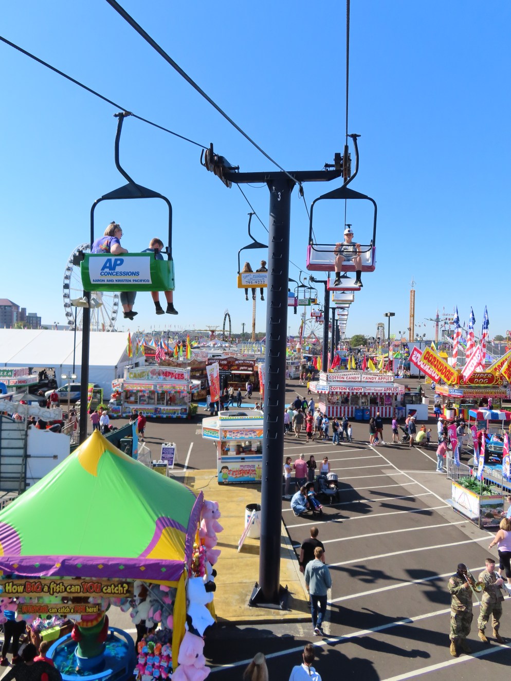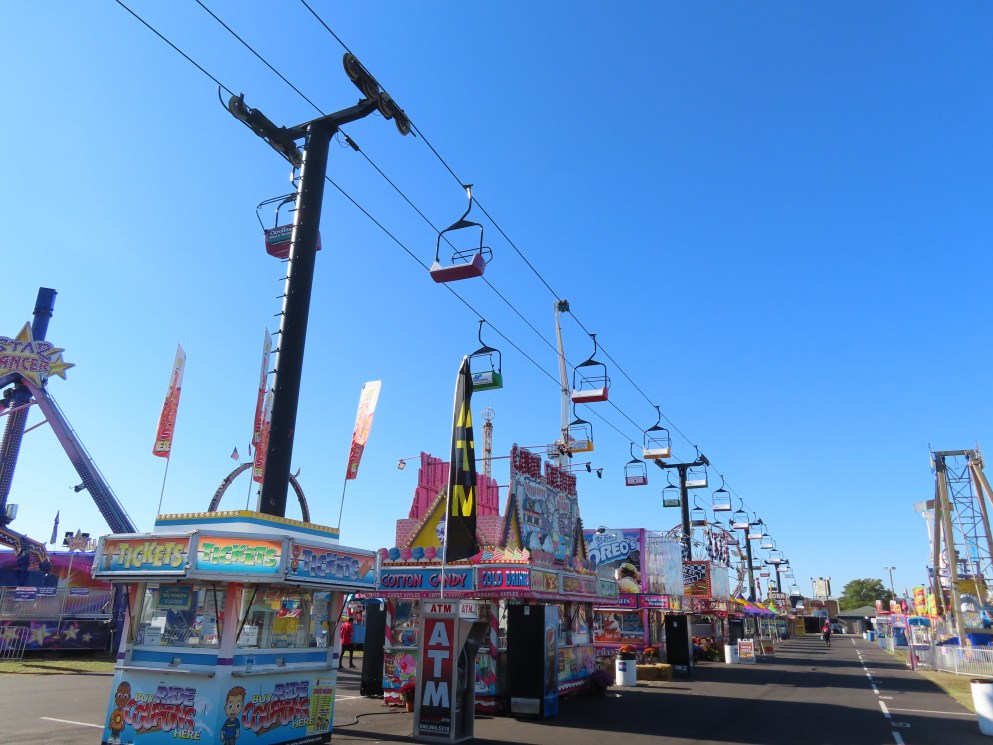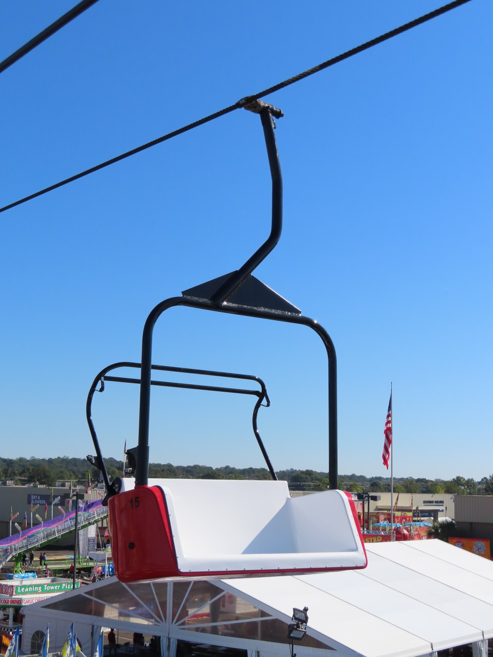 This lift runs across the midway at the South Carolina State Fair and is one of only two lifts in the state.View southwest.Tower 1.View southwest at tower 5.Lift line.Tall towers.The first few towers.The return terminal is elevated and riders load/unload on a platform.View from the return terminal.The drive station loading area.Drive bullwheel.Another view of the drive station.Operator controls.View northeast at tower 11.The raised loading area.Tower 11.View riding toward the drive terminal.SkyTrans carrier.T4.Looking south at tower 3.Arriving at the drive terminal.