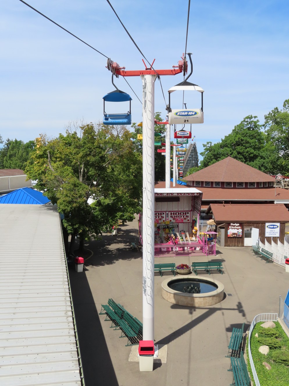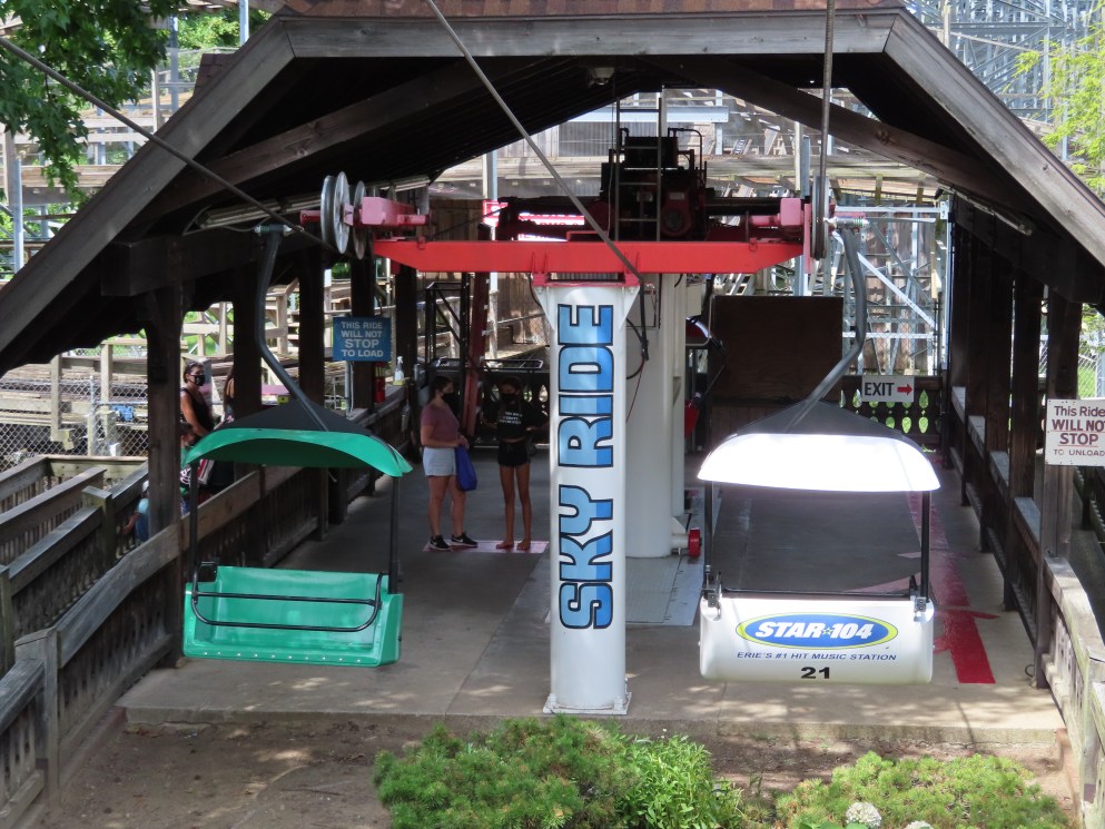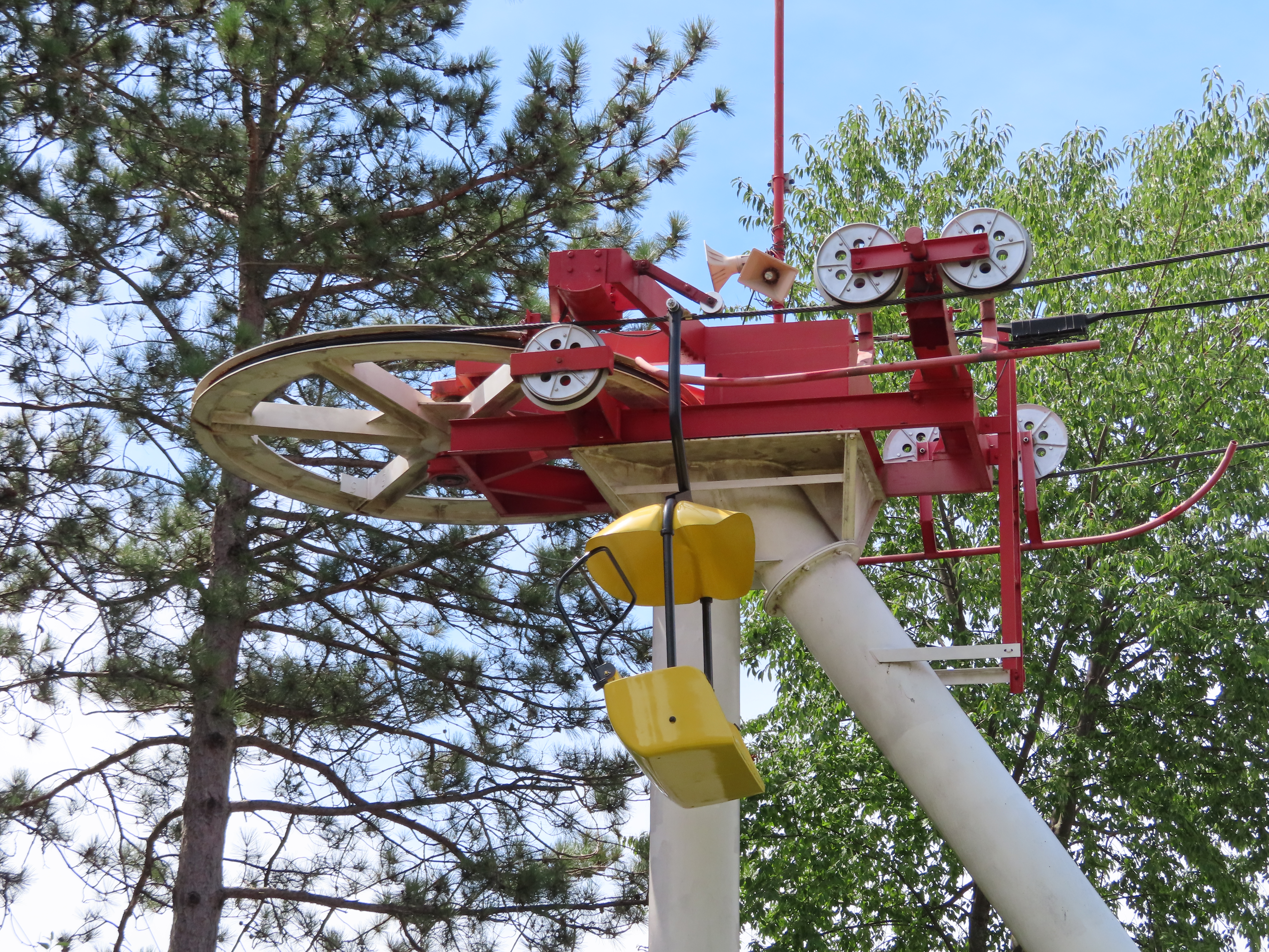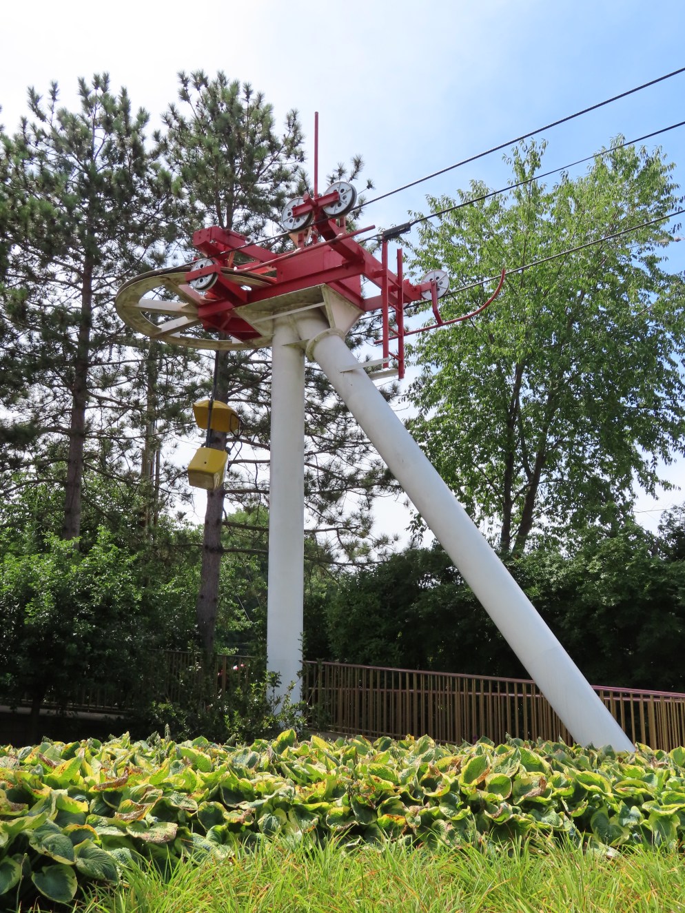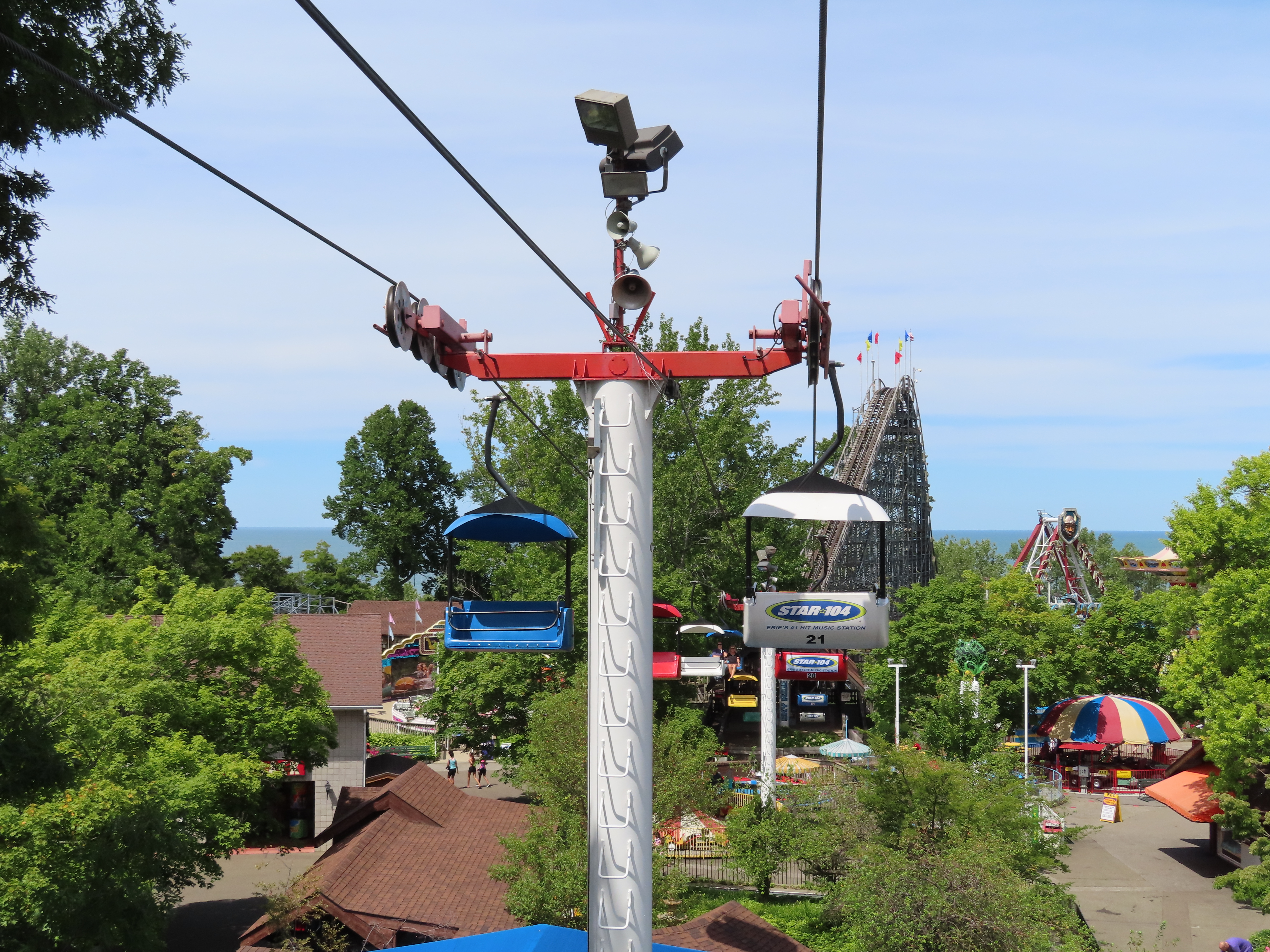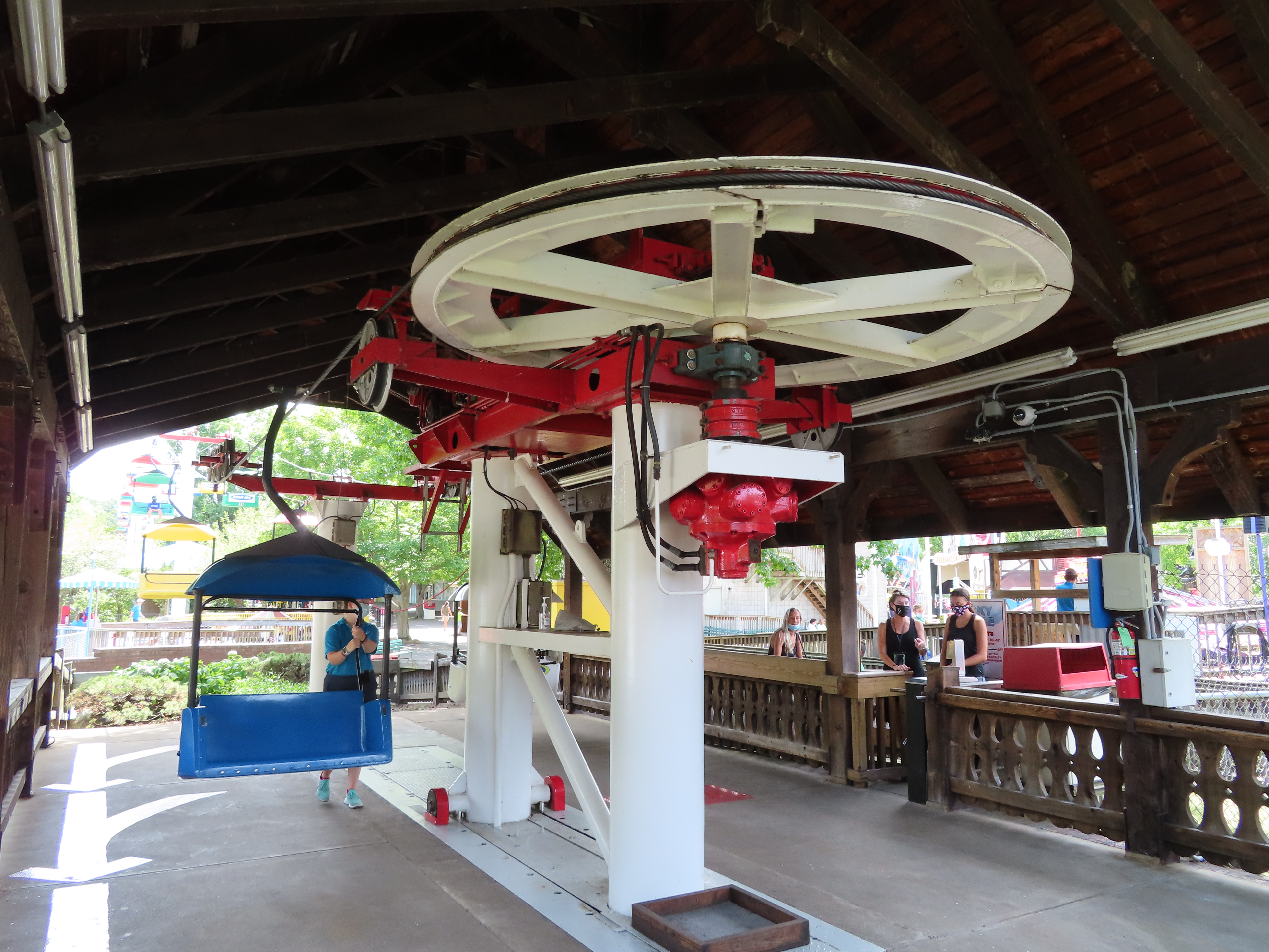This classic Hopkins sky ride traverses much of Waldameer Park along Lake Erie.Elevated return bullwheel.The drive and loading station.Tower 2.Hopkins carrier.Riding south.View north towards Lake Erie.T4.Tower 6.The ride is always round trip with no unloading at the return.Riding north.Middle part of the ride.Tower 3.T1.Drive bullwheel.Drive equipment. This is also the tension end.