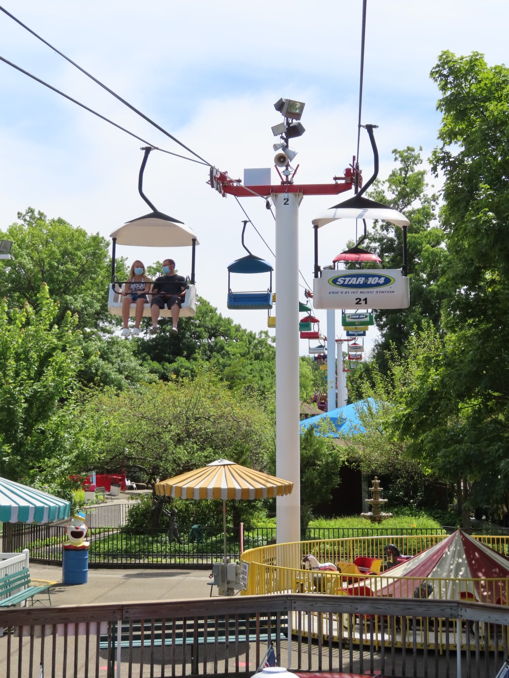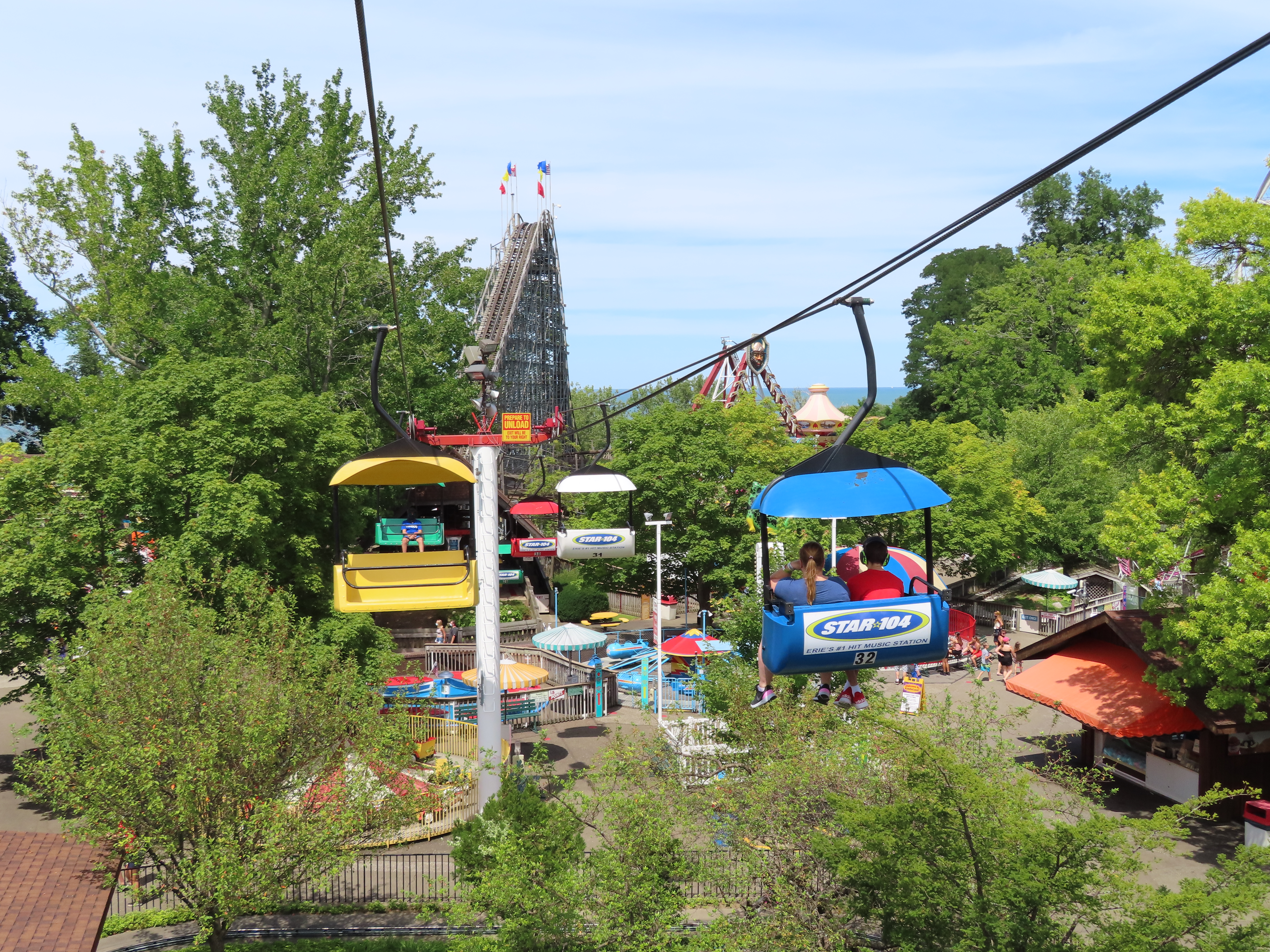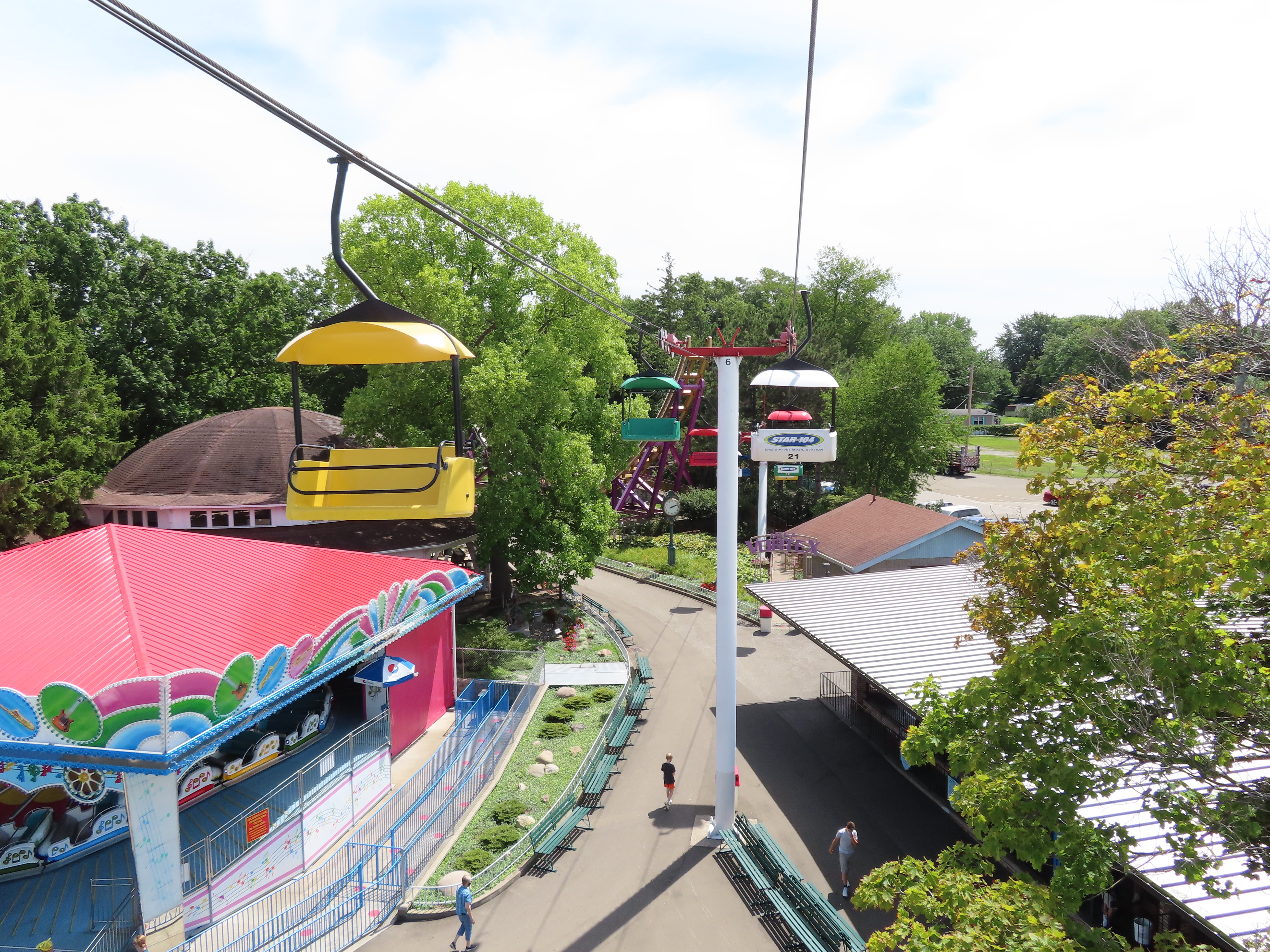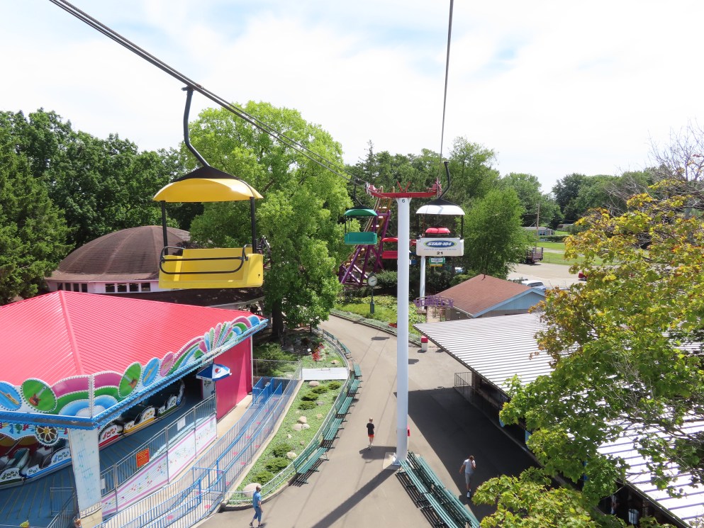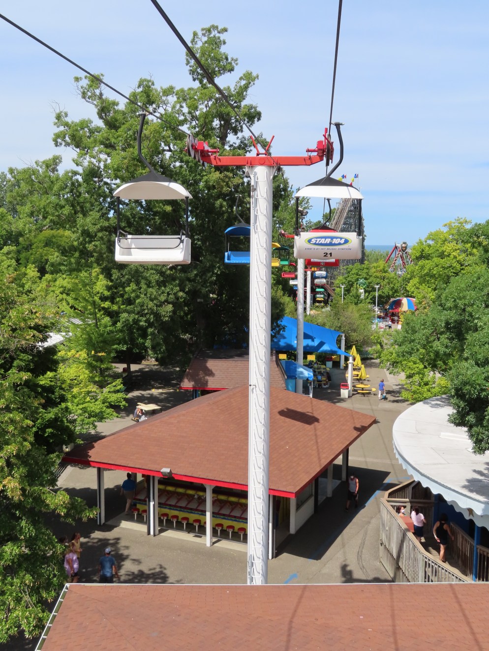 This classic Hopkins sky ride traverses much of Waldameer Park along Lake Erie.Elevated return bullwheel.The drive and loading station.Tower 2.Hopkins carrier.Riding south.View north towards Lake Erie.T4.Tower 6.The ride is always round trip with no unloading at the return.Riding north.Middle part of the ride.Tower 3.T1.Drive bullwheel.Drive equipment. This is also the tension end.