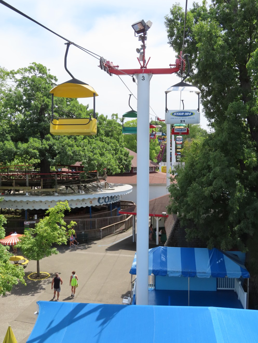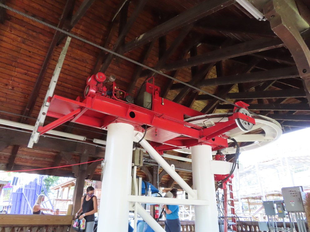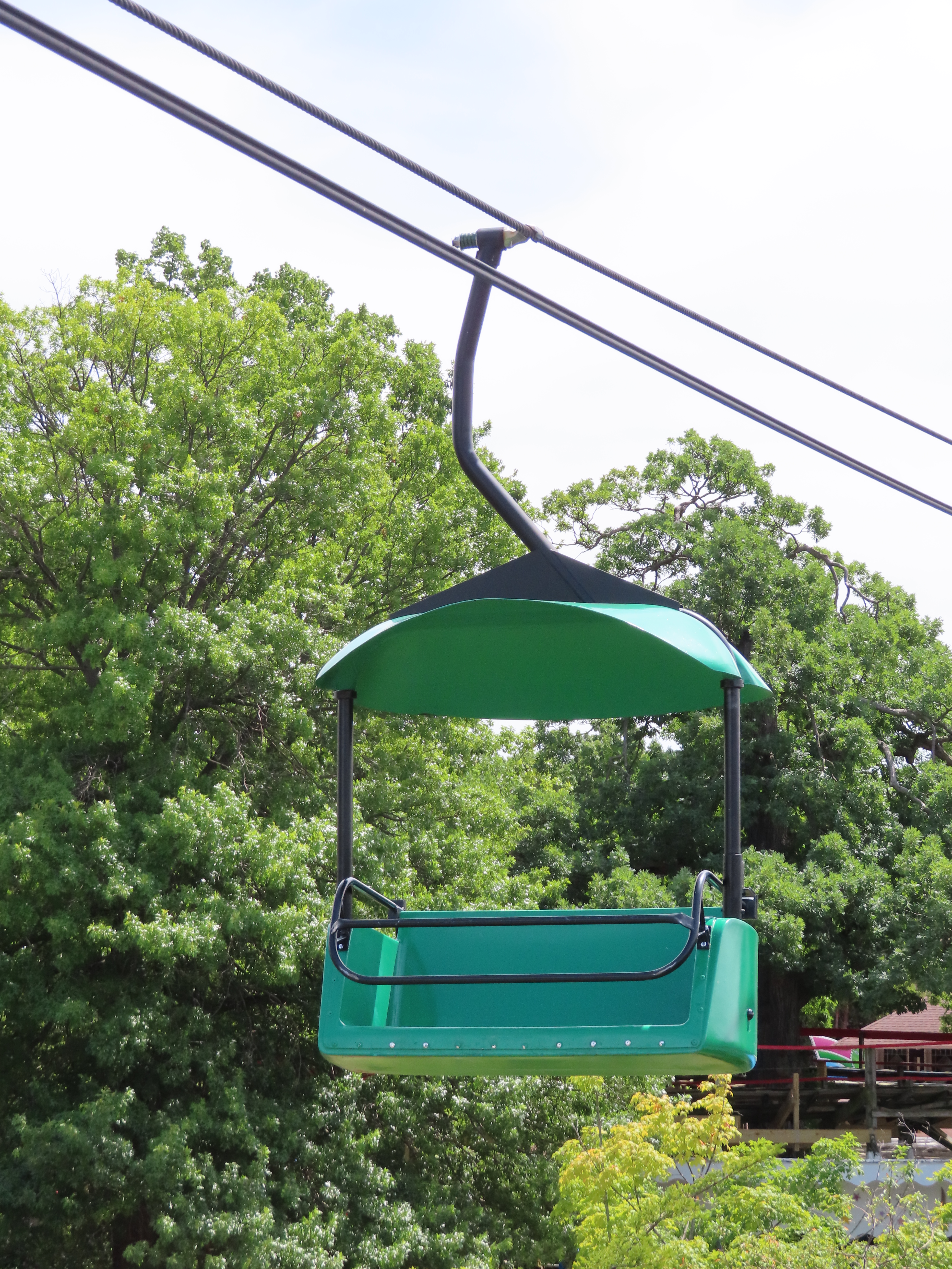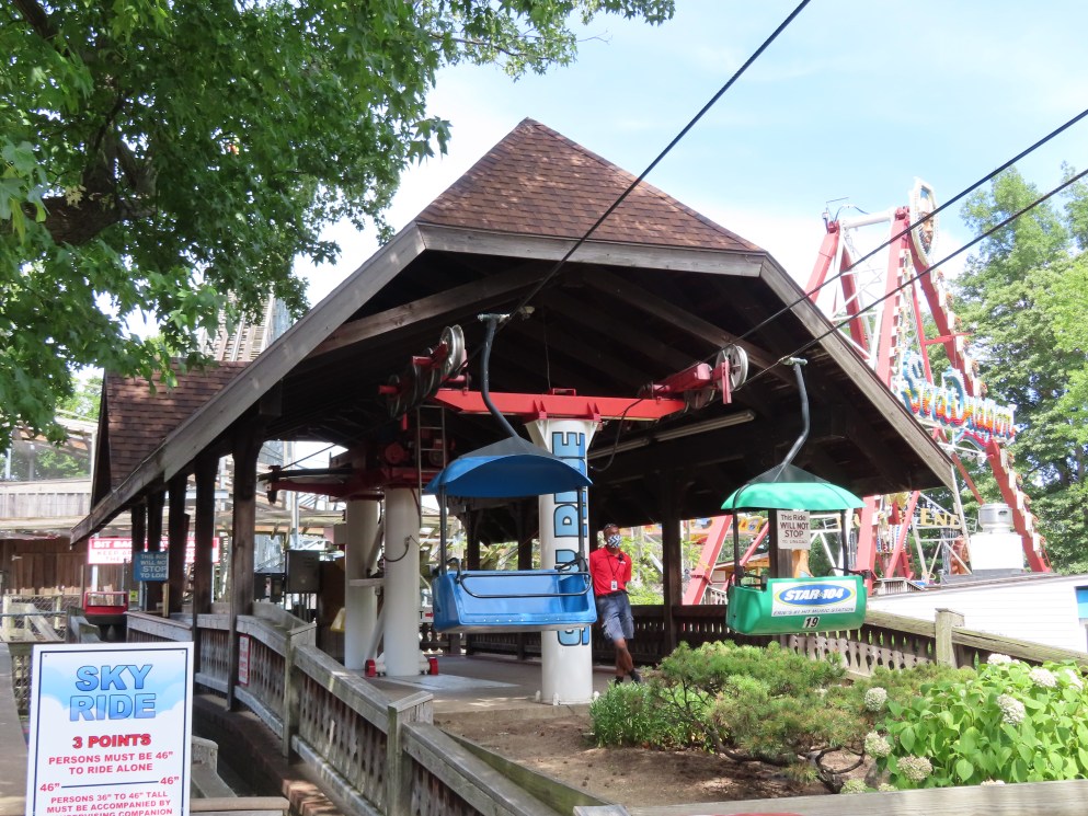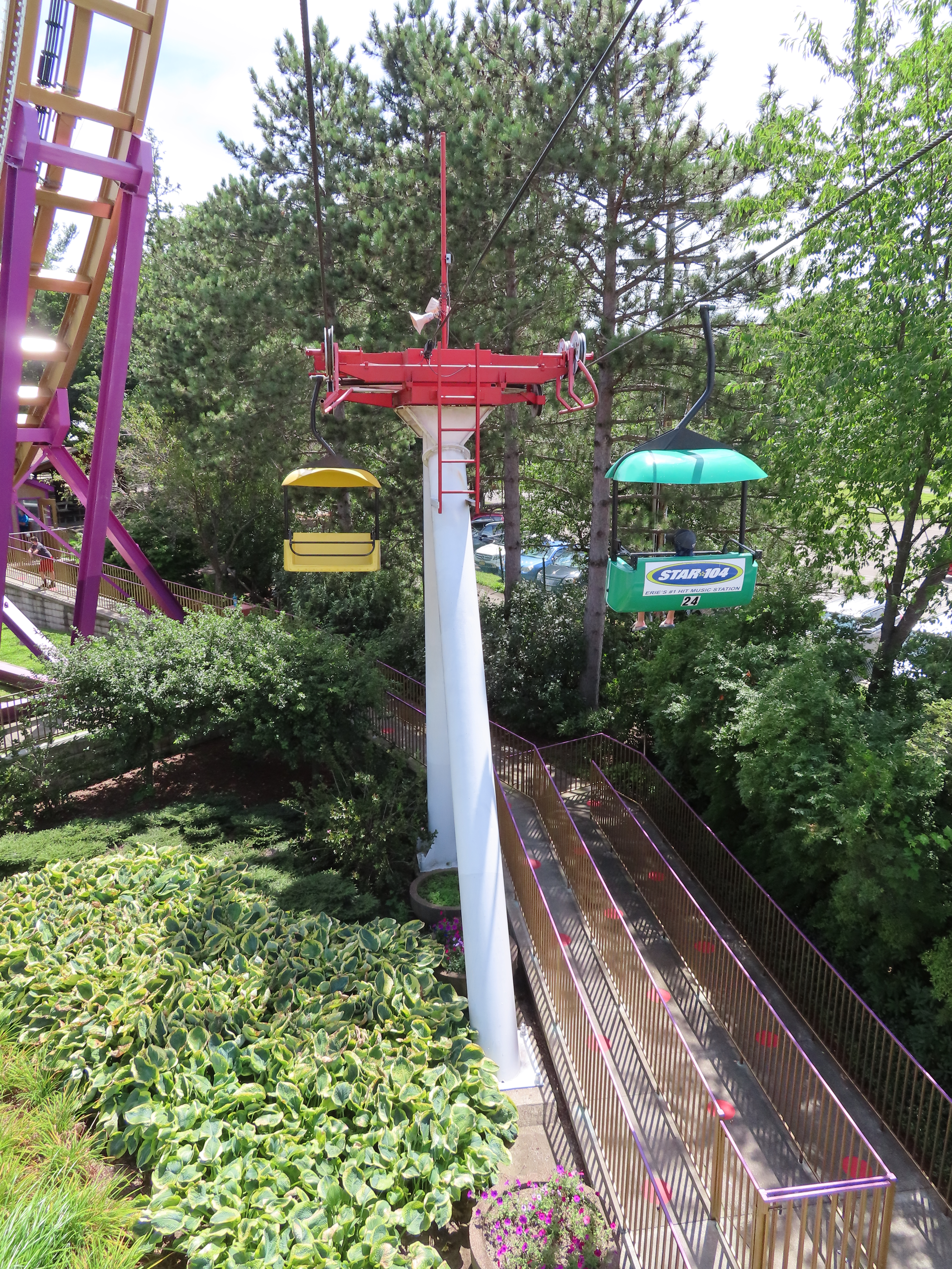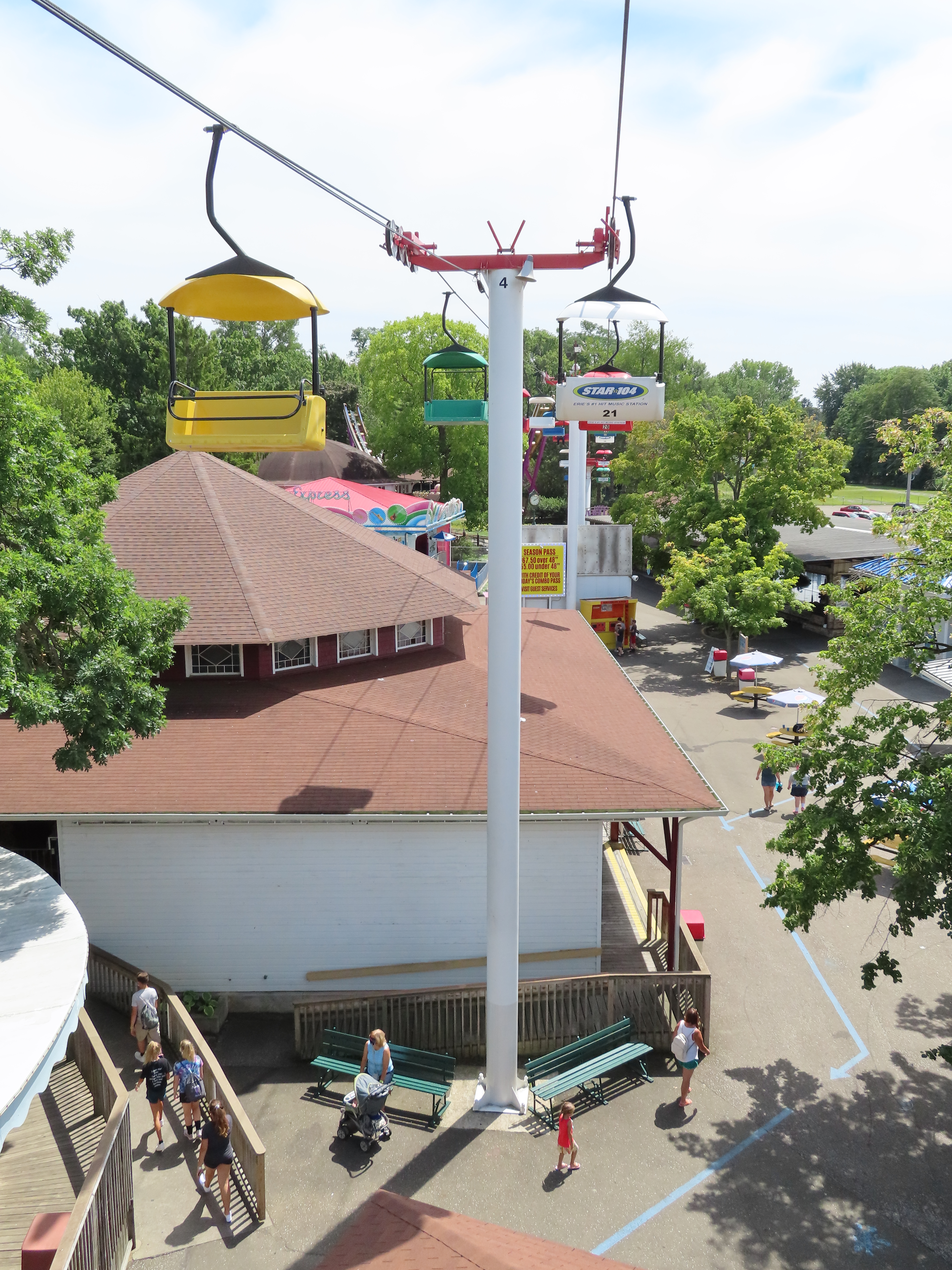 This classic Hopkins sky ride traverses much of Waldameer Park along Lake Erie.Elevated return bullwheel.The drive and loading station.Tower 2.Hopkins carrier.Riding south.View north towards Lake Erie.T4.Tower 6.The ride is always round trip with no unloading at the return.Riding north.Middle part of the ride.Tower 3.T1.Drive bullwheel.Drive equipment. This is also the tension end.